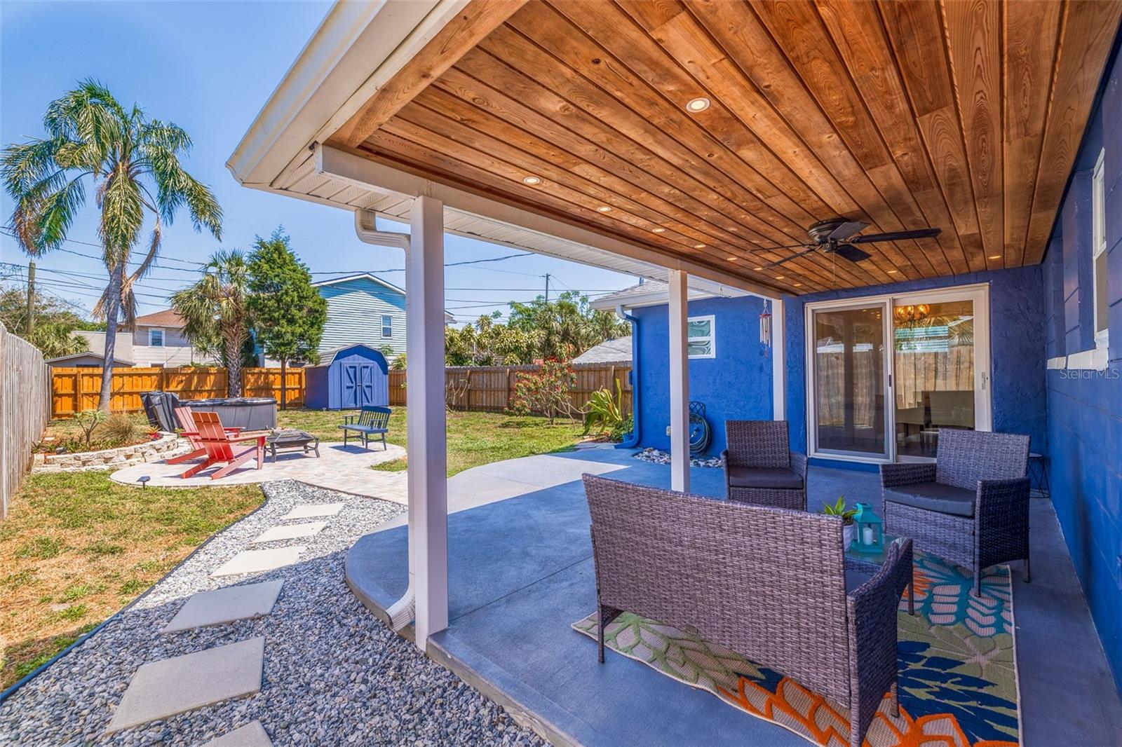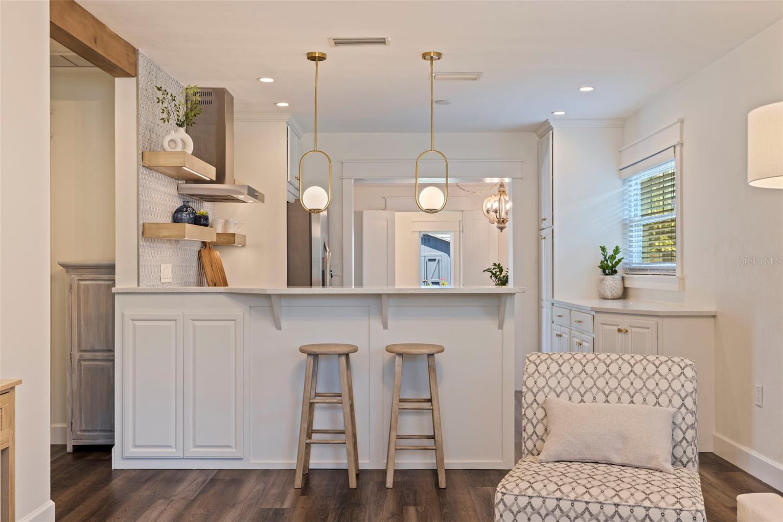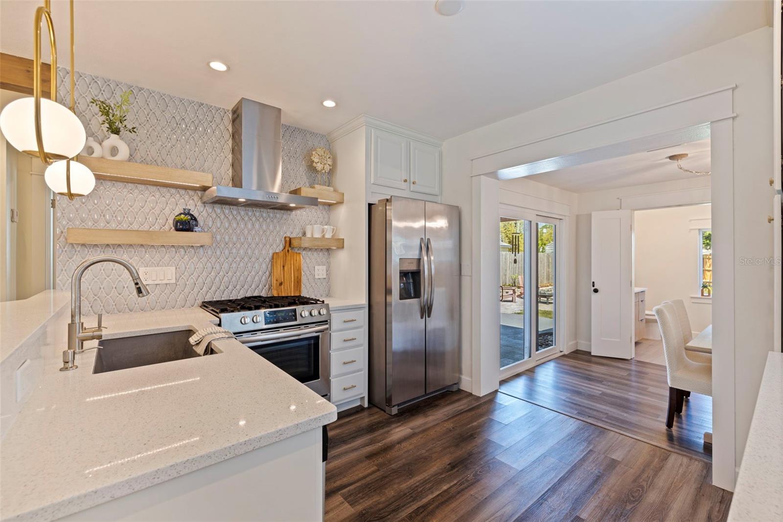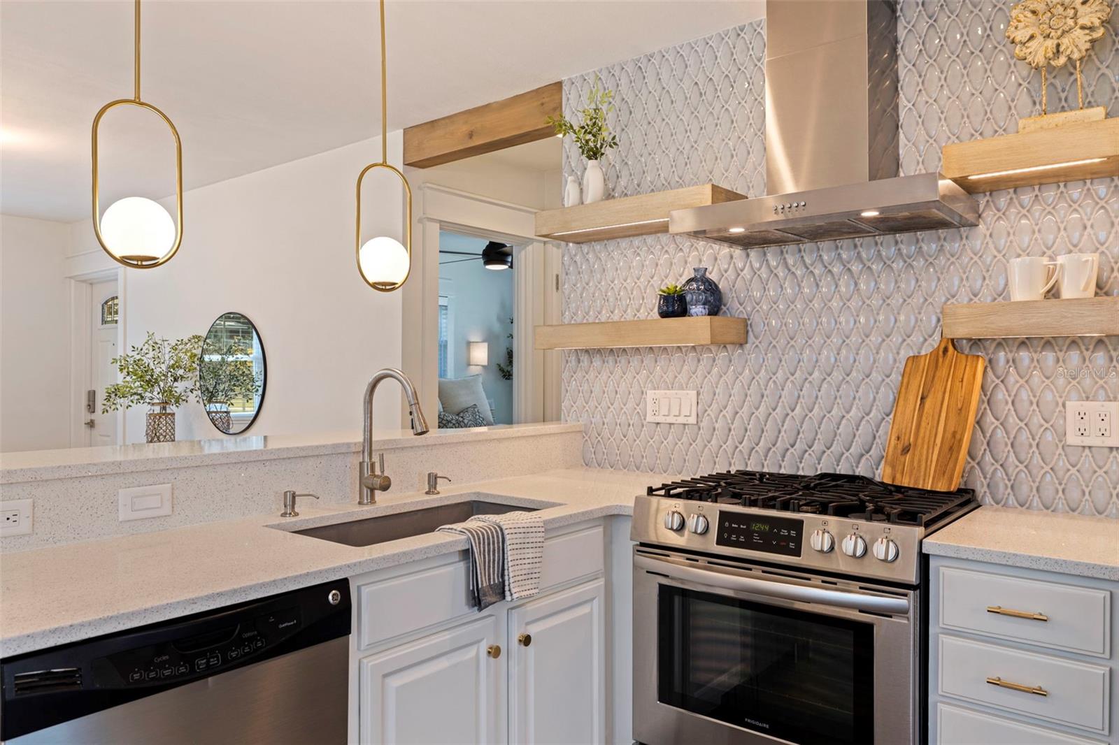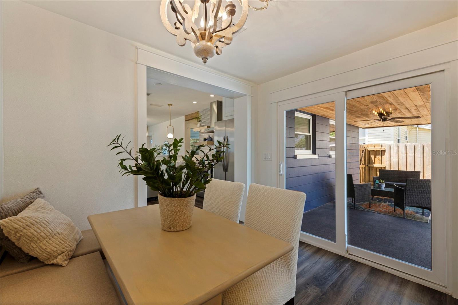 Welcome to this beautifully remodeled 2-bedroom, 2-bath bungalow, ideally located in Magnolia Heights — a high and dry St. Petersburg neighborhood where FLOOD INSURANCE IS NOT REQUIRED. Every inch of this home has been thoughtfully updated, offering a seamless blend of modern style and everyday functionality. Step inside to find wide-plank luxury vinyl flooring flowing throughout an open-concept layout. The designer kitchen features bright quartz countertops, open shelving with under-cabinet lighting, a gas stove, stainless steel appliances, a newly replaced refrigerator (2024), and a custom coffee bar for your morning routine. Just off the kitchen, a cozy dining nook with built-in bench seating adds charm and convenience — complete with hidden storage beneath. The spacious primary suite offers a peaceful retreat, highlighted by floating nightstands and sleek wall sconces that bring a clean, contemporary look with a warm, inviting touch. Both bathrooms have been fully updated with modern finishes, creating spa-like escapes. Enjoy the outdoors in your private, fully fenced backyard with a large paver patio — ideal for entertaining, dining al fresco, or relaxing in the included hot tub under the stars. Additional updates include a newer A/C system (2024), a gas tankless water heater (2019) for endless hot water, and smart storage solutions throughout. This home is truly turnkey — beautifully finished and move-in ready, in a prime location just minutes to downtown, parks, and local shops and restaurants.