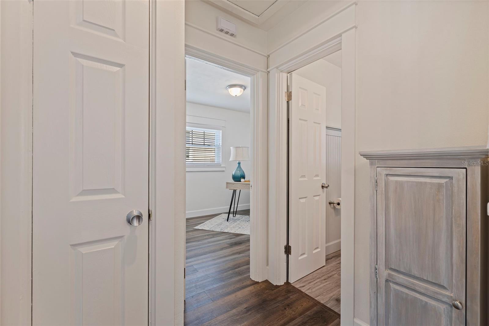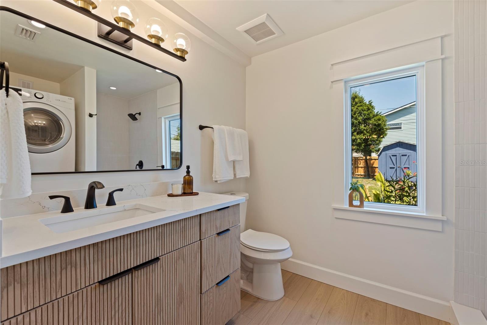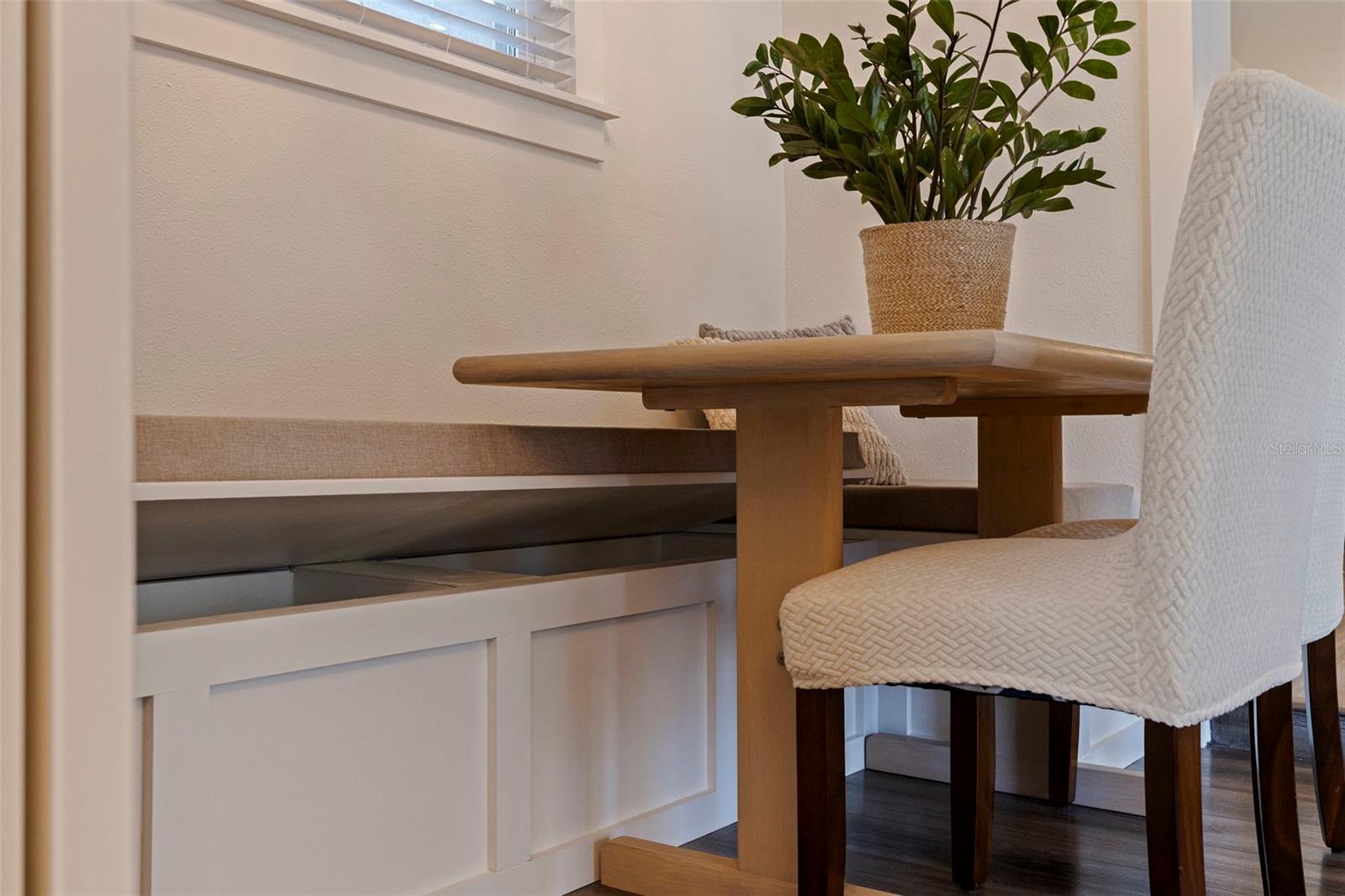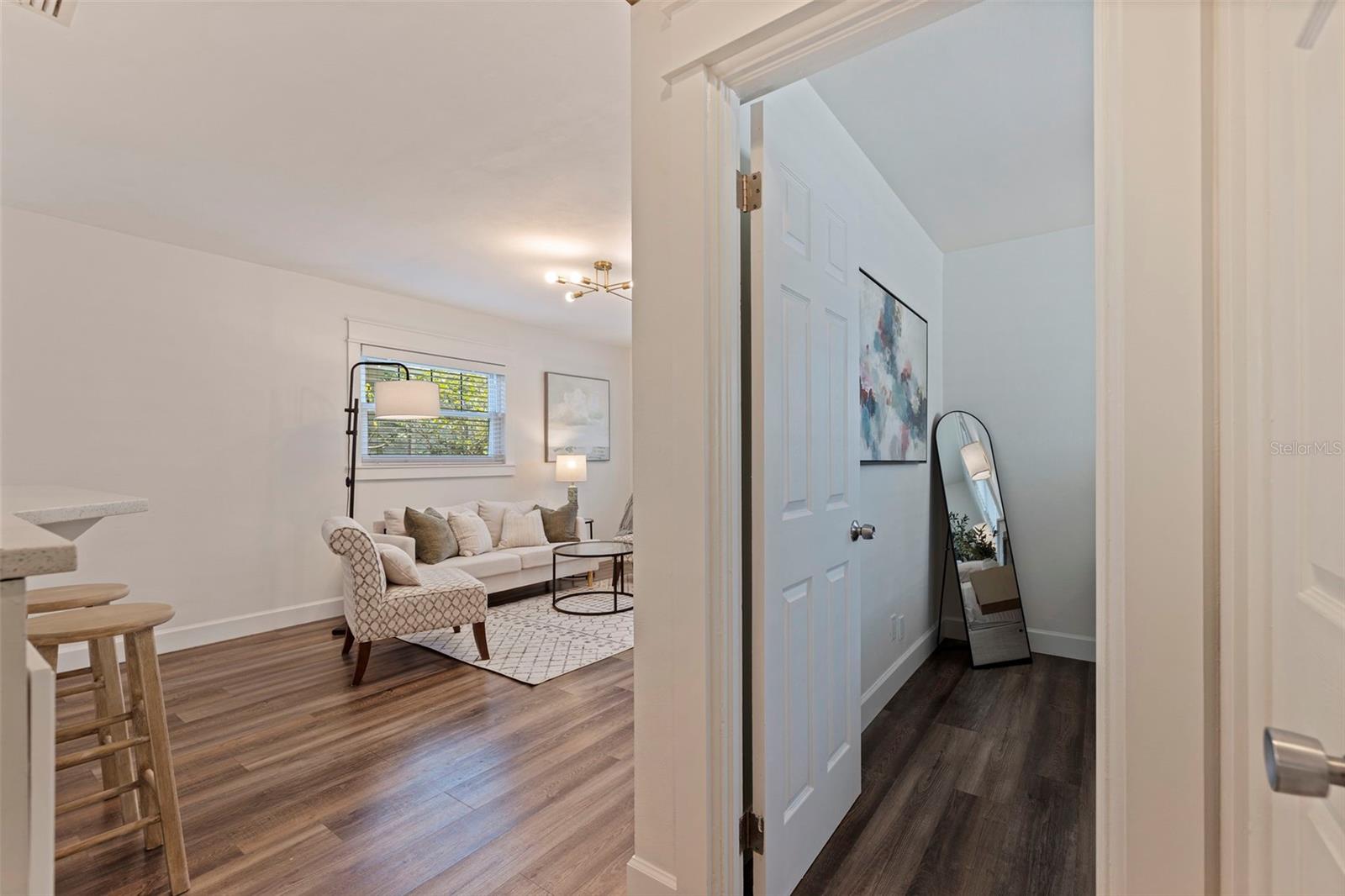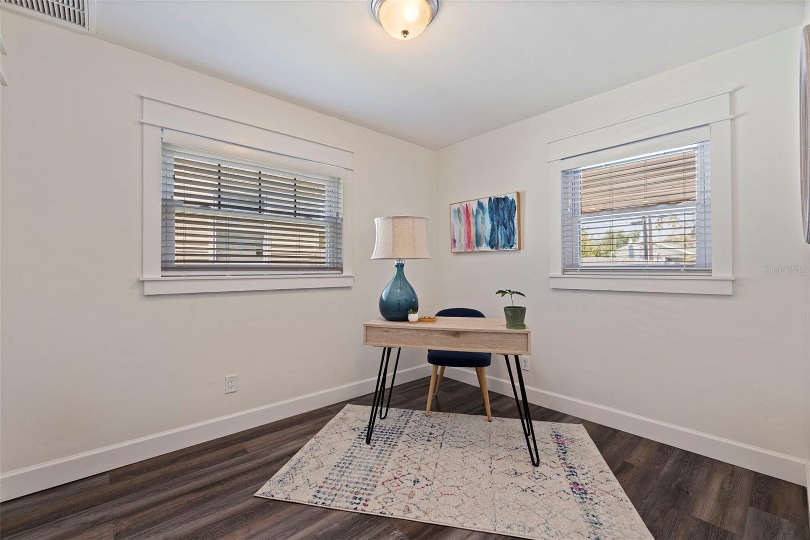 Welcome to this beautifully remodeled 2-bedroom, 2-bath bungalow, ideally located in Magnolia Heights — a high and dry St. Petersburg neighborhood where FLOOD INSURANCE IS NOT REQUIRED. Every inch of this home has been thoughtfully updated, offering a seamless blend of modern style and everyday functionality. Step inside to find wide-plank luxury vinyl flooring flowing throughout an open-concept layout. The designer kitchen features bright quartz countertops, open shelving with under-cabinet lighting, a gas stove, stainless steel appliances, a newly replaced refrigerator (2024), and a custom coffee bar for your morning routine. Just off the kitchen, a cozy dining nook with built-in bench seating adds charm and convenience — complete with hidden storage beneath. The spacious primary suite offers a peaceful retreat, highlighted by floating nightstands and sleek wall sconces that bring a clean, contemporary look with a warm, inviting touch. Both bathrooms have been fully updated with modern finishes, creating spa-like escapes. Enjoy the outdoors in your private, fully fenced backyard with a large paver patio — ideal for entertaining, dining al fresco, or relaxing in the included hot tub under the stars. Additional updates include a newer A/C system (2024), a gas tankless water heater (2019) for endless hot water, and smart storage solutions throughout. This home is truly turnkey — beautifully finished and move-in ready, in a prime location just minutes to downtown, parks, and local shops and restaurants.