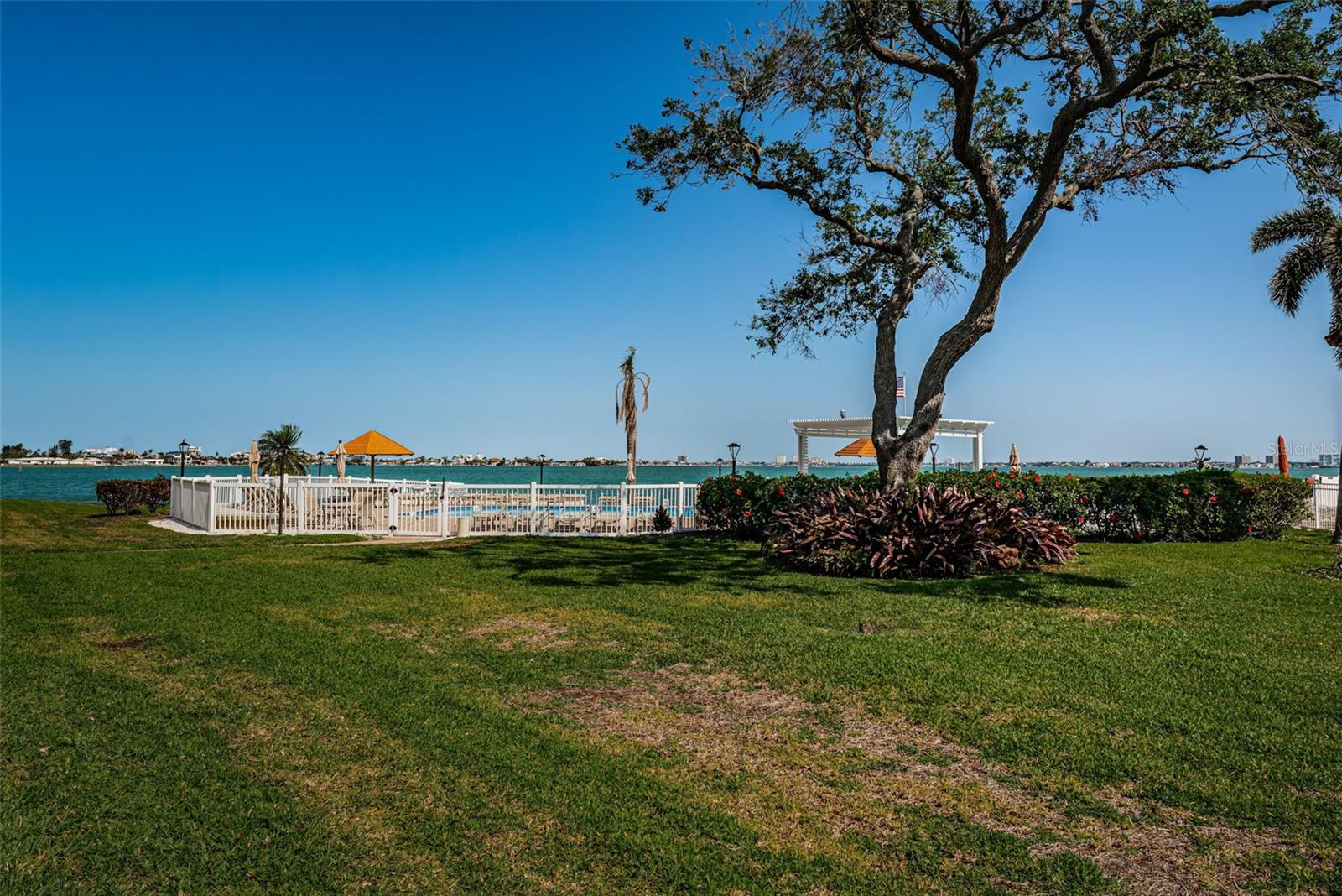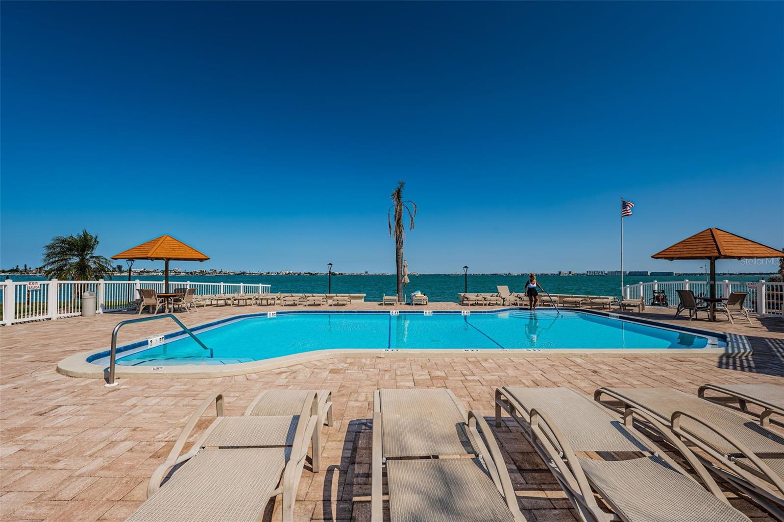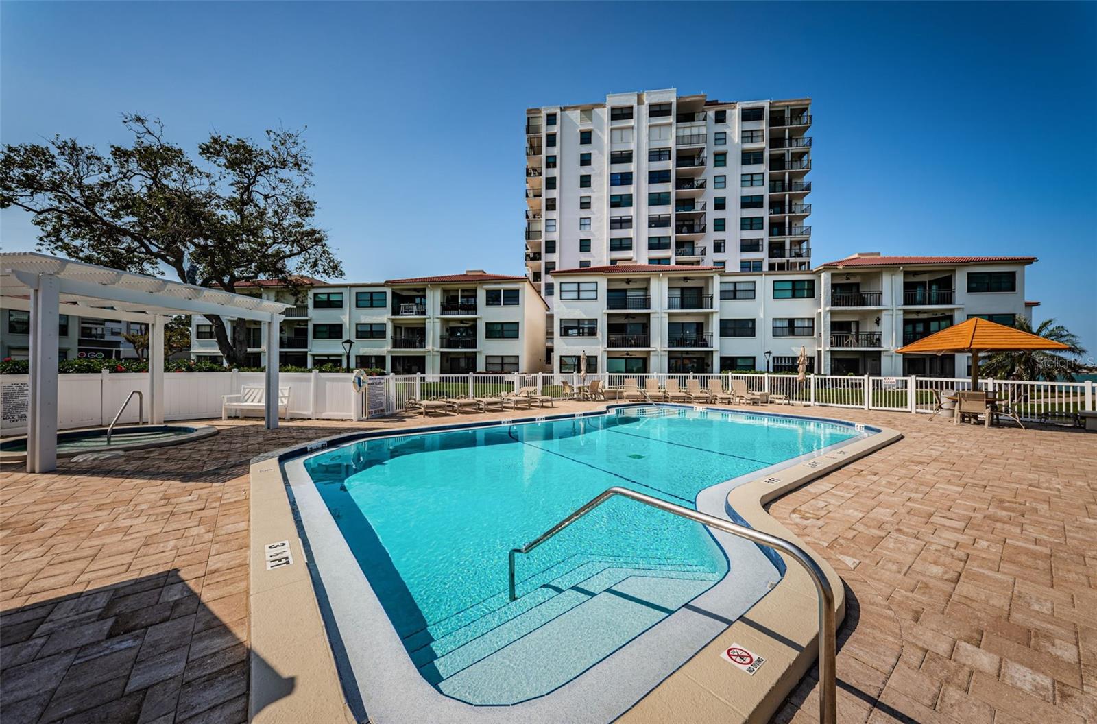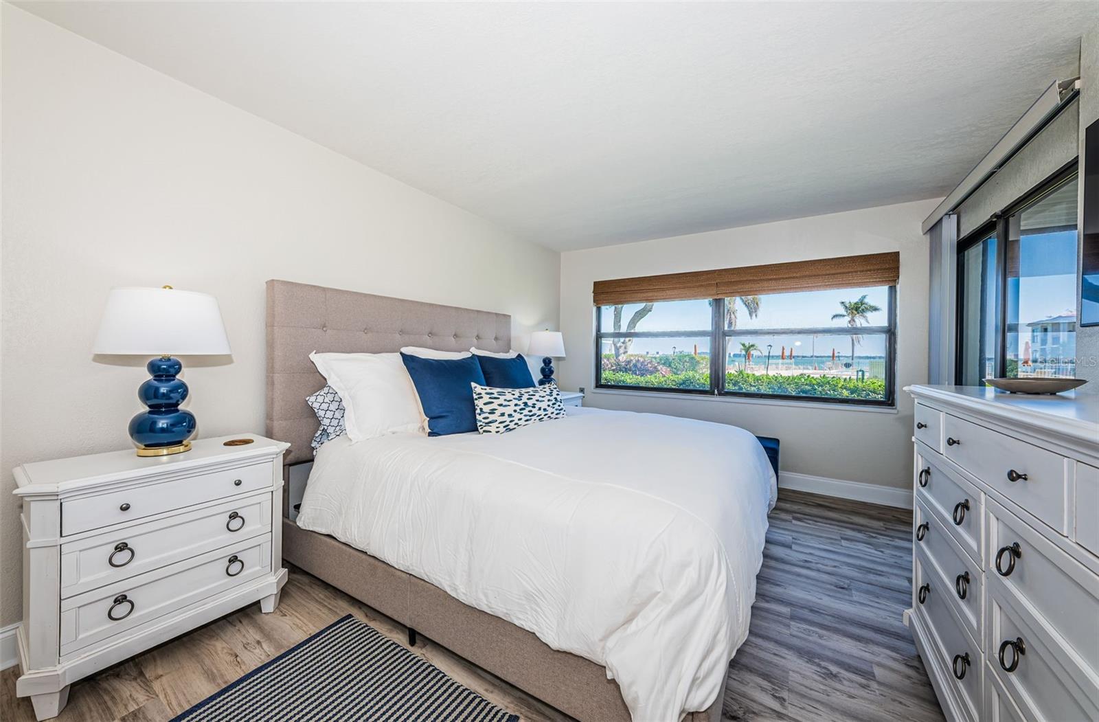 Tastefully remodeled in 2022 with high-end finishes, this ground floor villa overlooks the lushly landscaped pool area and Boca Ciega Bay. Perfect location just steps away to the pool and bay from the screened patio with a storage closet. The fully updated kitchen features beautiful cabinetry with an abundance of storage, beautiful quartz countertops, stainless steel appliances and recessed lighting. The view from the kitchen extends through the dining and living area out to the panoramic view beyond. The primary bedroom with its gorgeous views towards the pool and bay has a generous sized walk-in closet and spa-like ensuite bathroom. The split bedroom plan offers privacy for the guest bedroom that is adjacent to the updated secondary bathroom. A separate utility room has a newer washer/dryer. Additional quality features include luxury vinyl flooring with updated baseboard trim throughout, solid core doors with nickel-finish hardware, and updated lighting. Have peace of mind knowing you have hurricane shutters on all windows and patio, newly installed A/C, and easy access to the ground level assigned covered parking space #148. Sold turnkey with top-grade furnishings, this can be a luxurious rental unit or make this your permanent home or vacation get-away in paradise. Truly a resort lifestyle! Take advantage of a golf, tennis, yacht or social membership offered at Isla Del Sol Yacht & Country Club a short walk away. All of this, and within minutes of the award-winning beaches of Fort Desoto State Park, and top ranked St Pete Beach. Or with easy access to I275, you're only 15 minutes to the vibrant activity of the nightlife, restaurants and shopping in downtown St Petersburg.