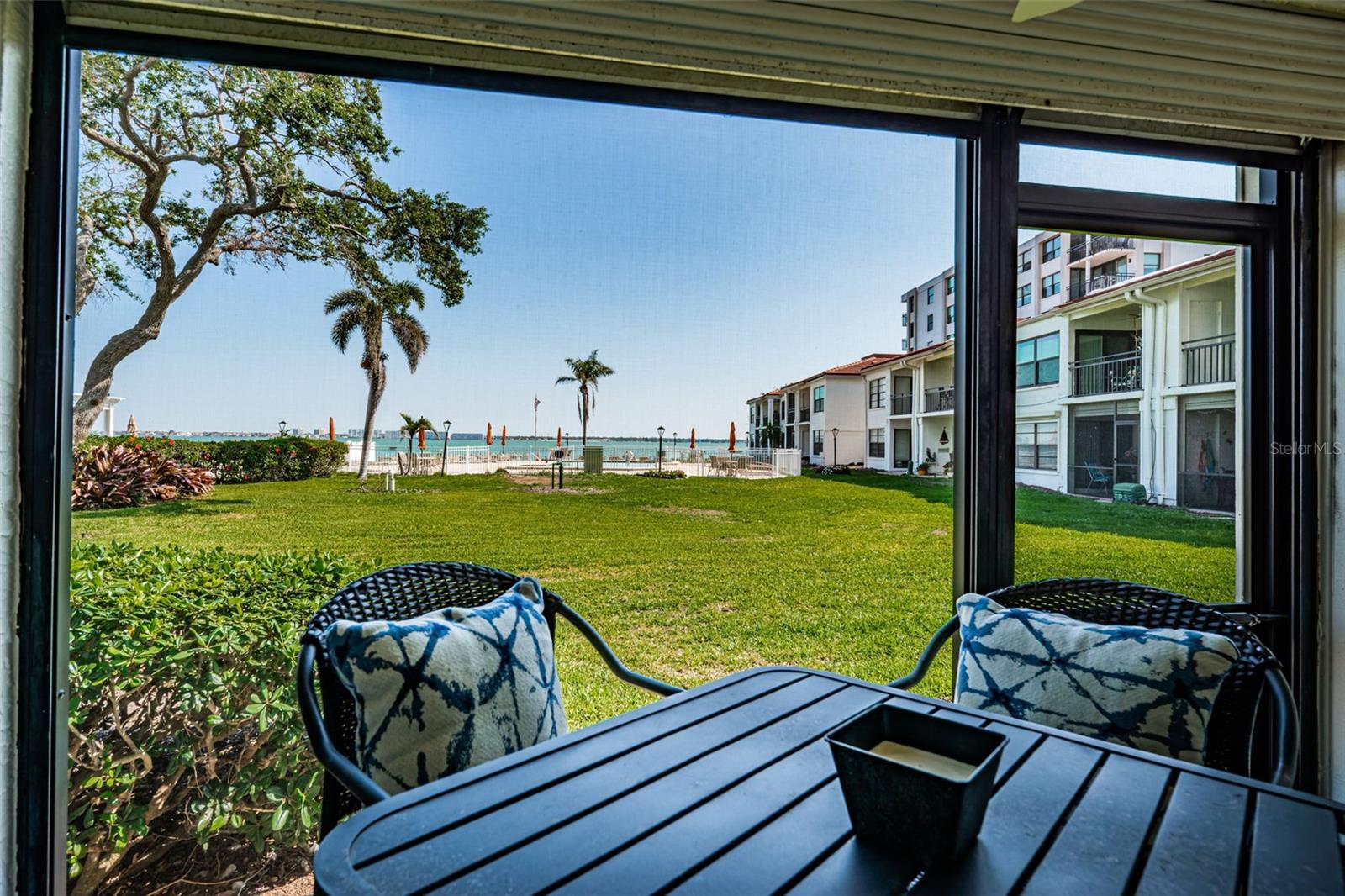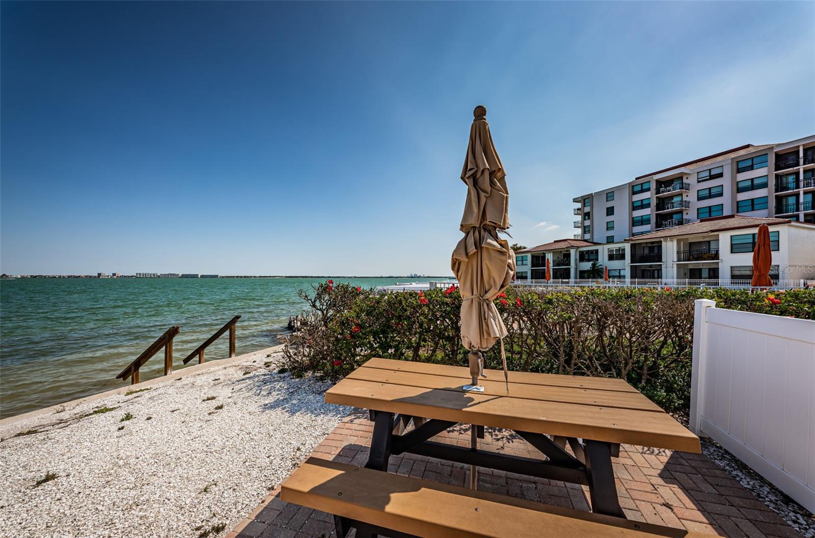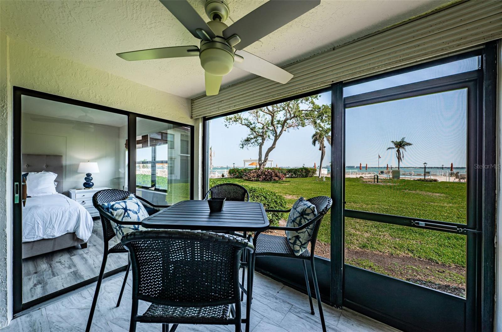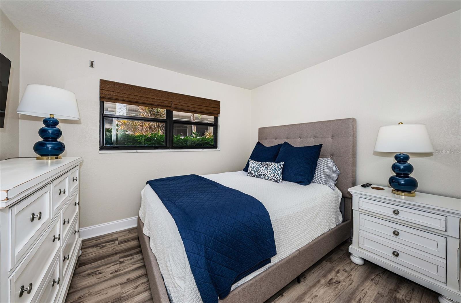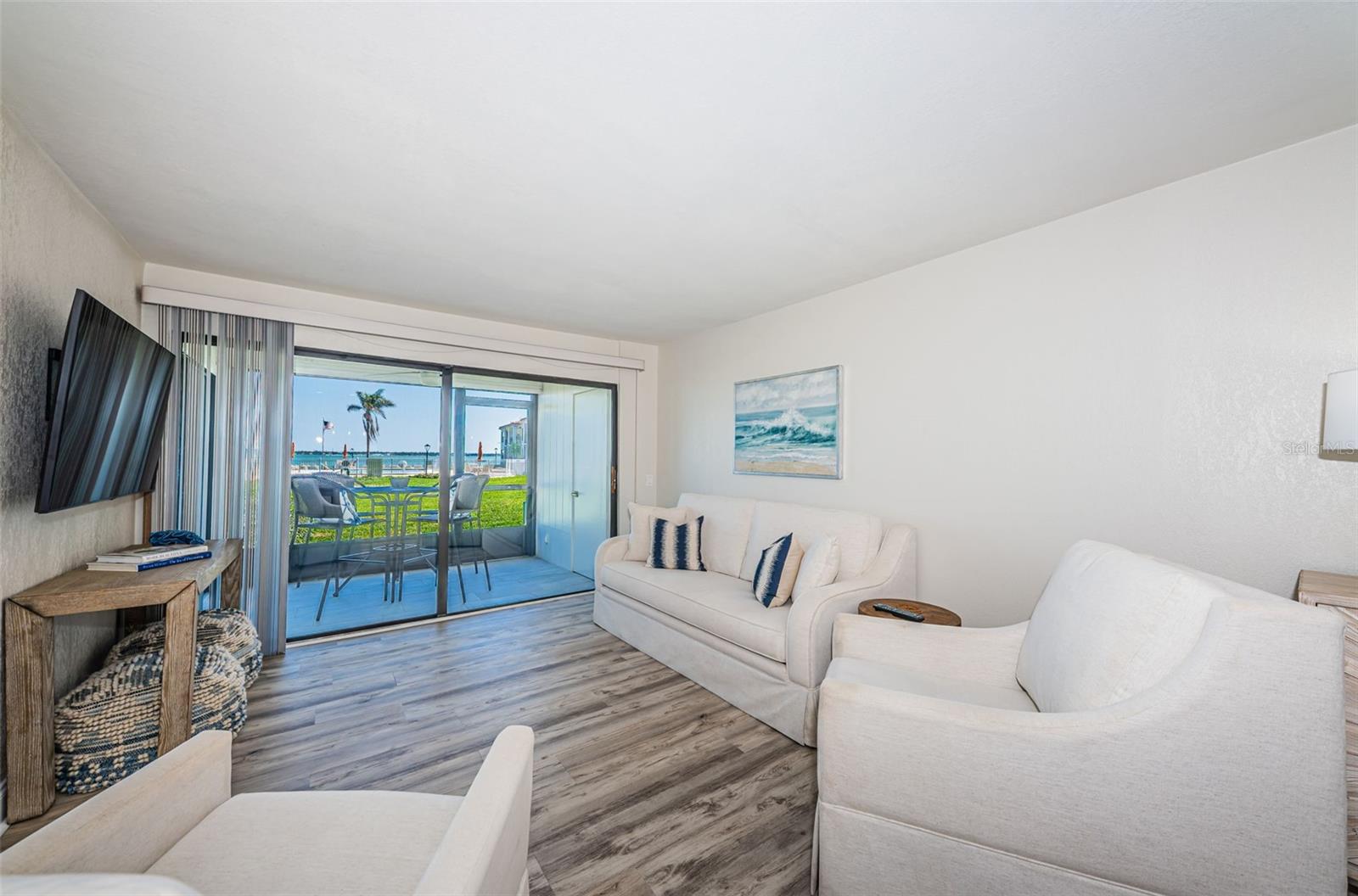 Tastefully remodeled in 2022 with high-end finishes, this ground floor villa overlooks the lushly landscaped pool area and Boca Ciega Bay. Perfect location just steps away to the pool and bay from the screened patio with a storage closet. The fully updated kitchen features beautiful cabinetry with an abundance of storage, beautiful quartz countertops, stainless steel appliances and recessed lighting. The view from the kitchen extends through the dining and living area out to the panoramic view beyond. The primary bedroom with its gorgeous views towards the pool and bay has a generous sized walk-in closet and spa-like ensuite bathroom. The split bedroom plan offers privacy for the guest bedroom that is adjacent to the updated secondary bathroom. A separate utility room has a newer washer/dryer. Additional quality features include luxury vinyl flooring with updated baseboard trim throughout, solid core doors with nickel-finish hardware, and updated lighting. Have peace of mind knowing you have hurricane shutters on all windows and patio, newly installed A/C, and easy access to the ground level assigned covered parking space #148. Sold turnkey with top-grade furnishings, this can be a luxurious rental unit or make this your permanent home or vacation get-away in paradise. Truly a resort lifestyle! Take advantage of a golf, tennis, yacht or social membership offered at Isla Del Sol Yacht & Country Club a short walk away. All of this, and within minutes of the award-winning beaches of Fort Desoto State Park, and top ranked St Pete Beach. Or with easy access to I275, you're only 15 minutes to the vibrant activity of the nightlife, restaurants and shopping in downtown St Petersburg.