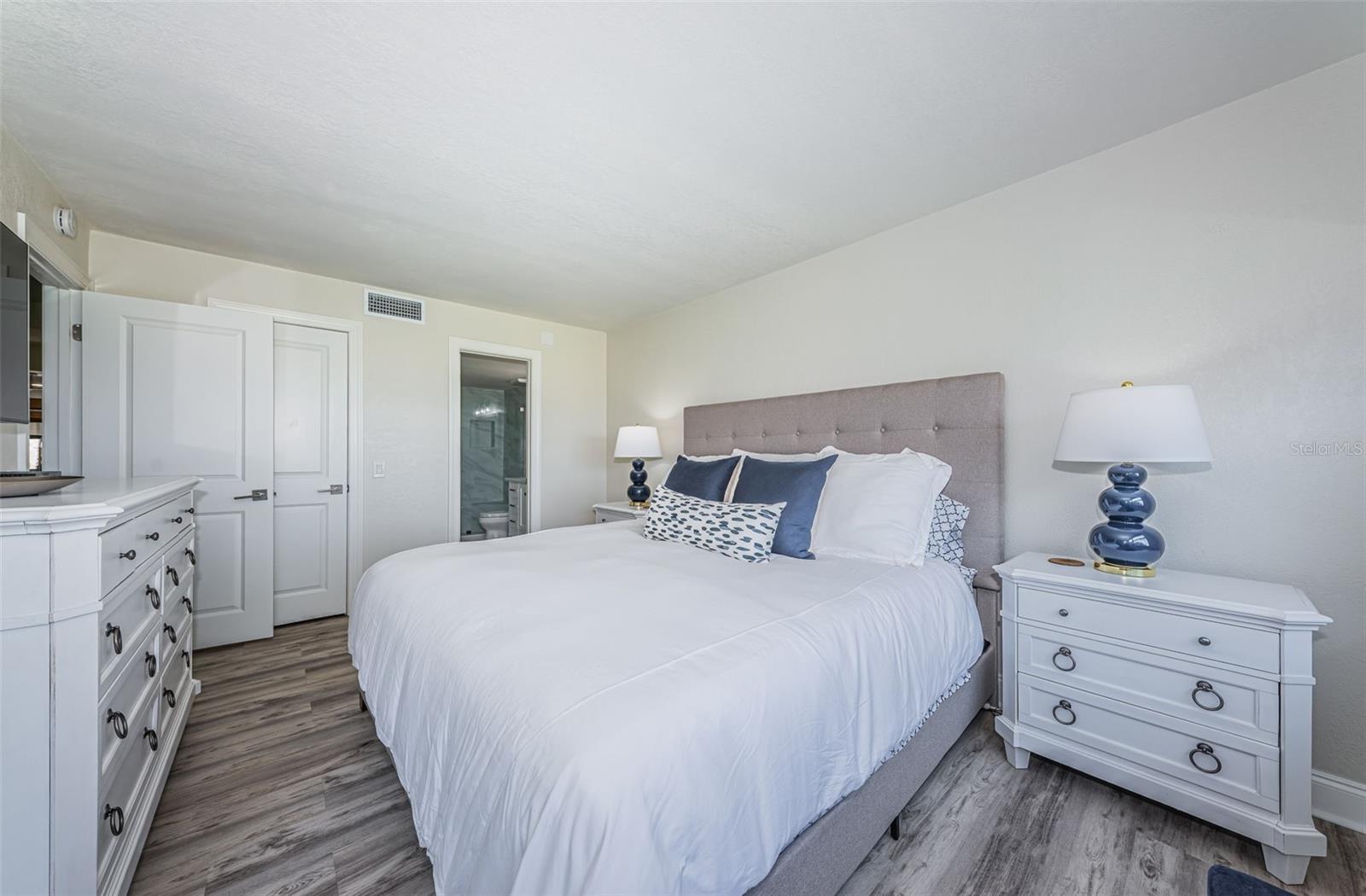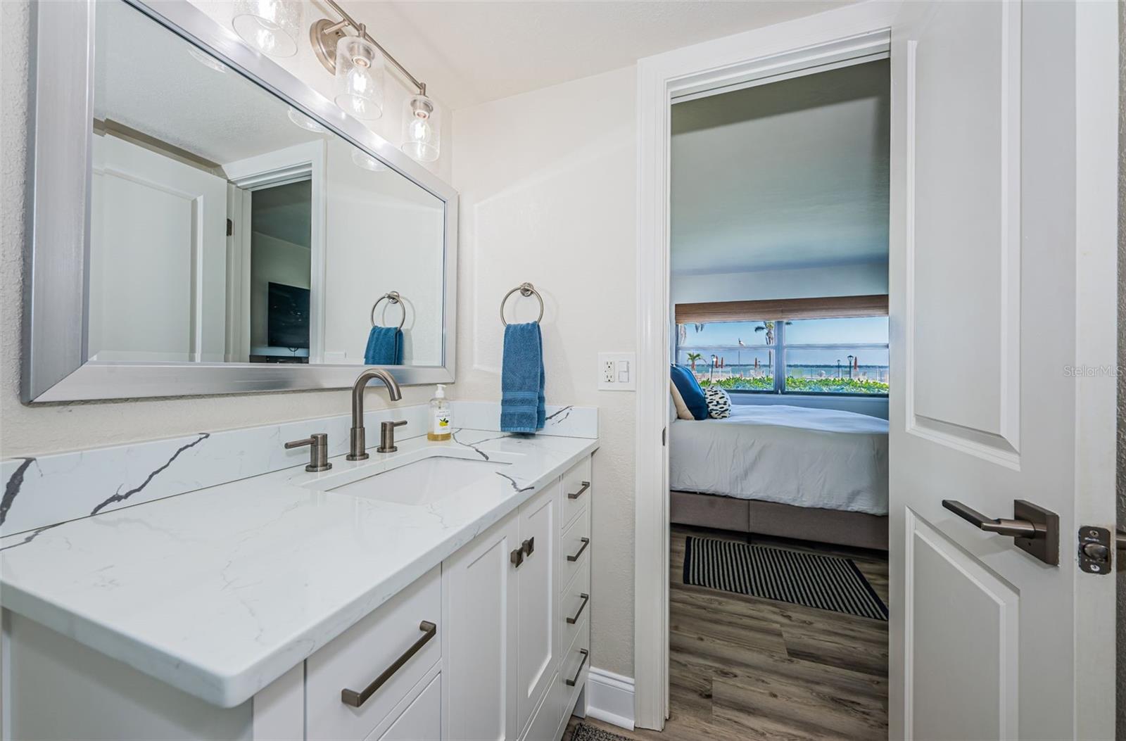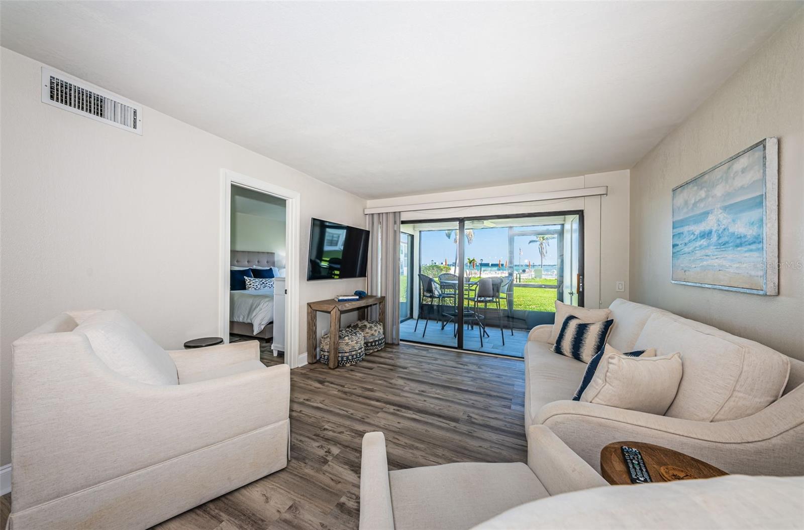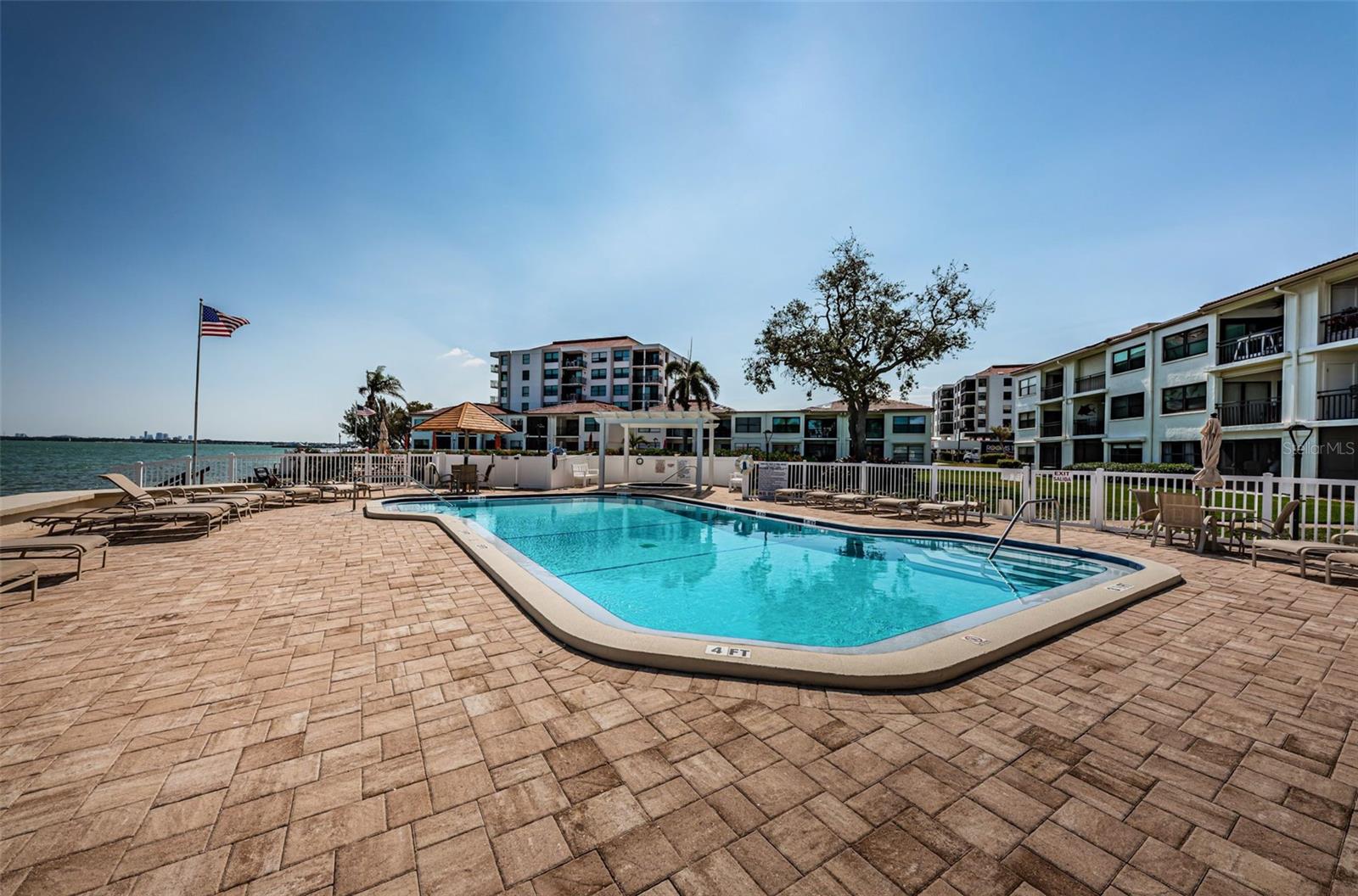 Tastefully remodeled in 2022 with high-end finishes, this ground floor villa overlooks the lushly landscaped pool area and Boca Ciega Bay. Perfect location just steps away to the pool and bay from the screened patio with a storage closet. The fully updated kitchen features beautiful cabinetry with an abundance of storage, beautiful quartz countertops, stainless steel appliances and recessed lighting. The view from the kitchen extends through the dining and living area out to the panoramic view beyond. The primary bedroom with its gorgeous views towards the pool and bay has a generous sized walk-in closet and spa-like ensuite bathroom. The split bedroom plan offers privacy for the guest bedroom that is adjacent to the updated secondary bathroom. A separate utility room has a newer washer/dryer. Additional quality features include luxury vinyl flooring with updated baseboard trim throughout, solid core doors with nickel-finish hardware, and updated lighting. Have peace of mind knowing you have hurricane shutters on all windows and patio, newly installed A/C, and easy access to the ground level assigned covered parking space #148. Sold turnkey with top-grade furnishings, this can be a luxurious rental unit or make this your permanent home or vacation get-away in paradise. Truly a resort lifestyle! Take advantage of a golf, tennis, yacht or social membership offered at Isla Del Sol Yacht & Country Club a short walk away. All of this, and within minutes of the award-winning beaches of Fort Desoto State Park, and top ranked St Pete Beach. Or with easy access to I275, you're only 15 minutes to the vibrant activity of the nightlife, restaurants and shopping in downtown St Petersburg.