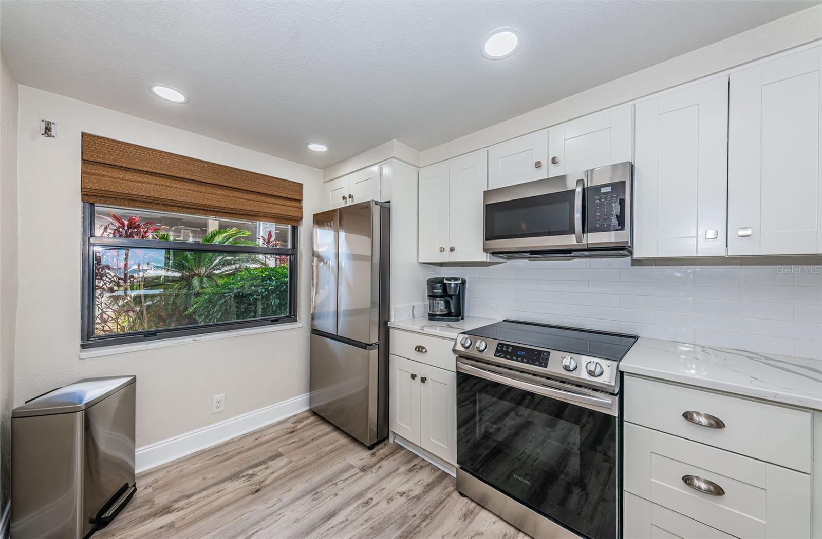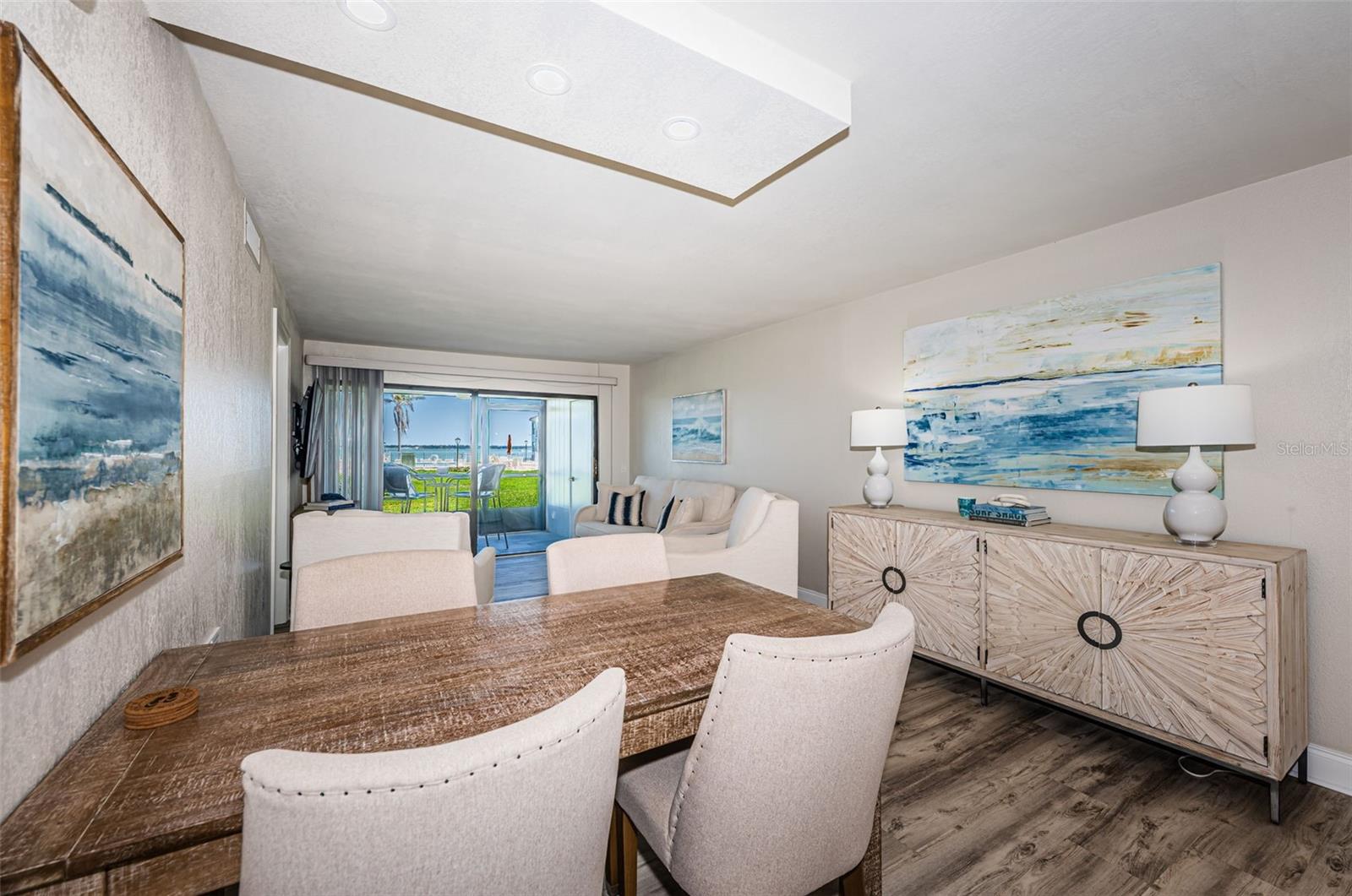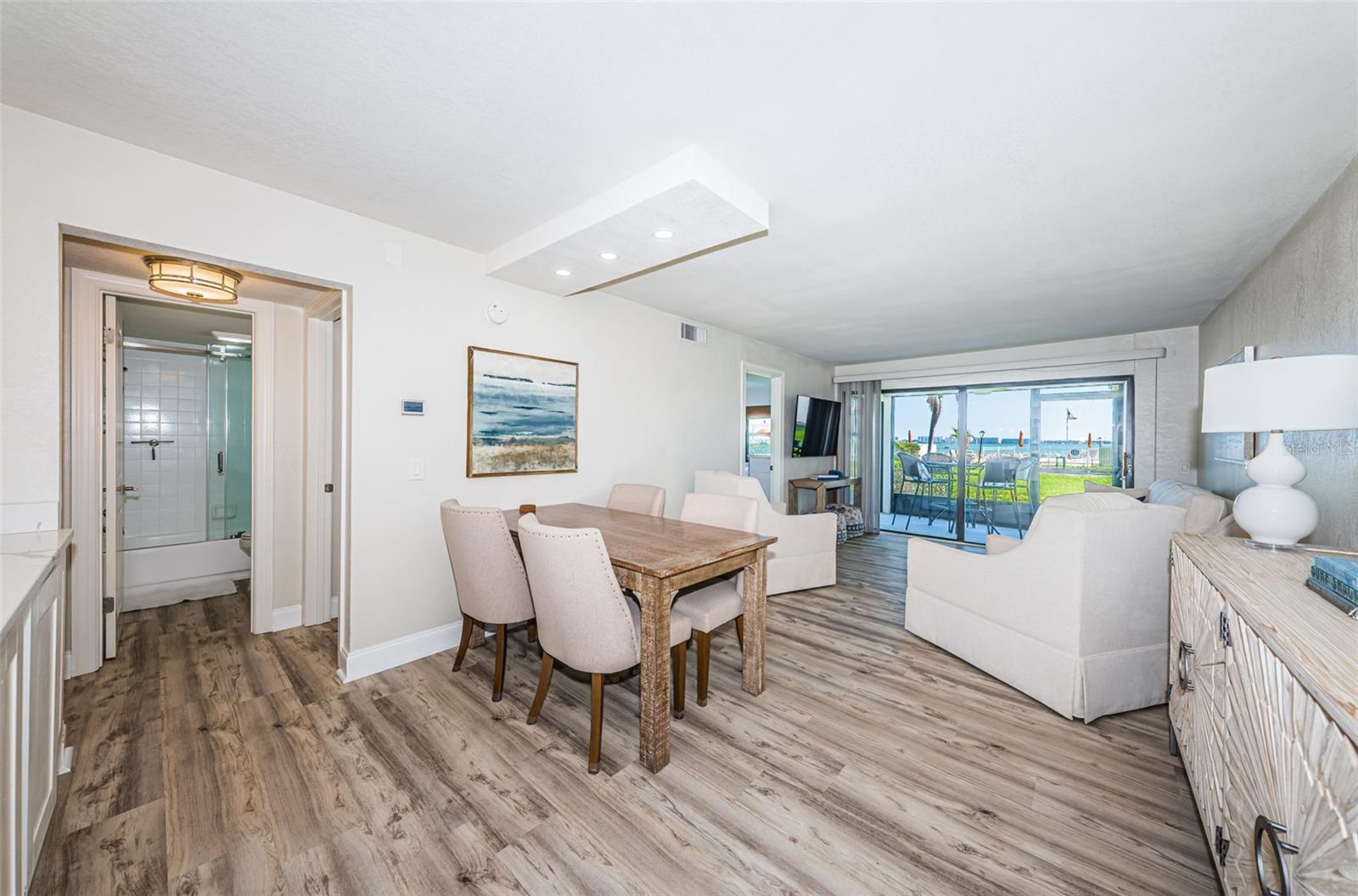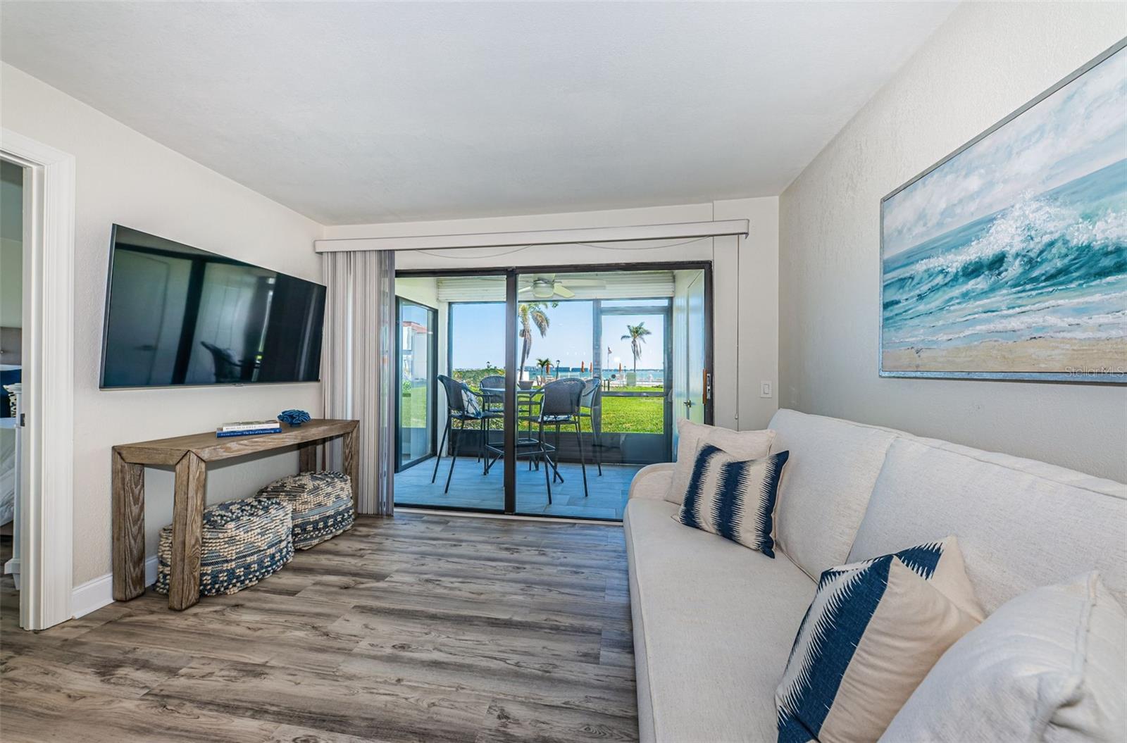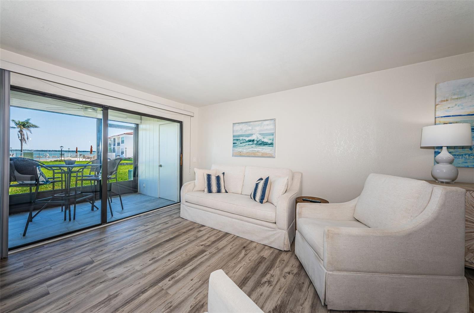 Tastefully remodeled in 2022 with high-end finishes, this ground floor villa overlooks the lushly landscaped pool area and Boca Ciega Bay. Perfect location just steps away to the pool and bay from the screened patio with a storage closet. The fully updated kitchen features beautiful cabinetry with an abundance of storage, beautiful quartz countertops, stainless steel appliances and recessed lighting. The view from the kitchen extends through the dining and living area out to the panoramic view beyond. The primary bedroom with its gorgeous views towards the pool and bay has a generous sized walk-in closet and spa-like ensuite bathroom. The split bedroom plan offers privacy for the guest bedroom that is adjacent to the updated secondary bathroom. A separate utility room has a newer washer/dryer. Additional quality features include luxury vinyl flooring with updated baseboard trim throughout, solid core doors with nickel-finish hardware, and updated lighting. Have peace of mind knowing you have hurricane shutters on all windows and patio, newly installed A/C, and easy access to the ground level assigned covered parking space #148. Sold turnkey with top-grade furnishings, this can be a luxurious rental unit or make this your permanent home or vacation get-away in paradise. Truly a resort lifestyle! Take advantage of a golf, tennis, yacht or social membership offered at Isla Del Sol Yacht & Country Club a short walk away. All of this, and within minutes of the award-winning beaches of Fort Desoto State Park, and top ranked St Pete Beach. Or with easy access to I275, you're only 15 minutes to the vibrant activity of the nightlife, restaurants and shopping in downtown St Petersburg.