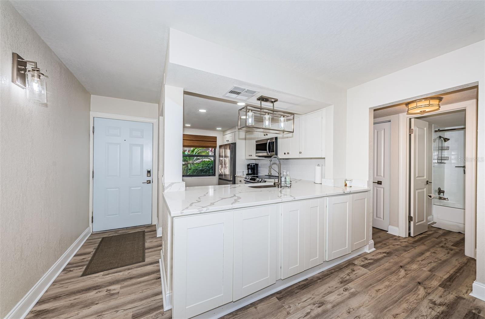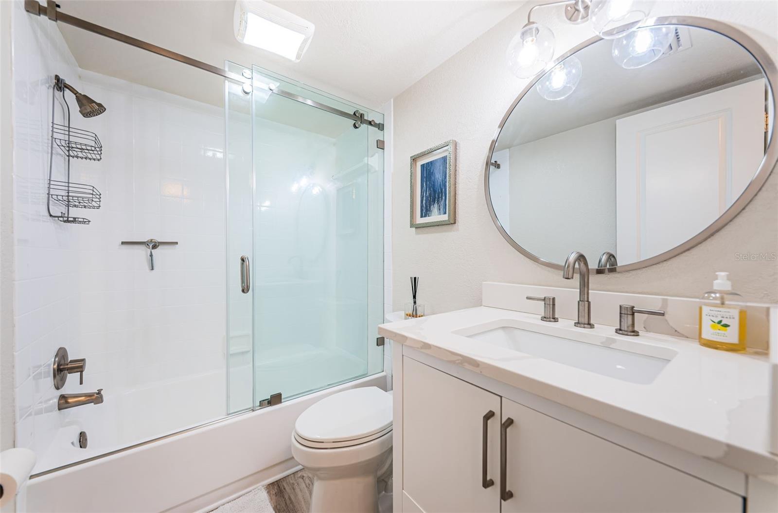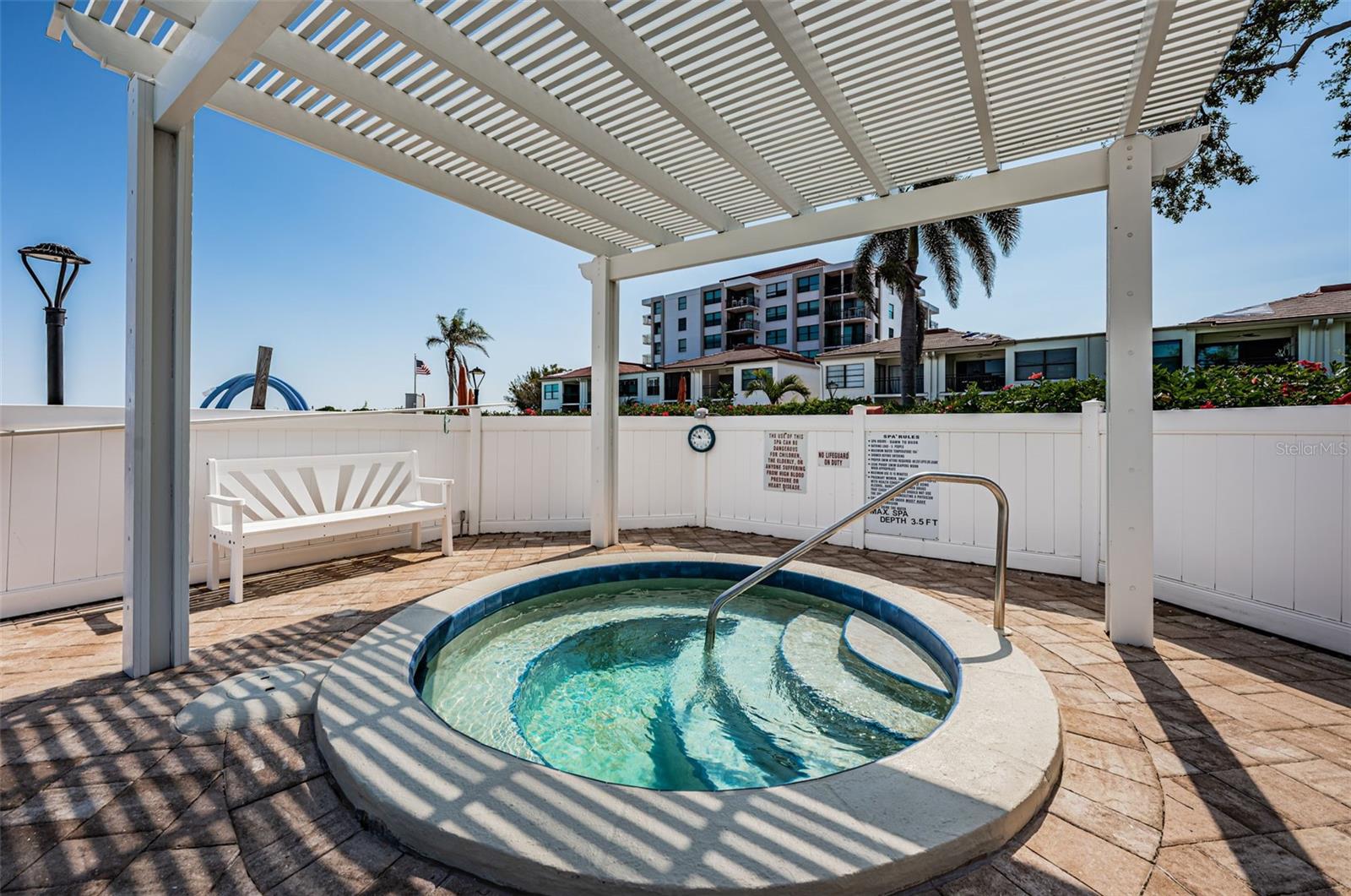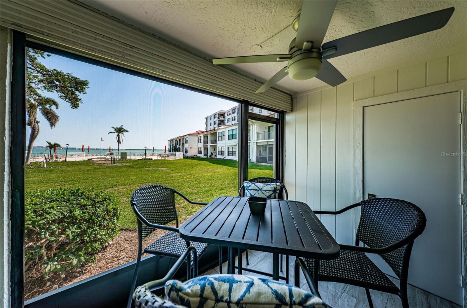 Tastefully remodeled in 2022 with high-end finishes, this ground floor villa overlooks the lushly landscaped pool area and Boca Ciega Bay. Perfect location just steps away to the pool and bay from the screened patio with a storage closet. The fully updated kitchen features beautiful cabinetry with an abundance of storage, beautiful quartz countertops, stainless steel appliances and recessed lighting. The view from the kitchen extends through the dining and living area out to the panoramic view beyond. The primary bedroom with its gorgeous views towards the pool and bay has a generous sized walk-in closet and spa-like ensuite bathroom. The split bedroom plan offers privacy for the guest bedroom that is adjacent to the updated secondary bathroom. A separate utility room has a newer washer/dryer. Additional quality features include luxury vinyl flooring with updated baseboard trim throughout, solid core doors with nickel-finish hardware, and updated lighting. Have peace of mind knowing you have hurricane shutters on all windows and patio, newly installed A/C, and easy access to the ground level assigned covered parking space #148. Sold turnkey with top-grade furnishings, this can be a luxurious rental unit or make this your permanent home or vacation get-away in paradise. Truly a resort lifestyle! Take advantage of a golf, tennis, yacht or social membership offered at Isla Del Sol Yacht & Country Club a short walk away. All of this, and within minutes of the award-winning beaches of Fort Desoto State Park, and top ranked St Pete Beach. Or with easy access to I275, you're only 15 minutes to the vibrant activity of the nightlife, restaurants and shopping in downtown St Petersburg.