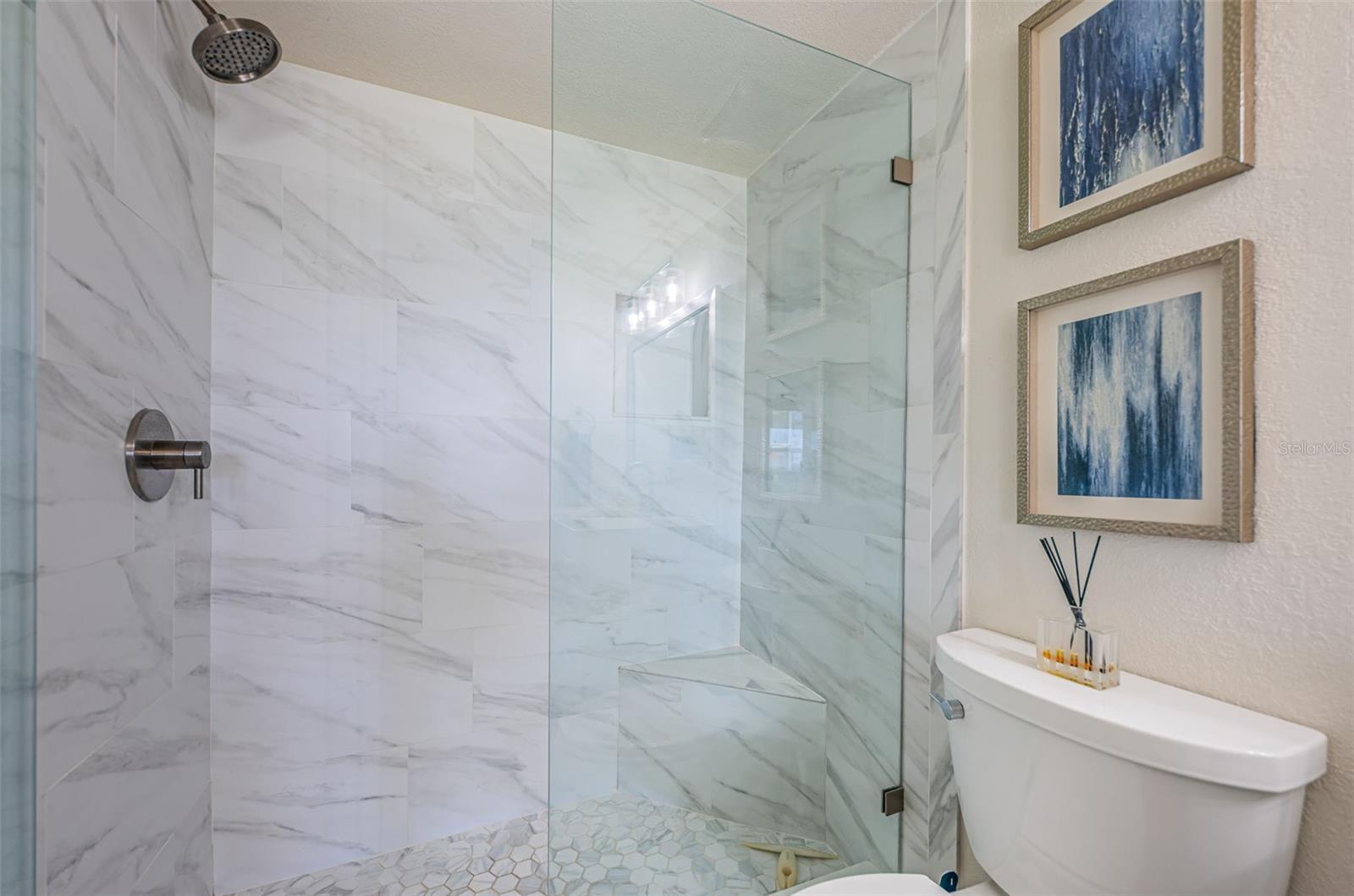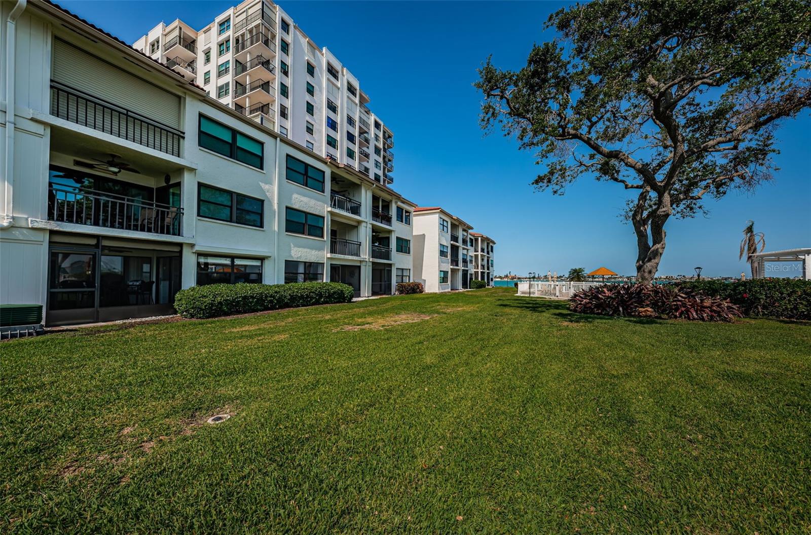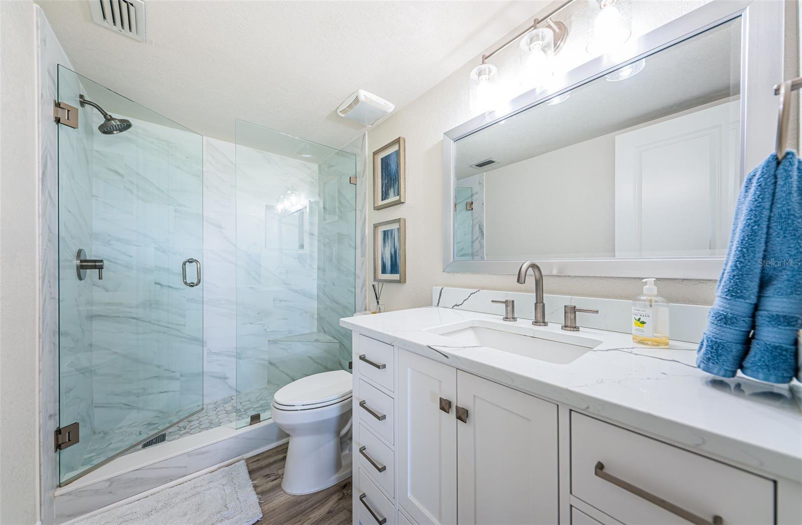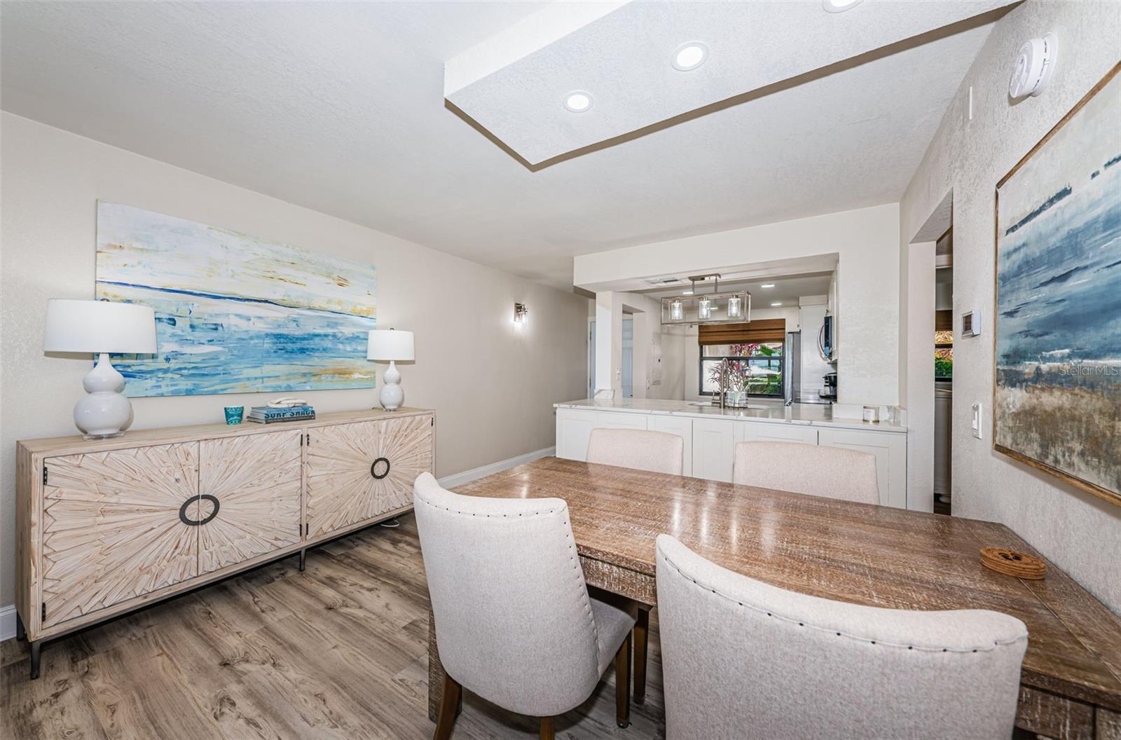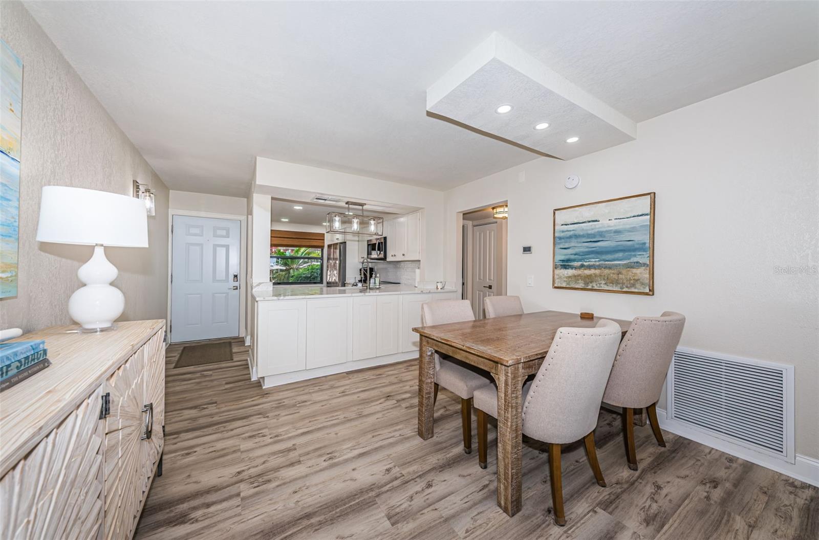 Tastefully remodeled in 2022 with high-end finishes, this ground floor villa overlooks the lushly landscaped pool area and Boca Ciega Bay. Perfect location just steps away to the pool and bay from the screened patio with a storage closet. The fully updated kitchen features beautiful cabinetry with an abundance of storage, beautiful quartz countertops, stainless steel appliances and recessed lighting. The view from the kitchen extends through the dining and living area out to the panoramic view beyond. The primary bedroom with its gorgeous views towards the pool and bay has a generous sized walk-in closet and spa-like ensuite bathroom. The split bedroom plan offers privacy for the guest bedroom that is adjacent to the updated secondary bathroom. A separate utility room has a newer washer/dryer. Additional quality features include luxury vinyl flooring with updated baseboard trim throughout, solid core doors with nickel-finish hardware, and updated lighting. Have peace of mind knowing you have hurricane shutters on all windows and patio, newly installed A/C, and easy access to the ground level assigned covered parking space #148. Sold turnkey with top-grade furnishings, this can be a luxurious rental unit or make this your permanent home or vacation get-away in paradise. Truly a resort lifestyle! Take advantage of a golf, tennis, yacht or social membership offered at Isla Del Sol Yacht & Country Club a short walk away. All of this, and within minutes of the award-winning beaches of Fort Desoto State Park, and top ranked St Pete Beach. Or with easy access to I275, you're only 15 minutes to the vibrant activity of the nightlife, restaurants and shopping in downtown St Petersburg.