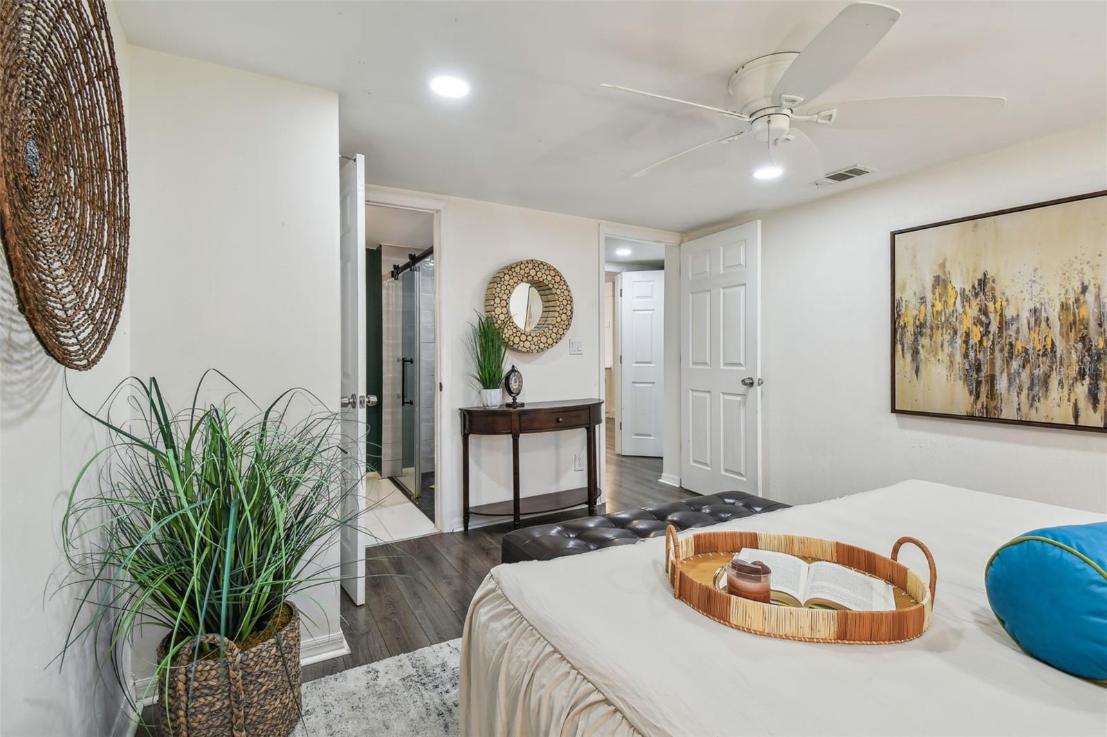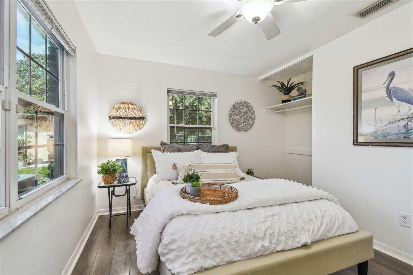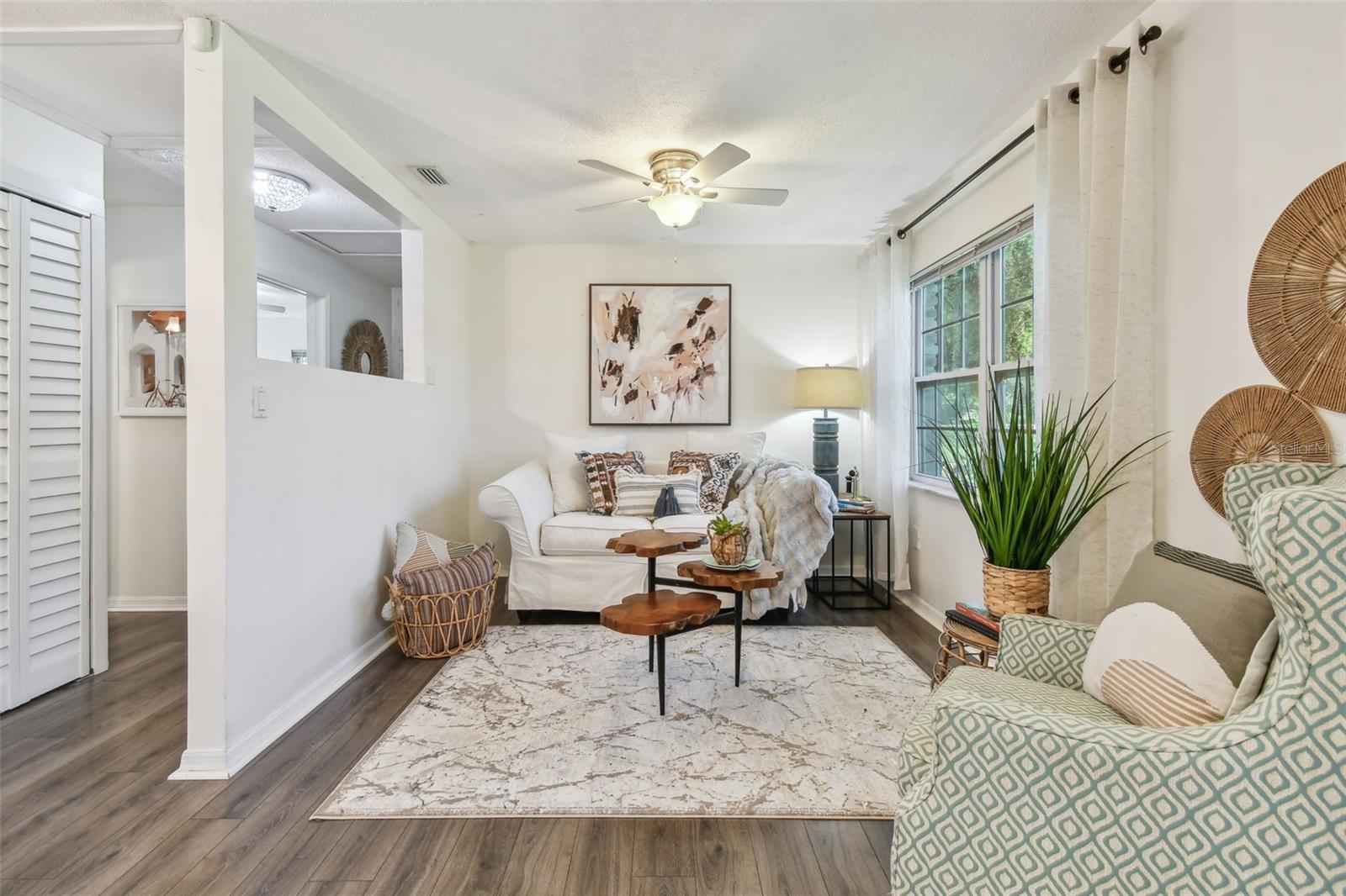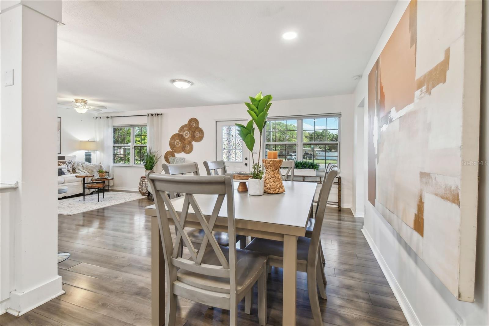 PRICE IMPROVEMENT! BRING ALL OFFERS! Tucked away on an expansive corner lot (96x100), this delightful home offers a blend of character and modern comfort. The charming brick exterior of this 1953 home invites you inside, where a bright and airy split/open floor plan awaits. The open layout includes a cozy living room perfect for intimate gatherings along with a sprawling, multi-purpose family room that can be used as a second living area, office space, or can be converted into a 4th bedroom/guest space. The kitchen is designed for function and style, with quartz countertops and plenty of counter space and storage space for all your cooking needs. The dining area is conveniently situated between the kitchen and living room. The primary bedroom sits quietly on the left side of the split floorplan offering a peaceful retreat with plenty of closet space along with a private updated bathroom, while the two additional bedrooms and guest bath are positioned on the other side of the home for added privacy. The colonial-style windows bring in even more charm and highlight the natural light in the open living space. The enclosed porch in the back can be used for multiple purposes such as an inside/outside hangout space, home gym, workshop, additional storage, or a combination of all of these. You could even convert this space back into a carport. As you head into the backyard you'll be greeted by your own tropical retreat that offers plenty of shade with lush landscaping. The backyard also features a brick patio that sits right off the TV nook, perfect for enjoying outdoor entertainment under the shade—only a 15-minute drive to downtown St. Pete and within walking distance to Meadowlawn Park. Additional features include 2018 A/C system, a 2014 water heater, and a 2022 flat roof/2012 main roof. Schedule your showing today!