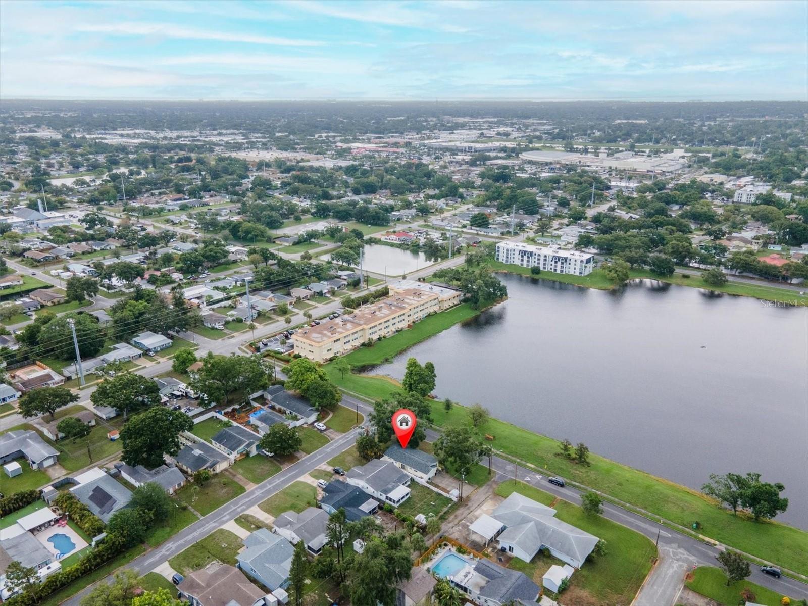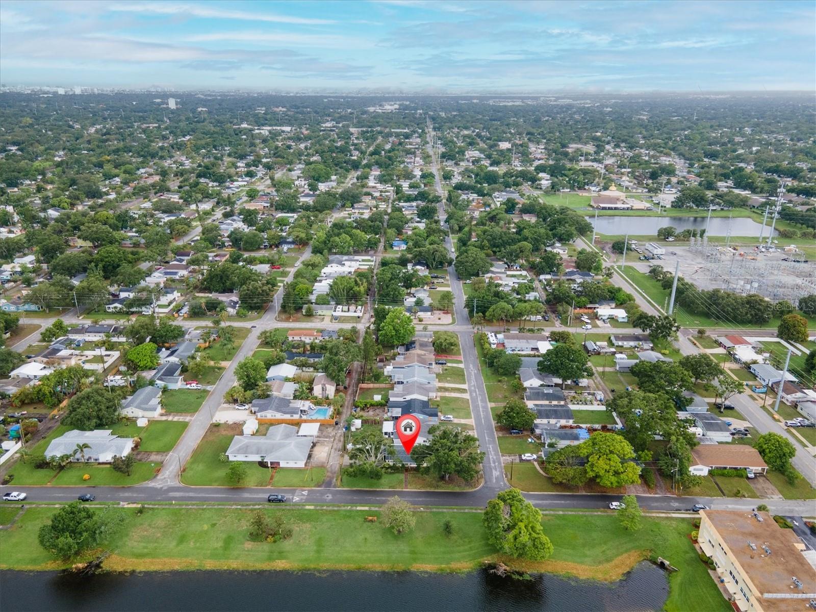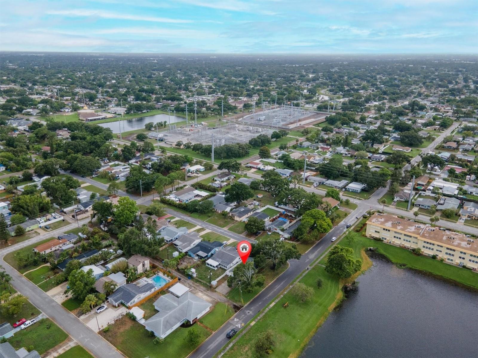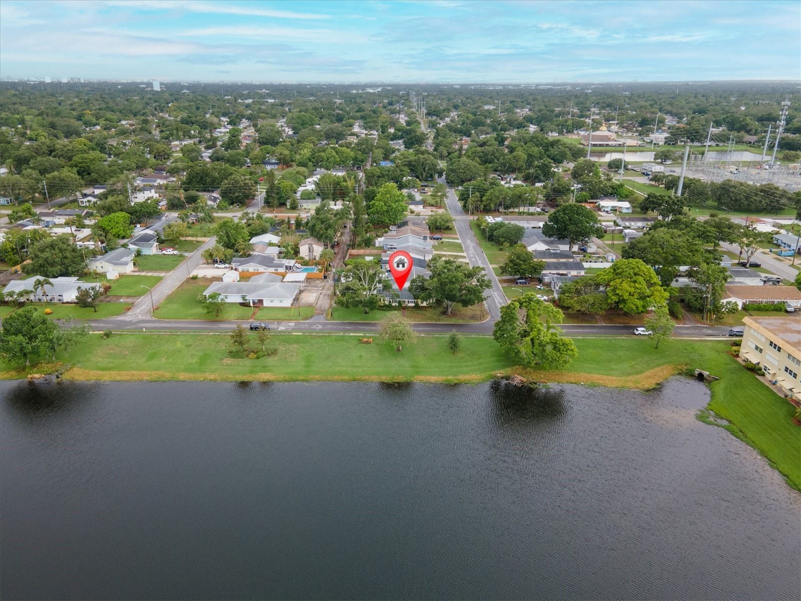 Well maintained and spacious 2/1 with an oversized attached garage in a perfect location of St. Pete. Nice corner lot with great curb appeal, with a large front porch. Very peaceful and serene setting overlooking Lake Jorgensen. Great water view in a NON-FLOOD area, you will love the quiet and idyllic neighborhood. Newer roof in 2021 alleviates concerns over a roof replacement for a long time. New water heater in 2024 with newer floors in the bedrooms. Plantation shutters throughout the home providing a sleek look and helps keep your home cool and shaded. The living room and dining combo are adjacent to the kitchen and have an open concept. The inside of the home overlooks the Lake from the living room, kitchen and primary bedroom. The well positioned kitchen is convenient with open space to the living areas with a double sink as you gaze out to the front porch and beautiful nature surrounding Lake Jorgenson. Sliding doors in the living room lead out to a patio area and side yard with artificial turf for easy maintenance. Great dog run area as well with newer vinyl privacy fencing and an outdoor shed. There is an irrigation system. The bathroom has been updated with a new vanity and fixtures. The bedrooms are spacious with large closet spaces, there is plenty of storage throughout the home. Newer fans are in the living room and bedrooms. The oversized garage has plenty of space for additional storage with a large parking pad leading up to the garage, perfect for a boat or additional vehicles. Great central St. Pete location with very easy access to vibrant downtown St. Pete and within minutes to our gorgeous beaches. Easy access to the highways, 1 mile away to get to anywhere in the area. Nearby shopping and restaurants makes everything accessible and convenient. Great starter home or an investment property in a non flood zone.