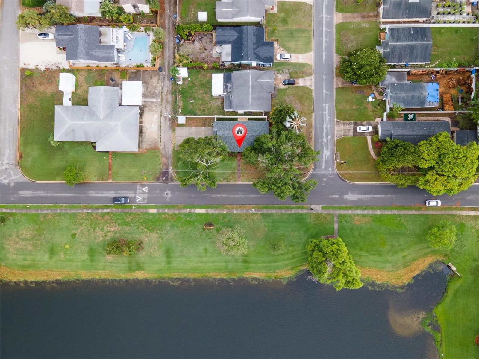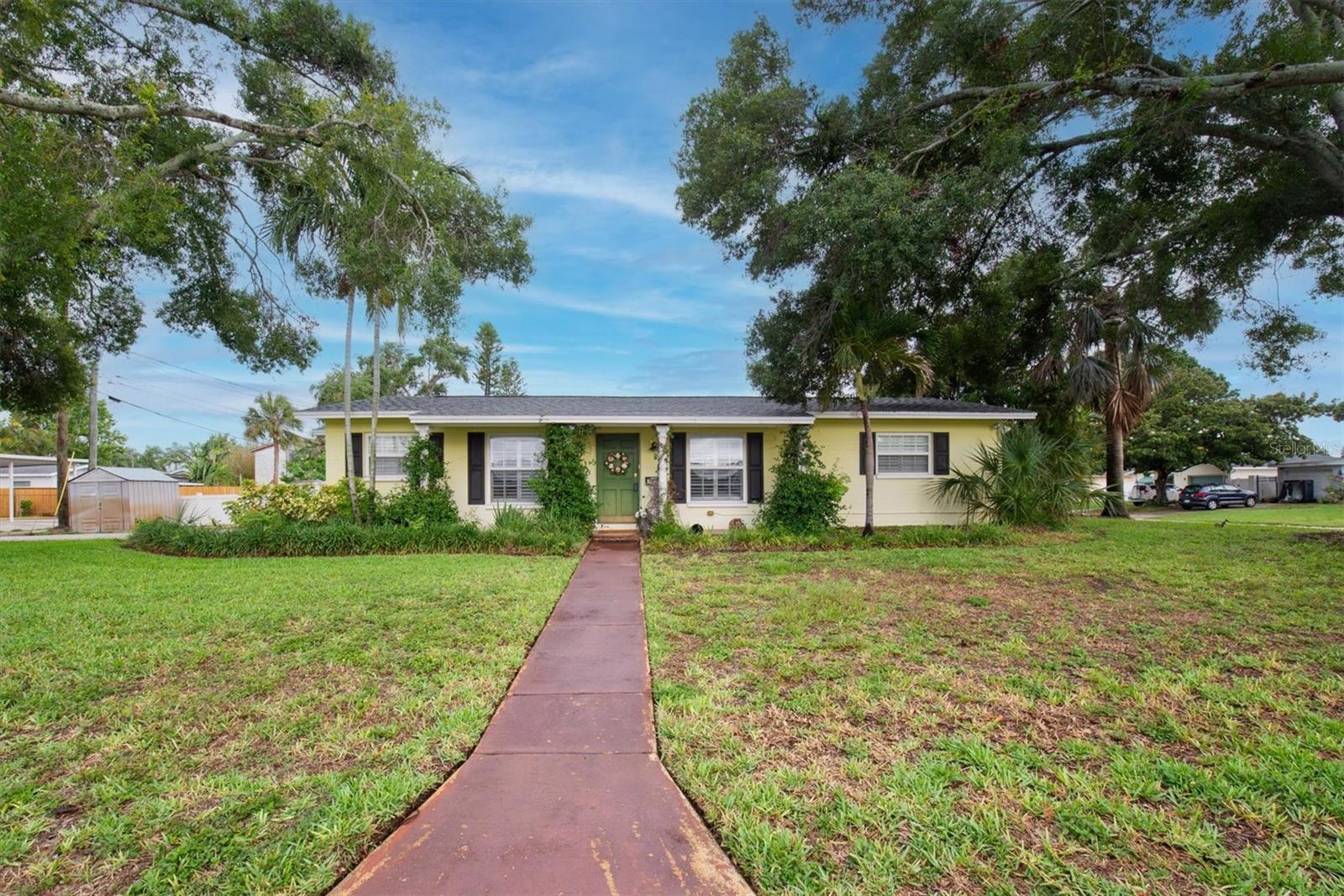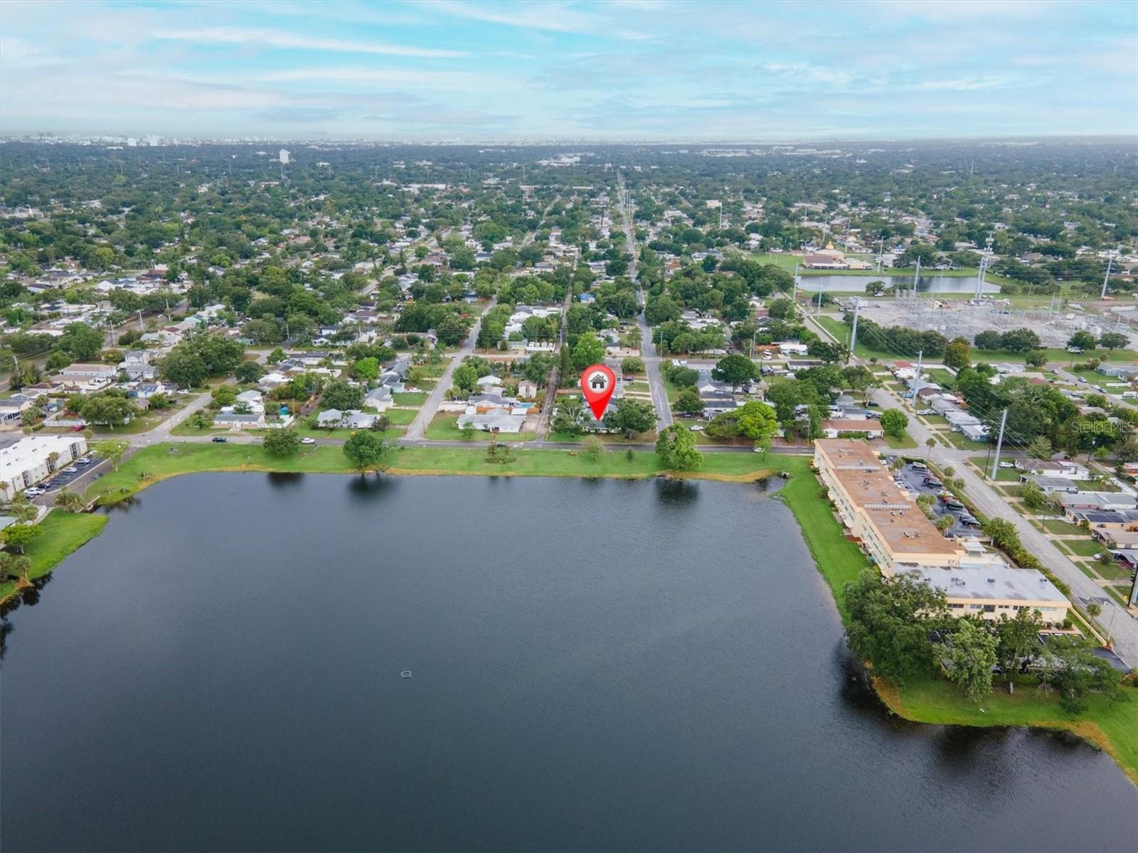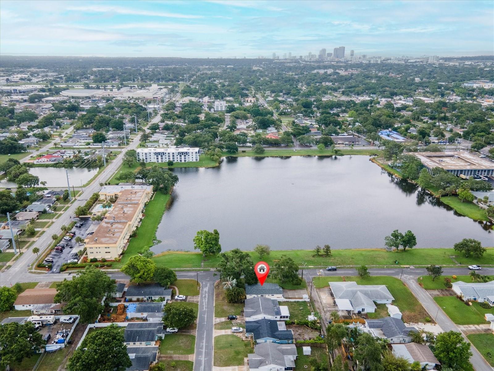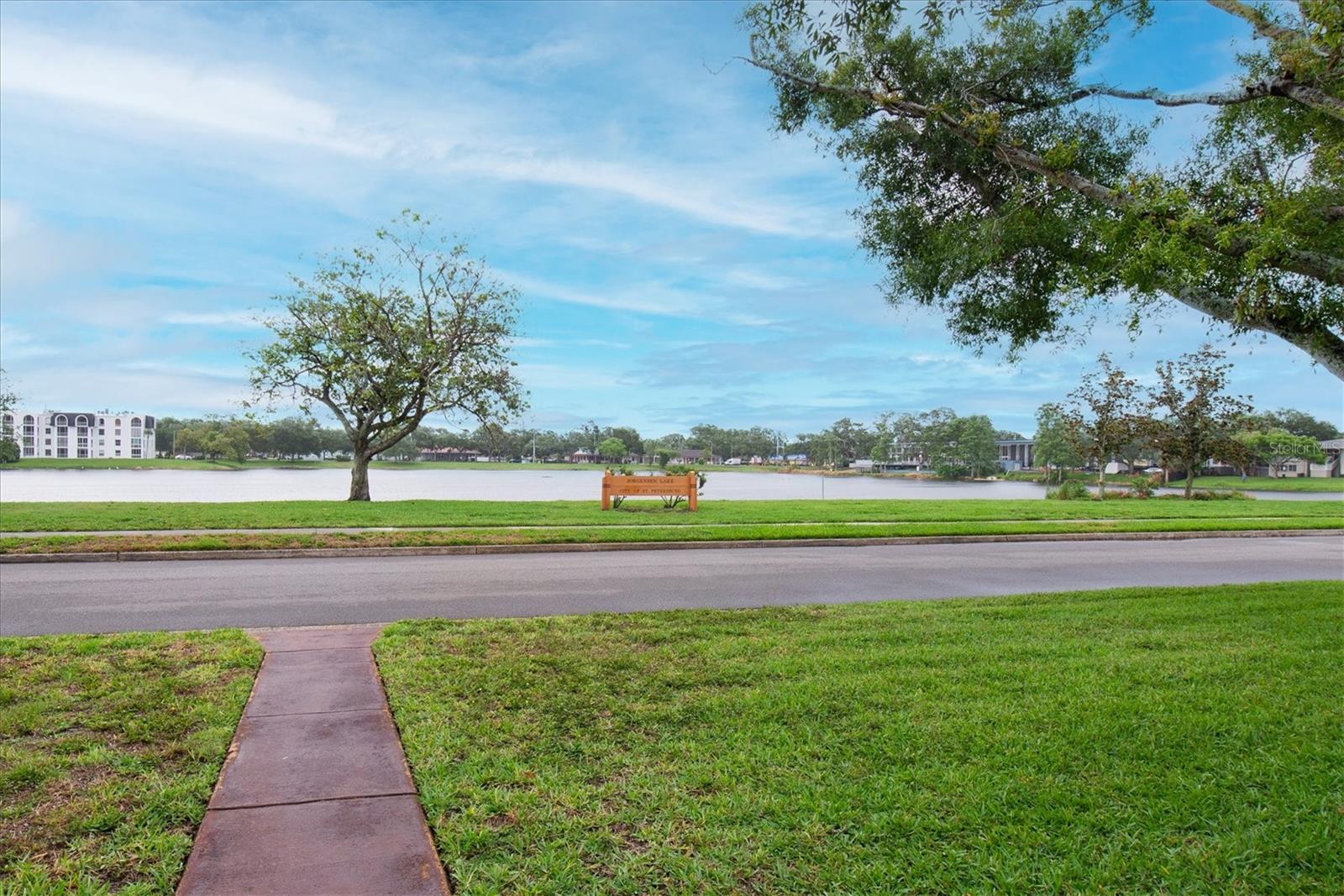 Well maintained and spacious 2/1 with an oversized attached garage in a perfect location of St. Pete. Nice corner lot with great curb appeal, with a large front porch. Very peaceful and serene setting overlooking Lake Jorgensen. Great water view in a NON-FLOOD area, you will love the quiet and idyllic neighborhood. Newer roof in 2021 alleviates concerns over a roof replacement for a long time. New water heater in 2024 with newer floors in the bedrooms. Plantation shutters throughout the home providing a sleek look and helps keep your home cool and shaded. The living room and dining combo are adjacent to the kitchen and have an open concept. The inside of the home overlooks the Lake from the living room, kitchen and primary bedroom. The well positioned kitchen is convenient with open space to the living areas with a double sink as you gaze out to the front porch and beautiful nature surrounding Lake Jorgenson. Sliding doors in the living room lead out to a patio area and side yard with artificial turf for easy maintenance. Great dog run area as well with newer vinyl privacy fencing and an outdoor shed. There is an irrigation system. The bathroom has been updated with a new vanity and fixtures. The bedrooms are spacious with large closet spaces, there is plenty of storage throughout the home. Newer fans are in the living room and bedrooms. The oversized garage has plenty of space for additional storage with a large parking pad leading up to the garage, perfect for a boat or additional vehicles. Great central St. Pete location with very easy access to vibrant downtown St. Pete and within minutes to our gorgeous beaches. Easy access to the highways, 1 mile away to get to anywhere in the area. Nearby shopping and restaurants makes everything accessible and convenient. Great starter home or an investment property in a non flood zone.