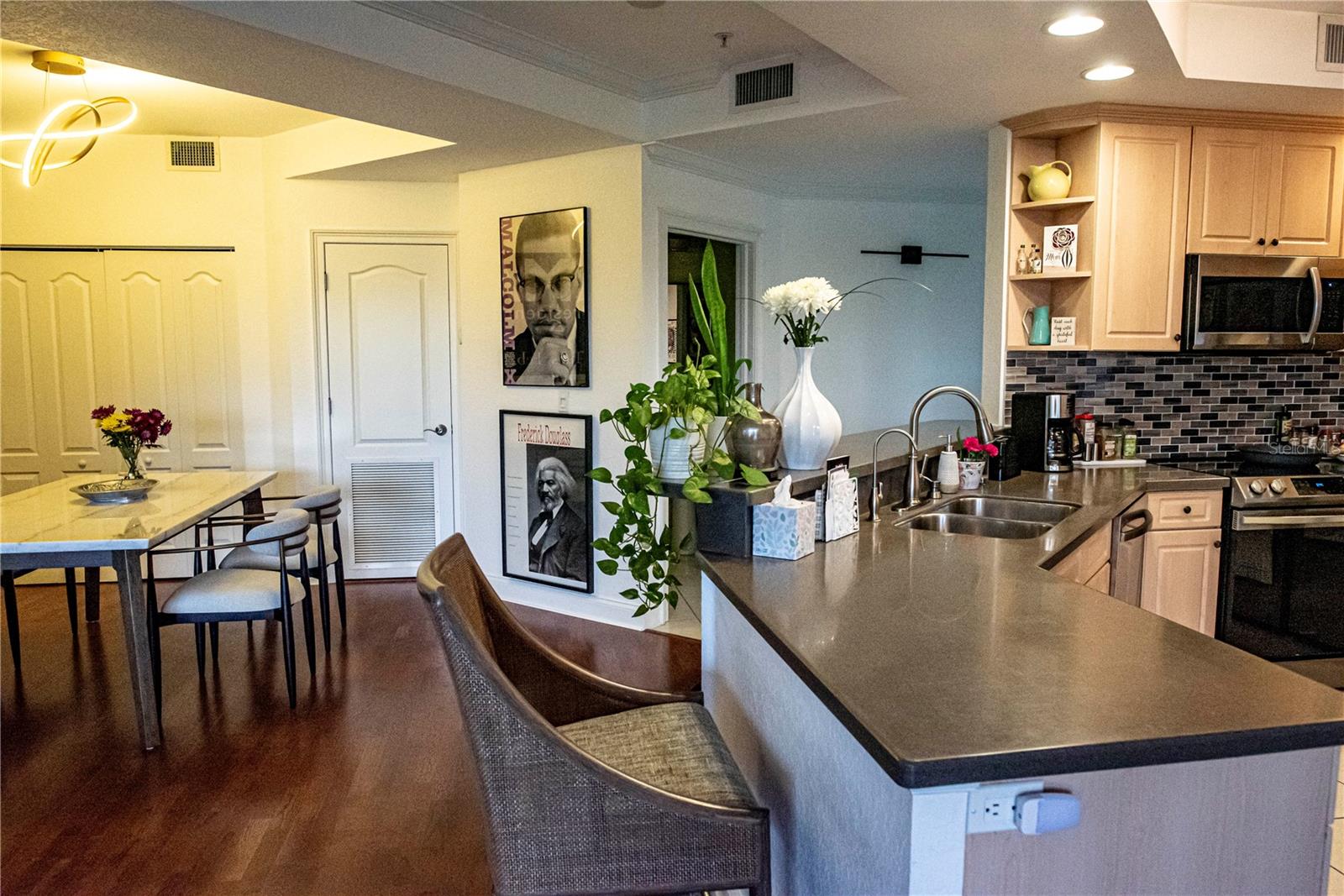 Boutique condo community in downtown St. Petersburg with 35 units and 5 office/retail spaces on the first floor. A spacious residence has a large Primary Suite and Guest Suite plus a powder room. This 4th floor unit has an open concept with a split floorplan offering privacy for the bedrooms. Rich wood flooring in the LR and DR. Build-in office unit. Samsung Stainless Appliances. New Lighting and Ceiling Fans. Grand balcony that offers your own personal treehouse view and city views. Roof top pool with panoramic views of Tampa Bay and St Petersburg, fitness center and beautiful lobby. Parking garage for one car and street parking for additional cars and guest parking. Location, Location, Location! Urban living just blocks aways from Central Ave and Beach Drive, groceries, dining, museums and entertainment. Close to St Petersburg Hospitals, Bayfront Health, St. Anthony’s, and Johns Hopkins. Easy access to 275, Tampa International, the Sunshine Skyway Bridge and gorgeous beaches. NON evacuation zone.
