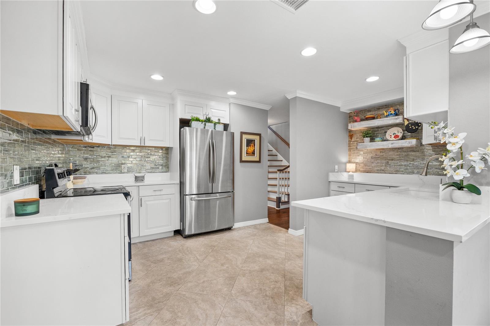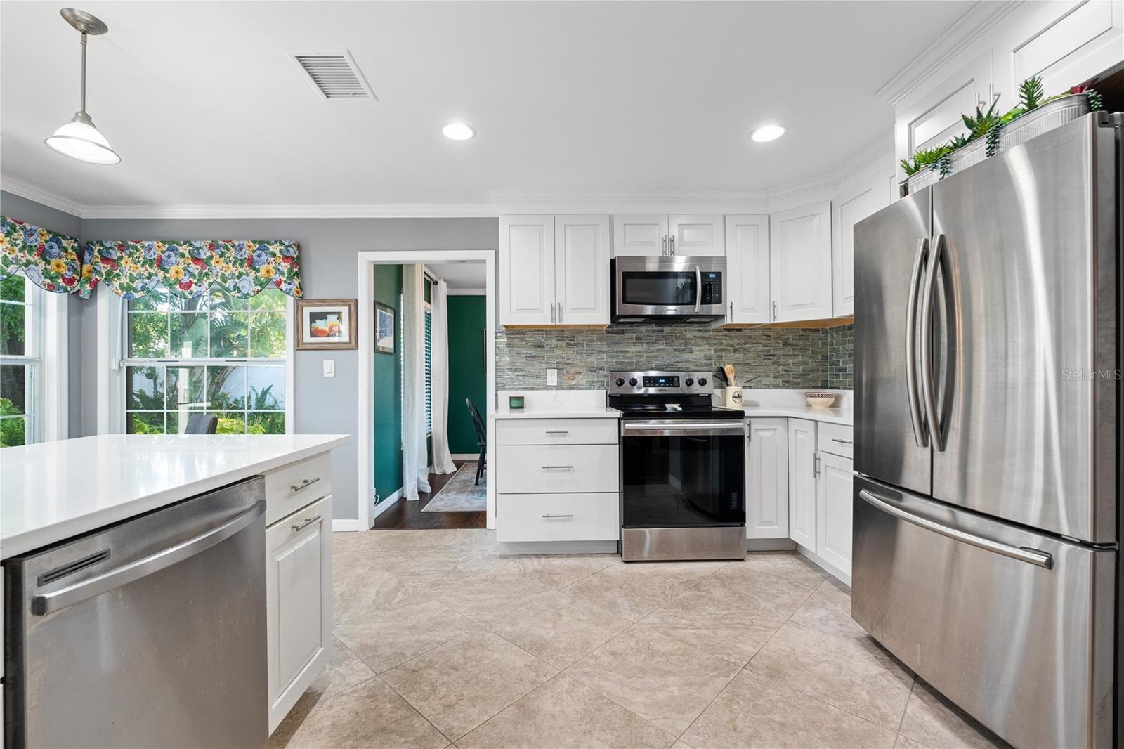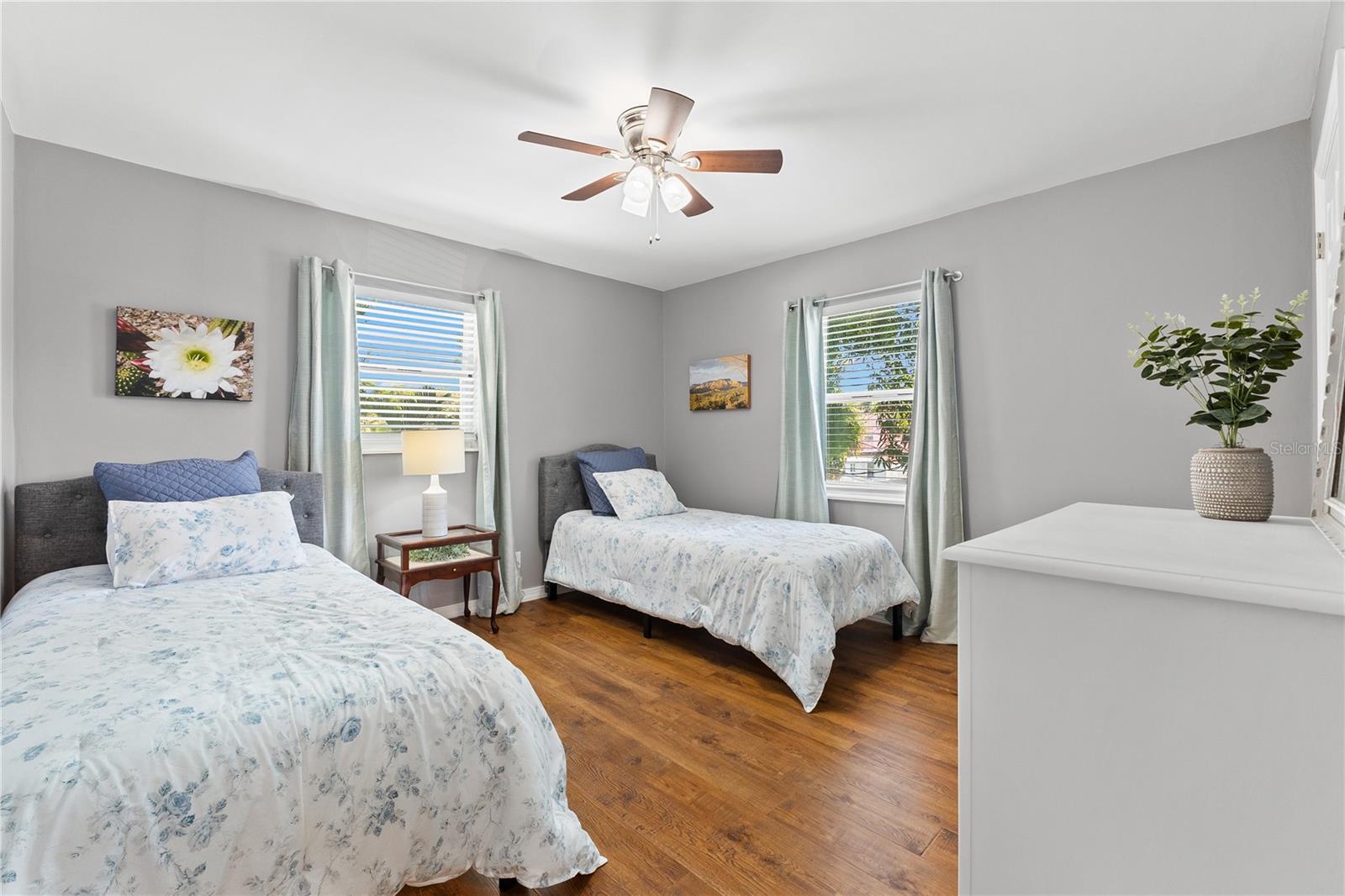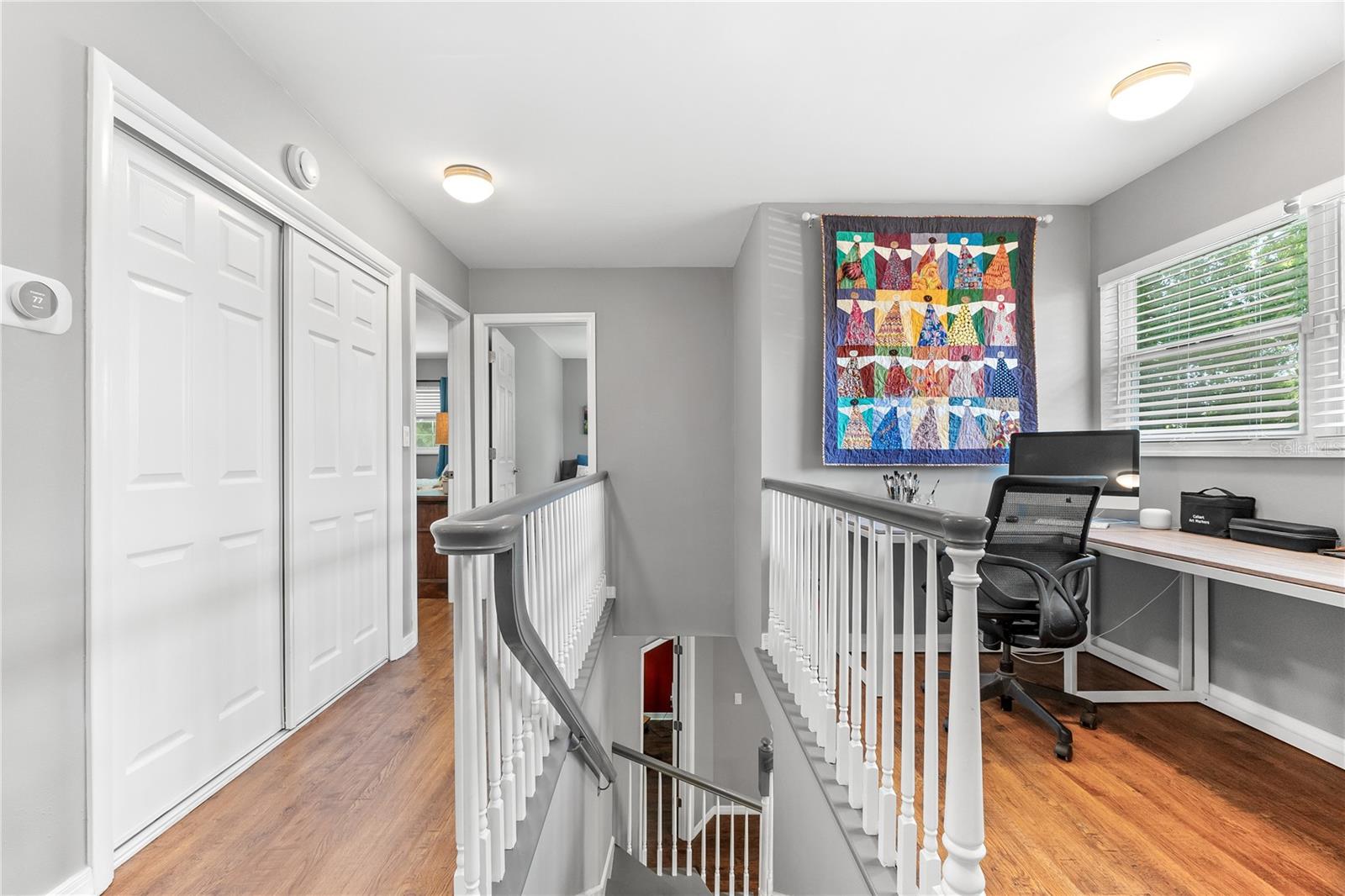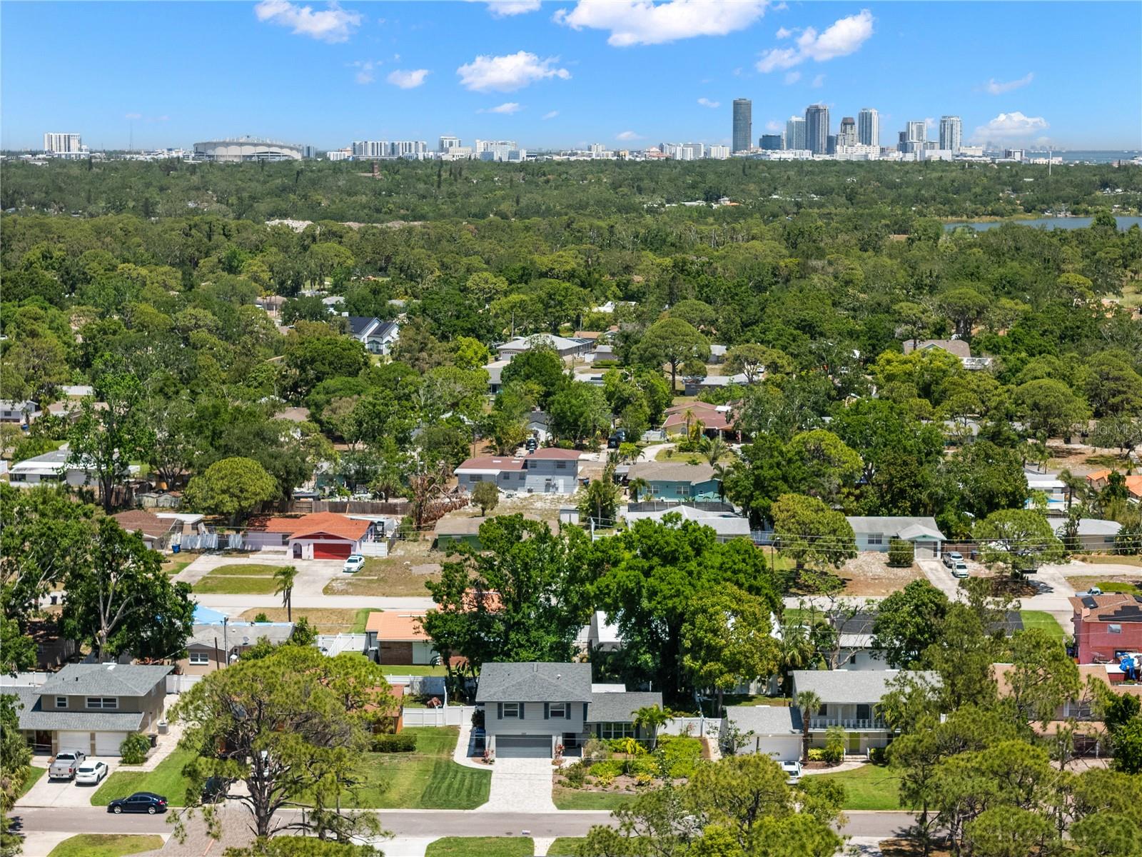 Welcome to Lakewood Estates, one of St. Pete’s most desirable neighborhoods—just minutes from the award-winning Gulf beaches, Boyd Hill Nature Preserve, and St. Petersburg Country Club. This beautifully updated 5-bedroom, 2.5-bath home offers the perfect blend of charm, function, and flexibility in a location that simply can’t be beat. A paver driveway and walkway lead to a carved wood front door, opening into a bright and expansive living space where rich dark wood laminate floors flow throughout the main level. The stunning custom kitchen features soft-close dovetail cabinetry, quartz countertops, a tile backsplash, and floating shelves—perfectly paired with a spacious dining area for effortless entertaining. French doors open to a large screened lanai with a new insulated roof, overlooking a private fenced backyard—ideal for outdoor living. Just off the kitchen, a versatile fifth bedroom offers the flexibility to be used as a guest room, home office, or den, with direct access to the lanai. A dedicated laundry room and updated half bath complete the thoughtfully designed first floor. Upstairs, you'll find four generously sized bedrooms, including a massive primary suite with a walk-in closet and a beautifully tiled en-suite bathroom. The fully updated hall bath features a sleek glass vanity and an oversized shower, while a cozy loft space provides the perfect nook for reading or work-from-home needs. Additional highlights include a newer roof, newer HVAC, updated windows with hurricane panels, and a two-car garage with a new door and opener. Best of all, this home has never experienced flooding or hurricane damage, and no flood insurance is required—offering long-term peace of mind. Don’t miss this move-in ready gem located on one of the premier streets in Lakewood Estates—schedule your private showing today!