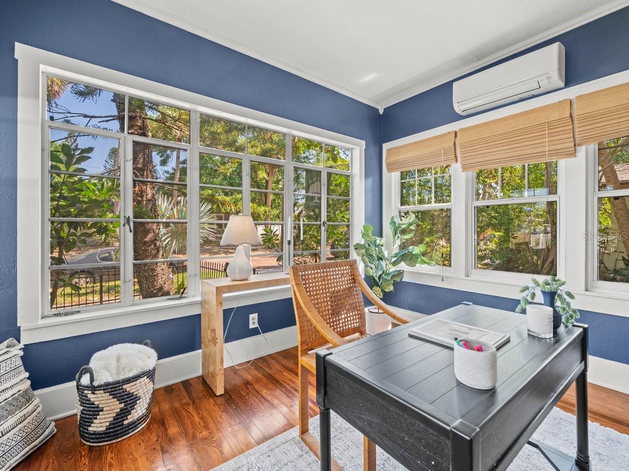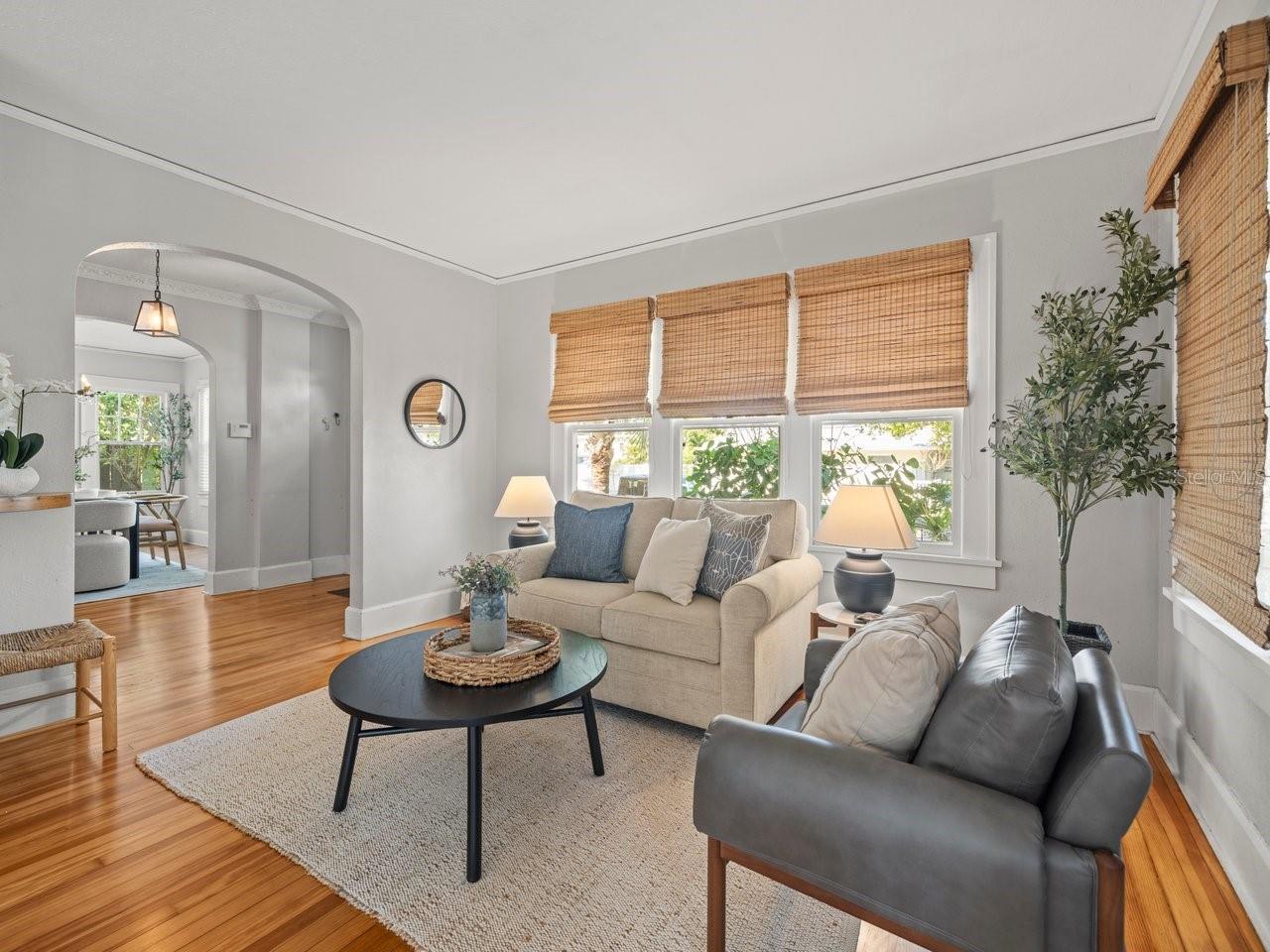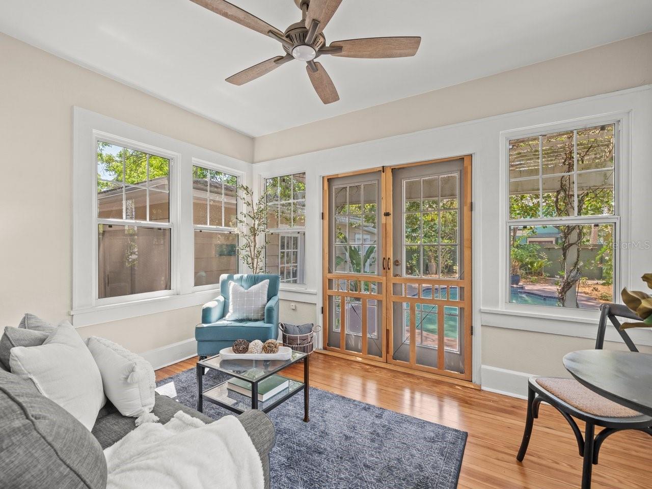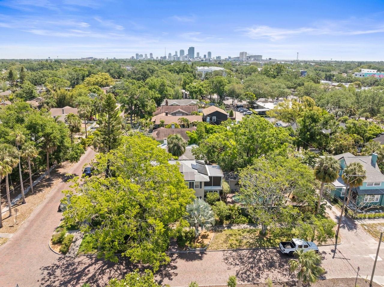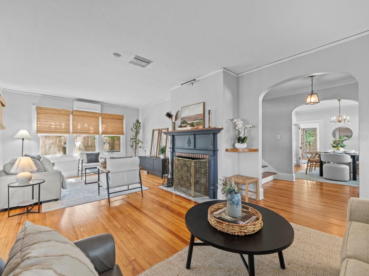 Welcome to this incredible character drenched pool home in the vibrant Grand Central District, one of St.Petersburg’s most coveted neighborhoods, known for its tree-lined streets, cobbled roads and rich architectural character, coupled with the walkability to the Central Avenue Arts District! This imposing property offers a natural light filled two-story residence exuding timeless charm! It has been lovingly maintained and tastefully improved in all its original glory. It is nestled on a very desirable corner lot featuring lush landscaping with accent lighting which add to the tremendous curb appeal of this dramatic classical home. From the moment you step into the grand entryway, you are greeted with the impressive original staircase, gleaming, recently refinished solid wood floors throughout and classic vintage finishes with original fixtures and fittings adding to the incredible draw of this historical property. You are immediately transported to a more elegant era. This stunning residence exudes timeless charm, lovingly maintained in its original glory while thoughtful updates ensure everyday comfort.The main floor flows beautifully from the formal living area with its own sunroom and impressive wood burning fireplace to the sun-drenched dining room only steps away from the cleverly designed kitchen which is a chef’s delight, blending modern upgrades with classic style, featuring an impressive gas Monogram stove, a charming Belfast sink, and picture-perfect views from the kitchen window, while providing complete privacy. It’s a space where form and function meet. The pantry/ laundry is only steps away from the kitchen and provides additional pantry style storage. There is an additional sitting room off the dining room and overlooks the walled garden complete with a heated pool and spill over spa. The spacious powder room is tucked away in the hallway, yet conveniently located under the stairs. There is a seperate and recently refinished flex room and storage building just steps away from the main house, perfect for summer pool parties, This room is directly off the pool area makes the perfect home gym, office, or art studio. This home includes solar panels which greatly reduces your electric costs for this sizable property. Don't delay in seeing this incredible property as it will not last! This property is in a non flood zone.