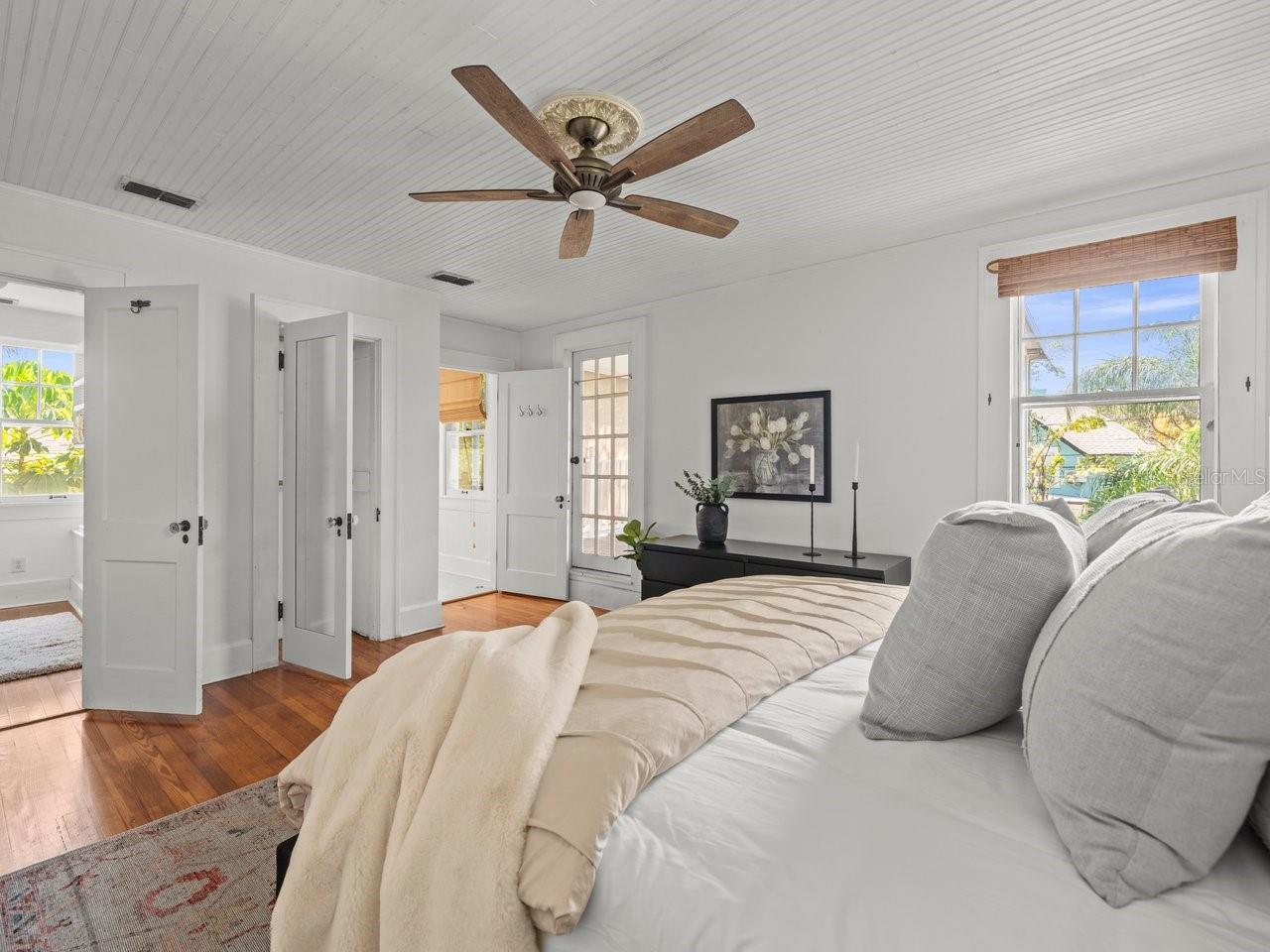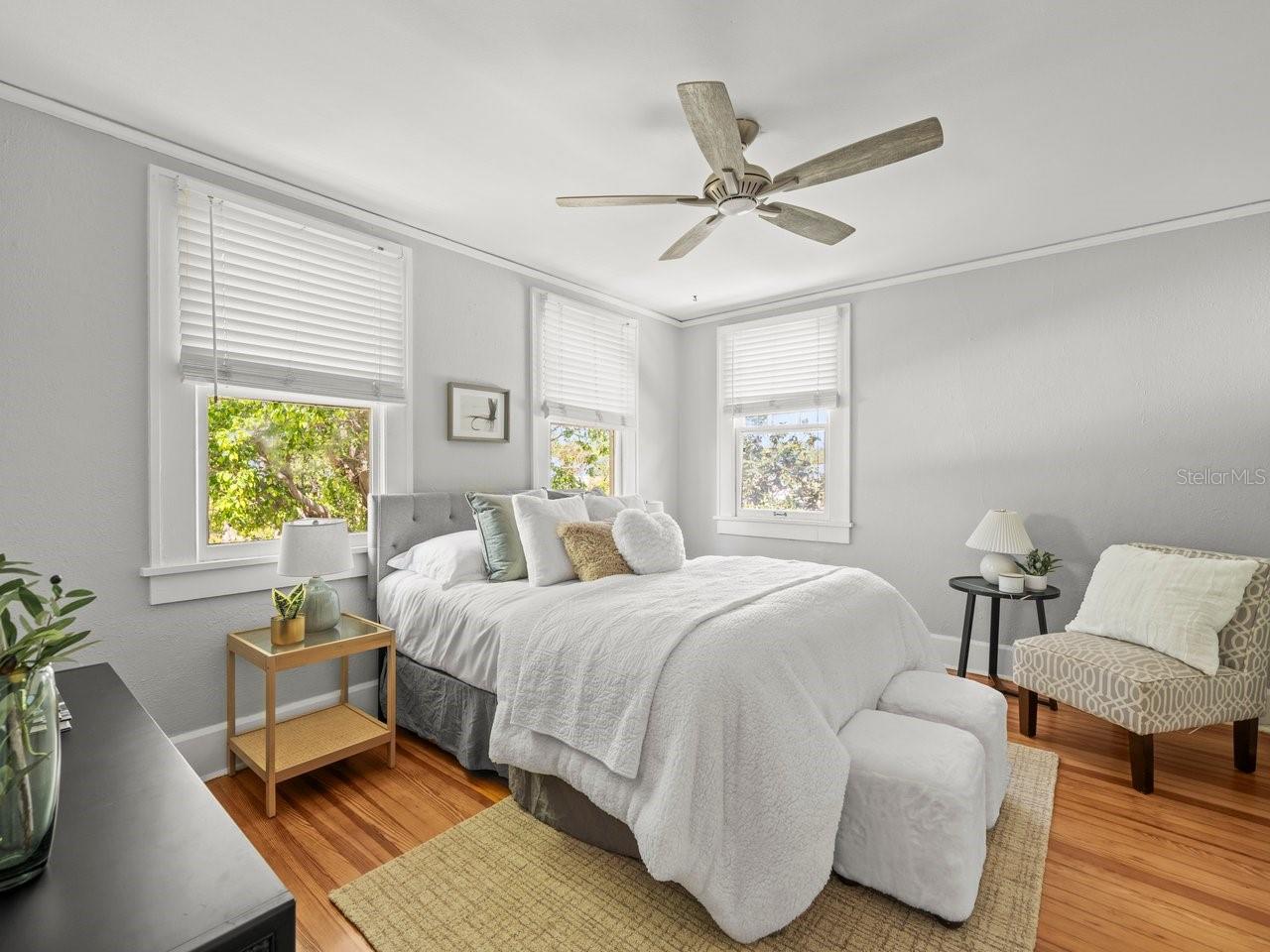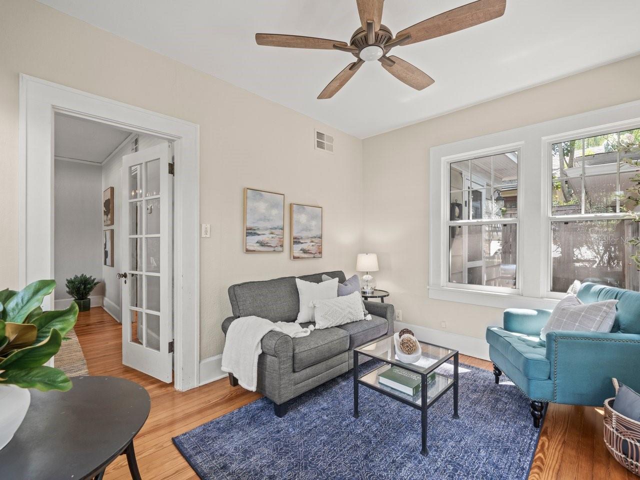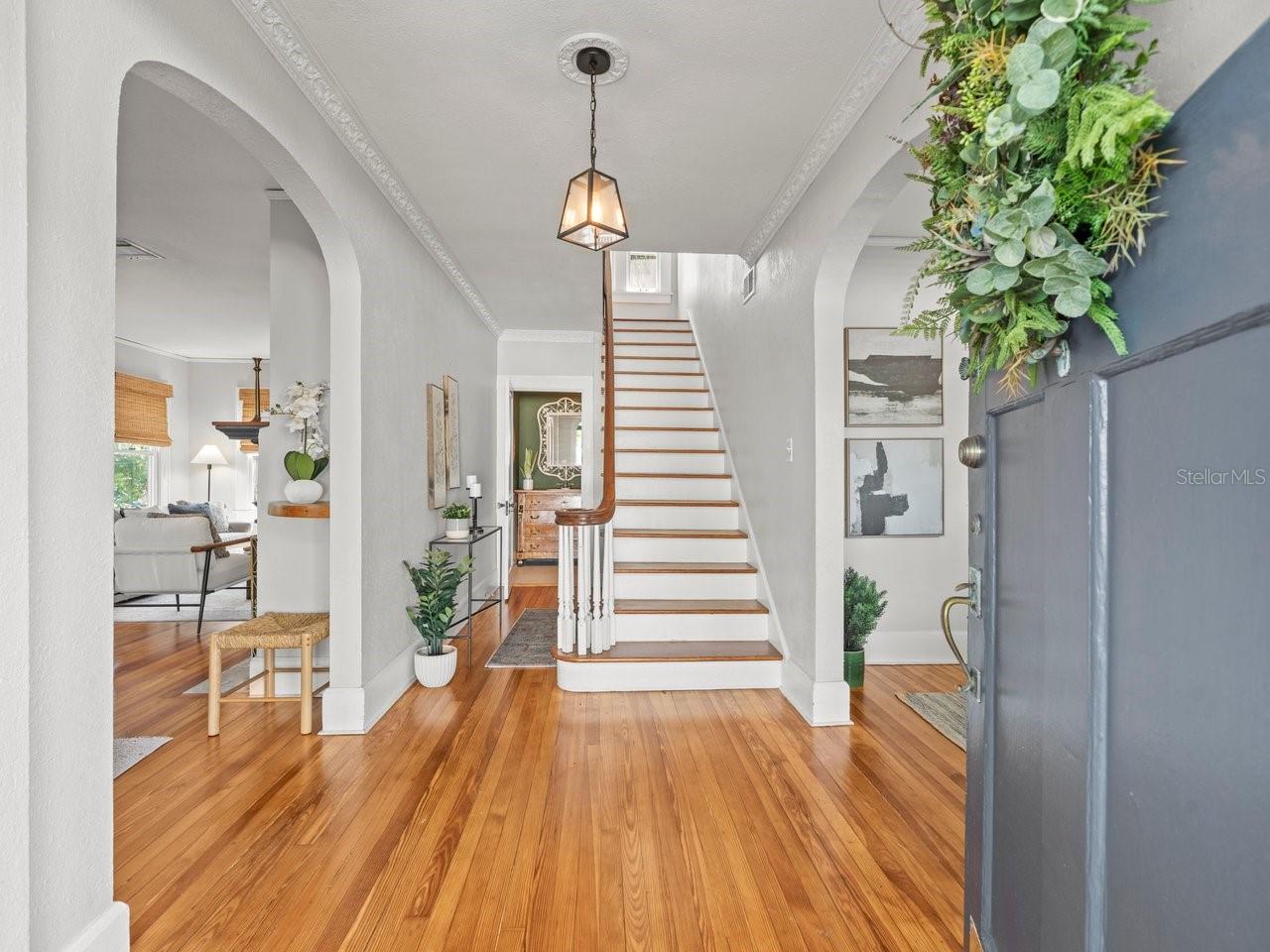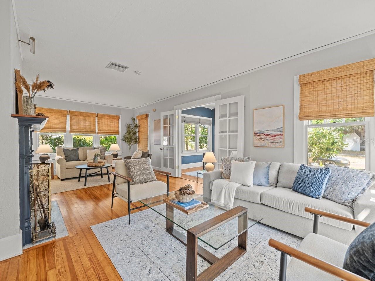 Welcome to this incredible character drenched pool home in the vibrant Grand Central District, one of St.Petersburg’s most coveted neighborhoods, known for its tree-lined streets, cobbled roads and rich architectural character, coupled with the walkability to the Central Avenue Arts District! This imposing property offers a natural light filled two-story residence exuding timeless charm! It has been lovingly maintained and tastefully improved in all its original glory. It is nestled on a very desirable corner lot featuring lush landscaping with accent lighting which add to the tremendous curb appeal of this dramatic classical home. From the moment you step into the grand entryway, you are greeted with the impressive original staircase, gleaming, recently refinished solid wood floors throughout and classic vintage finishes with original fixtures and fittings adding to the incredible draw of this historical property. You are immediately transported to a more elegant era. This stunning residence exudes timeless charm, lovingly maintained in its original glory while thoughtful updates ensure everyday comfort.The main floor flows beautifully from the formal living area with its own sunroom and impressive wood burning fireplace to the sun-drenched dining room only steps away from the cleverly designed kitchen which is a chef’s delight, blending modern upgrades with classic style, featuring an impressive gas Monogram stove, a charming Belfast sink, and picture-perfect views from the kitchen window, while providing complete privacy. It’s a space where form and function meet. The pantry/ laundry is only steps away from the kitchen and provides additional pantry style storage. There is an additional sitting room off the dining room and overlooks the walled garden complete with a heated pool and spill over spa. The spacious powder room is tucked away in the hallway, yet conveniently located under the stairs. There is a seperate and recently refinished flex room and storage building just steps away from the main house, perfect for summer pool parties, This room is directly off the pool area makes the perfect home gym, office, or art studio. This home includes solar panels which greatly reduces your electric costs for this sizable property. Don't delay in seeing this incredible property as it will not last! This property is in a non flood zone.