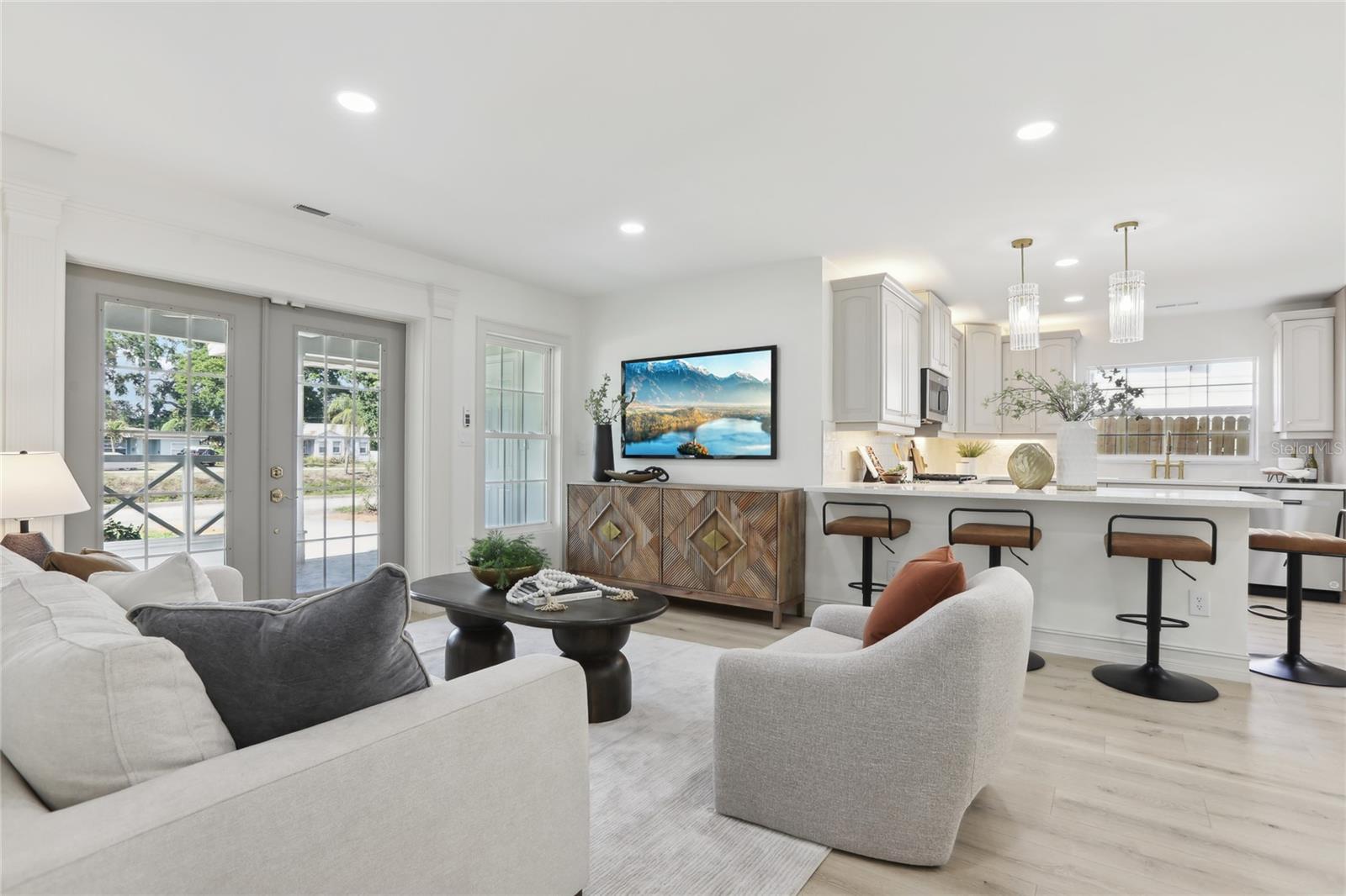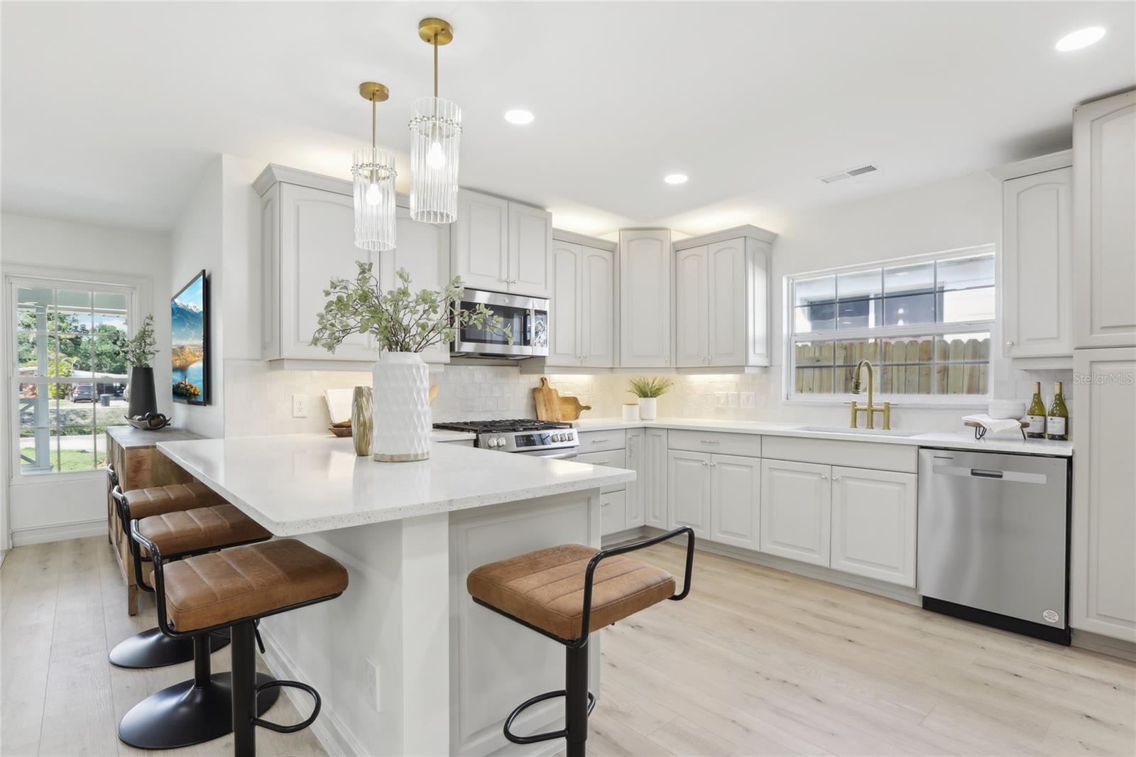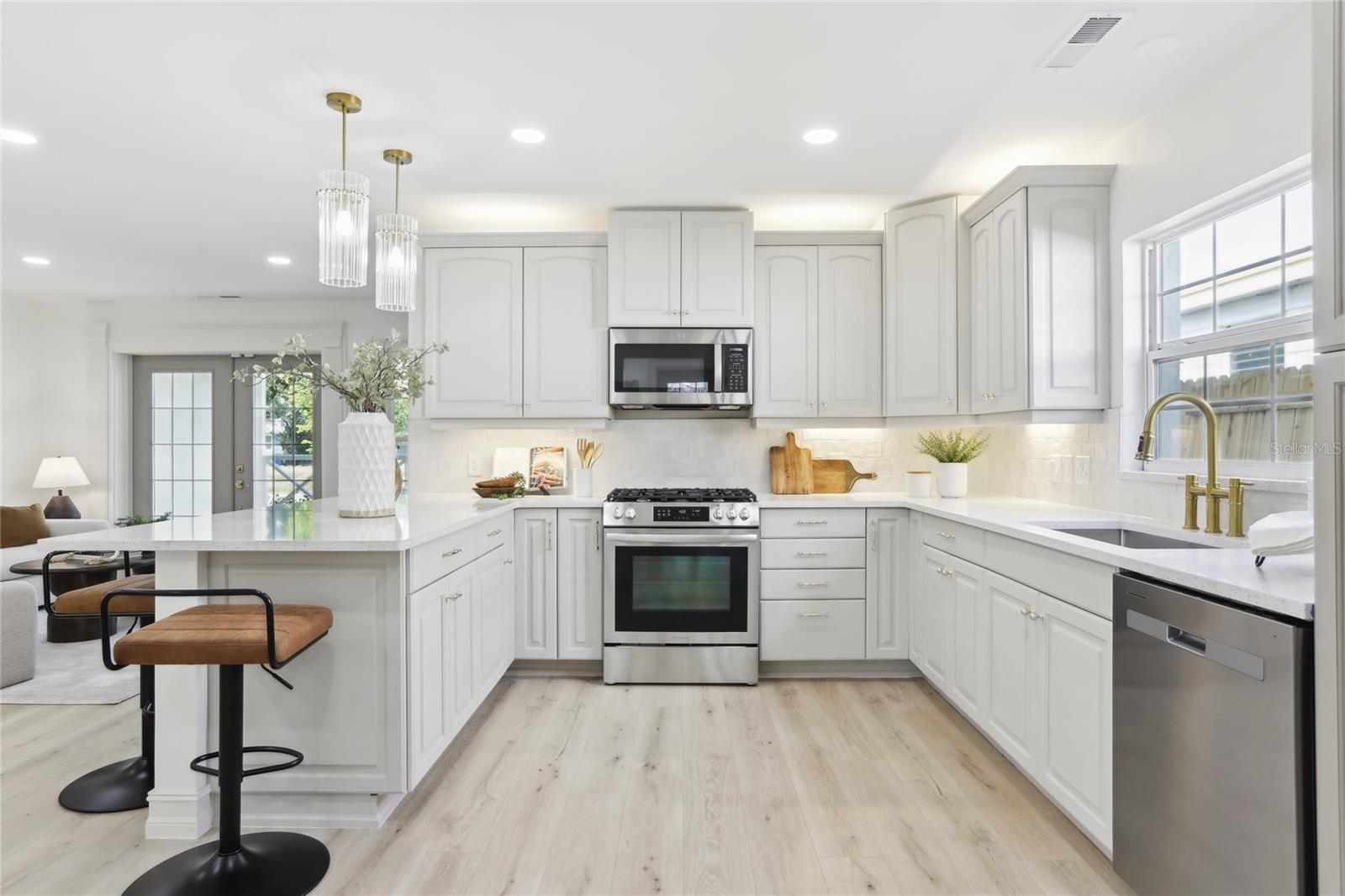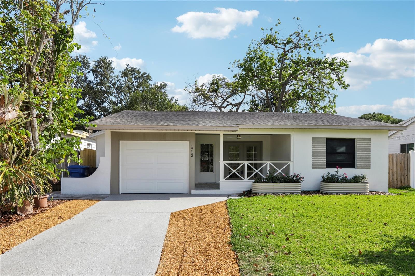Welcome to this beautifully updated home nestled in the highly sought-after Lake Euclid neighborhood of St. Petersburg—where no expense was spared in this full renovation. Situated high and dry outside of a flood zone, this 2-bedroom, 1-bathroom home offers a perfect blend of timeless style and thoughtful upgrades. A brand-new roof, new AC handler, and new tankless water heater ensure peace of mind for years to come. From the moment you arrive, the inviting curb appeal draws you in with a covered front porch, complete with a ceiling fan and elegant flooring—setting the tone for the warmth and character found inside. Double front doors lead you into a sun-drenched open-concept living space finished with level 5 smooth walls, new luxury vinyl plank flooring, recessed lighting, and graceful archways that nod to the home’s classic roots. The fully renovated kitchen is a true focal point, boasting stunning quartz countertops, all-new stainless steel appliances including a gas range, and barstool seating. Custom cabinetry provides ample storage, making this a dream space for any home chef. Both bedrooms are generously sized, offering peaceful retreats, while the remodeled bathroom stands out with its eye-catching checkered tile flooring, dual sink vanity, and sleek modern finishes. Step outside through french doors to your private, fully fenced backyard—a tranquil space perfect for hosting, gardening, or simply enjoying a quiet Florida afternoon. Just minutes from downtown St. Pete, I-275, the historic Sunken Gardens, golf at the Vinoy, trendy dining, and award-winning beaches—this home delivers on location, lifestyle, and comfort. Don't miss your opportunity to own this Lake Euclid gem. Schedule your private showing today!