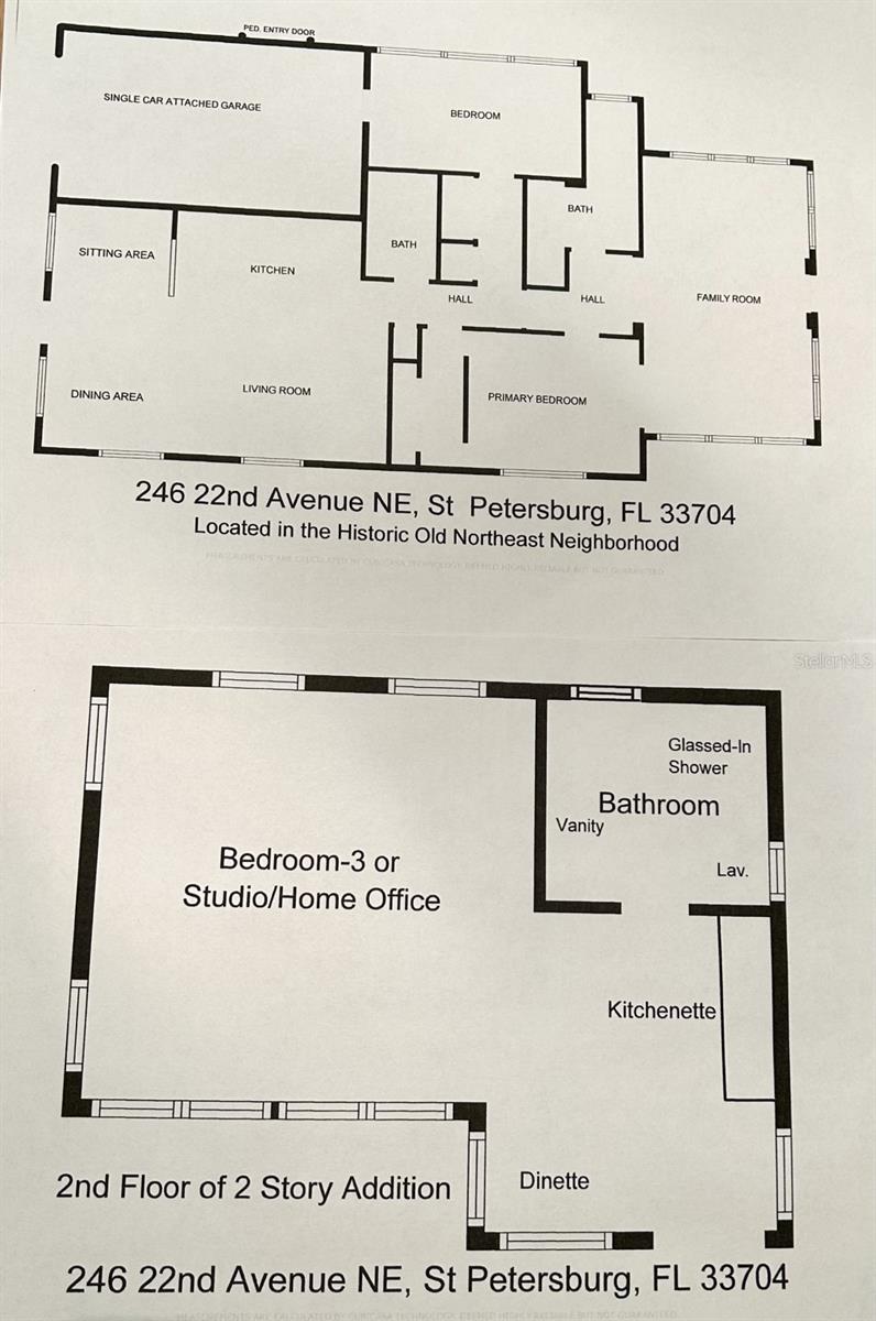 Don’t miss your opportunity to live in Historic Old Northeast, St Petersburg, just 2 blocks from Coffee Pot Bayou, but - NO DAMAGE FROM HURRICANES and NO FLOOD INSURANCE REQUIRED - this block-constructed home is in FEMA flood Zone X. Do you know that this part of 22nd Avenue is residential and only 2 lanes? Evenings are quiet and perfect for strolling through the Old Northeast and along the waterfront. Completely renovated and updated mid-century modern home, also with a new construction (built in 2018) 2 story addition which includes a light and bright sunroom on the 1st floor and a spacious 2nd floor en-suite 3rd bedroom/in-law suite/studio ‘apartment’ living area with its own mini-split central AC system - both spaces overlook a lush “English” style garden. You really must see the inside and fenced garden area to fully appreciate this well-maintained home. Nearly 2000 square feet of living space. 3-bedrooms, 3-full bathrooms, 1-car attached garage, fenced back yard, and circular brick paver driveway in front of the home. As soon as you step in the front door you are sure to be surprised and will appreciate the large, bright and open living area which includes the living room, kitchen, dining space, and separate sitting/reading area. The primary bedroom on the first level opens via French doors onto the spacious sunroom. Relax in this sunlit room, enjoy the quiet and view of a beautiful garden. And, there is still room for a pool. The 2nd story of the addition is perfect for working professionals who need a separate quiet space – or, if you are looking for income potential, this property qualifies for having a long-term rental unit (ADU, Accessory Dwelling Unit). Nothing to do now except move in. Clarification Note: County records indicate 1905sf of living space. Square footage of living space as provided by owner: 1933sf.