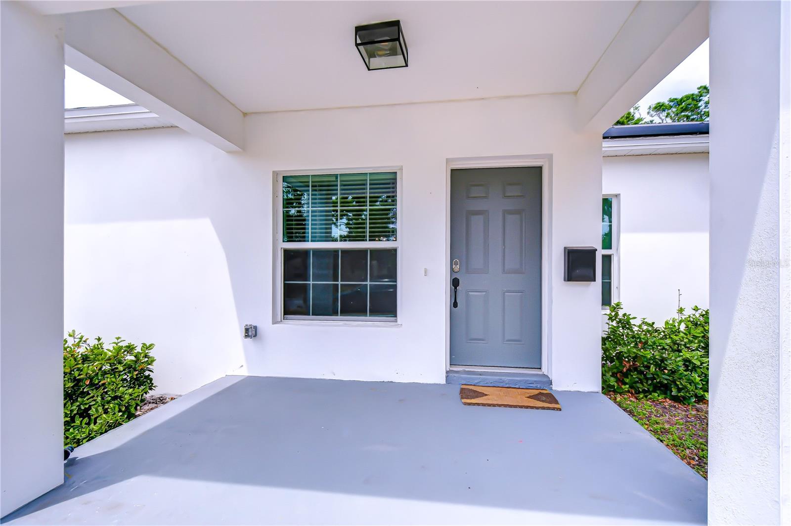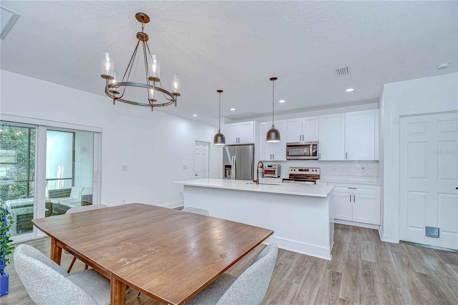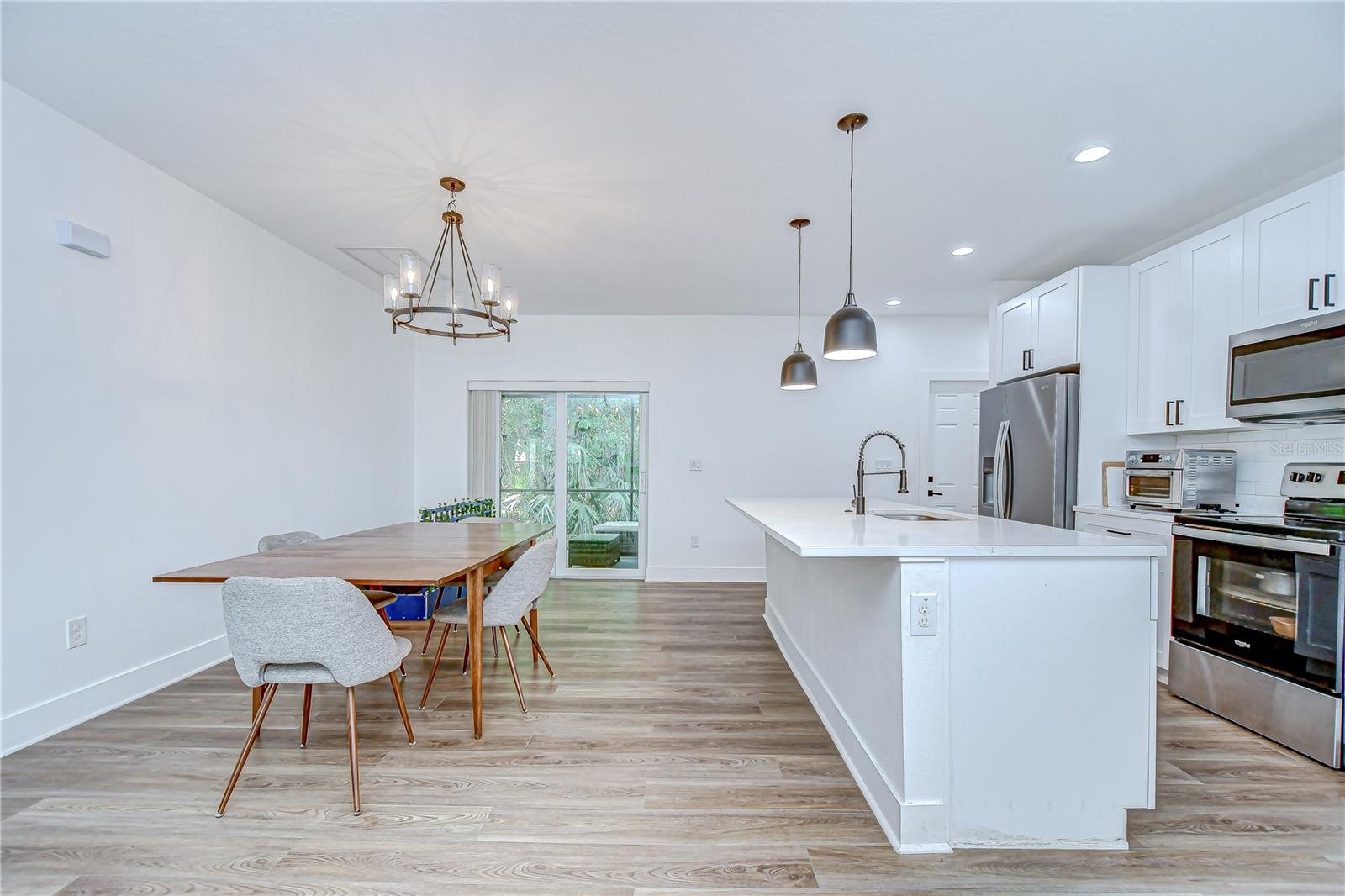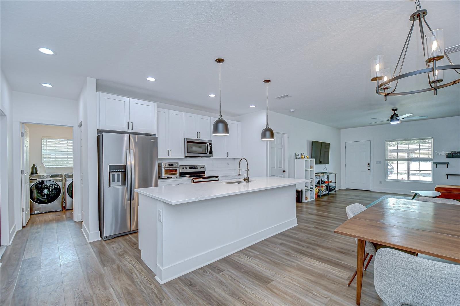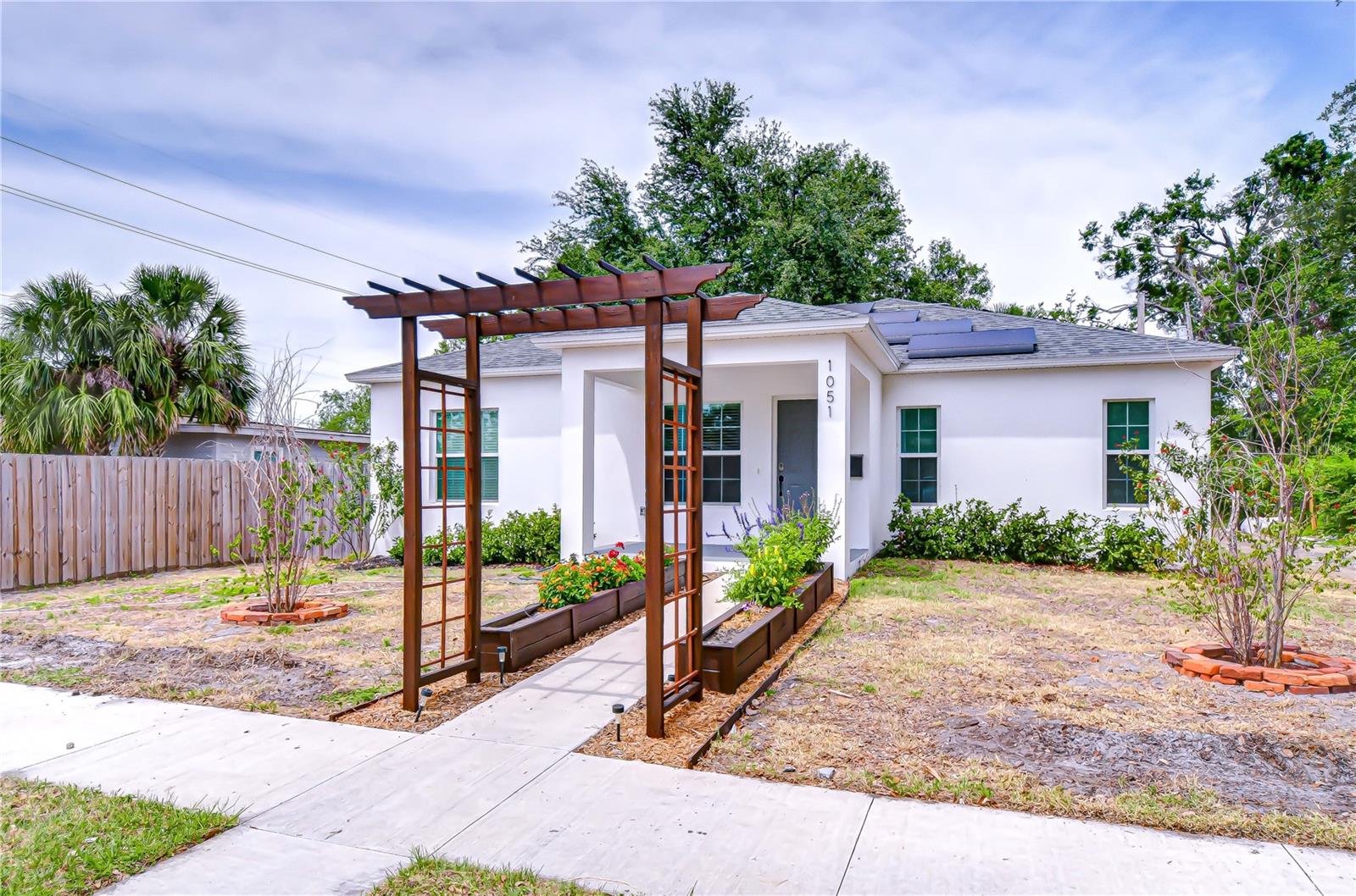 Step into stylish Florida living with this newer-construction 3-bedroom, 2-bath home, built in 2022 and designed with both comfort and contemporary appeal in mind. Skip the wait and hassle of building—this move-in-ready home offers all the advantages of modern construction and the peace of mind that comes with newer materials and craftsmanship. Bathed in natural sunlight, this thoughtfully designed home features an open and inviting floor plan with clean lines and sleek black accents that add a bold modern touch. The heart of the home is the expansive living area that effortlessly flows into the dining space and kitchen—ideal for entertaining or everyday comfort. The kitchen is a standout with its large center island perfect for casual dining or meal prep, complemented by quartz countertops, custom cabinetry, and stainless steel appliances that create a polished, gourmet feel. The split-bedroom layout offers privacy and functionality, with the primary suite tucked away on one side of the home. The suite features a generous walk-in closet and a beautifully designed en-suite bath with a large walk-in shower. The two additional bedrooms are bright and well-sized, each with ample closet space, and share a stylish hall bathroom with a tub and shower combo. Luxury vinyl plank flooring flows throughout the living spaces, while the bathrooms feature eye-catching designer tile. The side-entry 2-car garage offers added privacy and convenience, with direct access to the kitchen and laundry room—perfect for rainy days or bringing in groceries. Energy-conscious buyers will love the added bonus of solar panels on the roof, offering increased energy efficiency and reduced utility costs year-round. Located just minutes from vibrant Downtown St. Pete, the eclectic charm of Gulfport and the area's award-winning beaches, this home is perfectly situated. Hurry, schedule your appt to view today before it's gone!