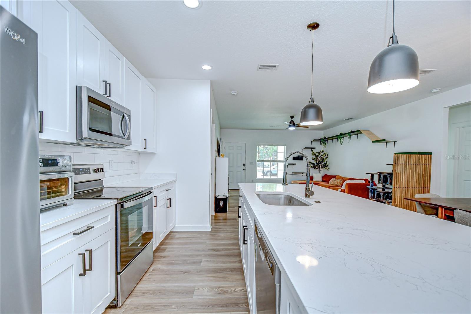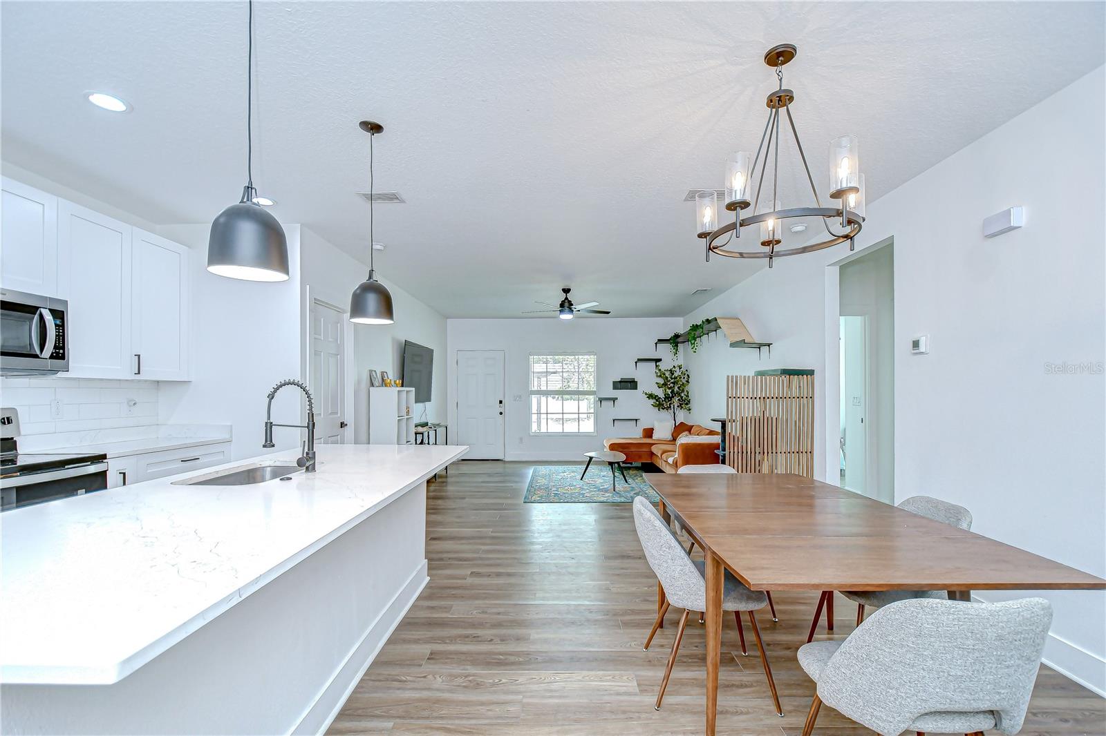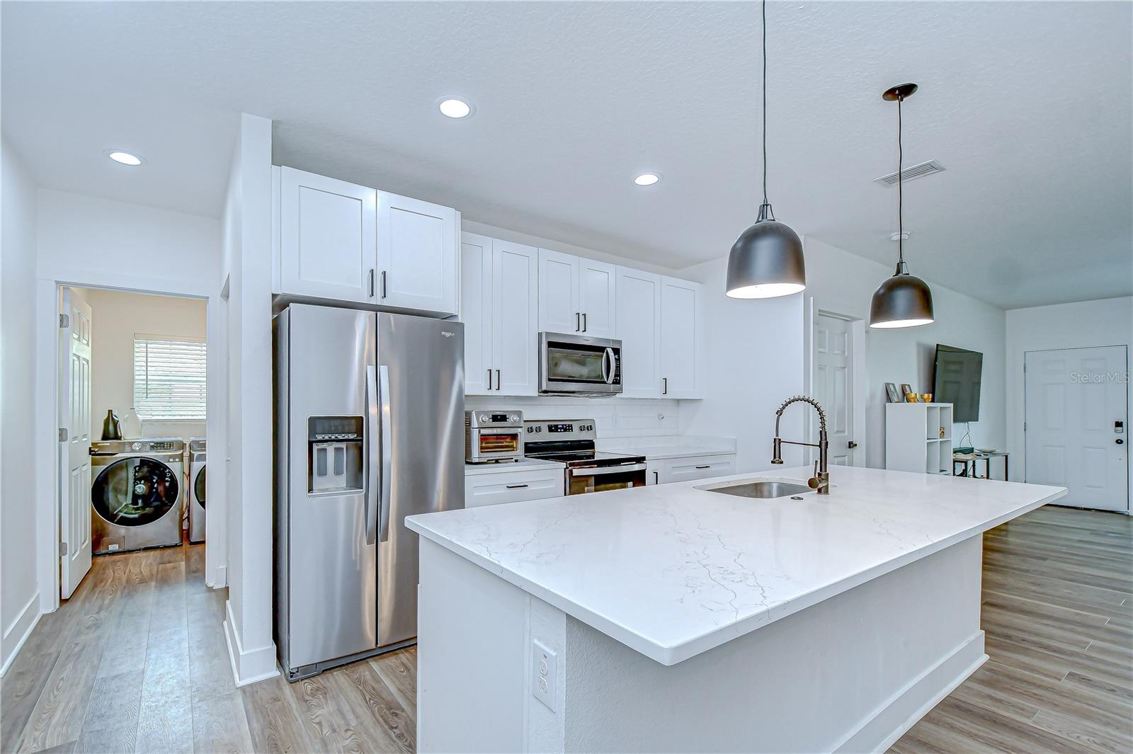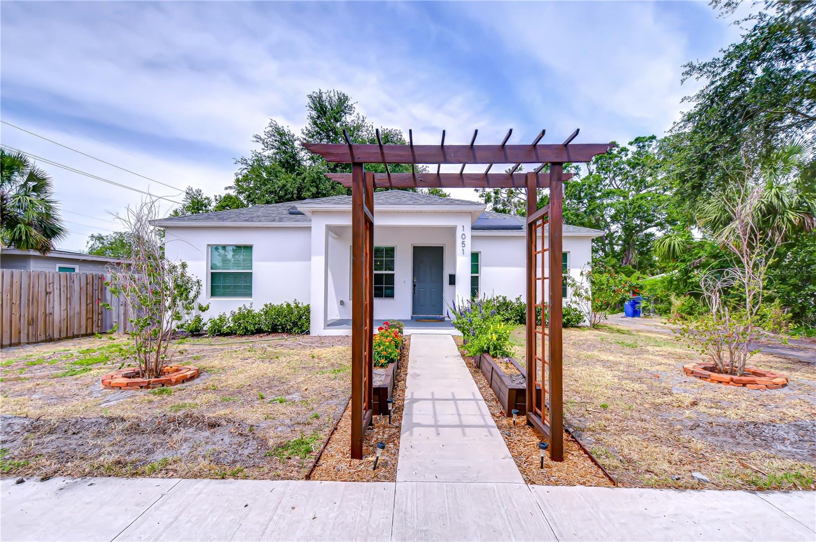 Step into stylish Florida living with this newer-construction 3-bedroom, 2-bath home, built in 2022 and designed with both comfort and contemporary appeal in mind. Skip the wait and hassle of building—this move-in-ready home offers all the advantages of modern construction and the peace of mind that comes with newer materials and craftsmanship. Bathed in natural sunlight, this thoughtfully designed home features an open and inviting floor plan with clean lines and sleek black accents that add a bold modern touch. The heart of the home is the expansive living area that effortlessly flows into the dining space and kitchen—ideal for entertaining or everyday comfort. The kitchen is a standout with its large center island perfect for casual dining or meal prep, complemented by quartz countertops, custom cabinetry, and stainless steel appliances that create a polished, gourmet feel. The split-bedroom layout offers privacy and functionality, with the primary suite tucked away on one side of the home. The suite features a generous walk-in closet and a beautifully designed en-suite bath with a large walk-in shower. The two additional bedrooms are bright and well-sized, each with ample closet space, and share a stylish hall bathroom with a tub and shower combo. Luxury vinyl plank flooring flows throughout the living spaces, while the bathrooms feature eye-catching designer tile. The side-entry 2-car garage offers added privacy and convenience, with direct access to the kitchen and laundry room—perfect for rainy days or bringing in groceries. Energy-conscious buyers will love the added bonus of solar panels on the roof, offering increased energy efficiency and reduced utility costs year-round. Located just minutes from vibrant Downtown St. Pete, the eclectic charm of Gulfport and the area's award-winning beaches, this home is perfectly situated. Hurry, schedule your appt to view today before it's gone!