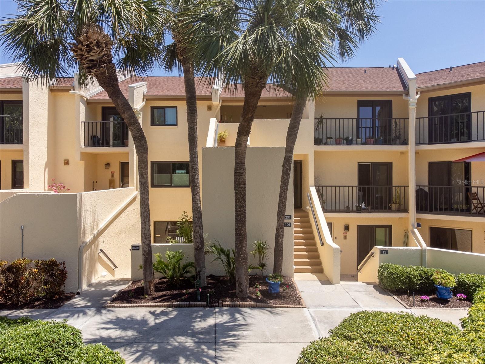 Live the Florida Dream! This condominium is Nestled in the sought-after Seapointe Terrace Condo Community, located where the waters of Tampa Bay meet the Gulf of Mexico through the iconic Sunshine Skyway bridge. DRY and very HIGH on the TOP (3rd) Floor with EXPANSIVE WATER VIEWS of Tampa Bay from every room from the extended 44’ Balcony. The cozy front porch is perfect for afternoon reading. Upon entering you’ll be impressed by the light and airy feel from the VIEWS, throughout and Great Room layout. The roomy kitchen features an abundance of white upper and lower cabinets, stainless steel appliances, cabinet pantry, recessed lighting, granite countertops, sliding glass doors out to front balcony. The kitchen opens out to a great room area for your dining and living room areas with hurricane impact sliding glass doors out to the balcony with a view of Tampa Bay. The split floor plan provides maximum privacy with the two bedrooms on either side of the great room. The bedroom on the left has a vaulted ceiling, hurricane impact sliding glass doors out to balcony and ensuite bathroom with white cabinet and white countertop. A door separates the vanity from tub/shower combo.The bedroom on the right features a built in closet organizer, hurricane impact sliding glass doors out to balcony. The ensuite bathroom has a closet with stack-able washer and dryer. Walk in shower with sliding doors, granite counter top with white cabinet, extra cabinet for storage. Half bathroom located off the great room with a pedestal sink. Luxury Vinyl Plank flooring in the great room, bedrooms and bathrooms. There is also a storage room off the balcony and storage on the first floor. Speaking of ACTIVITIES the community has Tennis and Pickleball courts, heated pool, Kayak Launch and fishing dock (currently under repair from the storms). And as this area has no outlet it lends well to running, biking, walking to enjoy all the natural beauty and MAXIMO PARK just around the corner with boat ramps for launching your water craft as well. And a hidden gem is the SKY BEACH RESORT AND MARINA just steps away where you can enjoy Music and Eats with boat slips available. It is also just minutes away from vibrant downtown St. Pete with all it has to offer as well as amazing Fort de Soto and its lovely beaches, ramps and the Ferry to Shell Key. So much beauty but the practical has not been forgotten with many upgrades like NEW ROOF and SEAWALL (2023), Balcony and Patio resurfaced (2024). Parking is not an issue with one reserved covered space and loads of guest parking at the adjacent lot. And your furry friends can join you (certain restrictions apply)! Milestone study completed and passed.