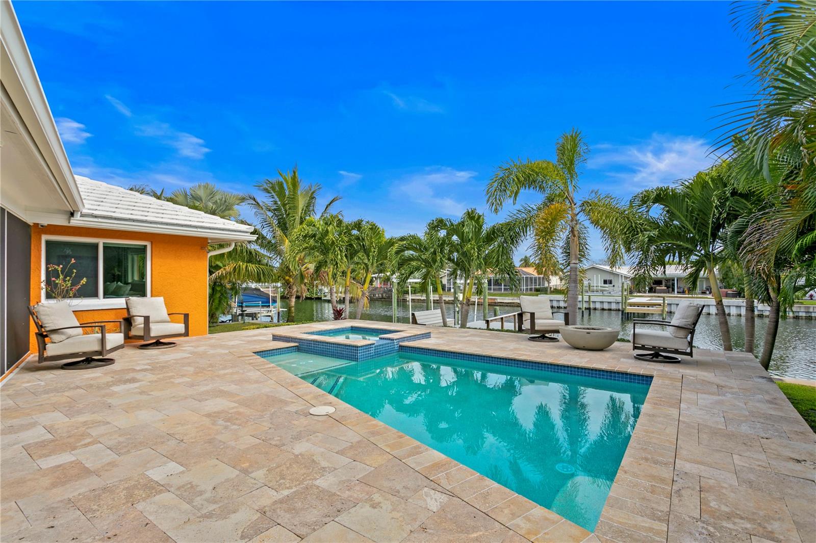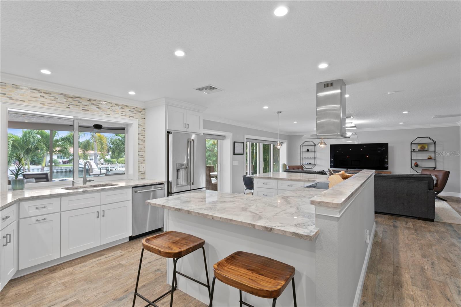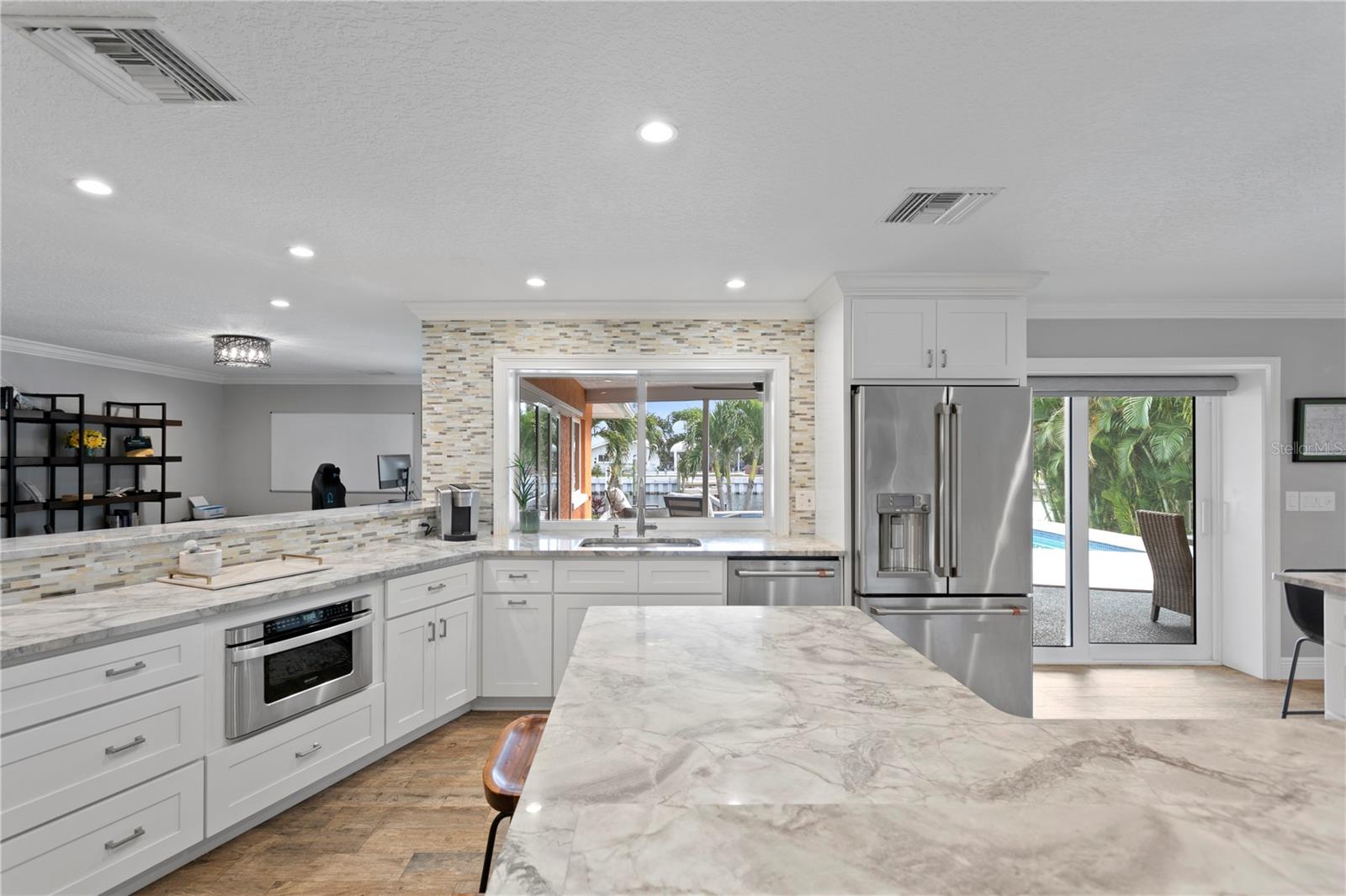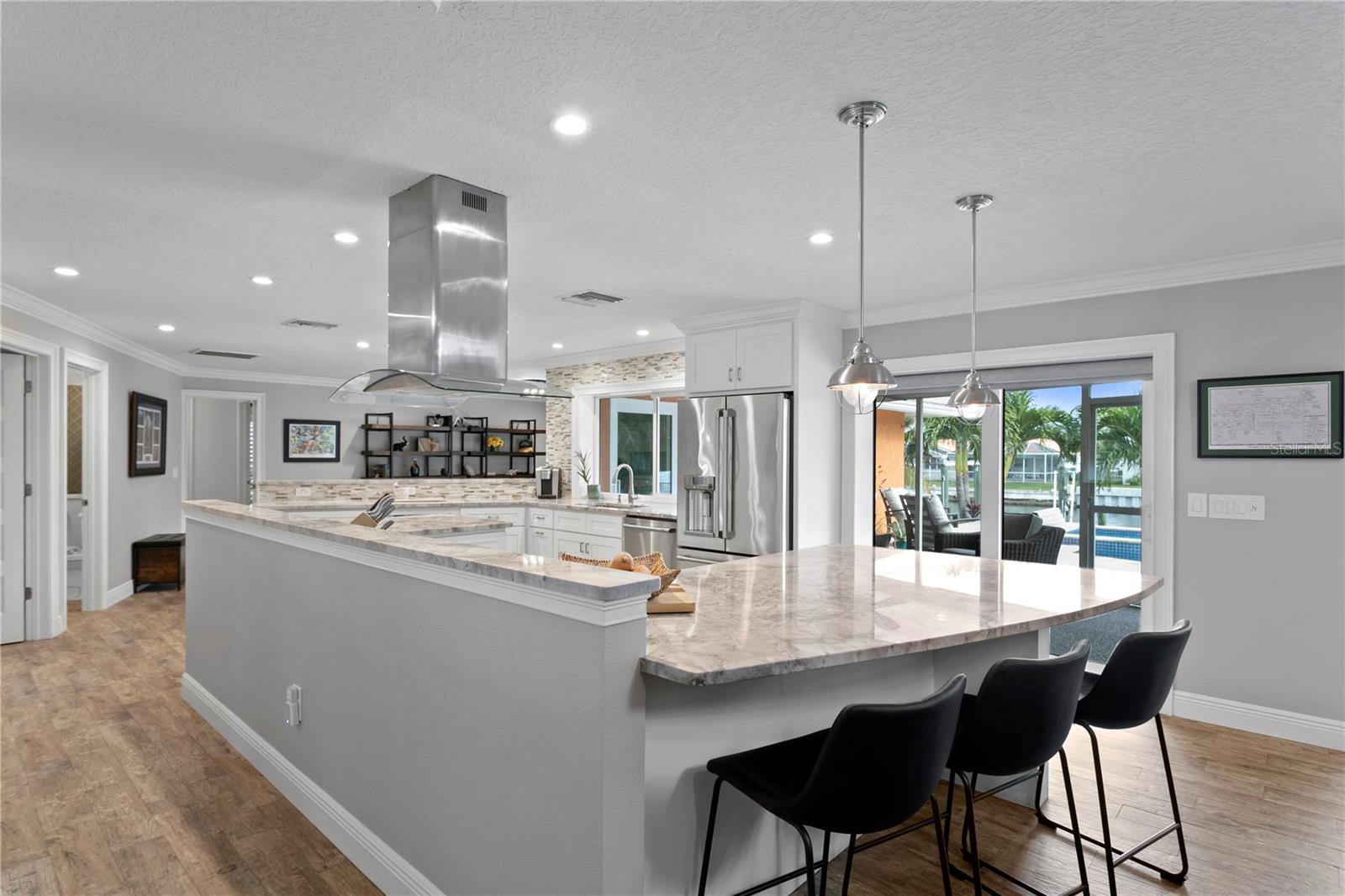 Don’t miss your opportunity to own this stunning home in the highly sought-after waterfront community of Venetian Isles! This beautiful 4-bedroom, 3-bath residence offers the perfect blend of luxury, comfort, and modern coastal living. Step inside to an expansive open-concept layout where the family room, kitchen, and dining area flow seamlessly into a screened lanai and beautifully landscaped backyard—perfect for effortless indoor-outdoor entertaining. The home welcomes you with a spacious foyer or a convenient mudroom entrance from the two-car garage. Throughout the living spaces, wood-look ceramic tile creates a warm, elegant ambiance. At the heart of the home, the chef’s dream kitchen features a large U-shaped eat-in island with marble countertops and backsplash, high-end Café series stainless steel appliances, and stylish custom cabinetry. The interior laundry room is as functional as it is beautiful, complete with Whirlpool Cabrio washer and dryer, built-in cabinetry, utility sink, and marble tile accents. Thoughtfully designed for privacy, the home offers a split bedroom layout. The first guest bedroom enjoys a beautifully appointed full bath, while two additional bedrooms in a separate wing share a spa-like bathroom with Danze fixtures and designer finishes. The private master suite is a true retreat, showcasing a luxurious marble bathroom and a generous walk-in closet. Enjoy true Florida living with hurricane-rated sliding glass doors that fully pocket back, connecting your main living spaces to the screened lanai and creating a seamless indoor-outdoor experience. Whether you're relaxing by the heated saltwater pool and spa, or enjoying tranquil canal views from the cozy firepit corner, this backyard oasis has it all. Boaters will appreciate the composite dock with electric, water, a 10,000 lb. boat lift, and updated seawall (2017). The lush landscaping provides ample privacy and is enhanced by elegant outdoor lighting for evening ambiance. Best of all, this home has experienced no water damage from any hurricanes—a testament to its strong construction and elevated location. Homes like this in Venetian Isles don’t come around often—schedule your private showing today!