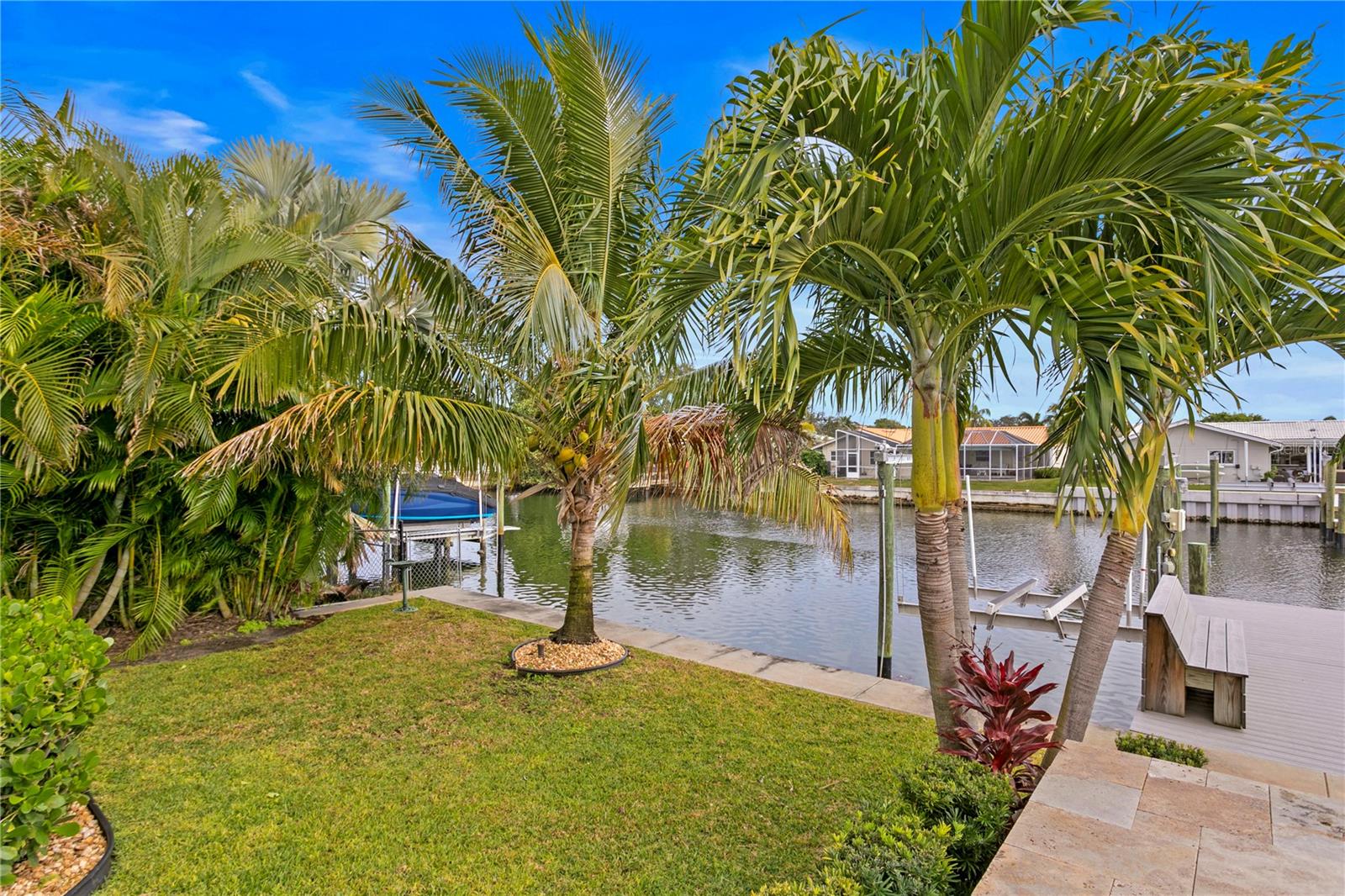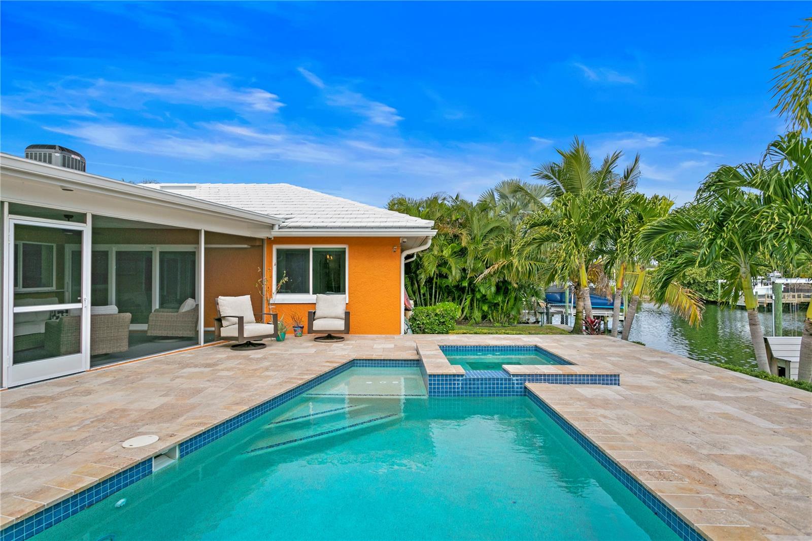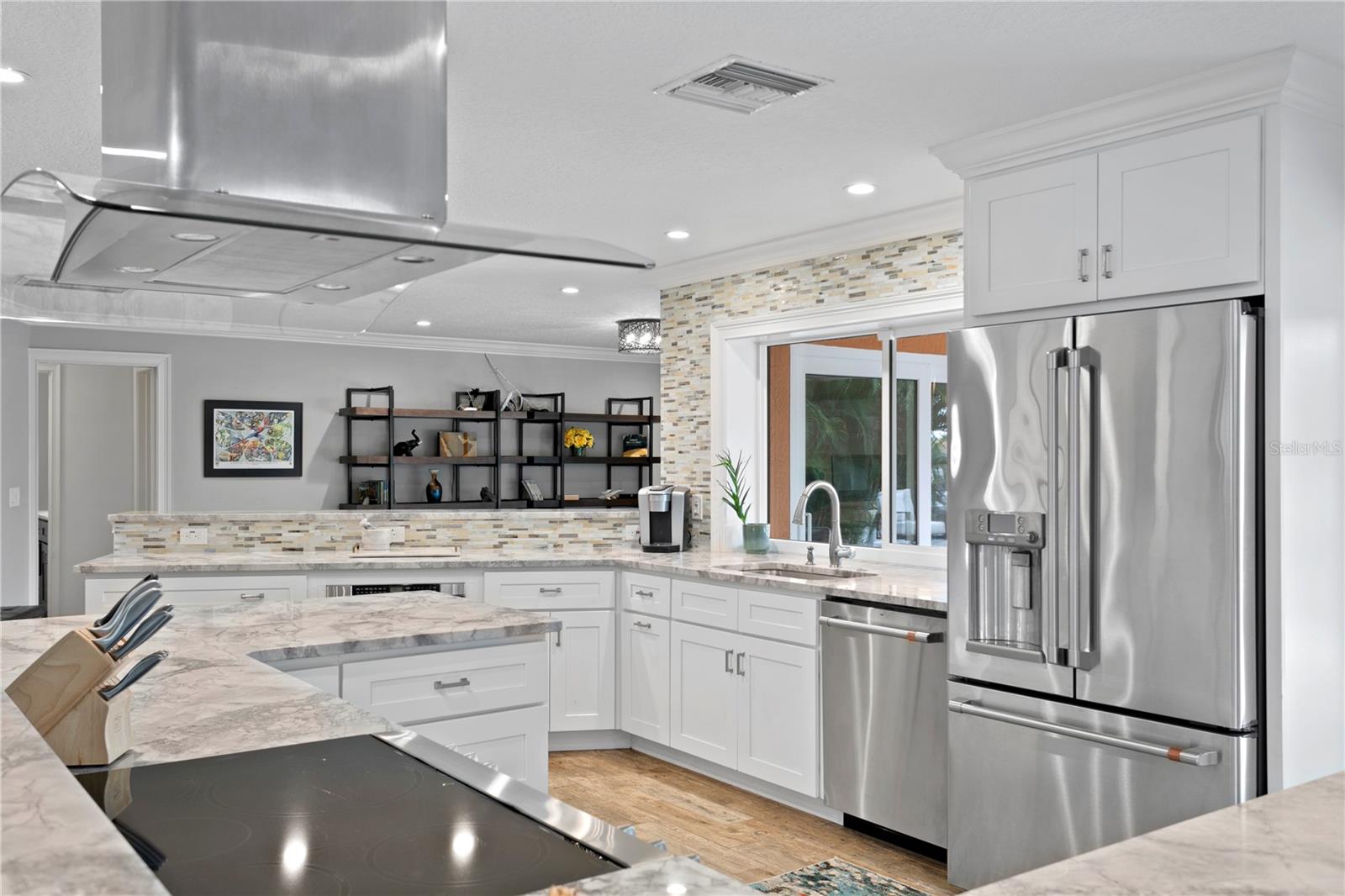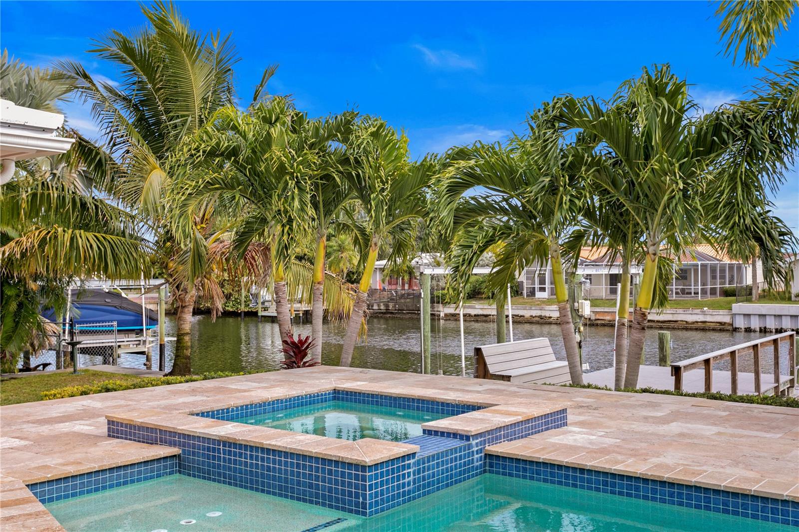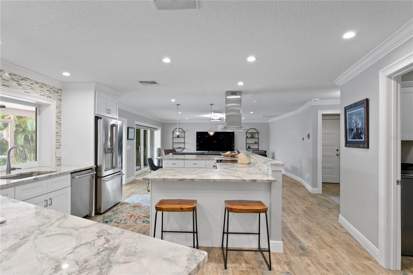 Don’t miss your opportunity to own this stunning home in the highly sought-after waterfront community of Venetian Isles! This beautiful 4-bedroom, 3-bath residence offers the perfect blend of luxury, comfort, and modern coastal living. Step inside to an expansive open-concept layout where the family room, kitchen, and dining area flow seamlessly into a screened lanai and beautifully landscaped backyard—perfect for effortless indoor-outdoor entertaining. The home welcomes you with a spacious foyer or a convenient mudroom entrance from the two-car garage. Throughout the living spaces, wood-look ceramic tile creates a warm, elegant ambiance. At the heart of the home, the chef’s dream kitchen features a large U-shaped eat-in island with marble countertops and backsplash, high-end Café series stainless steel appliances, and stylish custom cabinetry. The interior laundry room is as functional as it is beautiful, complete with Whirlpool Cabrio washer and dryer, built-in cabinetry, utility sink, and marble tile accents. Thoughtfully designed for privacy, the home offers a split bedroom layout. The first guest bedroom enjoys a beautifully appointed full bath, while two additional bedrooms in a separate wing share a spa-like bathroom with Danze fixtures and designer finishes. The private master suite is a true retreat, showcasing a luxurious marble bathroom and a generous walk-in closet. Enjoy true Florida living with hurricane-rated sliding glass doors that fully pocket back, connecting your main living spaces to the screened lanai and creating a seamless indoor-outdoor experience. Whether you're relaxing by the heated saltwater pool and spa, or enjoying tranquil canal views from the cozy firepit corner, this backyard oasis has it all. Boaters will appreciate the composite dock with electric, water, a 10,000 lb. boat lift, and updated seawall (2017). The lush landscaping provides ample privacy and is enhanced by elegant outdoor lighting for evening ambiance. Best of all, this home has experienced no water damage from any hurricanes—a testament to its strong construction and elevated location. Homes like this in Venetian Isles don’t come around often—schedule your private showing today!