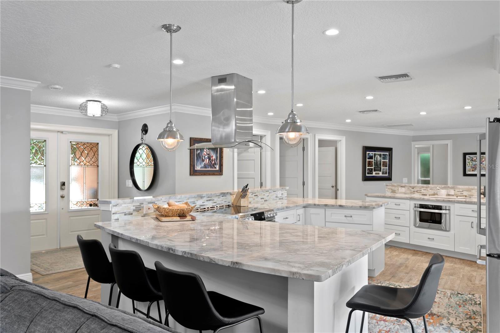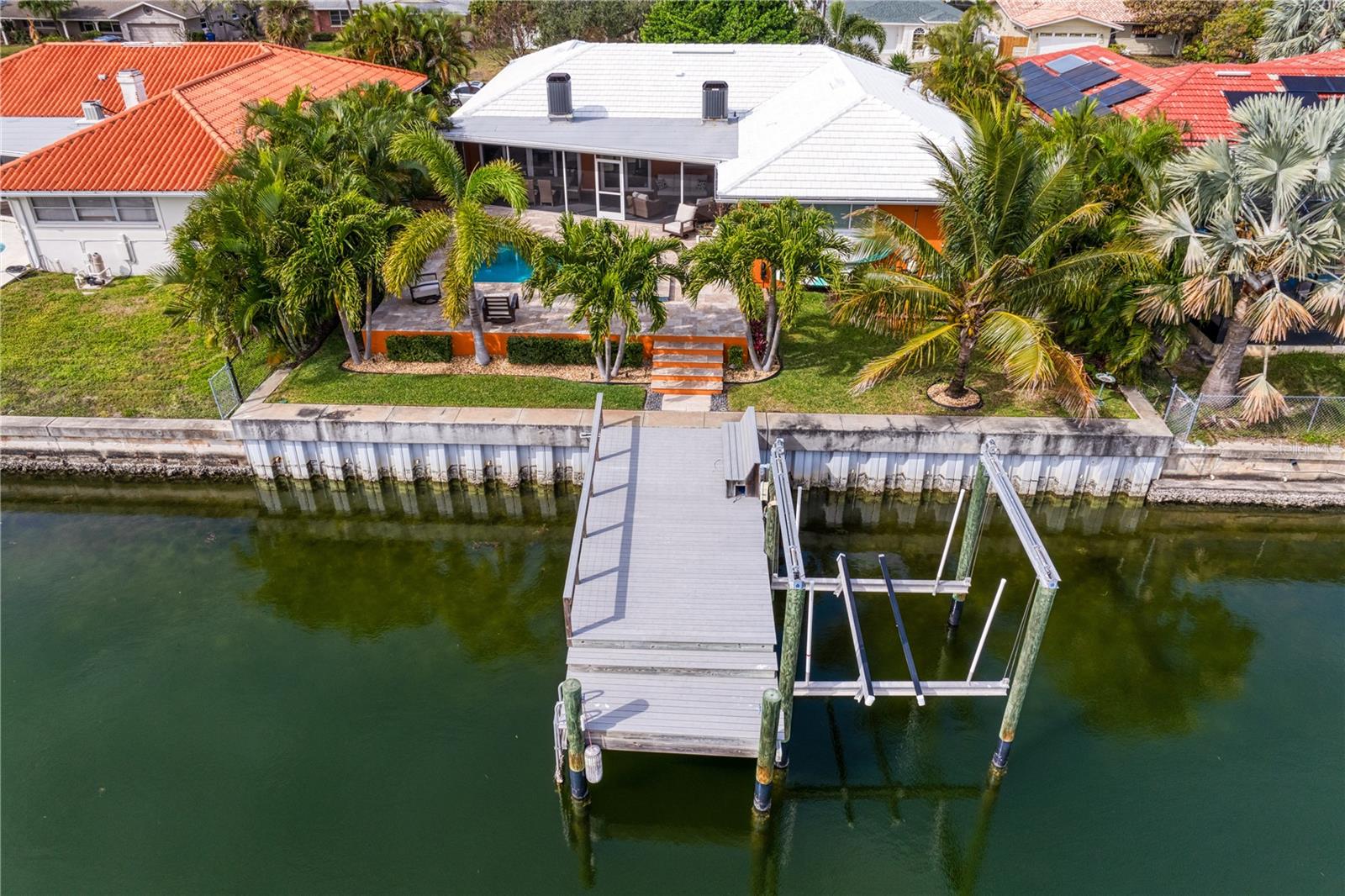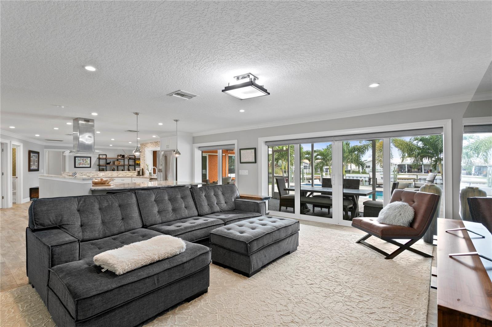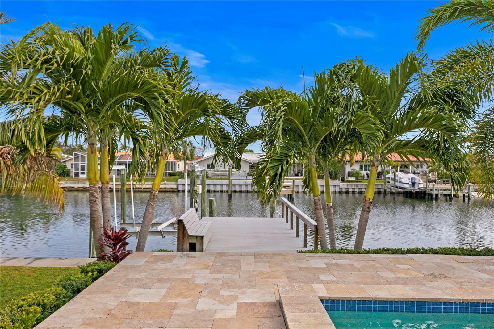 Don’t miss your opportunity to own this stunning home in the highly sought-after waterfront community of Venetian Isles! This beautiful 4-bedroom, 3-bath residence offers the perfect blend of luxury, comfort, and modern coastal living. Step inside to an expansive open-concept layout where the family room, kitchen, and dining area flow seamlessly into a screened lanai and beautifully landscaped backyard—perfect for effortless indoor-outdoor entertaining. The home welcomes you with a spacious foyer or a convenient mudroom entrance from the two-car garage. Throughout the living spaces, wood-look ceramic tile creates a warm, elegant ambiance. At the heart of the home, the chef’s dream kitchen features a large U-shaped eat-in island with marble countertops and backsplash, high-end Café series stainless steel appliances, and stylish custom cabinetry. The interior laundry room is as functional as it is beautiful, complete with Whirlpool Cabrio washer and dryer, built-in cabinetry, utility sink, and marble tile accents. Thoughtfully designed for privacy, the home offers a split bedroom layout. The first guest bedroom enjoys a beautifully appointed full bath, while two additional bedrooms in a separate wing share a spa-like bathroom with Danze fixtures and designer finishes. The private master suite is a true retreat, showcasing a luxurious marble bathroom and a generous walk-in closet. Enjoy true Florida living with hurricane-rated sliding glass doors that fully pocket back, connecting your main living spaces to the screened lanai and creating a seamless indoor-outdoor experience. Whether you're relaxing by the heated saltwater pool and spa, or enjoying tranquil canal views from the cozy firepit corner, this backyard oasis has it all. Boaters will appreciate the composite dock with electric, water, a 10,000 lb. boat lift, and updated seawall (2017). The lush landscaping provides ample privacy and is enhanced by elegant outdoor lighting for evening ambiance. Best of all, this home has experienced no water damage from any hurricanes—a testament to its strong construction and elevated location. Homes like this in Venetian Isles don’t come around often—schedule your private showing today!