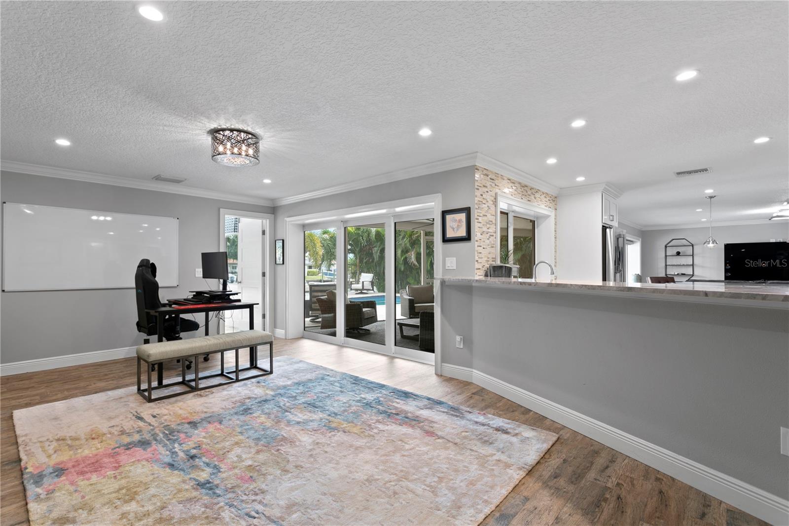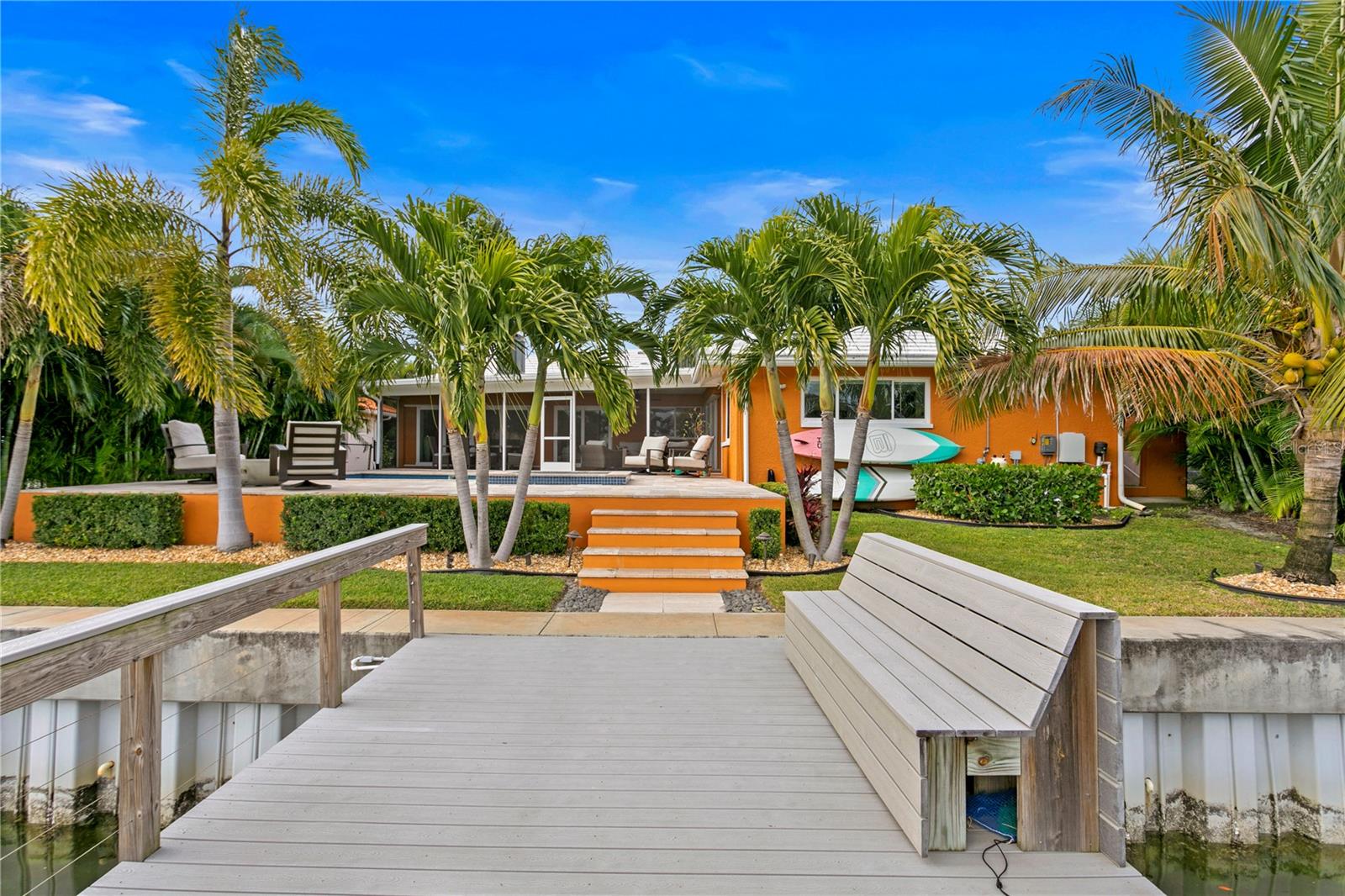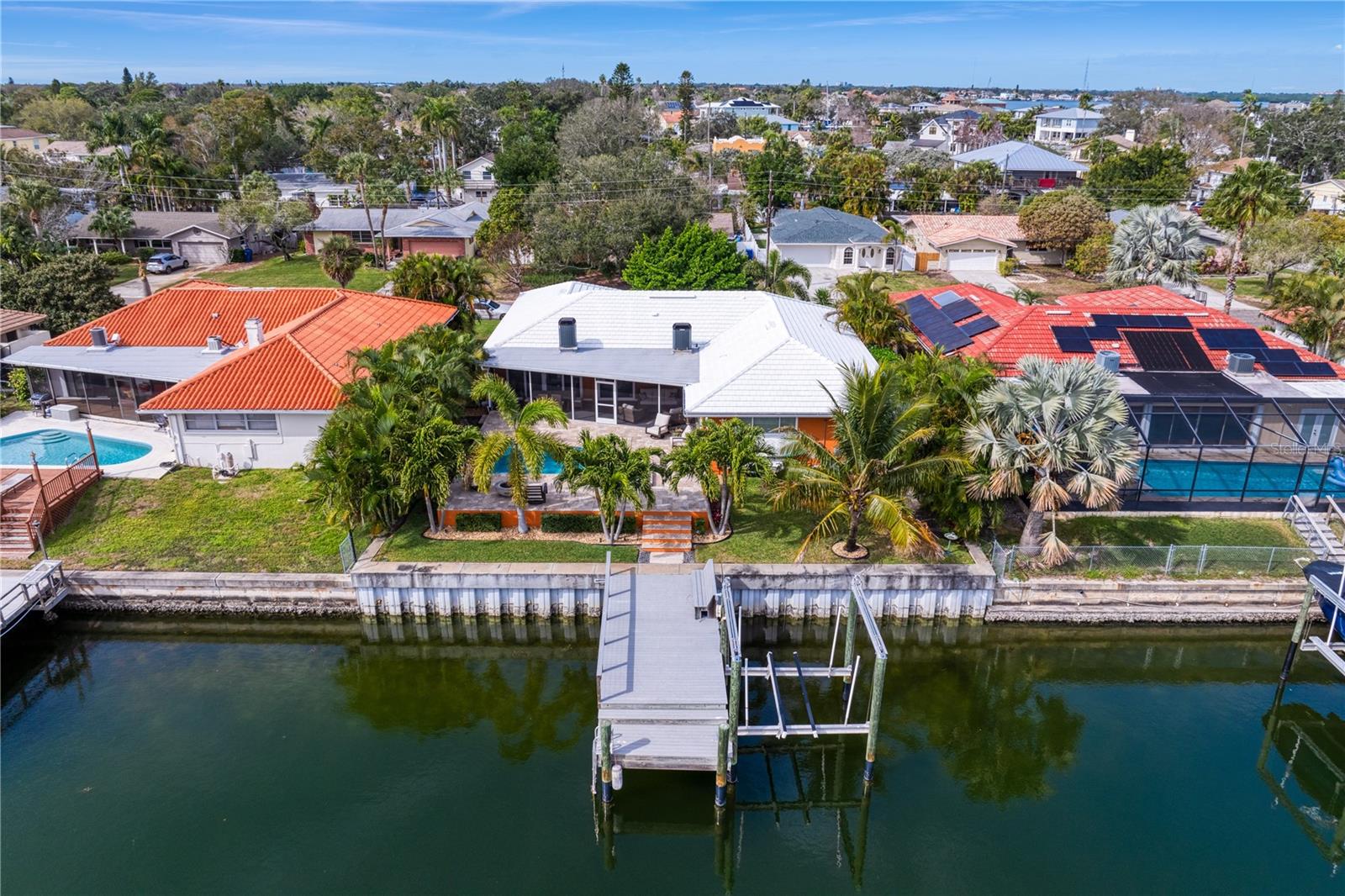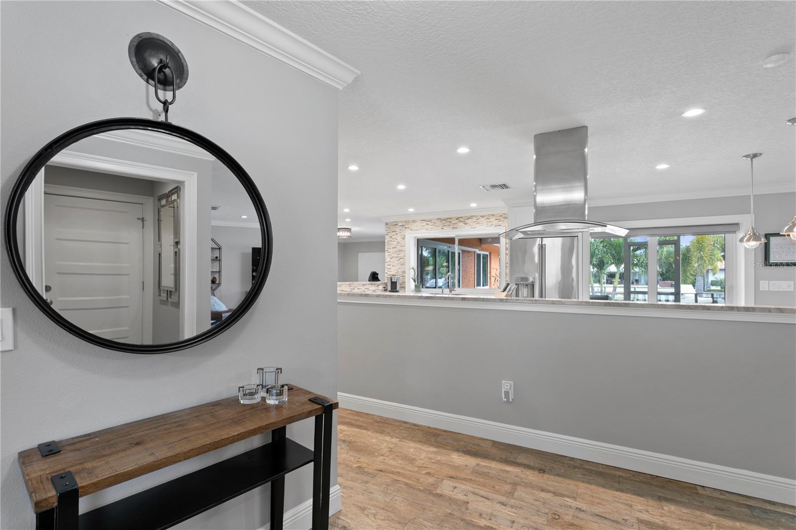 Don’t miss your opportunity to own this stunning home in the highly sought-after waterfront community of Venetian Isles! This beautiful 4-bedroom, 3-bath residence offers the perfect blend of luxury, comfort, and modern coastal living. Step inside to an expansive open-concept layout where the family room, kitchen, and dining area flow seamlessly into a screened lanai and beautifully landscaped backyard—perfect for effortless indoor-outdoor entertaining. The home welcomes you with a spacious foyer or a convenient mudroom entrance from the two-car garage. Throughout the living spaces, wood-look ceramic tile creates a warm, elegant ambiance. At the heart of the home, the chef’s dream kitchen features a large U-shaped eat-in island with marble countertops and backsplash, high-end Café series stainless steel appliances, and stylish custom cabinetry. The interior laundry room is as functional as it is beautiful, complete with Whirlpool Cabrio washer and dryer, built-in cabinetry, utility sink, and marble tile accents. Thoughtfully designed for privacy, the home offers a split bedroom layout. The first guest bedroom enjoys a beautifully appointed full bath, while two additional bedrooms in a separate wing share a spa-like bathroom with Danze fixtures and designer finishes. The private master suite is a true retreat, showcasing a luxurious marble bathroom and a generous walk-in closet. Enjoy true Florida living with hurricane-rated sliding glass doors that fully pocket back, connecting your main living spaces to the screened lanai and creating a seamless indoor-outdoor experience. Whether you're relaxing by the heated saltwater pool and spa, or enjoying tranquil canal views from the cozy firepit corner, this backyard oasis has it all. Boaters will appreciate the composite dock with electric, water, a 10,000 lb. boat lift, and updated seawall (2017). The lush landscaping provides ample privacy and is enhanced by elegant outdoor lighting for evening ambiance. Best of all, this home has experienced no water damage from any hurricanes—a testament to its strong construction and elevated location. Homes like this in Venetian Isles don’t come around often—schedule your private showing today!