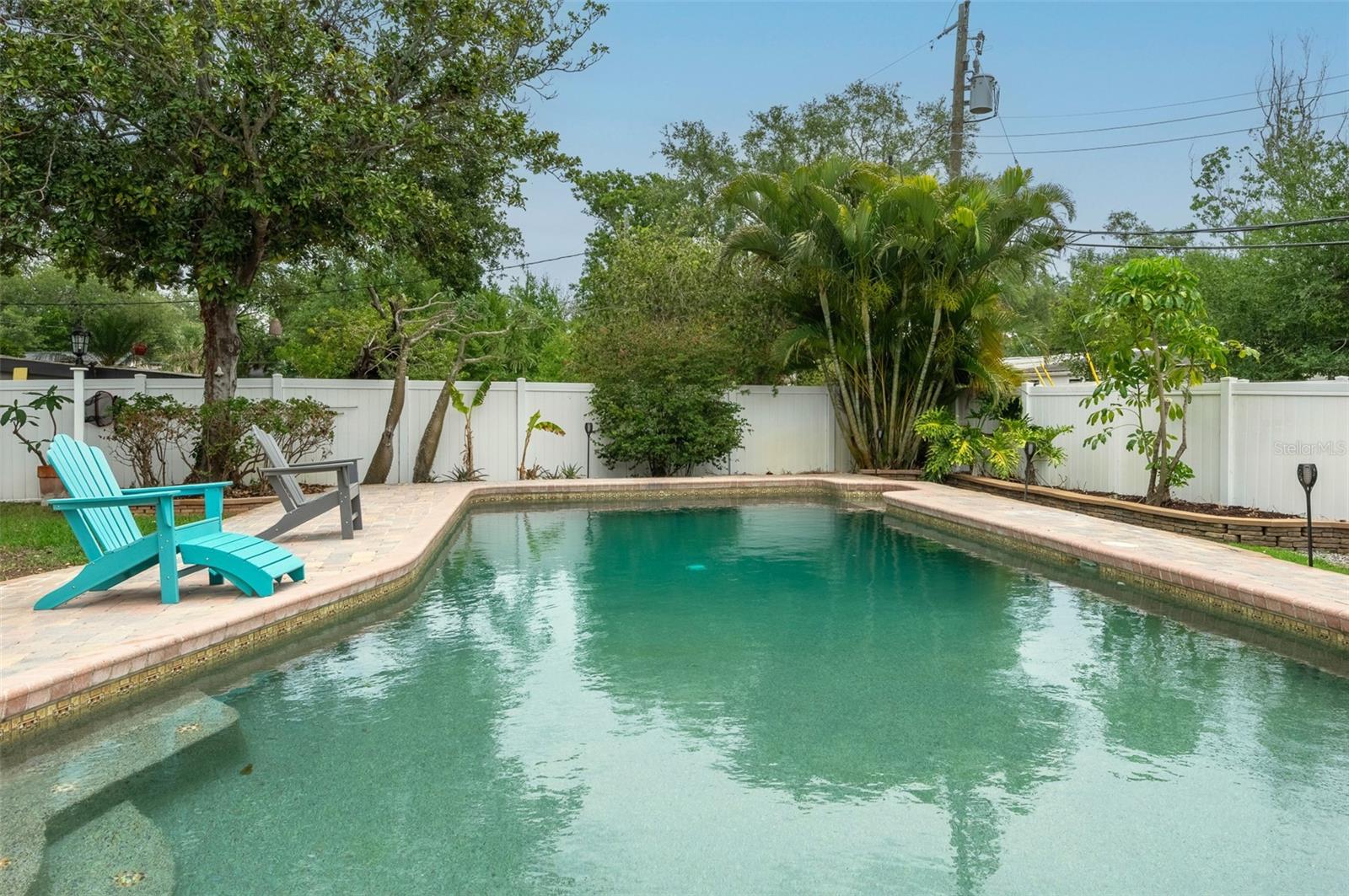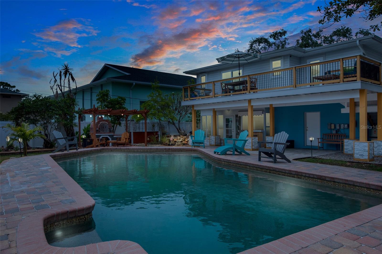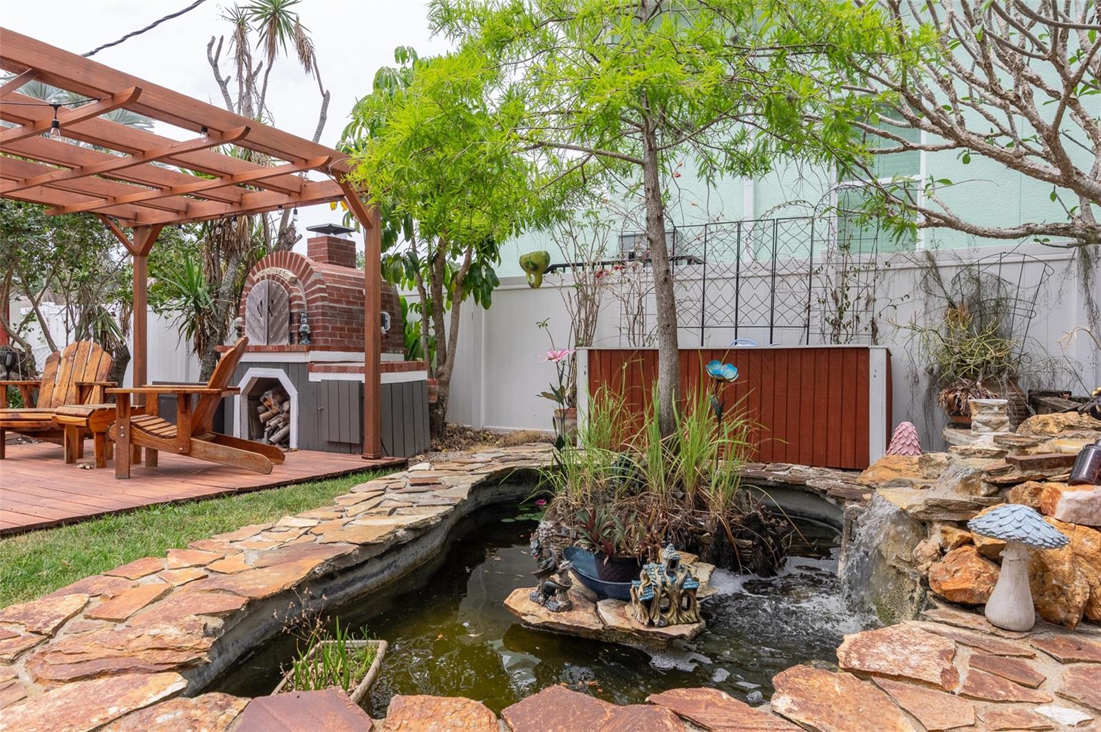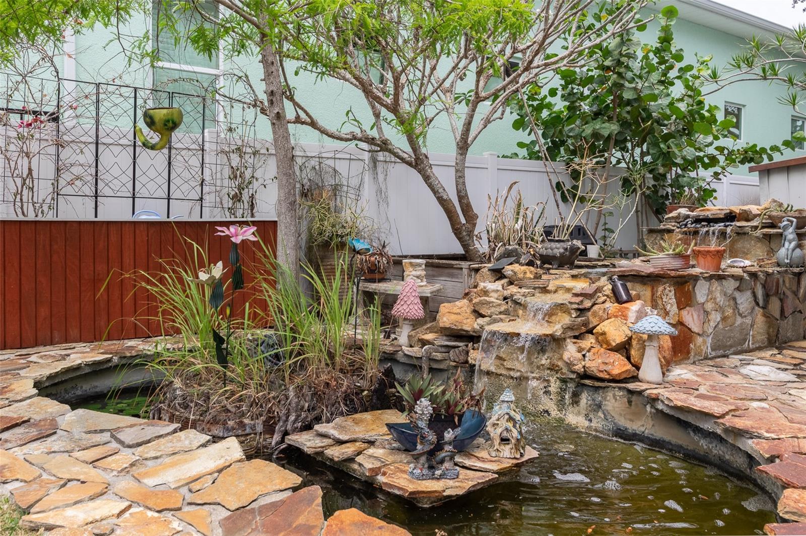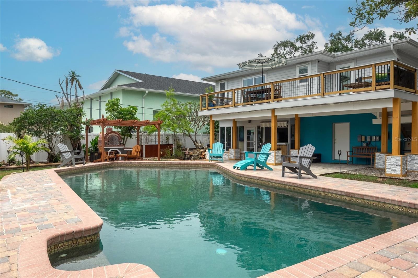 Your Personal Resort Awaits: Saltwater Serenity, Lush Privacy & Timeless Charm Welcome to 854 77th Avenue N, an enchanting sanctuary where every detail whispers "retreat." Nestled on an oversized 1.5 lot parcel in the heart of St. Petersburg, this private oasis effortlessly blends luxury and livability. Designed for those who crave everyday escape, the property offers a fully curated outdoor experience: a sparkling saltwater pool with new equipment(2024), a tranquil waterfall-fed pond, lighted pergola, outdoor oven, and over 400 square feet of premium composite decking; ideal for al fresco dining, yoga at sunrise, or cocktails under the stars. Step inside and discover nearly 1,600 square feet of elevated interiors, where even the bathrooms feel artfully composed. The carefully curated kitchen is anchored by sleek bamboo countertops, a warm and unexpected detail that elevates the space with natural sophistication and timeless style. The downstairs game room and bar beckon for lively nights in. A cozy wood-burning fireplace and hand-painted murals lend the upstairs living area warmth and whimsy, while sliding doors open to your upper-level breakfast nook overlooking the lush front garden and creek view below. Other thoughtful upgrades include a new irrigation system with pump (2024), hurricane shutters, new washer and dryer, and driveway with a garage and carport. The home’s flexible layout and generous outdoor footprint allow for a true multi-use lifestyle, be it quiet contemplation, playful gatherings, or simply living as if you're always on vacation. Located just 15 minutes to downtown St. Pete, 20 minutes to Tampa, and steps from Fossil Park, Gateway Mall, and the walkable treasures of North St. Pete, this home offers location and luxury in equal measure.