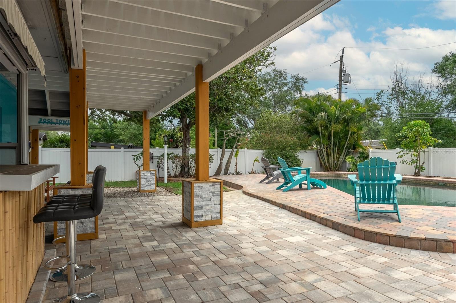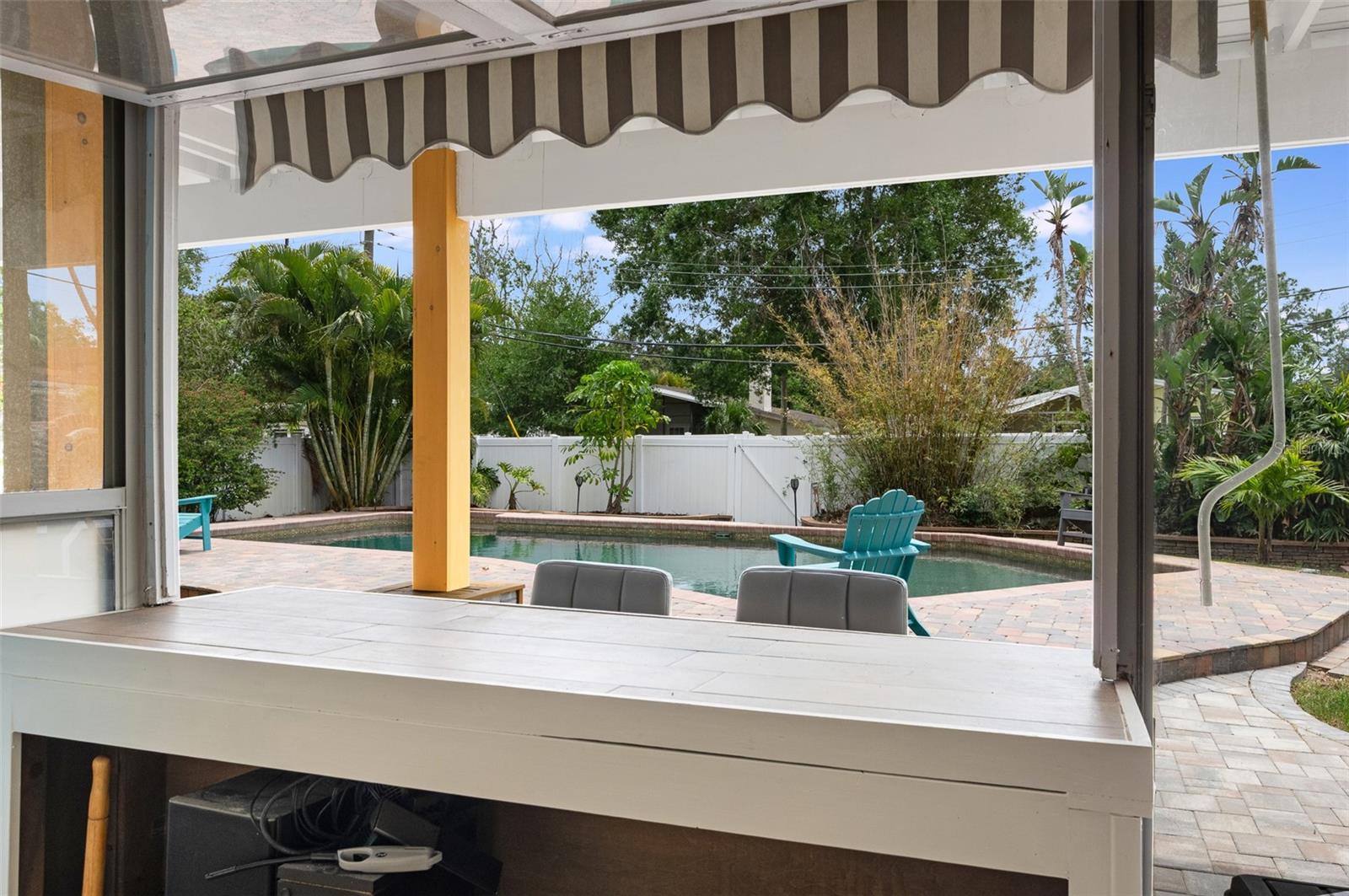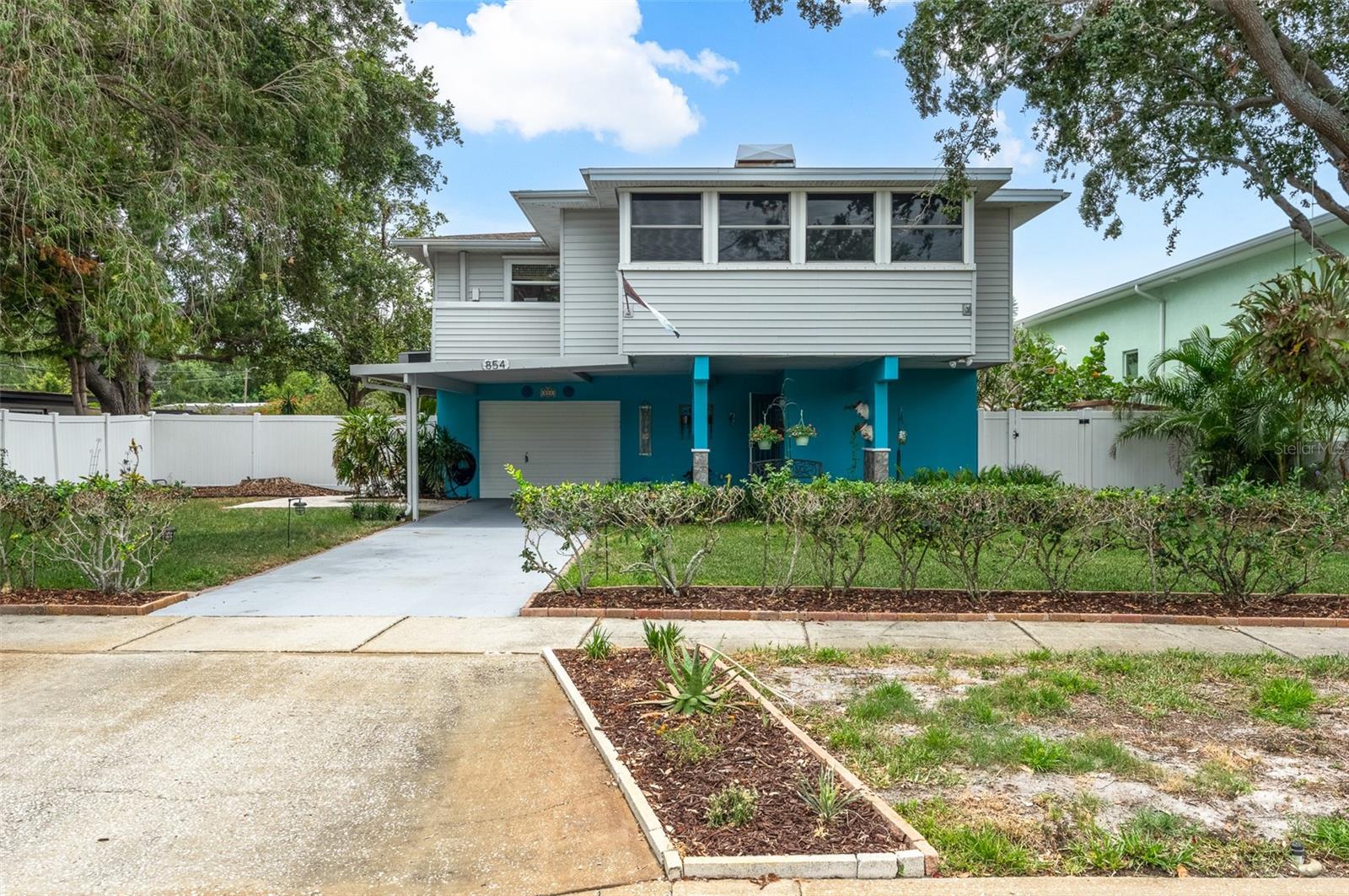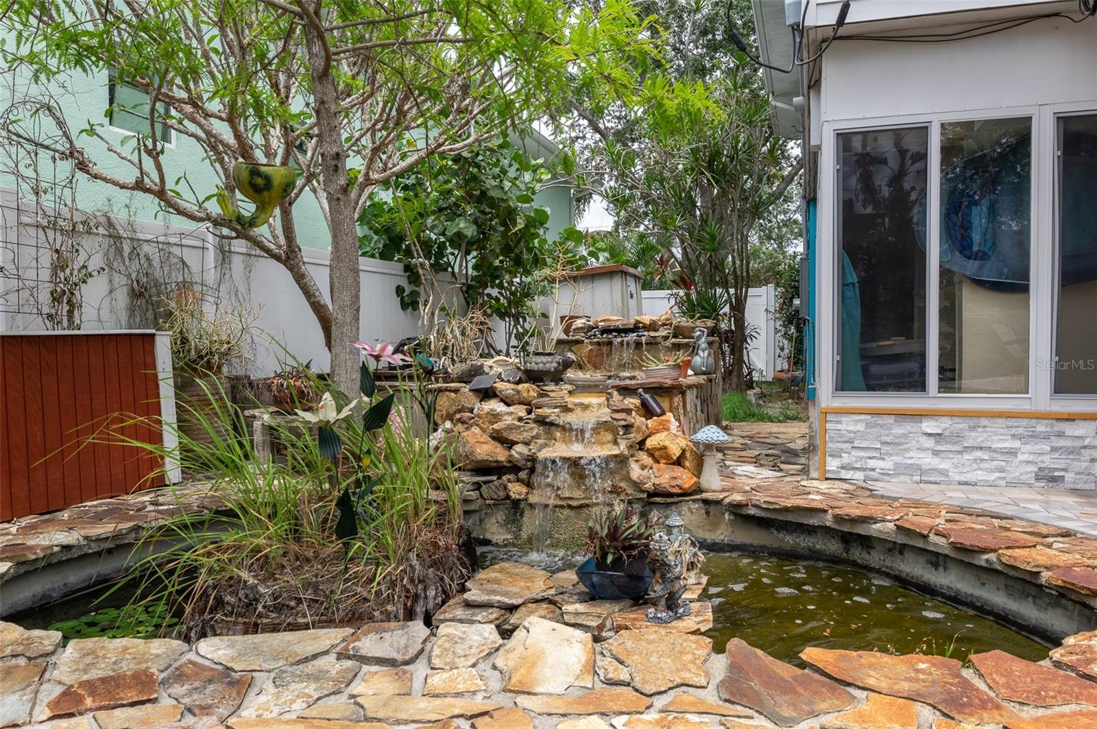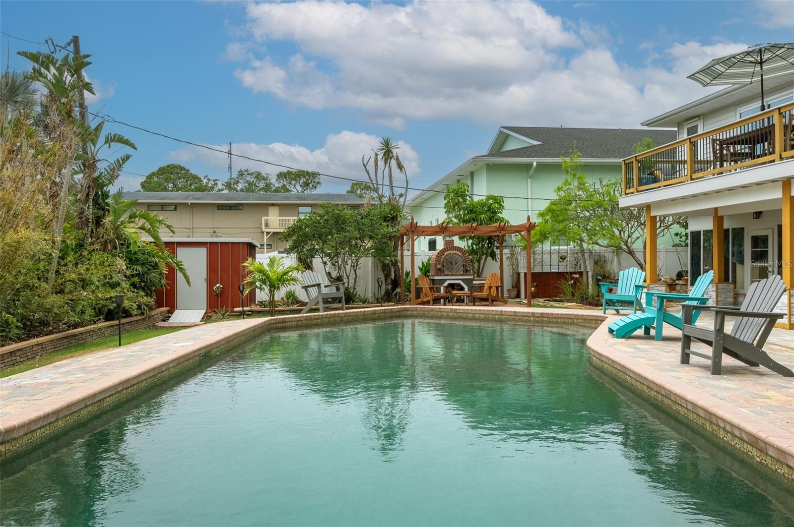 Your Personal Resort Awaits: Saltwater Serenity, Lush Privacy & Timeless Charm Welcome to 854 77th Avenue N, an enchanting sanctuary where every detail whispers "retreat." Nestled on an oversized 1.5 lot parcel in the heart of St. Petersburg, this private oasis effortlessly blends luxury and livability. Designed for those who crave everyday escape, the property offers a fully curated outdoor experience: a sparkling saltwater pool with new equipment(2024), a tranquil waterfall-fed pond, lighted pergola, outdoor oven, and over 400 square feet of premium composite decking; ideal for al fresco dining, yoga at sunrise, or cocktails under the stars. Step inside and discover nearly 1,600 square feet of elevated interiors, where even the bathrooms feel artfully composed. The carefully curated kitchen is anchored by sleek bamboo countertops, a warm and unexpected detail that elevates the space with natural sophistication and timeless style. The downstairs game room and bar beckon for lively nights in. A cozy wood-burning fireplace and hand-painted murals lend the upstairs living area warmth and whimsy, while sliding doors open to your upper-level breakfast nook overlooking the lush front garden and creek view below. Other thoughtful upgrades include a new irrigation system with pump (2024), hurricane shutters, new washer and dryer, and driveway with a garage and carport. The home’s flexible layout and generous outdoor footprint allow for a true multi-use lifestyle, be it quiet contemplation, playful gatherings, or simply living as if you're always on vacation. Located just 15 minutes to downtown St. Pete, 20 minutes to Tampa, and steps from Fossil Park, Gateway Mall, and the walkable treasures of North St. Pete, this home offers location and luxury in equal measure.