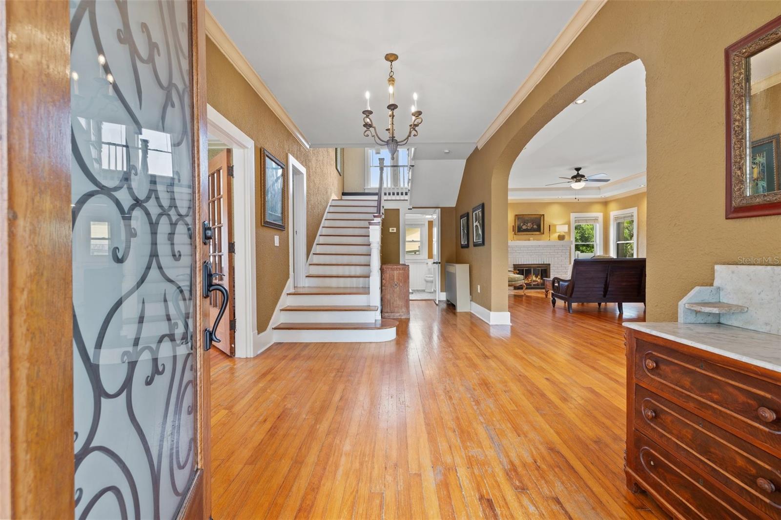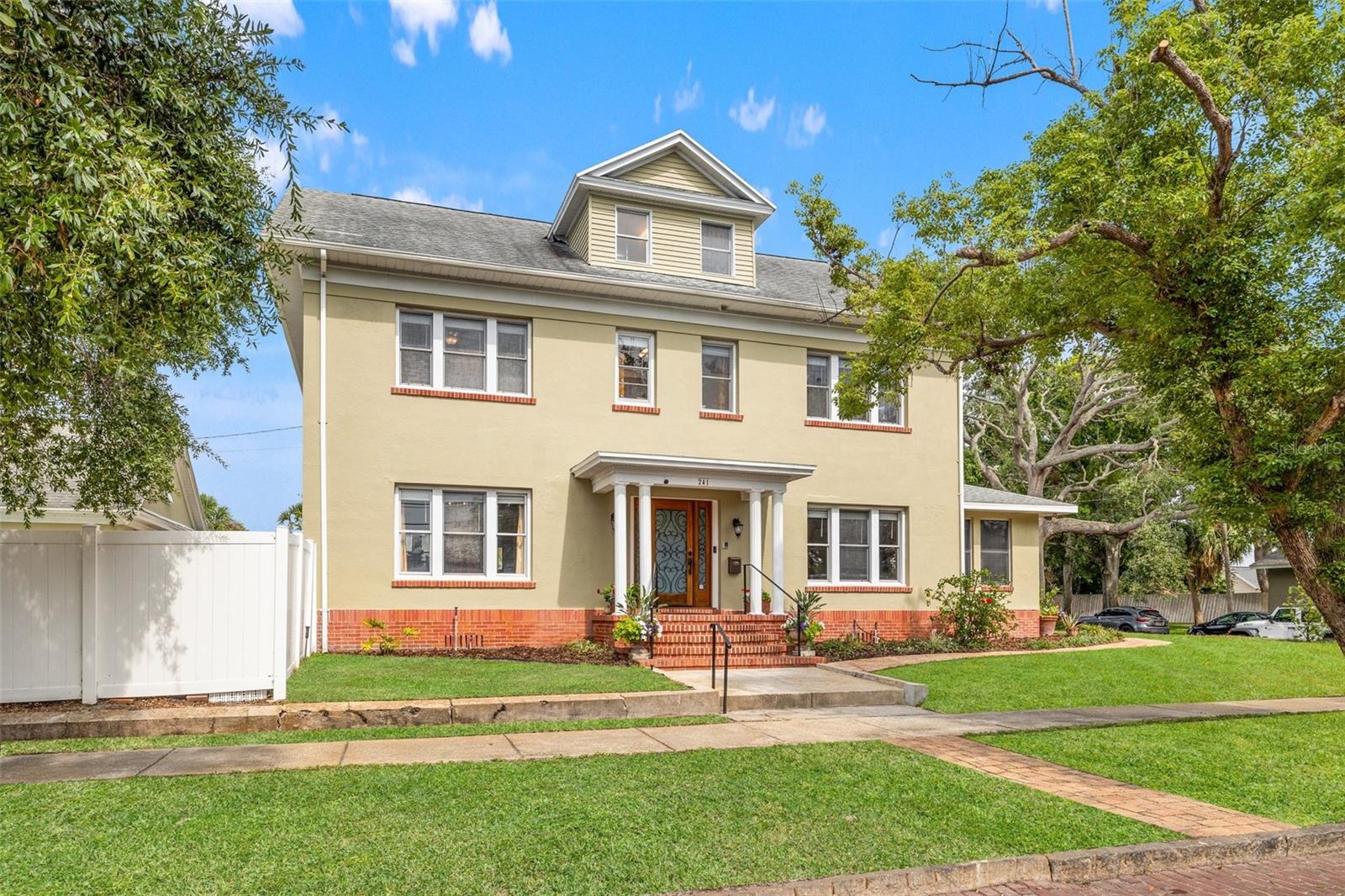 One or more photo(s) has been virtually staged. HISTORIC NORTHERN CHARM MEETS ST. PETE PARADISE | POOL | ADU CONVERSION POSSIBLE| NO FLOOD ZONE | Step into this extraordinary 1920’s gem that captures the grandeur of a classic northern estate while blending the sunshine and vibrancy of our coastal city. Nestled on brick- lined streets in the coveted Historic Park Street Neighborhood, this beauty places you minutes from the beaches of the Gulf and the cultural renaissance of downtown St. Pete. This 3-level masterpiece artfully preserves its historic integrity with high ceilings and original hardwood floors throughout, telling a century-old story of craftsmanship scarcely found in Florida properties. From the moment you walk through the front door, you are captivated by the elegant staircase and overall stature and caliber this home provides. The space flows seamlessly into a massive living room featuring a wood-burning fireplace for chilly nights - a perfect place for both intimate gatherings and larger social events. The expansive designer kitchen shines with imported Spanish porcelain tile flooring and Quartz countertops. The tall custom cabinetry creates a dramatic and storage rich focal point with a perfect blend of vintage character and contemporary functionality. Savor morning coffee in the stunning first floor sunroom bathed in natural light. You’ll be ensconced in a rich, bold blue and seated upon hand-laid Saltillo tile. Original wood pocket doors with glass panels reveal the exquisite attention to detail that defines this era of architecture. The second floor offers 4 bedrooms, each with its own private en-suite bathroom - an exceptional feature for any home. Two additional bedrooms are on the third floor and share a full bath, creating versatile space-use options for guests, home offices, or a workout room. The private enclave that surrounds the property to the rear is ready for entertaining. With an herb garden your Grandmother would have been impressed by, a chicken coop which includes a paved entrance, egg retrieval hatches, and an outdoor area. There is plenty of space to envision additional gardening beds as well. The large, paved deck surrounding the substantial pool allows for lounging, dining, or dancing the night away. Refresh effortlessly in the outdoor shower afterwards. Adjacent to the pool is the detached, oversized three-car garage that includes a finished, climate-controlled bonus loft—an ideal studio retreat that is both insulated and includes heating/cooling. Create an ADU by combining this upper loft with the bathroom downstairs and you have a spot for the family to retreat. The options are endless. Located in one of St. Petersburg's most desirable locations, you’ll have the option to walk to great restaurants, e-bike to the beach, cafes, shopping, and parks. The top- rated elementary school (Pasadena Fundamental Elementary - avail via lottery) is one block away. For fitness enthusiasts, the Pinellas Trail is 1 block away for biking, walking, and running. Rush to this forever home before it’s gone.