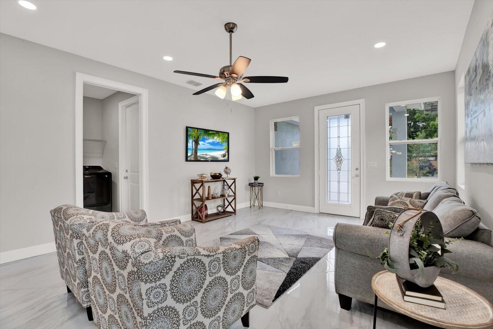 Introducing this stunning, brand-new construction home in the heart of Lealman just blocks away from Raymond Neri Community Park and minutes to the Lealman Exchange Community Center in beautiful St. Petersburg, a blend of modern luxury and impeccable craftsmanship. As you enter, you’ll fall in love with this Beautiful OPEN, SPLIT Floor Plan designed with Gleaming Porcelain Tile flooring, 10’ Volume Ceilings, 8’ Doorways and nothing but High Quality and Outstanding Workmanship throughout! With 3 spacious bedrooms and 2 beautifully-appointed baths + Private office this home offers a lifestyle of elegance and convenience. As you enter, the family room serves as the heart of the home, perfect for relaxing evenings and casual get-togethers. The kitchen is a chef’s dream, spacious island for ease in prepping and showcasing your culinary masterpieces, and sleek modern stainless steel appliances complete this functional yet elegant space. A true retreat, the primary suite boasts a huge walk-in closet and En-suite bath is an oasis of luxury with dual vanities, the walk-in shower is adorned with stunning rainfall glass tiles. The home has many high-end finishes throughout as well as, energy efficient LED recessed lighting, ceiling fans, Low-E windows and Impact rated exterior doors. The home comes with Worry-Free Builder's 1-2-3-10 year warranty. NO HOA -NO FLOOD ZONE! Don't miss the opportunity to make this dream home yours. The neighboring home will be completed soon too for possible Multi-Generational living..
