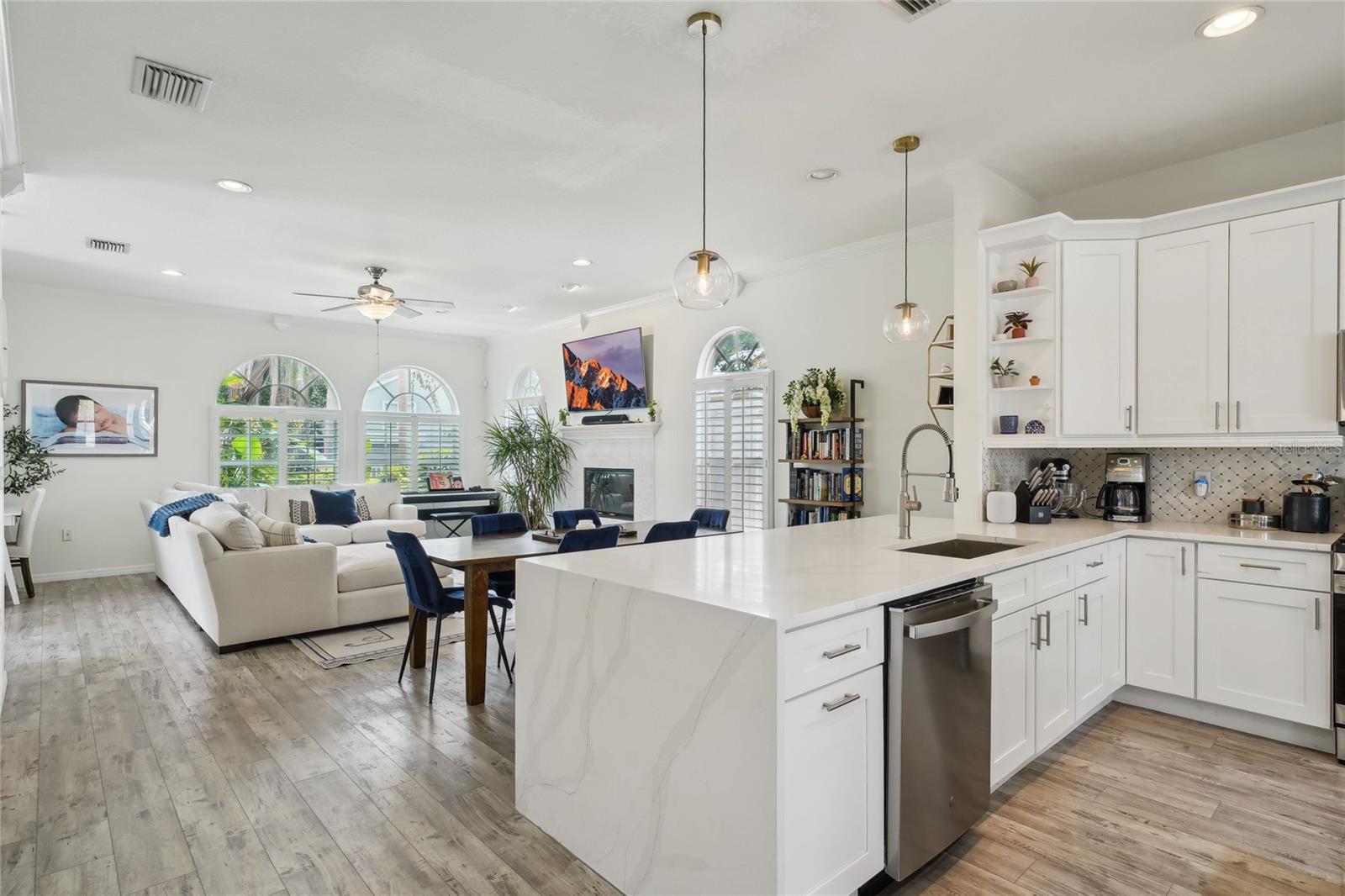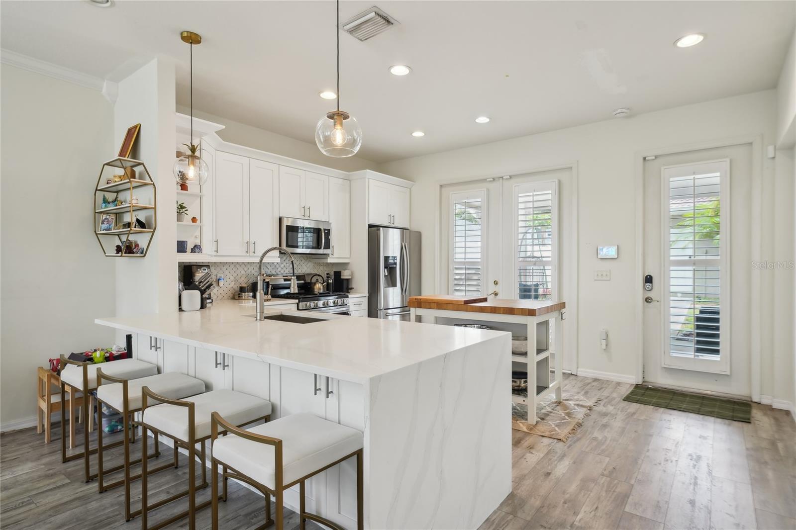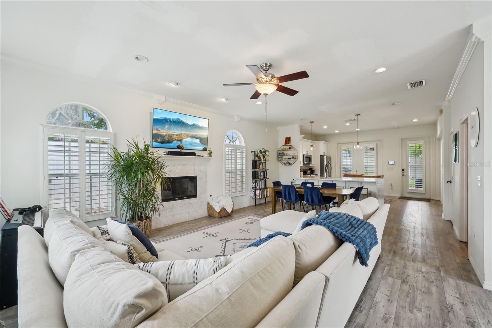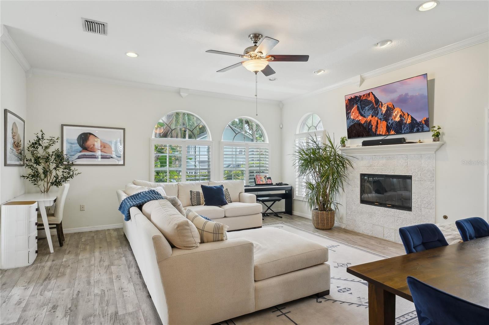 Welcome to this breathtaking 3-bedroom, 2.5-bathroom home with a bonus room currently used as an office, nestled in the heart of the highly desirable Woodlawn neighborhood. This property sits high and dry, safely outside of any designated flood zone. From the moment you arrive, you’ll be captivated by the curb appeal—terra cotta barrel tile roofing, meticulously maintained landscaping, and a grand double-door entry that sets the tone for what’s inside. Step into a thoughtfully designed open floorplan where luxury vinyl plank flooring, plantation shutters, crown molding, and a newly refinished gas log fireplace create an inviting and sophisticated living space. The kitchen is truly a chef’s dream, showcasing quartz waterfall countertops, a premium Bosch gas range, stainless steel appliances, and an oversized pantry for all your storage needs. Just off the main living area, French doors open into a cozy den or office space, offering flexibility to suit your lifestyle. Downstairs also includes a convenient powder room for guests, while upstairs features rich hardwood flooring throughout. The laundry room is located right where you want it—upstairs and close to the bedrooms—making everyday life easier. The primary suite is nothing short of exceptional, boasting a fully renovated bathroom with a glass-enclosed shower, free-standing soaking tub, dual vanities, and a spacious walk-in closet designed to impress. French doors lead you to your private backyard sanctuary, complete with a pergola-style insulated patio cover and plenty of space to build the pool of your dreams. There's even room for RV or boat parking alongside the detached garage, which also offers generous storage options. Major updates like newer A/C (2019) and all new plumbing throughout offer added peace of mind. And let’s not forget about the location—just minutes to Trader Joe’s, Crescent Lake Park, downtown St. Pete, Vinoy Golf Club, award-winning beaches, and a quick hop onto I-275 for easy commuting. Enjoy nightly strolls at nearby Blanc Park or explore all the shopping and dining that vibrant St. Petersburg has to offer. This home truly has it all—schedule your showing today!