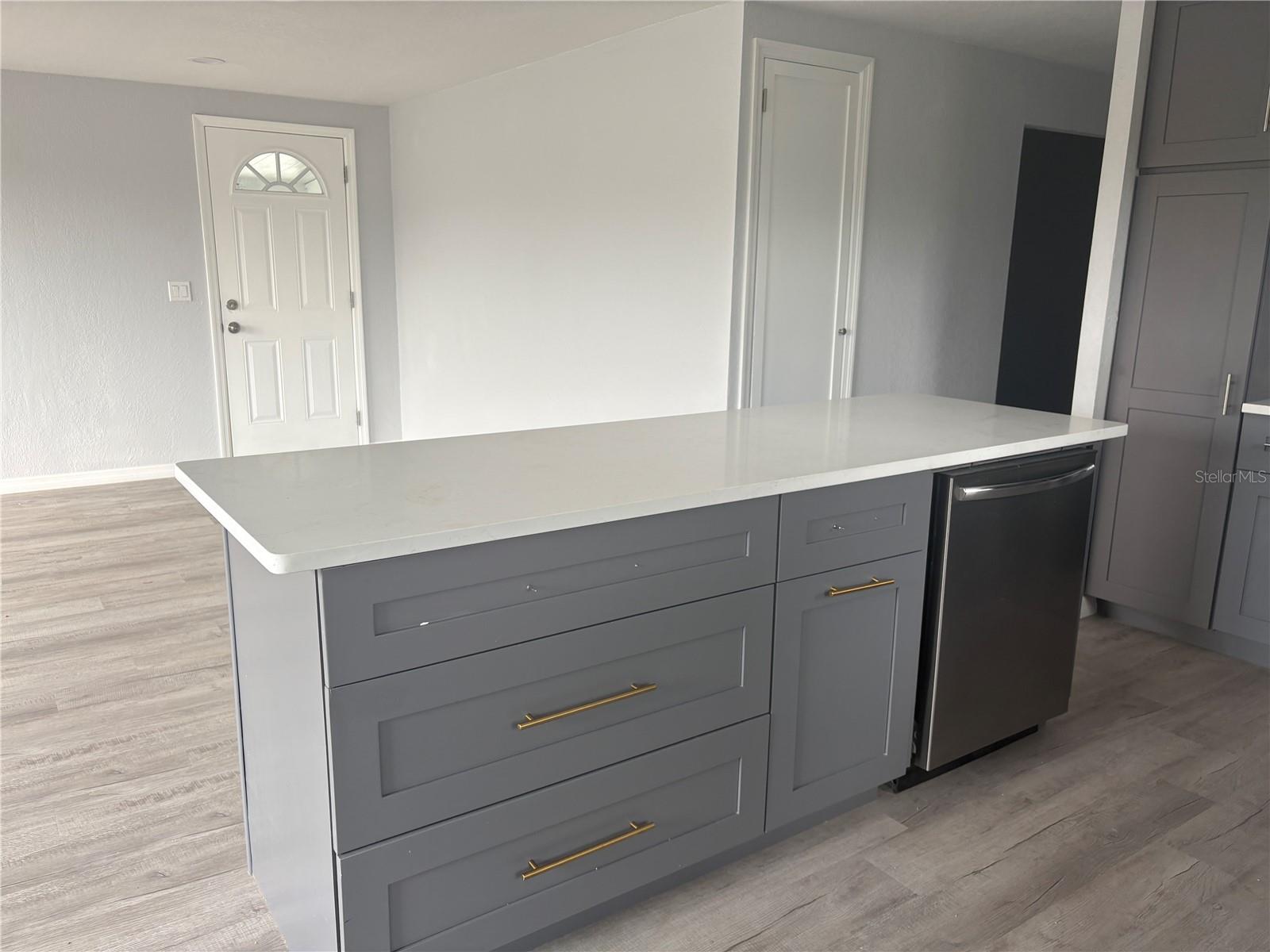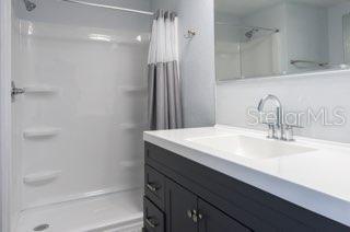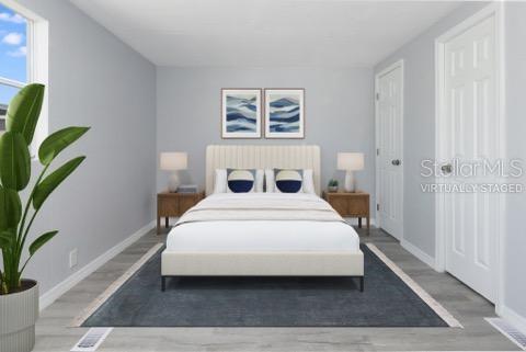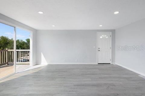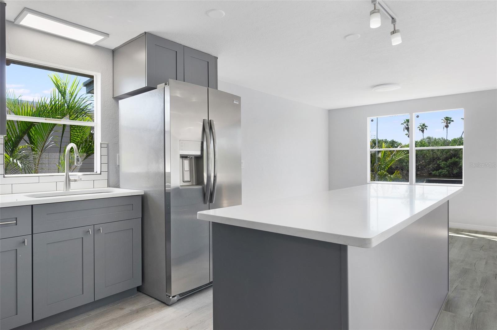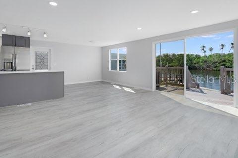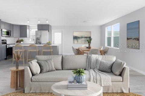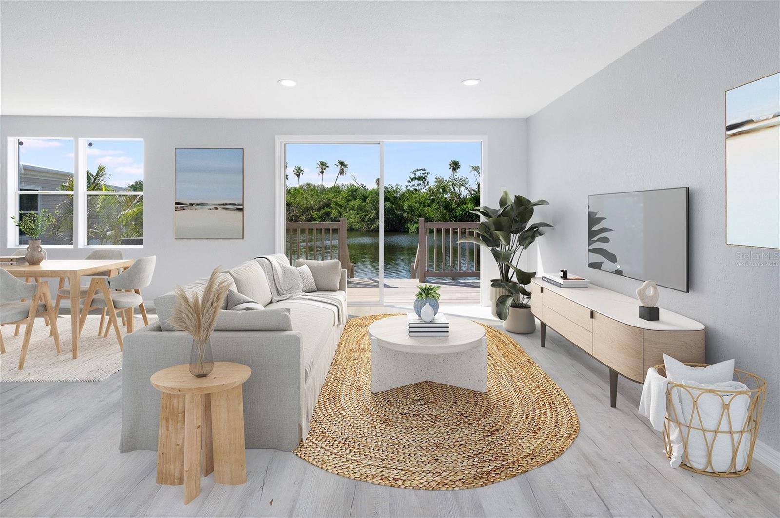 One or more photo(s) has been virtually staged. This remodeled WATERFRONT 3 bedroom 2 bath home has a screened porch, an open porch, and a deck. No interior flooding with 2024 storms. New in 2025, stainless steel appliances, cabinets, large custom island, solid surface counter tops, laminate flooring throughout, new windows, and drywall thru out. Bathrooms remodeled with new cabinets, sinks, and showers. New A/C and ductwork. Parking for 4 cars. No interior flooding with 2024 storms. Price includes share for the lot and ownership in the co-op. home is located in Americana Cove, a 55+, resident owned, waterfront community only 10 minutes from downtown St. Pete, 15 minutes from two airports and 25 minutes to Gulf beaches. Low monthly fee of $380 includes 24 hour manned gate, private streets, water/sever, lawn mowing/edging, trash pick up twice weekly and all amenities including heated pool, shuffleboard, bocce ball, two boat ramps and kayak launch. And many clubs and activities to get involved in.