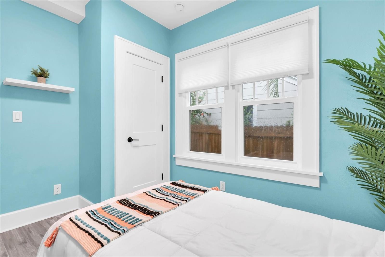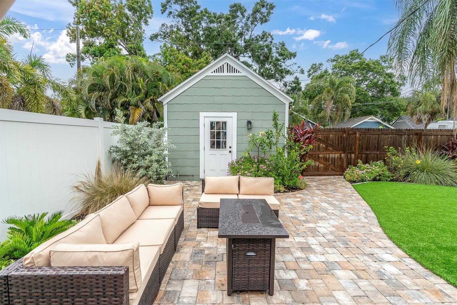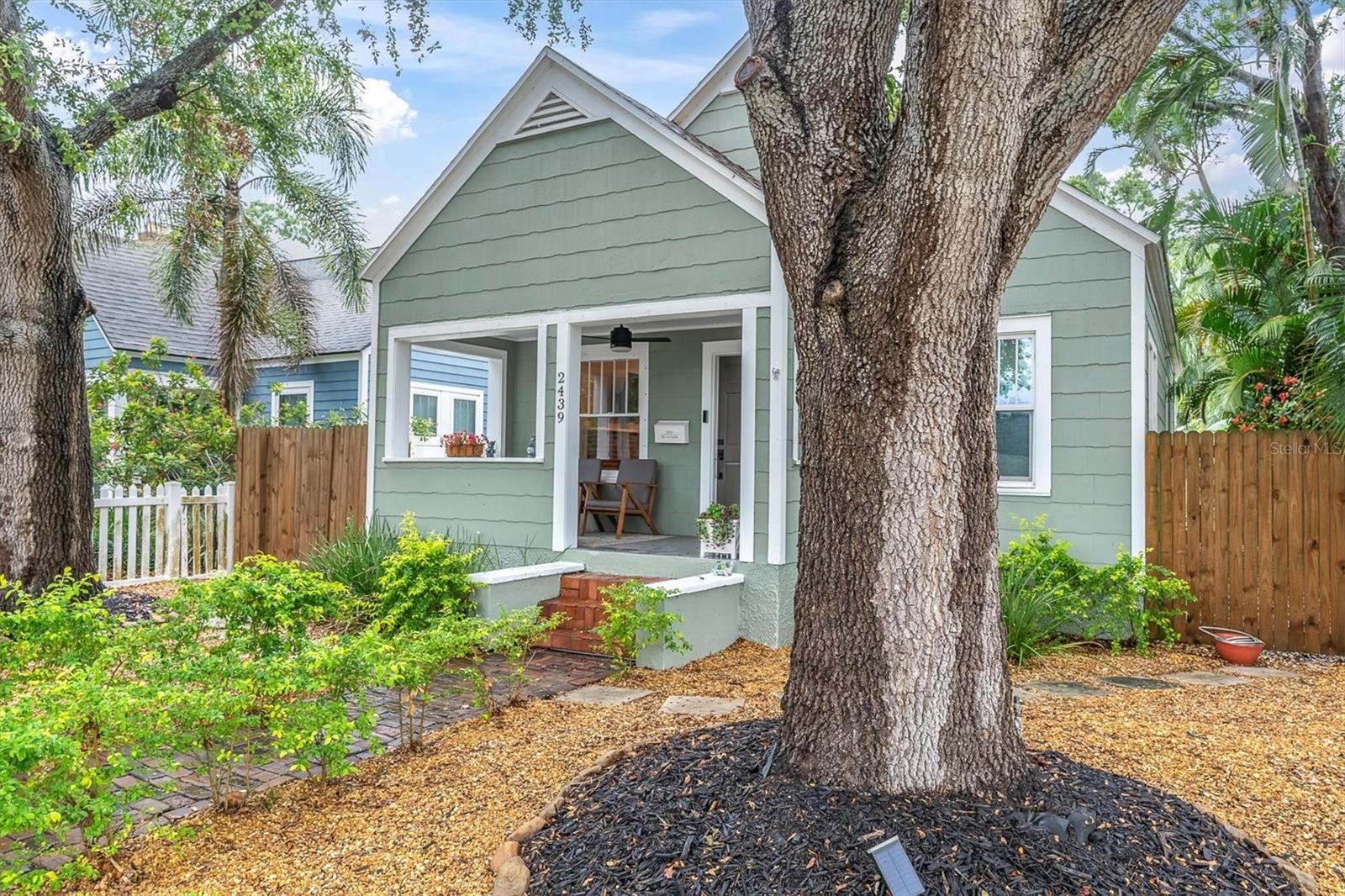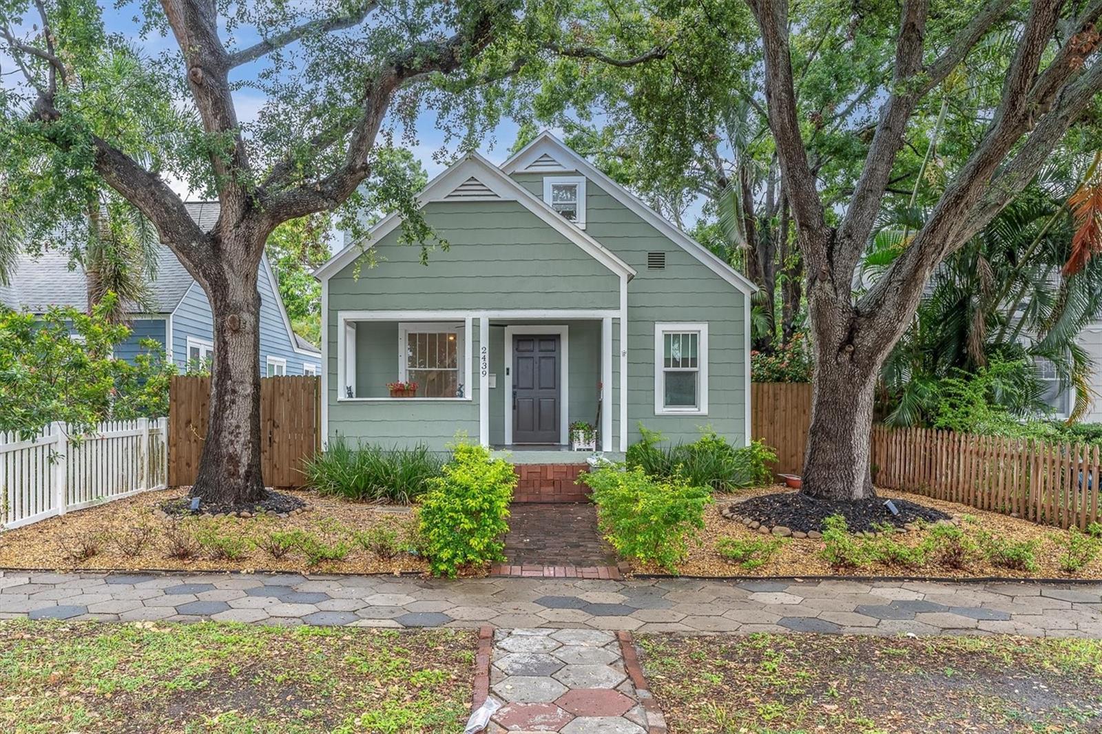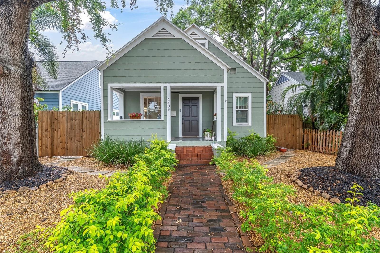 Charming 1940 Historic Kenwood 3 Bedroom, 2 Bathroom Home – Fully Renovated in 2021. Available furnished! Welcome to this beautifully restored 1940 gem in the heart of Historic Kenwood, nestled on a quiet brick street lined with mature, canopy trees. This home blends timeless character with modern updates, ensuring peace of mind for years to come. Enjoy mornings on the charming open front porch, perfect for sipping coffee and taking in the peaceful, tree-shaded surroundings. Inside, you’ll find top-to-bottom updates including newer electrical, plumbing, roof, windows, appliances, flooring, and cabinetry. Two bedrooms down stairs share a gorgeous bathroom with step-in shower with glass doors, contemporary tile and dual vanities. One of the bedrooms can serve as a primary with it's dual extra large walk-in closets, one of which the current owners use as an office! Upstairs, find the massive primary suit. A beautiful bedroom with a built-in window seat is inviting. The primary bathroom echos the brilliance of the home's design and the huge walk-in closet will be the cherry on top! The light-filled kitchen features a gas stove, stainless steel appliances, generous counter space of luxurious quarts, and stunning lighting. It's perfect for the chef in the home or a natural space for friends to gather. The spacious in-home utility room adds everyday convenience and you'll love the on-demand gas water heater. Whether you're entertaining or relaxing, the flow of the space and stylish finishes make this home both comfortable and functional. The backyard is a perfect combination of natural beauty and minimal up-keep thanks to the professionally installed faux grass. There is room for a pool or a potential ADU income or Multigenerational living. Located in the highly sought out Historic Kenwood Artist Enclave, within the vibrant Grand Central District, you're just minutes from downtown St. Pete, Tampa, and the beaches. Additional highlights include: Detached garage plus alley access with additional parking. Plenty of space to add a pool or potential ADU income/Multigenerational living. Furniture can stay for a turnkey move-in. Don’t miss this opportunity to own a piece of Kenwood history, with the peace of mind of professional craftsmanship and modern systems. Call to schedule your private showing today!