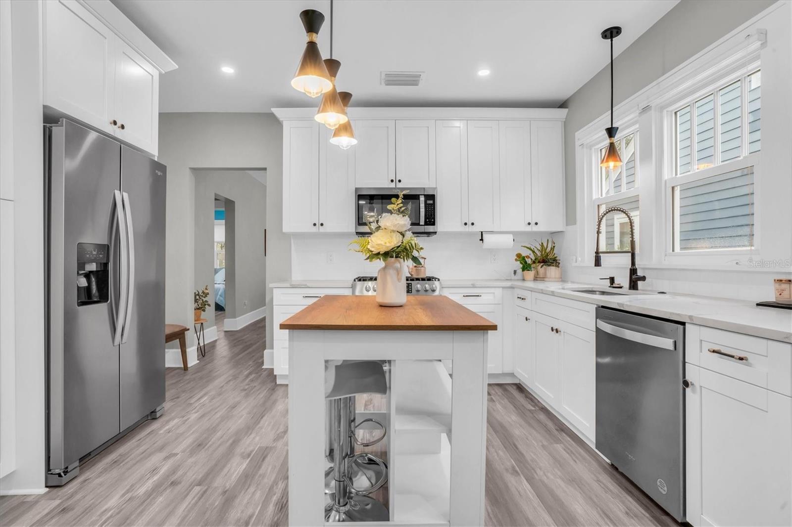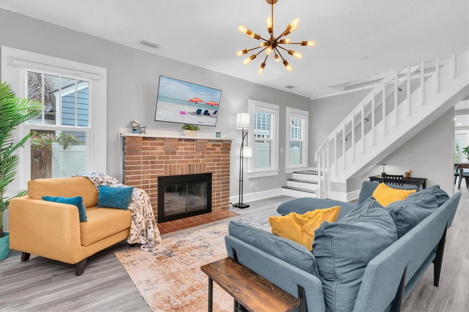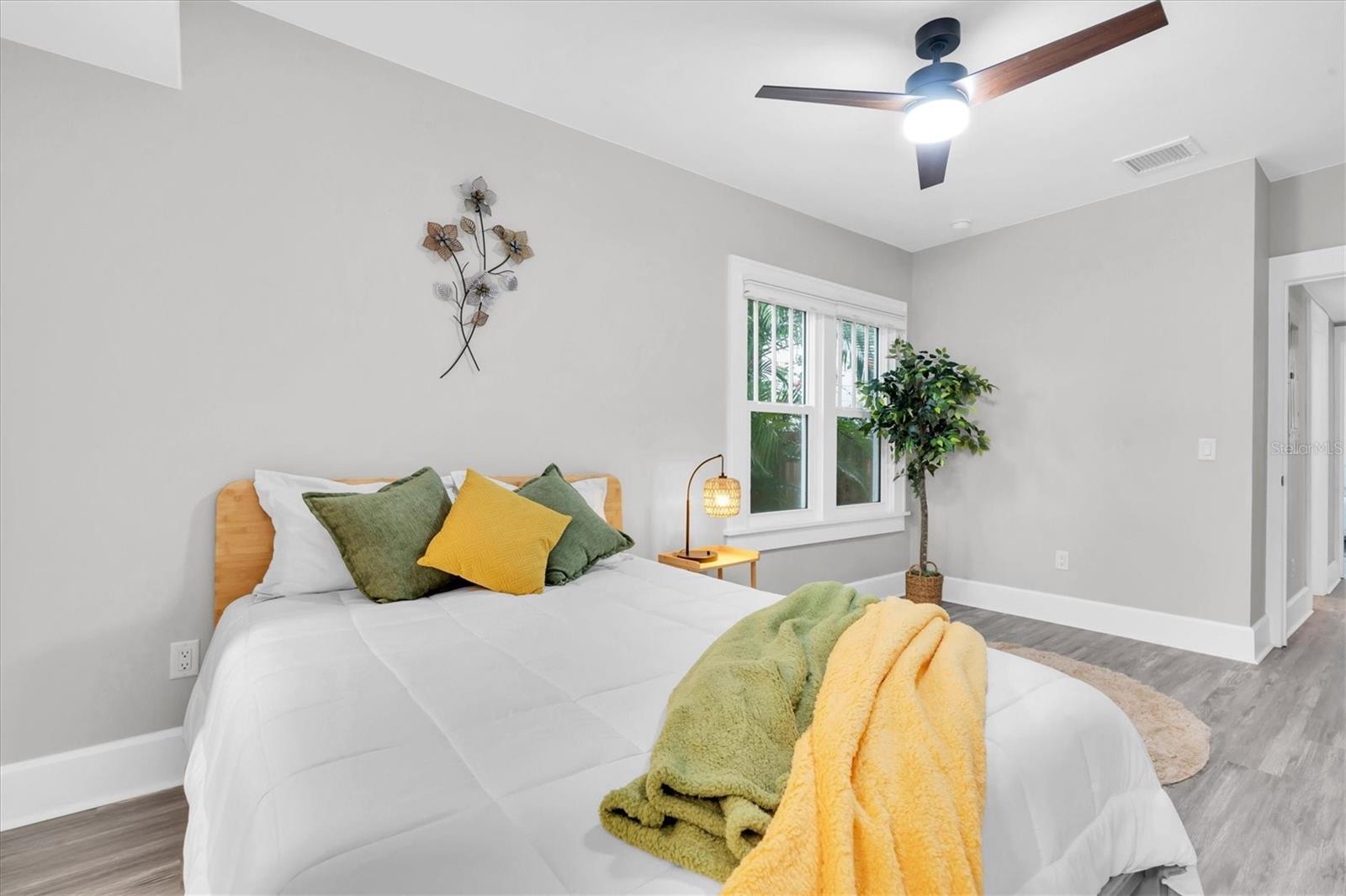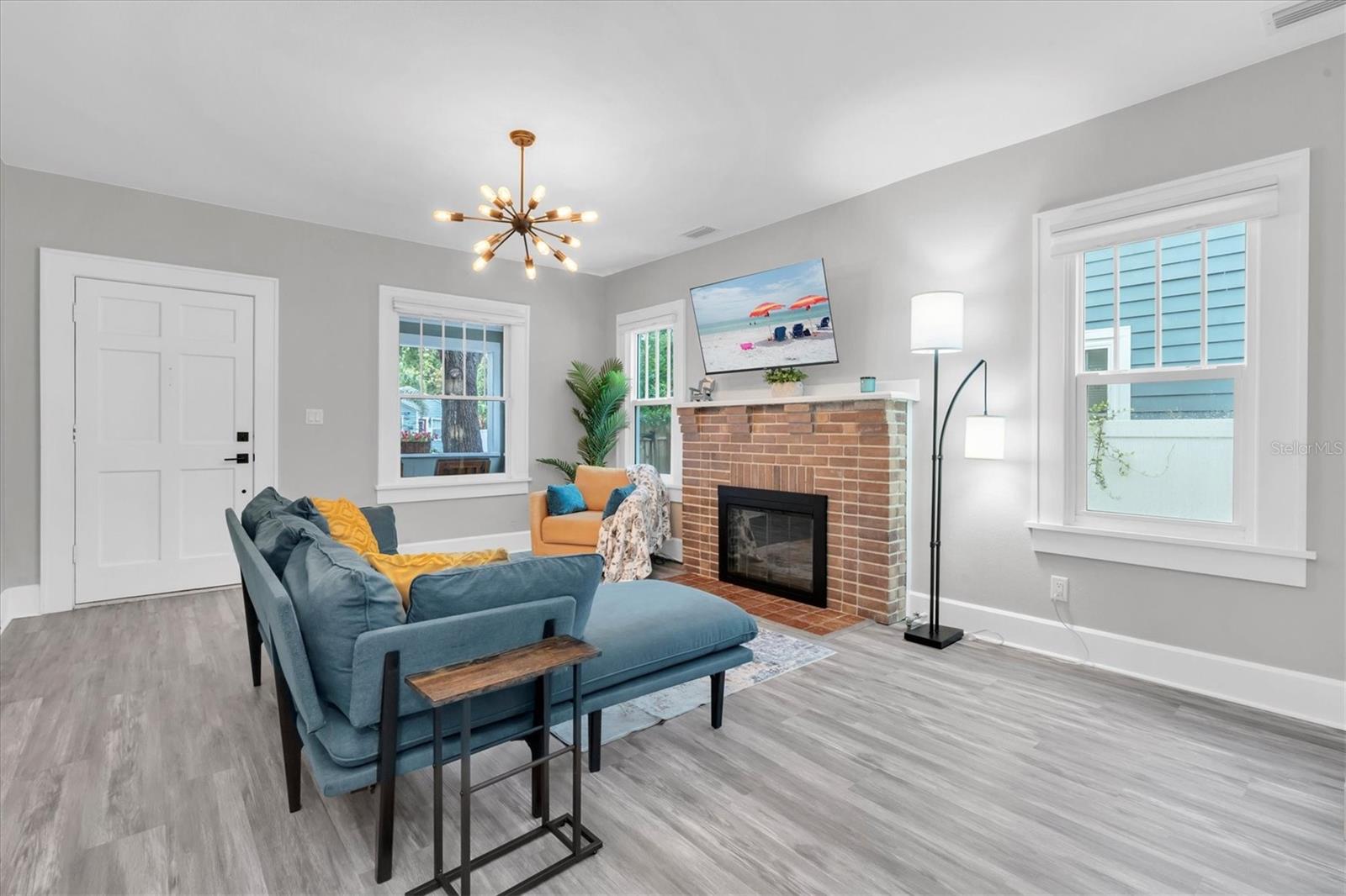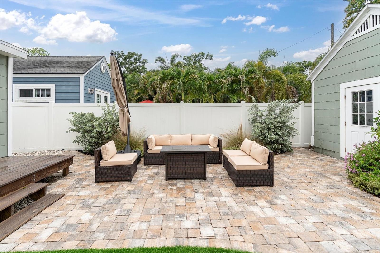 Charming 1940 Historic Kenwood 3 Bedroom, 2 Bathroom Home – Fully Renovated in 2021. Available furnished! Welcome to this beautifully restored 1940 gem in the heart of Historic Kenwood, nestled on a quiet brick street lined with mature, canopy trees. This home blends timeless character with modern updates, ensuring peace of mind for years to come. Enjoy mornings on the charming open front porch, perfect for sipping coffee and taking in the peaceful, tree-shaded surroundings. Inside, you’ll find top-to-bottom updates including newer electrical, plumbing, roof, windows, appliances, flooring, and cabinetry. Two bedrooms down stairs share a gorgeous bathroom with step-in shower with glass doors, contemporary tile and dual vanities. One of the bedrooms can serve as a primary with it's dual extra large walk-in closets, one of which the current owners use as an office! Upstairs, find the massive primary suit. A beautiful bedroom with a built-in window seat is inviting. The primary bathroom echos the brilliance of the home's design and the huge walk-in closet will be the cherry on top! The light-filled kitchen features a gas stove, stainless steel appliances, generous counter space of luxurious quarts, and stunning lighting. It's perfect for the chef in the home or a natural space for friends to gather. The spacious in-home utility room adds everyday convenience and you'll love the on-demand gas water heater. Whether you're entertaining or relaxing, the flow of the space and stylish finishes make this home both comfortable and functional. The backyard is a perfect combination of natural beauty and minimal up-keep thanks to the professionally installed faux grass. There is room for a pool or a potential ADU income or Multigenerational living. Located in the highly sought out Historic Kenwood Artist Enclave, within the vibrant Grand Central District, you're just minutes from downtown St. Pete, Tampa, and the beaches. Additional highlights include: Detached garage plus alley access with additional parking. Plenty of space to add a pool or potential ADU income/Multigenerational living. Furniture can stay for a turnkey move-in. Don’t miss this opportunity to own a piece of Kenwood history, with the peace of mind of professional craftsmanship and modern systems. Call to schedule your private showing today!