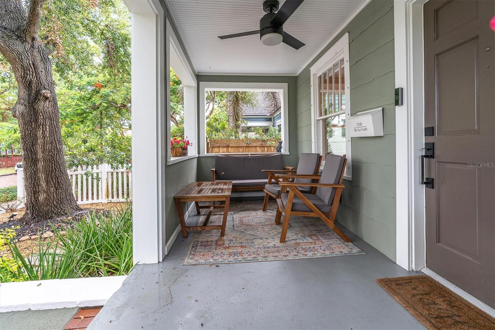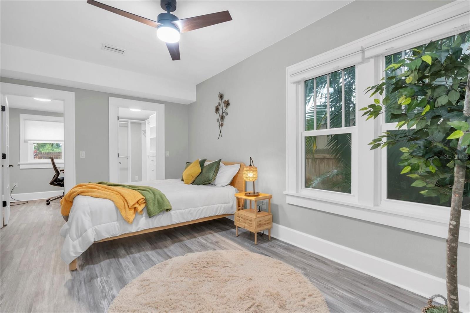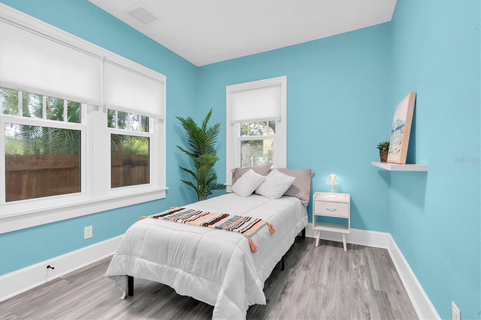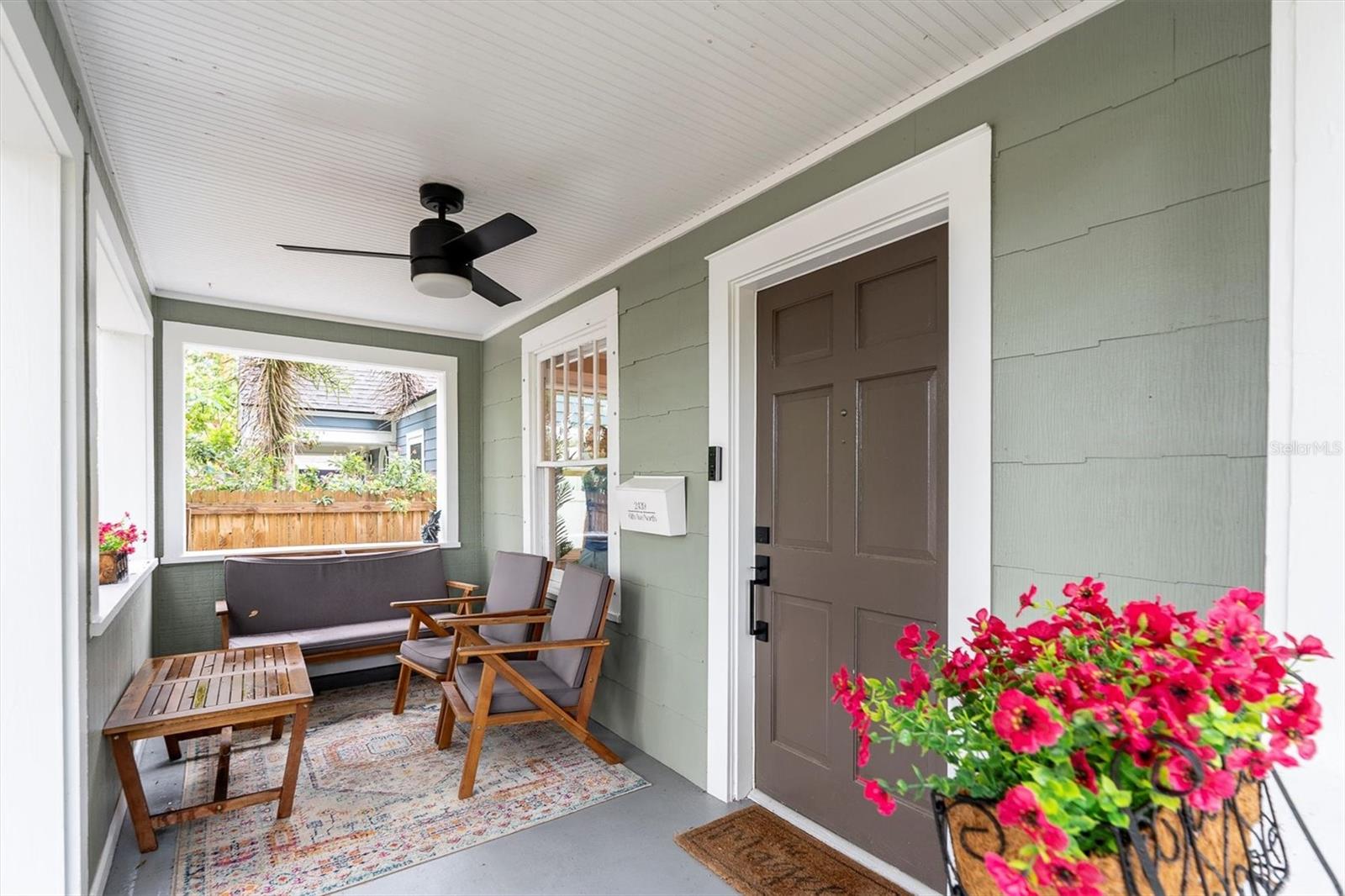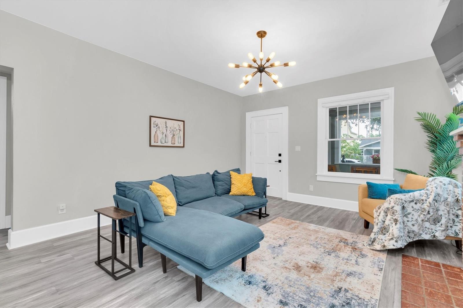 Charming 1940 Historic Kenwood 3 Bedroom, 2 Bathroom Home – Fully Renovated in 2021. Available furnished! Welcome to this beautifully restored 1940 gem in the heart of Historic Kenwood, nestled on a quiet brick street lined with mature, canopy trees. This home blends timeless character with modern updates, ensuring peace of mind for years to come. Enjoy mornings on the charming open front porch, perfect for sipping coffee and taking in the peaceful, tree-shaded surroundings. Inside, you’ll find top-to-bottom updates including newer electrical, plumbing, roof, windows, appliances, flooring, and cabinetry. Two bedrooms down stairs share a gorgeous bathroom with step-in shower with glass doors, contemporary tile and dual vanities. One of the bedrooms can serve as a primary with it's dual extra large walk-in closets, one of which the current owners use as an office! Upstairs, find the massive primary suit. A beautiful bedroom with a built-in window seat is inviting. The primary bathroom echos the brilliance of the home's design and the huge walk-in closet will be the cherry on top! The light-filled kitchen features a gas stove, stainless steel appliances, generous counter space of luxurious quarts, and stunning lighting. It's perfect for the chef in the home or a natural space for friends to gather. The spacious in-home utility room adds everyday convenience and you'll love the on-demand gas water heater. Whether you're entertaining or relaxing, the flow of the space and stylish finishes make this home both comfortable and functional. The backyard is a perfect combination of natural beauty and minimal up-keep thanks to the professionally installed faux grass. There is room for a pool or a potential ADU income or Multigenerational living. Located in the highly sought out Historic Kenwood Artist Enclave, within the vibrant Grand Central District, you're just minutes from downtown St. Pete, Tampa, and the beaches. Additional highlights include: Detached garage plus alley access with additional parking. Plenty of space to add a pool or potential ADU income/Multigenerational living. Furniture can stay for a turnkey move-in. Don’t miss this opportunity to own a piece of Kenwood history, with the peace of mind of professional craftsmanship and modern systems. Call to schedule your private showing today!