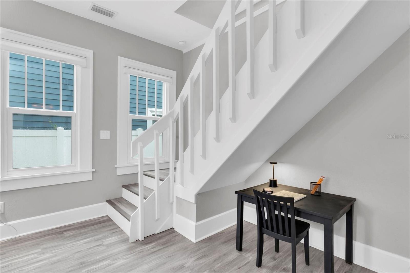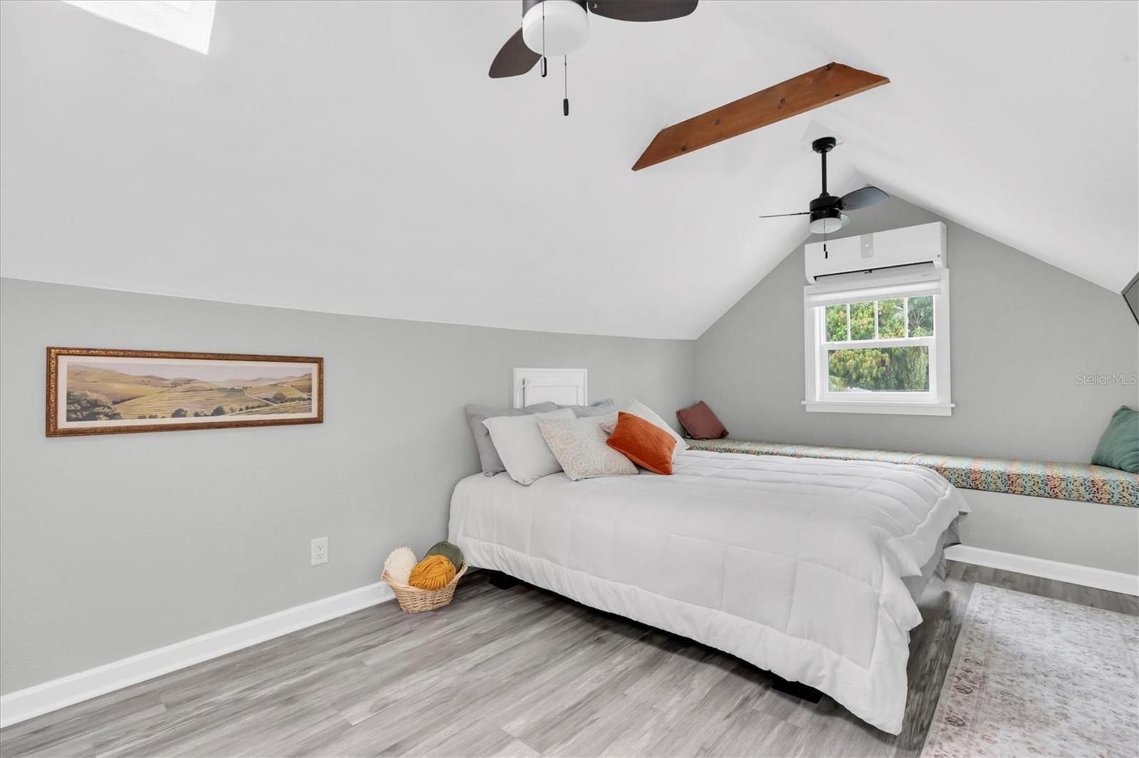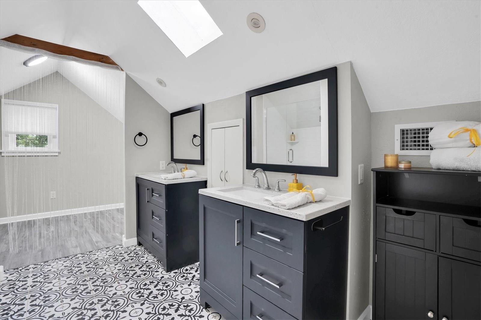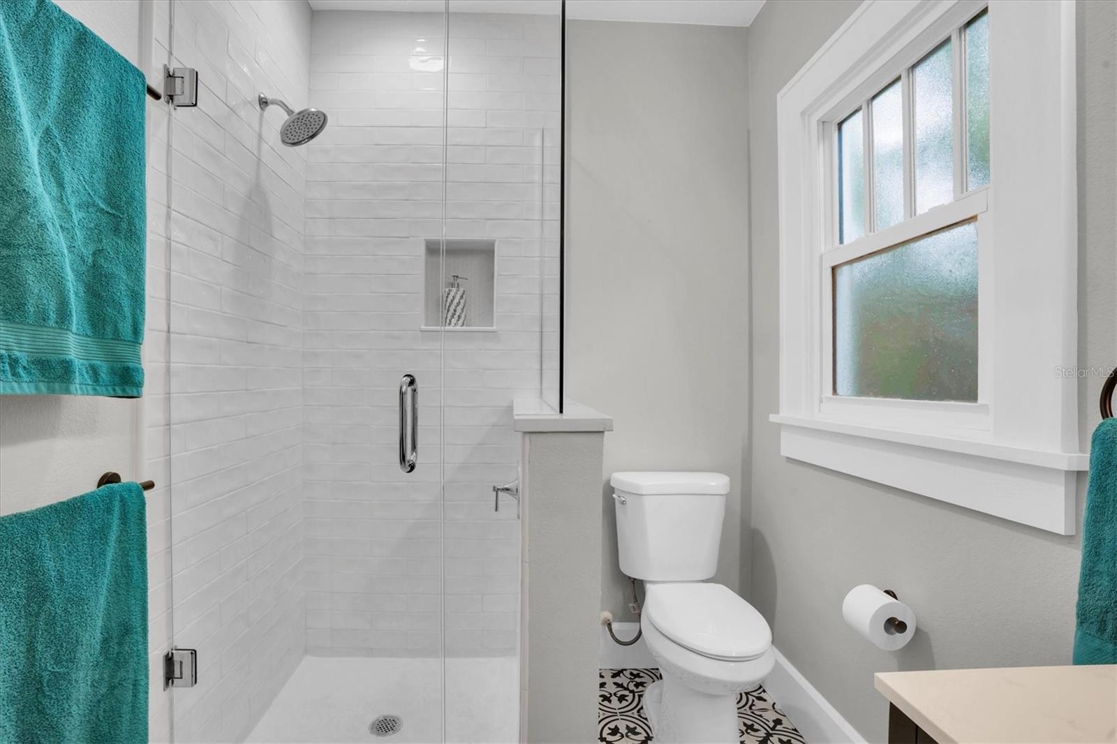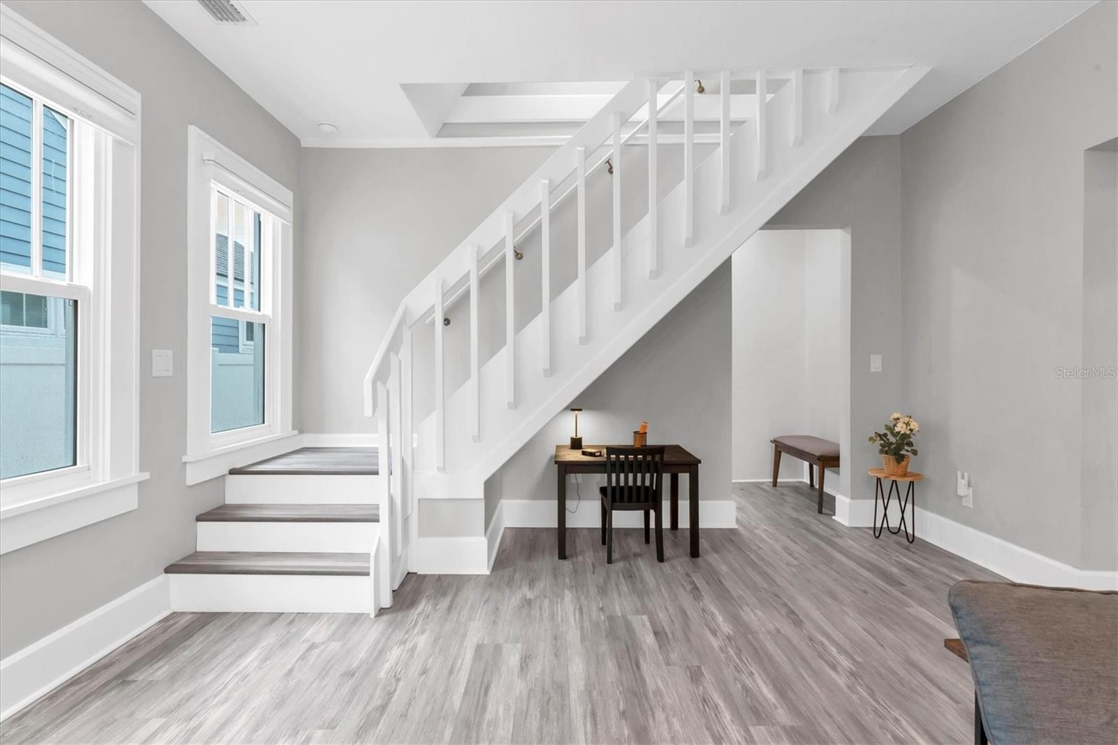 Charming 1940 Historic Kenwood 3 Bedroom, 2 Bathroom Home – Fully Renovated in 2021. Available furnished! Welcome to this beautifully restored 1940 gem in the heart of Historic Kenwood, nestled on a quiet brick street lined with mature, canopy trees. This home blends timeless character with modern updates, ensuring peace of mind for years to come. Enjoy mornings on the charming open front porch, perfect for sipping coffee and taking in the peaceful, tree-shaded surroundings. Inside, you’ll find top-to-bottom updates including newer electrical, plumbing, roof, windows, appliances, flooring, and cabinetry. Two bedrooms down stairs share a gorgeous bathroom with step-in shower with glass doors, contemporary tile and dual vanities. One of the bedrooms can serve as a primary with it's dual extra large walk-in closets, one of which the current owners use as an office! Upstairs, find the massive primary suit. A beautiful bedroom with a built-in window seat is inviting. The primary bathroom echos the brilliance of the home's design and the huge walk-in closet will be the cherry on top! The light-filled kitchen features a gas stove, stainless steel appliances, generous counter space of luxurious quarts, and stunning lighting. It's perfect for the chef in the home or a natural space for friends to gather. The spacious in-home utility room adds everyday convenience and you'll love the on-demand gas water heater. Whether you're entertaining or relaxing, the flow of the space and stylish finishes make this home both comfortable and functional. The backyard is a perfect combination of natural beauty and minimal up-keep thanks to the professionally installed faux grass. There is room for a pool or a potential ADU income or Multigenerational living. Located in the highly sought out Historic Kenwood Artist Enclave, within the vibrant Grand Central District, you're just minutes from downtown St. Pete, Tampa, and the beaches. Additional highlights include: Detached garage plus alley access with additional parking. Plenty of space to add a pool or potential ADU income/Multigenerational living. Furniture can stay for a turnkey move-in. Don’t miss this opportunity to own a piece of Kenwood history, with the peace of mind of professional craftsmanship and modern systems. Call to schedule your private showing today!