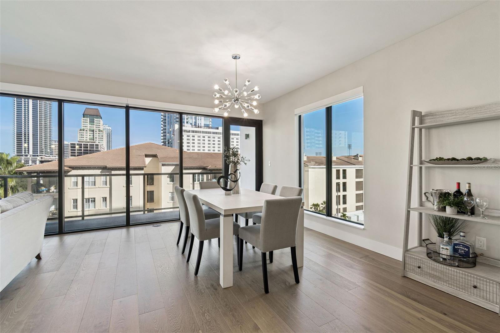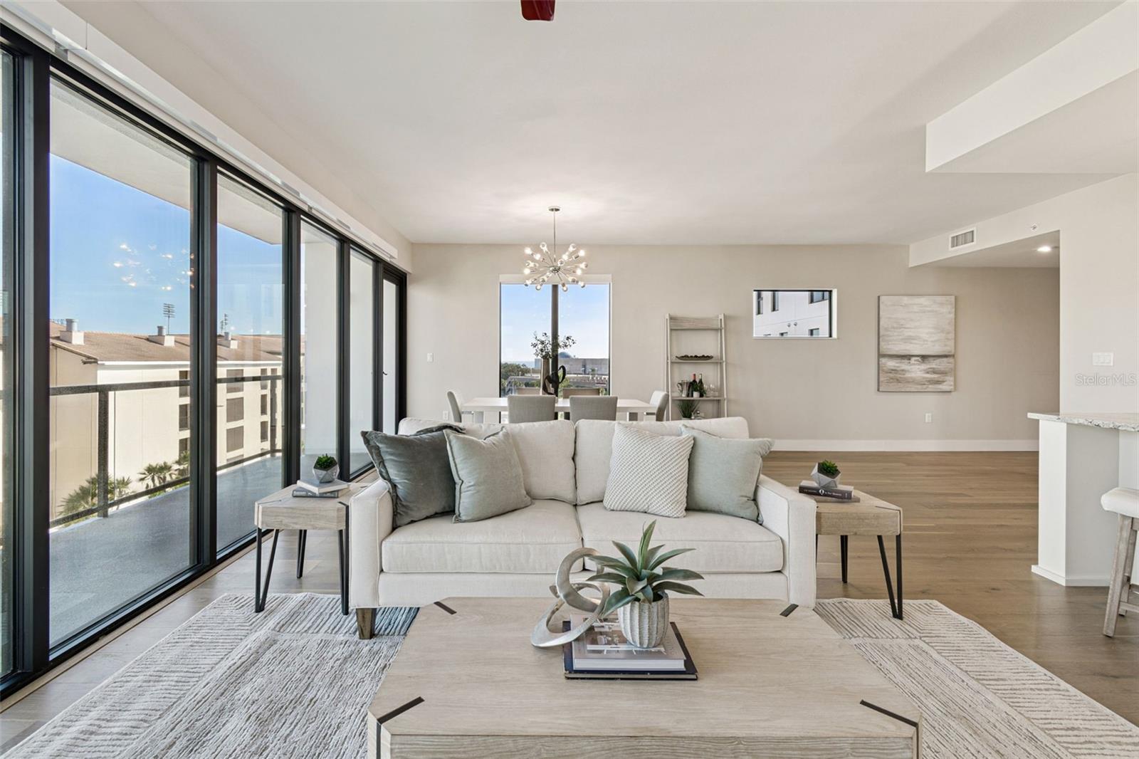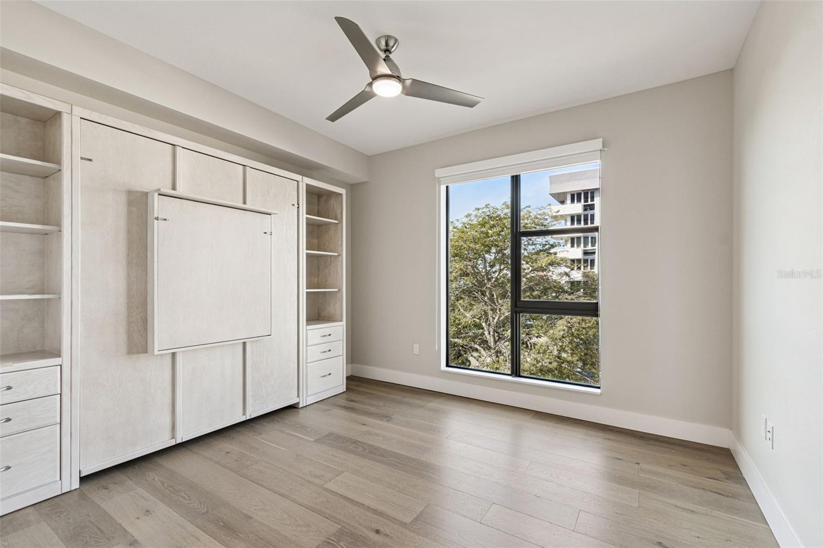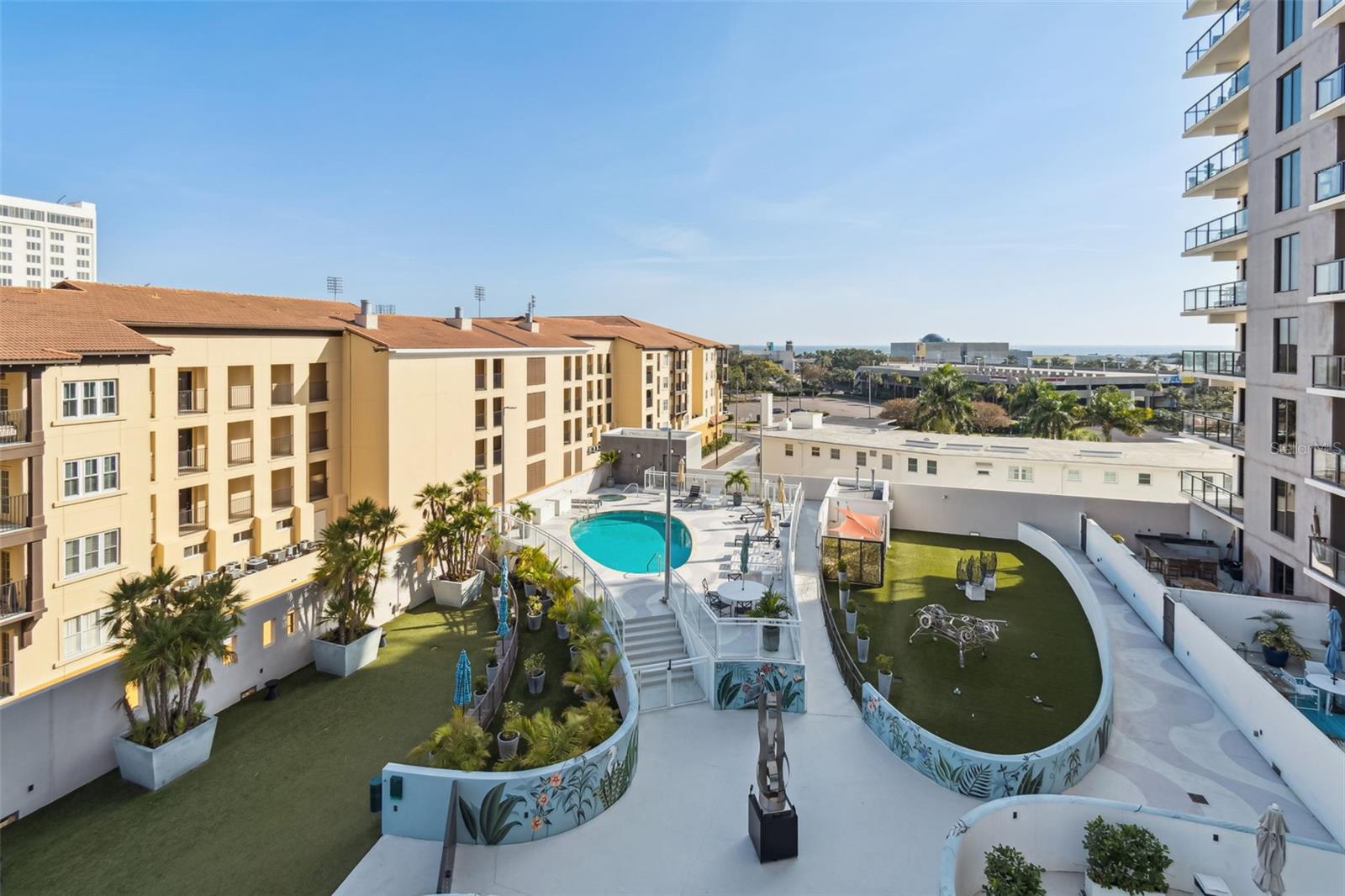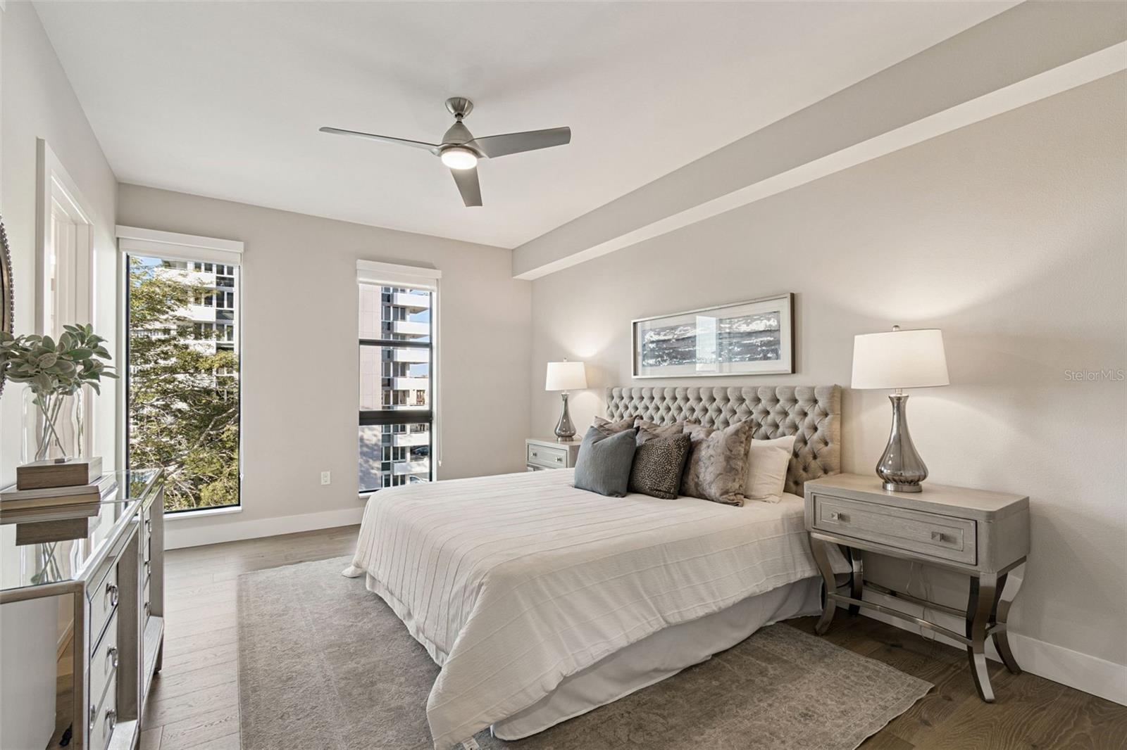 You’ll enjoy panoramic vistas of the city and Tampa Bay from the spacious balcony with room for plenty of seating and no adjacent neighbors. Step inside and you're welcomed by a spacious Gallery Hall—perfect for showcasing art and setting a dramatic tone for what’s ahead. This 1,555-square-foot, 2-bedroom, 2-bath home stands apart with windows on three sides, flooding the open floor plan with natural light and ever-changing views. The living and dining areas are framed by floor-to-ceiling glass and outfitted with motorized blinds for effortless ambiance control. The sleek, contemporary kitchen features upgraded countertops and cabinetry with custom pullouts, a natural gas range, wine cooler, and smart storage throughout. Design details shine here—upgraded dimmers, modern lighting, and stylish ceiling fans add a layer of refinement. The primary suite is a serene retreat with a generous California Closets walk-in and a spa-inspired bath complete with a deep soaking tub, oversized shower, and dual-sink vanity. The second bedroom includes a custom-built queen Murphy bed with integrated desk, making it ideal as a guest room, office, or both. Blackout and shade blinds are installed in both bedrooms for maximum comfort. A dedicated laundry area with custom cabinetry adds convenience, and the included first-floor parking space is a major plus. The Salvador—an exclusive, LEED-certified building of just 74 residences—offers outstanding amenities: pool and spa, state-of-the-art fitness center, social room, grilling area, dog park with wash station, sculpture garden, and outdoor fire pit. Concierge service and on-site management elevate the lifestyle. Set in a peaceful pocket just blocks from downtown, the Dali Museum, Mahaffey Theater, Albert Whitted Airfield, and the Saturday Morning Market, this residence blends privacy, luxury, and location like few others. Schedule your private tour today.