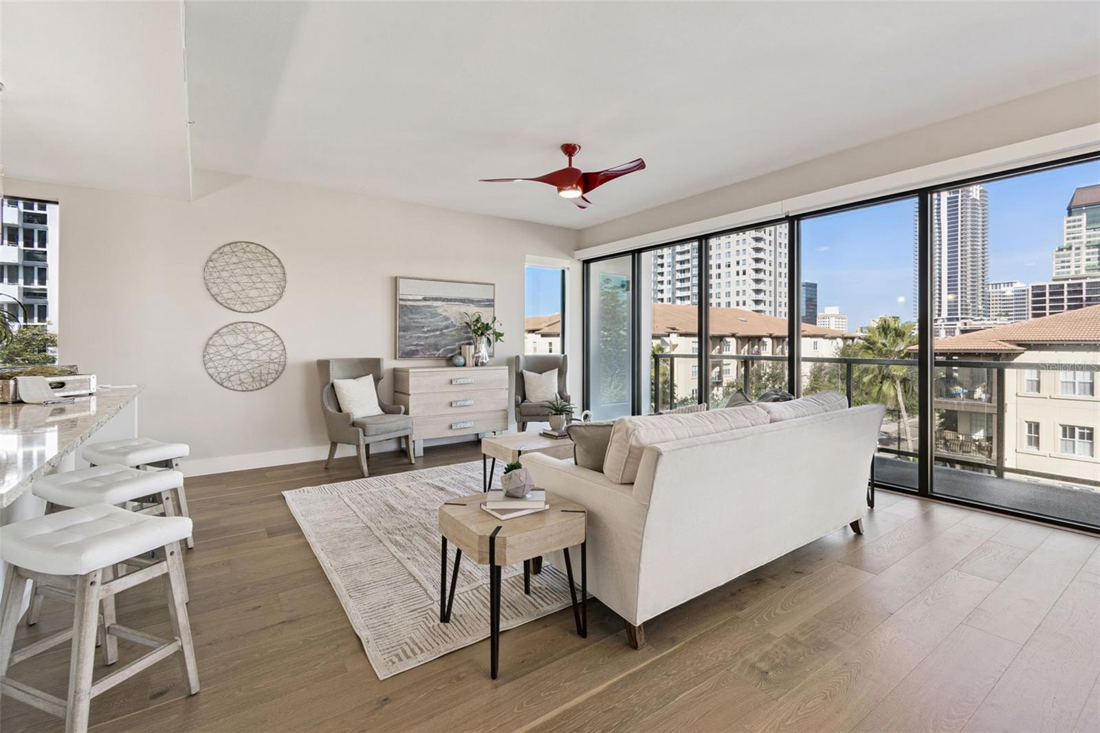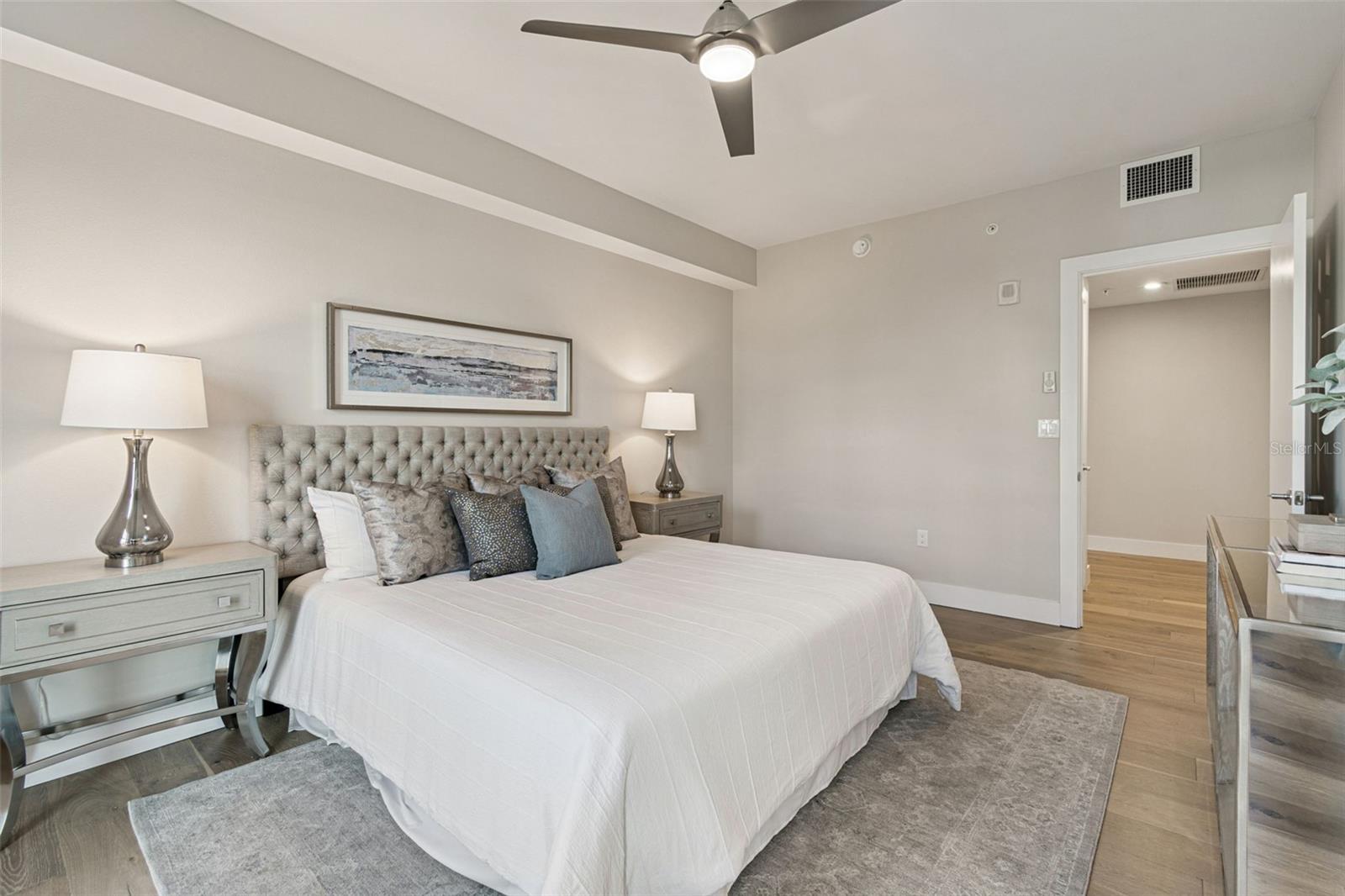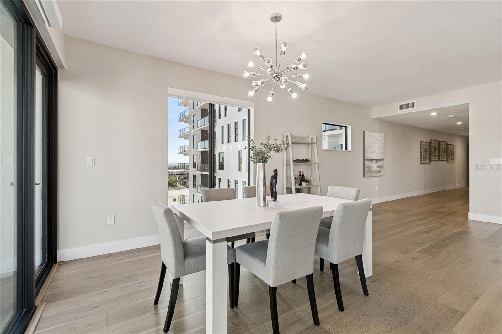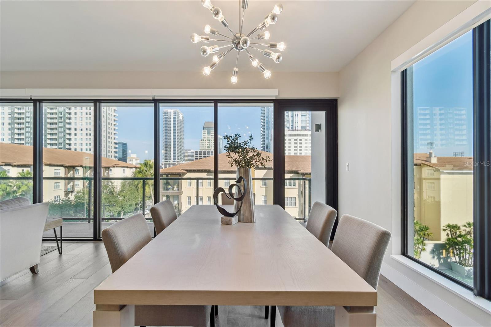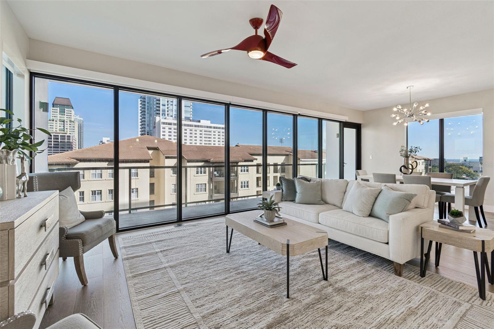 You’ll enjoy panoramic vistas of the city and Tampa Bay from the spacious balcony with room for plenty of seating and no adjacent neighbors. Step inside and you're welcomed by a spacious Gallery Hall—perfect for showcasing art and setting a dramatic tone for what’s ahead. This 1,555-square-foot, 2-bedroom, 2-bath home stands apart with windows on three sides, flooding the open floor plan with natural light and ever-changing views. The living and dining areas are framed by floor-to-ceiling glass and outfitted with motorized blinds for effortless ambiance control. The sleek, contemporary kitchen features upgraded countertops and cabinetry with custom pullouts, a natural gas range, wine cooler, and smart storage throughout. Design details shine here—upgraded dimmers, modern lighting, and stylish ceiling fans add a layer of refinement. The primary suite is a serene retreat with a generous California Closets walk-in and a spa-inspired bath complete with a deep soaking tub, oversized shower, and dual-sink vanity. The second bedroom includes a custom-built queen Murphy bed with integrated desk, making it ideal as a guest room, office, or both. Blackout and shade blinds are installed in both bedrooms for maximum comfort. A dedicated laundry area with custom cabinetry adds convenience, and the included first-floor parking space is a major plus. The Salvador—an exclusive, LEED-certified building of just 74 residences—offers outstanding amenities: pool and spa, state-of-the-art fitness center, social room, grilling area, dog park with wash station, sculpture garden, and outdoor fire pit. Concierge service and on-site management elevate the lifestyle. Set in a peaceful pocket just blocks from downtown, the Dali Museum, Mahaffey Theater, Albert Whitted Airfield, and the Saturday Morning Market, this residence blends privacy, luxury, and location like few others. Schedule your private tour today.