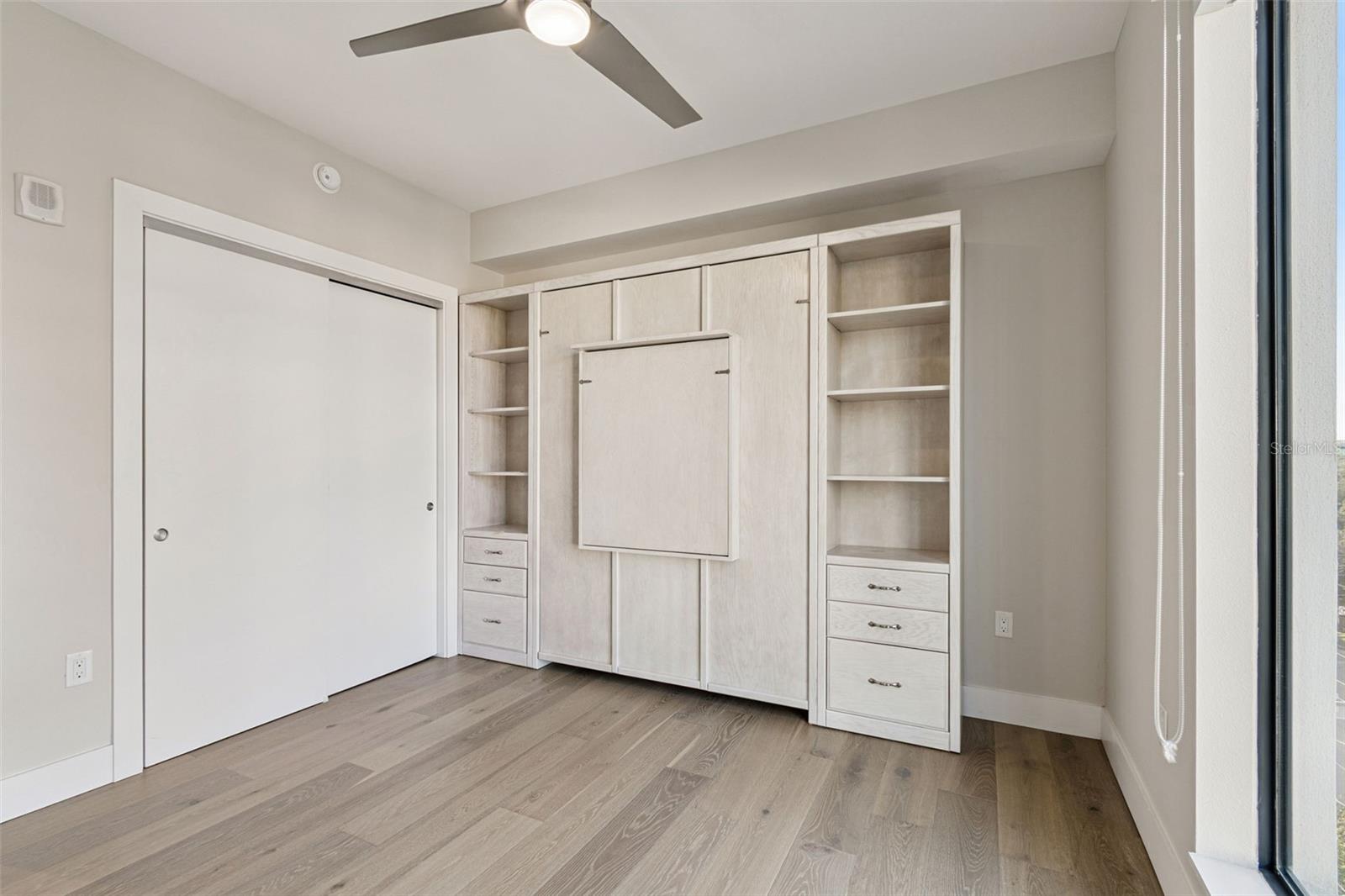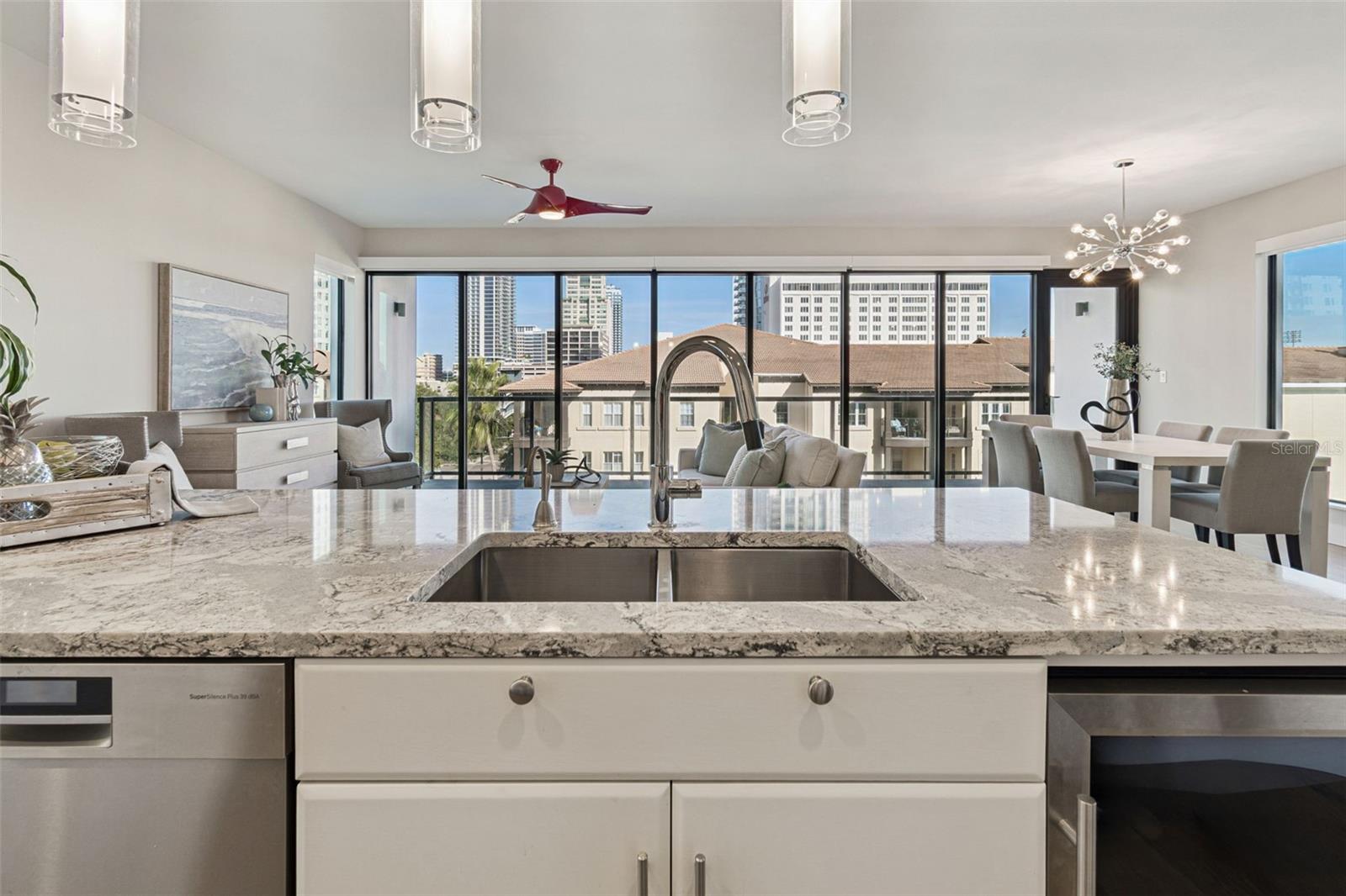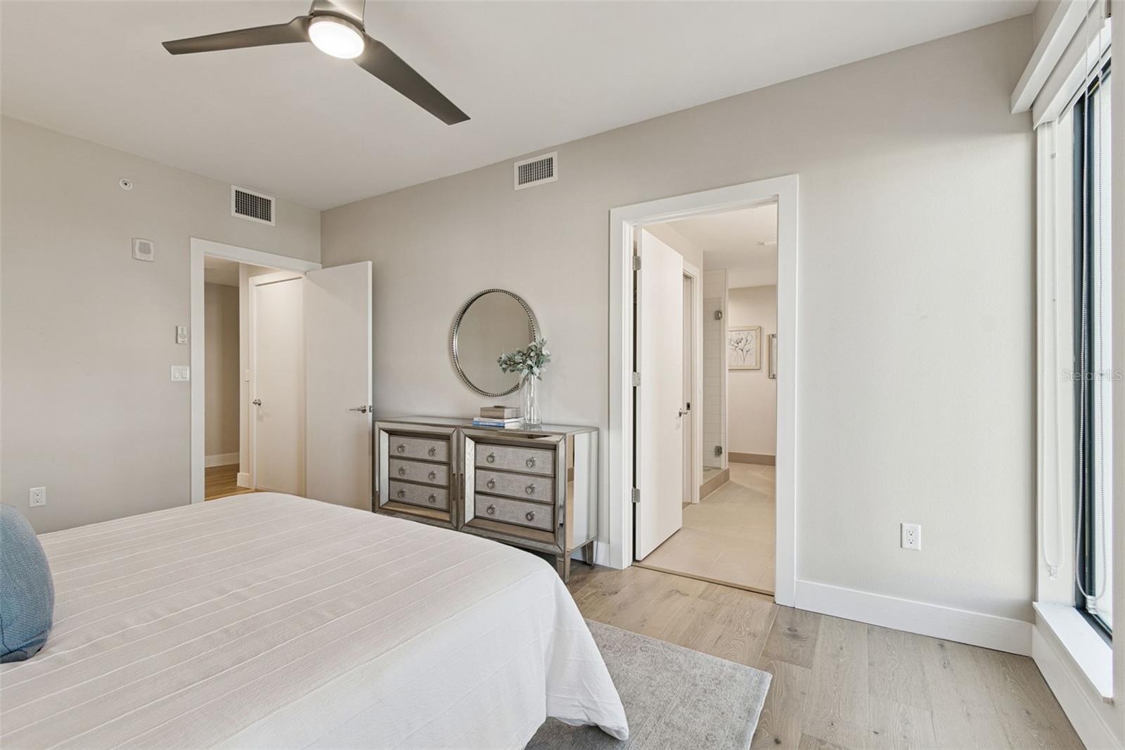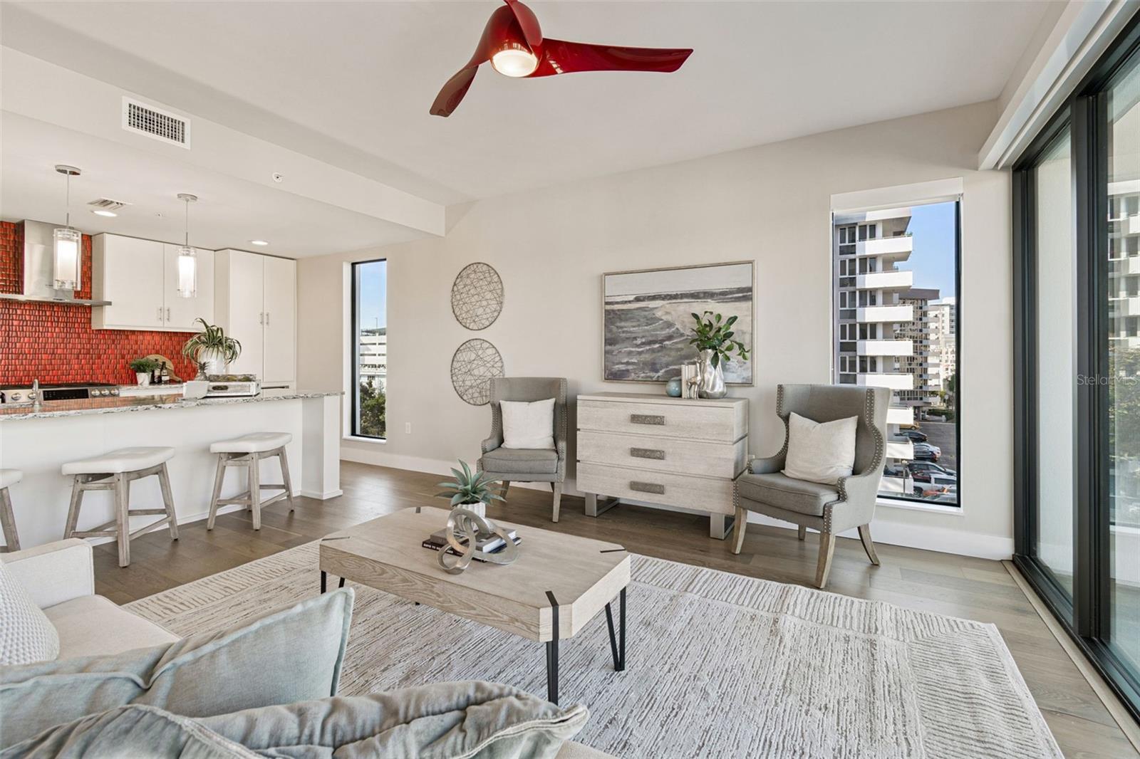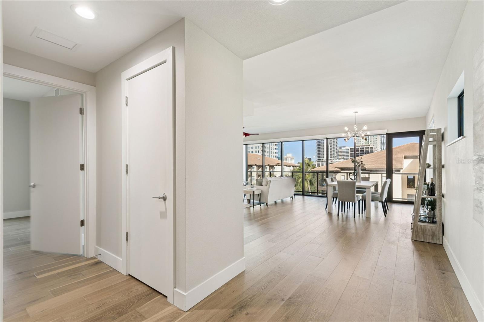 You’ll enjoy panoramic vistas of the city and Tampa Bay from the spacious balcony with room for plenty of seating and no adjacent neighbors. Step inside and you're welcomed by a spacious Gallery Hall—perfect for showcasing art and setting a dramatic tone for what’s ahead. This 1,555-square-foot, 2-bedroom, 2-bath home stands apart with windows on three sides, flooding the open floor plan with natural light and ever-changing views. The living and dining areas are framed by floor-to-ceiling glass and outfitted with motorized blinds for effortless ambiance control. The sleek, contemporary kitchen features upgraded countertops and cabinetry with custom pullouts, a natural gas range, wine cooler, and smart storage throughout. Design details shine here—upgraded dimmers, modern lighting, and stylish ceiling fans add a layer of refinement. The primary suite is a serene retreat with a generous California Closets walk-in and a spa-inspired bath complete with a deep soaking tub, oversized shower, and dual-sink vanity. The second bedroom includes a custom-built queen Murphy bed with integrated desk, making it ideal as a guest room, office, or both. Blackout and shade blinds are installed in both bedrooms for maximum comfort. A dedicated laundry area with custom cabinetry adds convenience, and the included first-floor parking space is a major plus. The Salvador—an exclusive, LEED-certified building of just 74 residences—offers outstanding amenities: pool and spa, state-of-the-art fitness center, social room, grilling area, dog park with wash station, sculpture garden, and outdoor fire pit. Concierge service and on-site management elevate the lifestyle. Set in a peaceful pocket just blocks from downtown, the Dali Museum, Mahaffey Theater, Albert Whitted Airfield, and the Saturday Morning Market, this residence blends privacy, luxury, and location like few others. Schedule your private tour today.