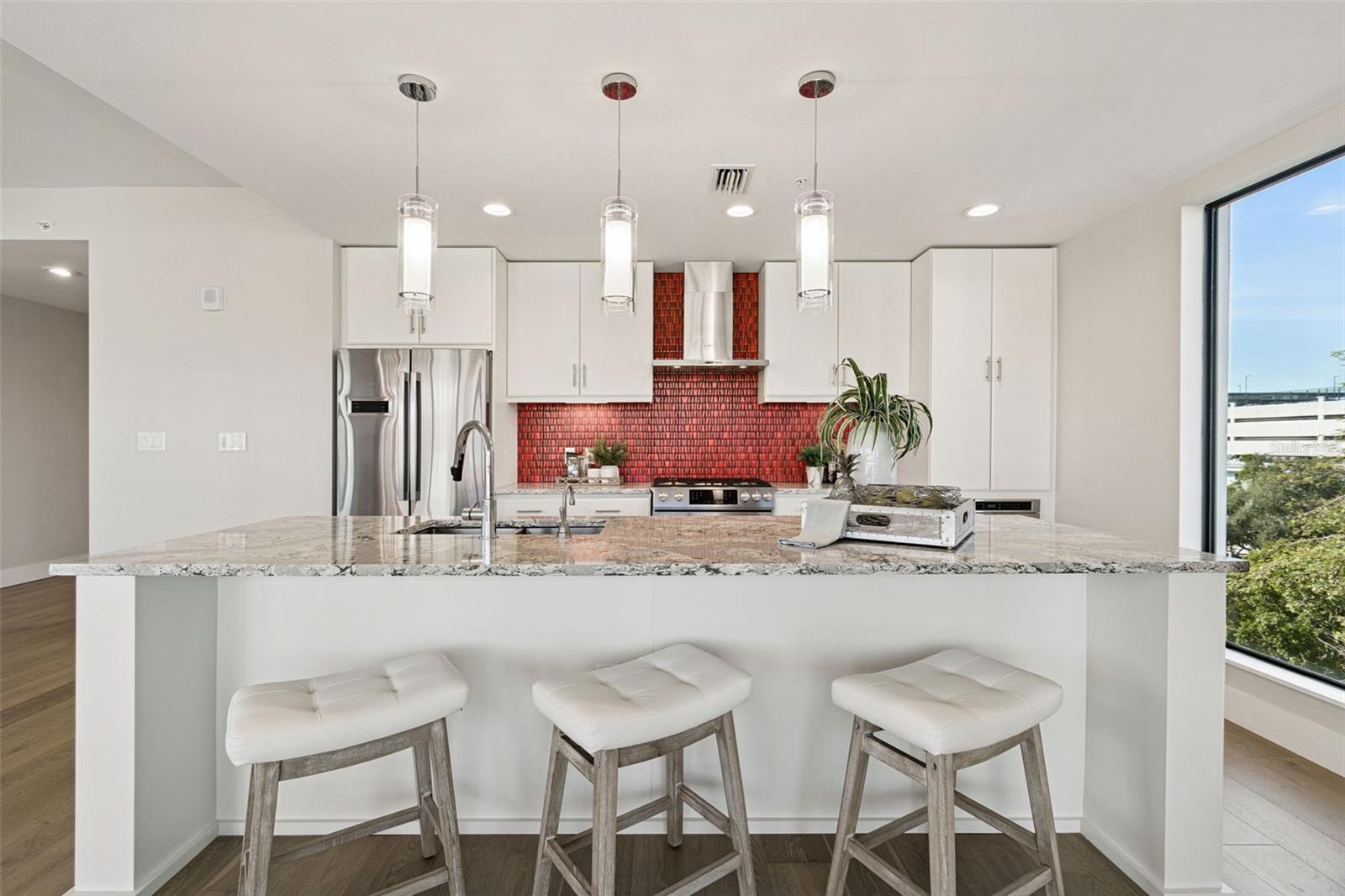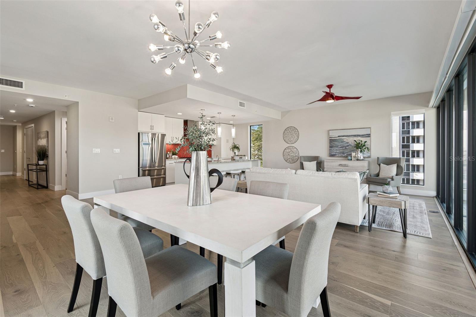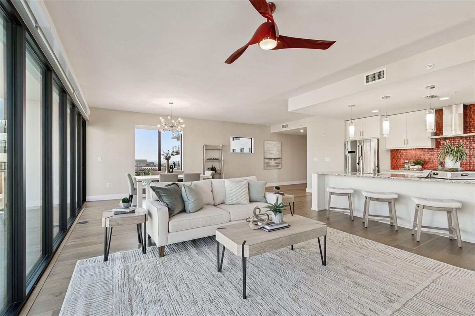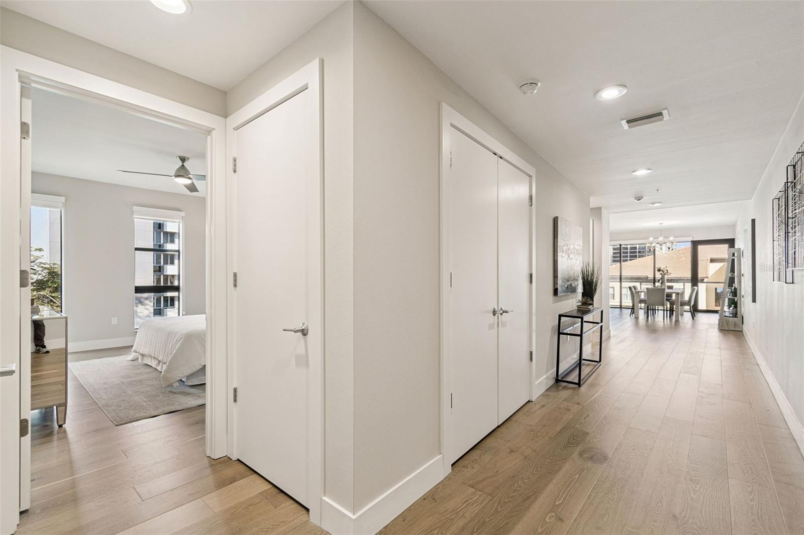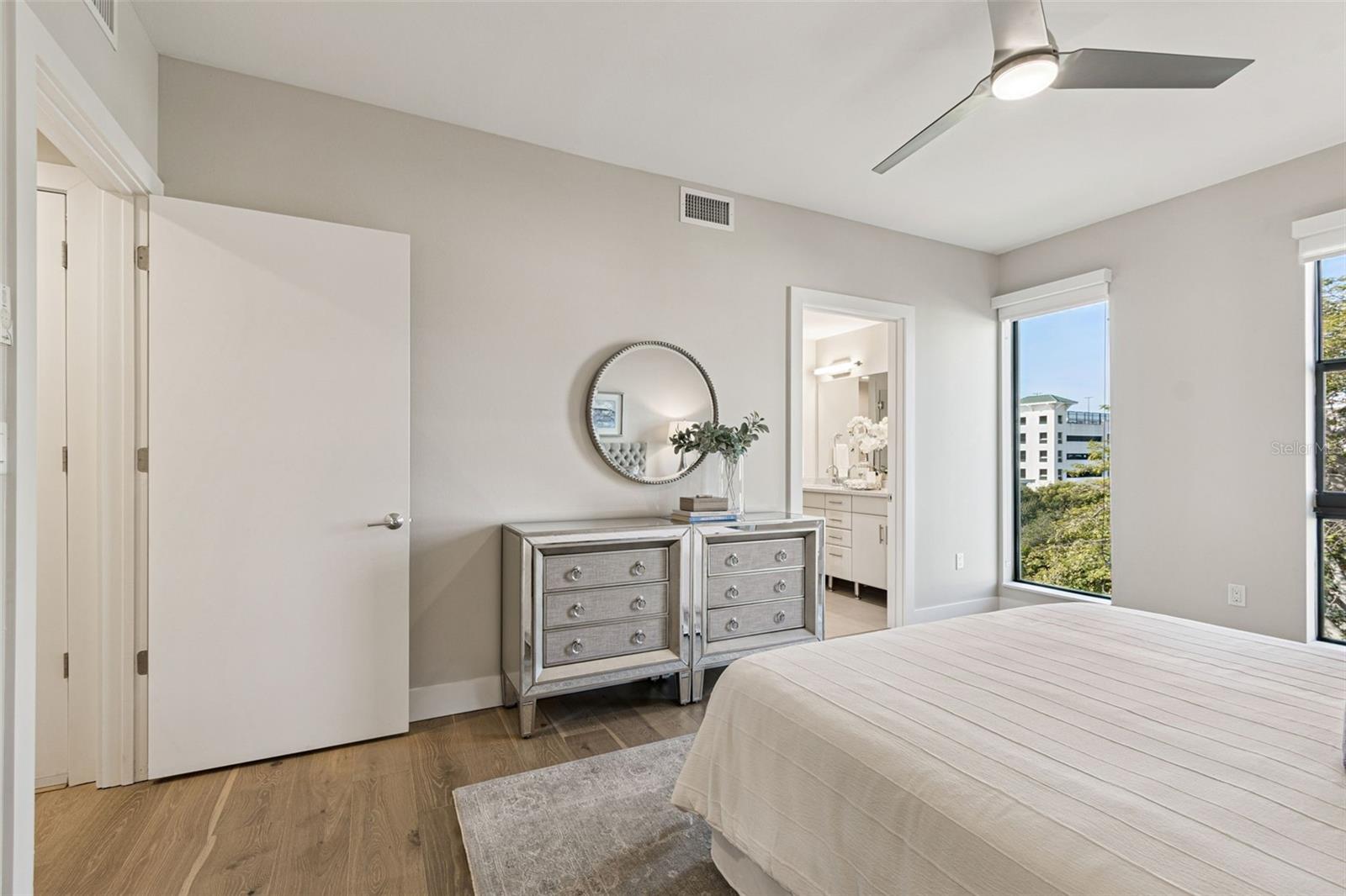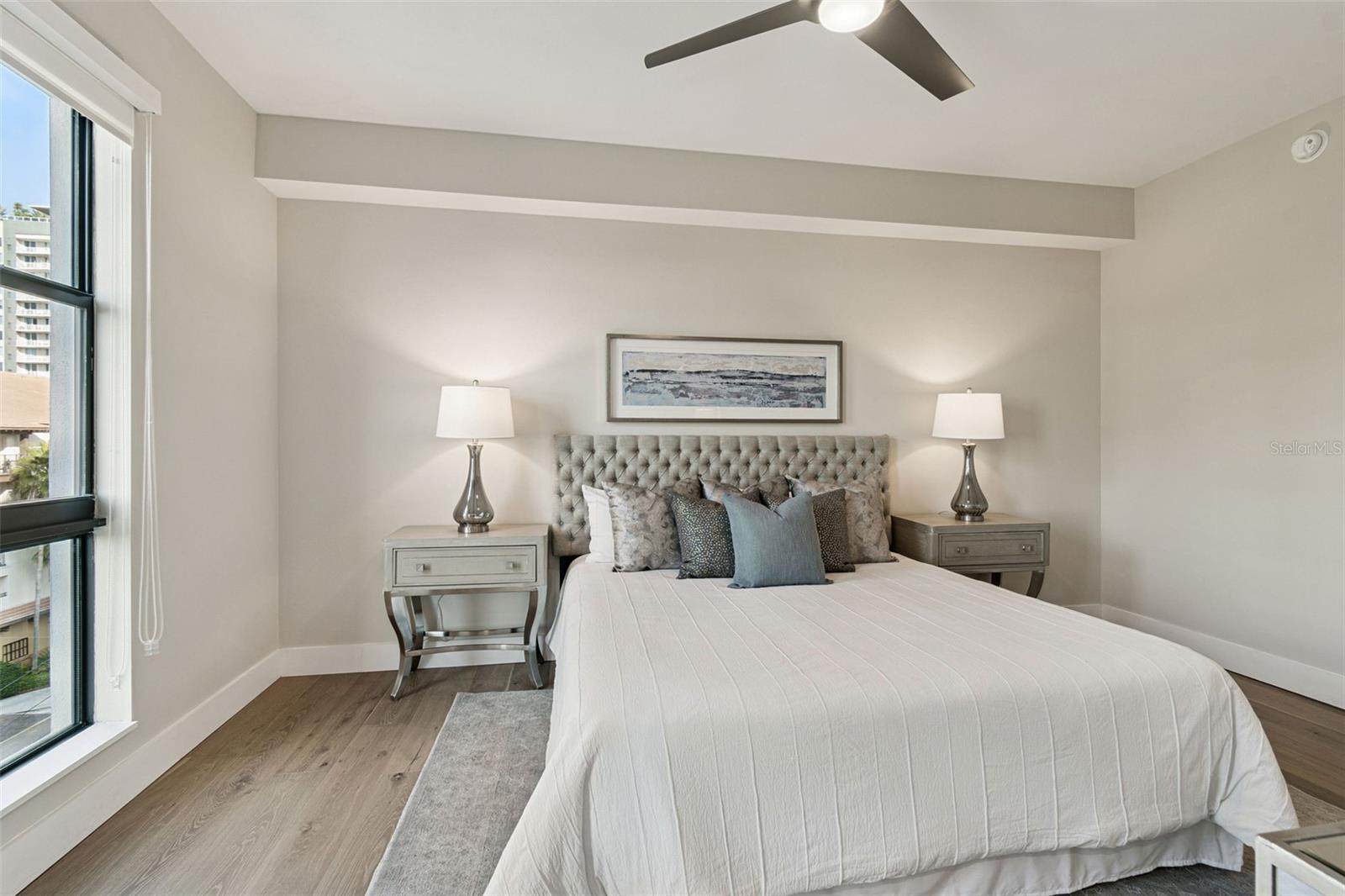 You’ll enjoy panoramic vistas of the city and Tampa Bay from the spacious balcony with room for plenty of seating and no adjacent neighbors. Step inside and you're welcomed by a spacious Gallery Hall—perfect for showcasing art and setting a dramatic tone for what’s ahead. This 1,555-square-foot, 2-bedroom, 2-bath home stands apart with windows on three sides, flooding the open floor plan with natural light and ever-changing views. The living and dining areas are framed by floor-to-ceiling glass and outfitted with motorized blinds for effortless ambiance control. The sleek, contemporary kitchen features upgraded countertops and cabinetry with custom pullouts, a natural gas range, wine cooler, and smart storage throughout. Design details shine here—upgraded dimmers, modern lighting, and stylish ceiling fans add a layer of refinement. The primary suite is a serene retreat with a generous California Closets walk-in and a spa-inspired bath complete with a deep soaking tub, oversized shower, and dual-sink vanity. The second bedroom includes a custom-built queen Murphy bed with integrated desk, making it ideal as a guest room, office, or both. Blackout and shade blinds are installed in both bedrooms for maximum comfort. A dedicated laundry area with custom cabinetry adds convenience, and the included first-floor parking space is a major plus. The Salvador—an exclusive, LEED-certified building of just 74 residences—offers outstanding amenities: pool and spa, state-of-the-art fitness center, social room, grilling area, dog park with wash station, sculpture garden, and outdoor fire pit. Concierge service and on-site management elevate the lifestyle. Set in a peaceful pocket just blocks from downtown, the Dali Museum, Mahaffey Theater, Albert Whitted Airfield, and the Saturday Morning Market, this residence blends privacy, luxury, and location like few others. Schedule your private tour today.