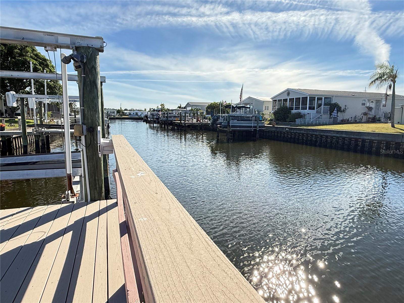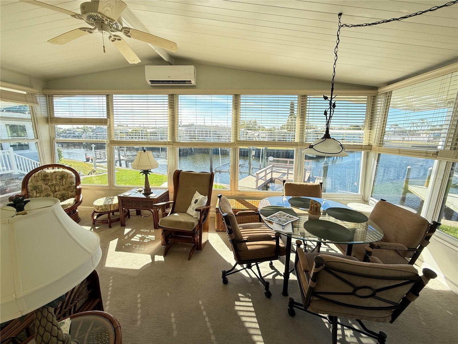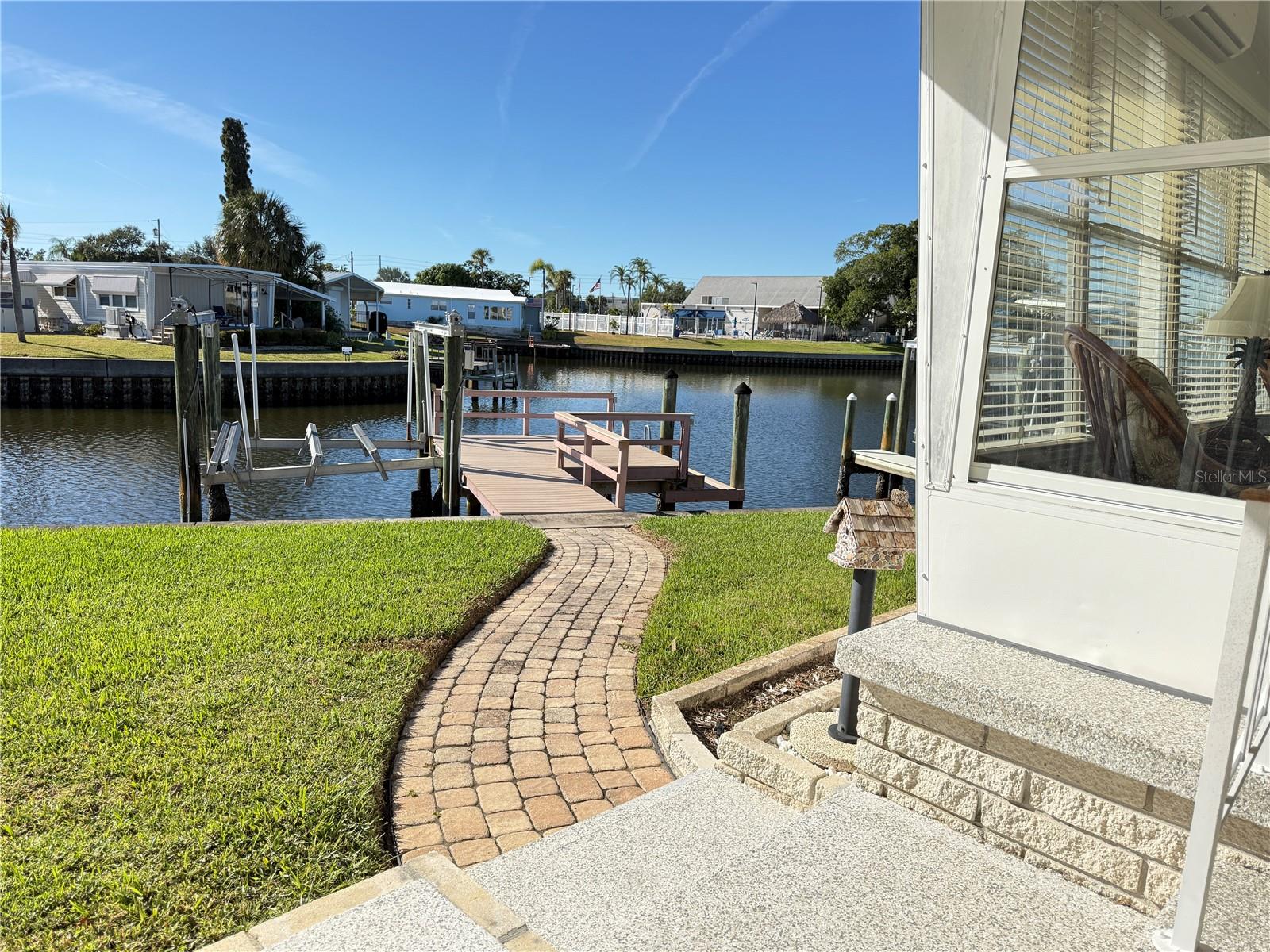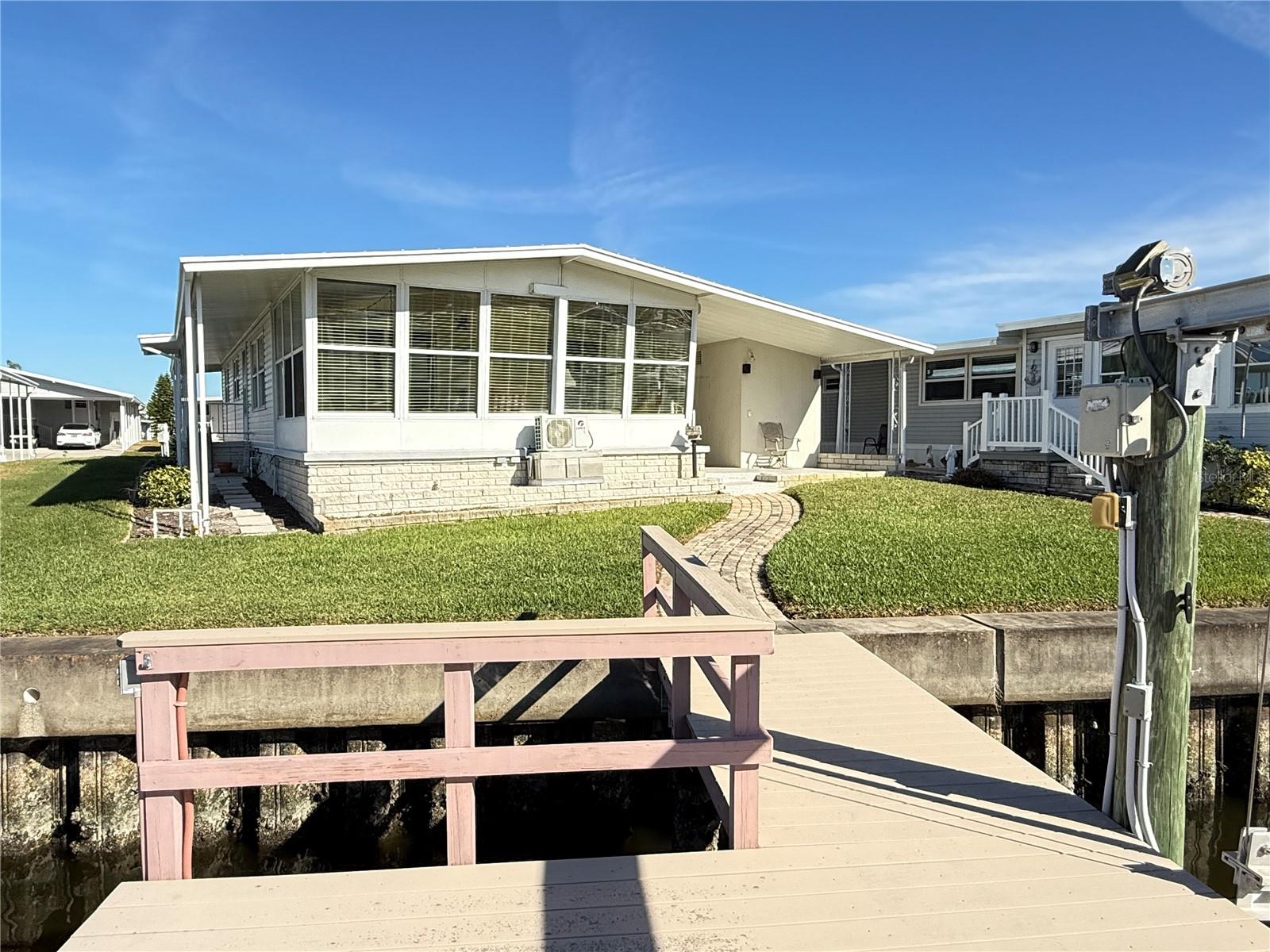 This 2 Bed/2 Bath WATERFRONT home boasts approximately 1232. sq ft of living area. Well maintained with many upgrades. Interior finishes include solid surface countertops in kitchen & baths, stainless steel appliances in the kitchen, double pane windows, ceramic tile in baths, carpet in bedrooms, and laminate in other living areas. Newer stackable washer & dryer located inside. AC (2017), Roof (2004). The carpeted Florida room has wood faux blinds and a mini split air conditioner (2020) providing comfort in any weather. Looking out at the canal the composite dock and lift (2011) are ready for the watercraft of your choice. The covered carport is also a great place to enjoy sitting. The acrylic floor coating adds a pleasant look and feel. Home is located in Americana Cove, a 55+ Resident owned waterfront community. Low HOA $380 includes water, sewer, trash pickup, lawn mowing/edging, 24/7 manned gate, shuffleboard, bocce, fitness room, clubhouse and heated pool. Located just 10 minutes from downtown St Pete, 20 minutes to 2 airports and 25 minutes to the beaches. This is an active communitty with many clubs and activities, perfect for full time or seasonal occupancy.