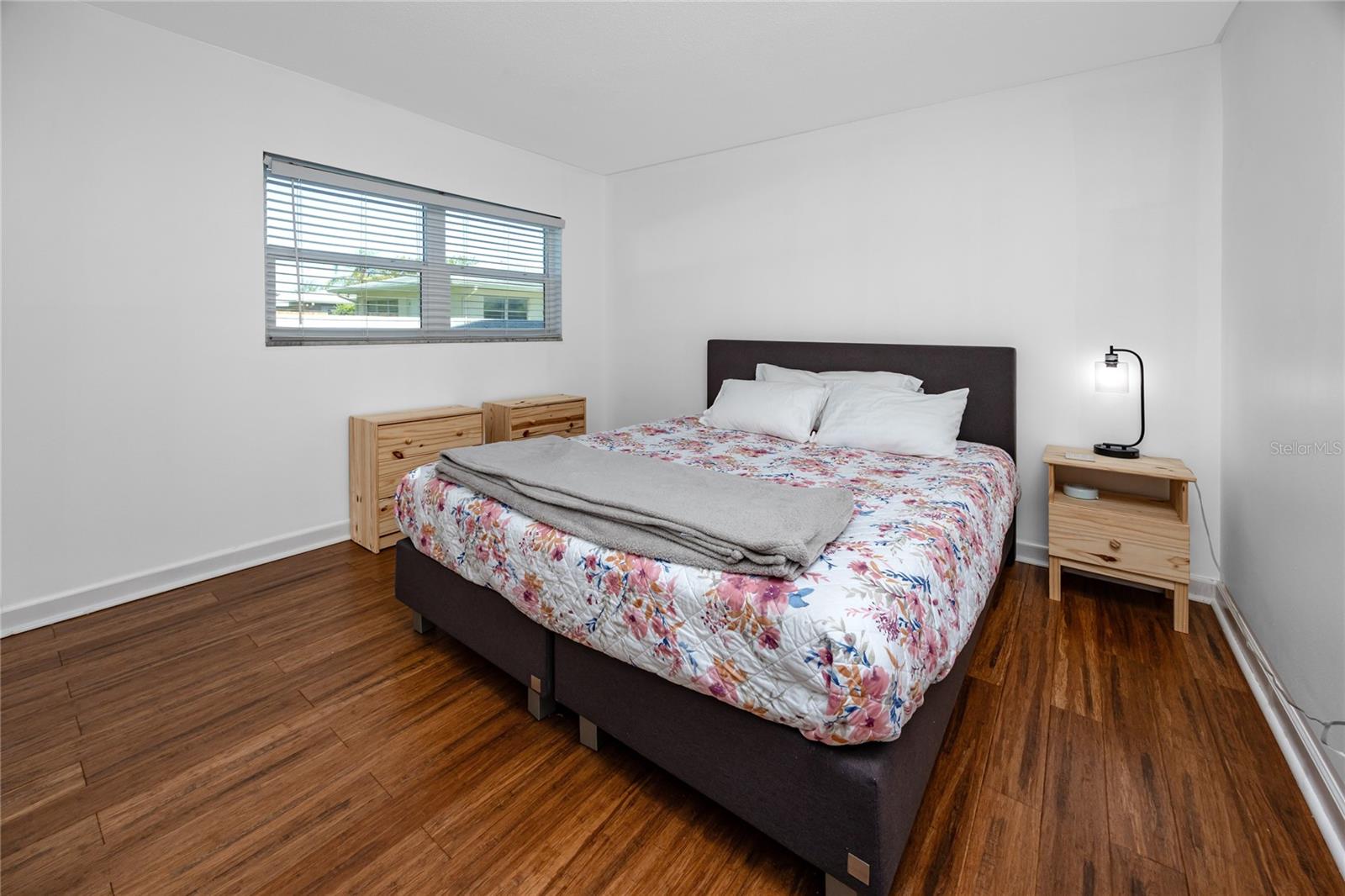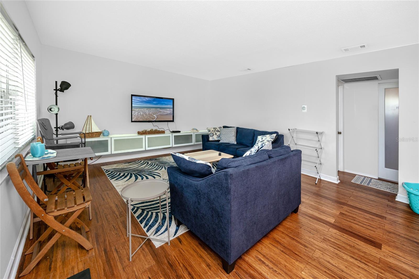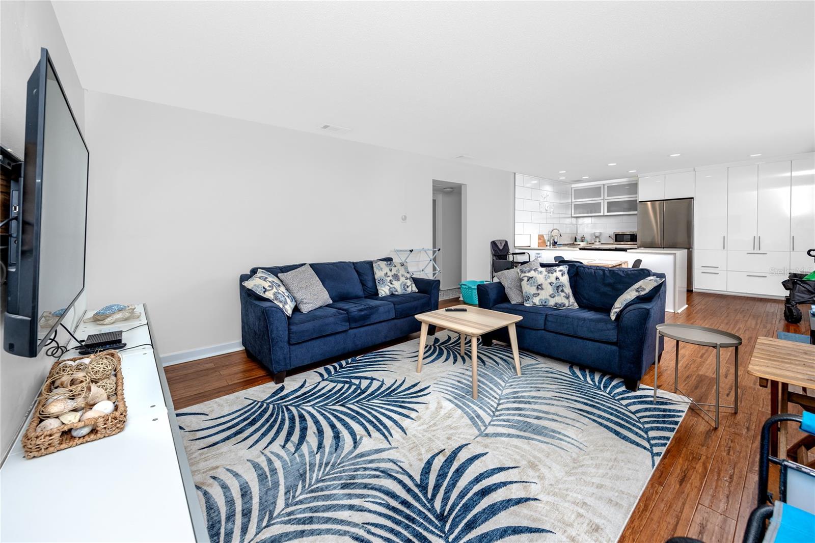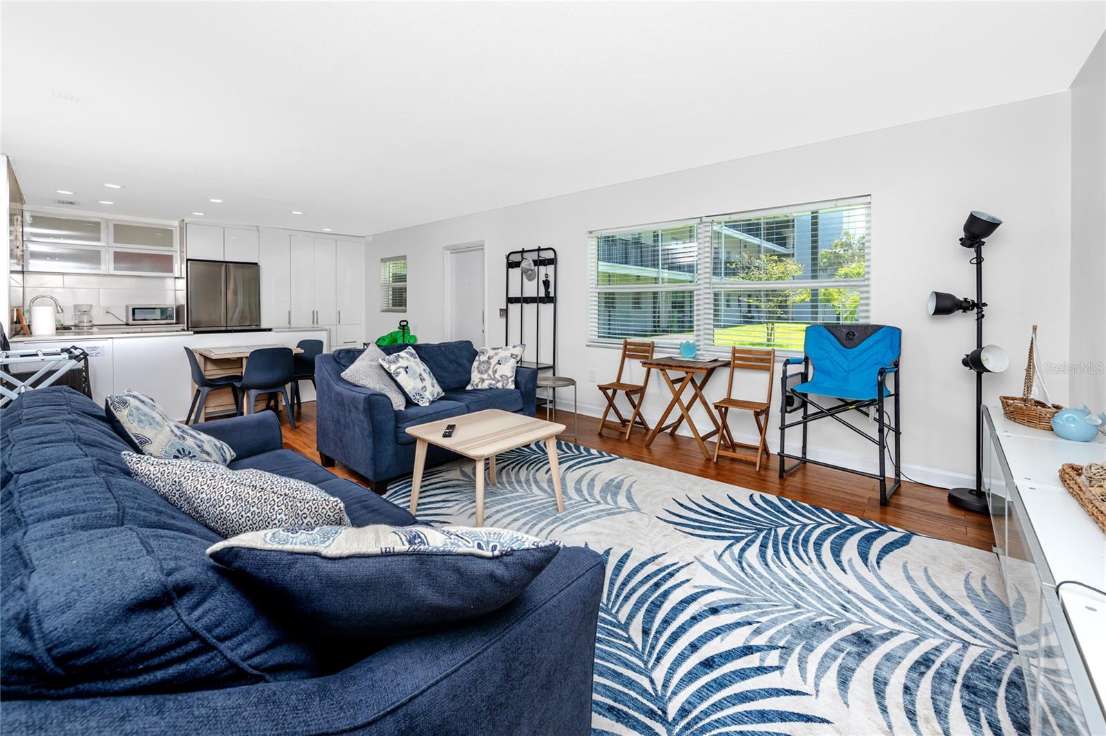 Discover effortless living in this fully renovated, low-maintenance 2-bedroom, 1-bath ground-floor condo in the well-maintained French Quarter community of St. Petersburg. Situated in a quiet rear corner, this spacious unit offers the largest open floor plan in the community, designed for comfort and modern functionality. Bamboo plank flooring flows throughout, complementing an interior updated with hurricane-resistant double-pane windows, HVAC (replaced this summer in August 2025!), and water heater—all under five years old. The contemporary kitchen features quartz waterfall countertops, all-new stainless steel appliances, a deep brushed steel farmhouse sink, and custom IKEA cabinetry with lighted pull-out storage, perfect for everyday living or entertaining. The stylishly remodeled bathroom includes tiled walls, a frosted glass pocket door, an electronic Kohler shower system with rain and handheld settings, and elegant ceiling panels for a modern touch. The open-concept living area is both spacious and functional, with custom wall-mounted consoles that maximize storage while maintaining clean lines. French Quarter offers excellent community amenities including a pool and spa, clubhouse with modern kitchen, shuffleboard courts, two dog-walking stations, three laundry facilities, and monthly pest control. HOA fees cover water, trash, cable/internet, and exterior maintenance for true worry-free living. Conveniently located just minutes from vibrant Downtown St. Pete, residents enjoy easy access to world-class dining, art galleries, entertainment, and the St. Pete Pier. A city bus stop is right outside the gate, and Whole Foods, Starbucks, and two Publix locations are within walking distance. This turnkey condo represents one of the most upgraded, move-in-ready options among St. Petersburg condos for sale.