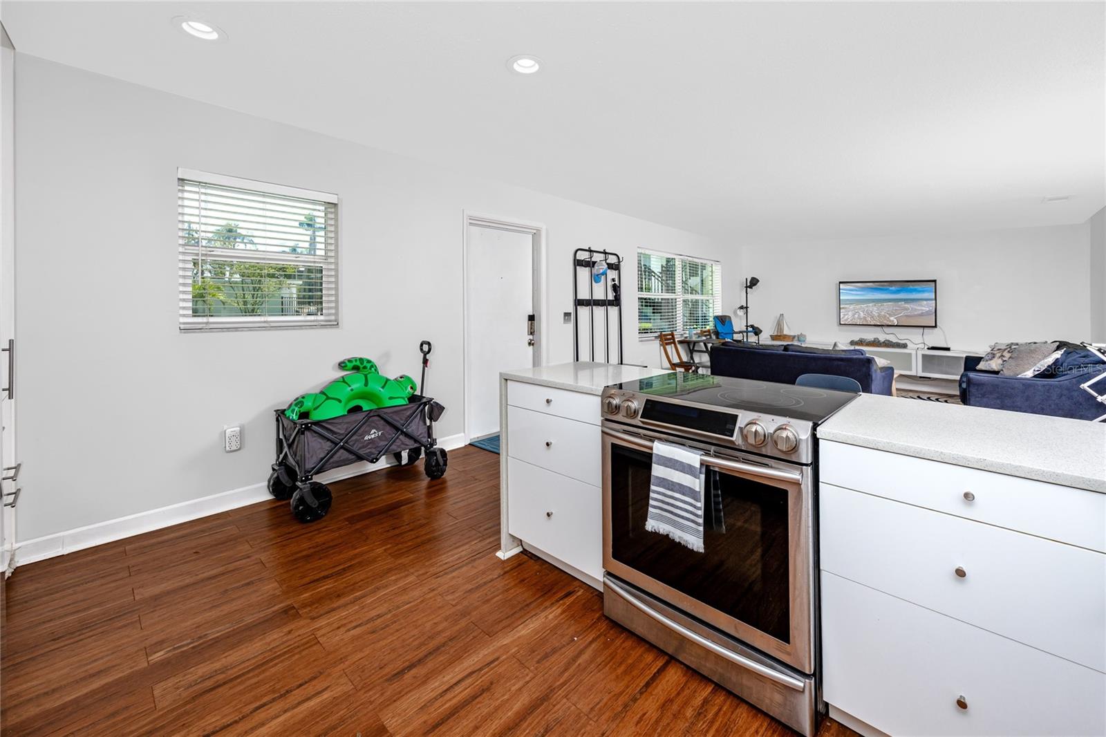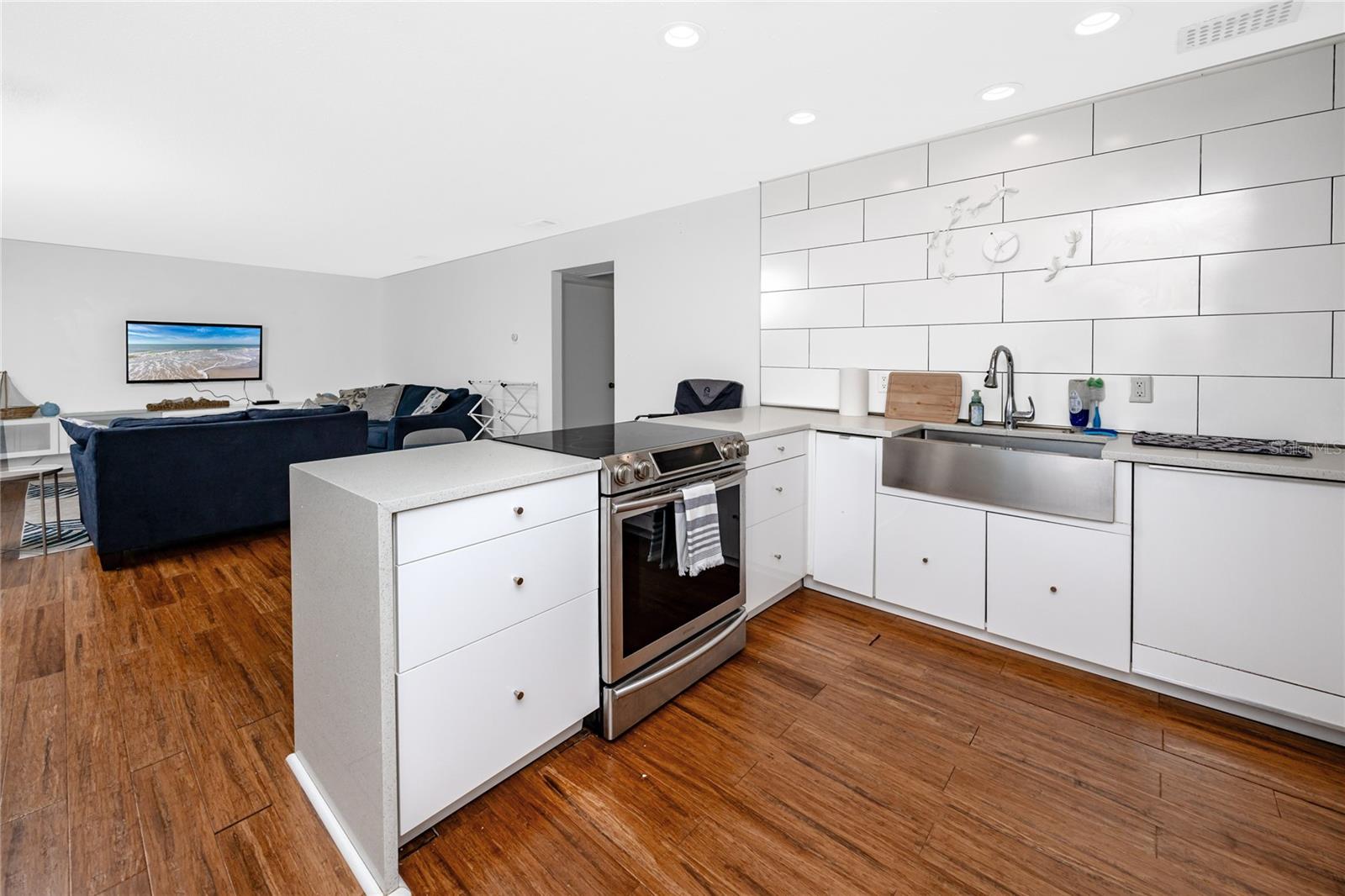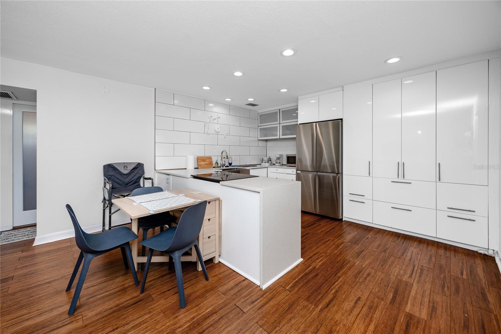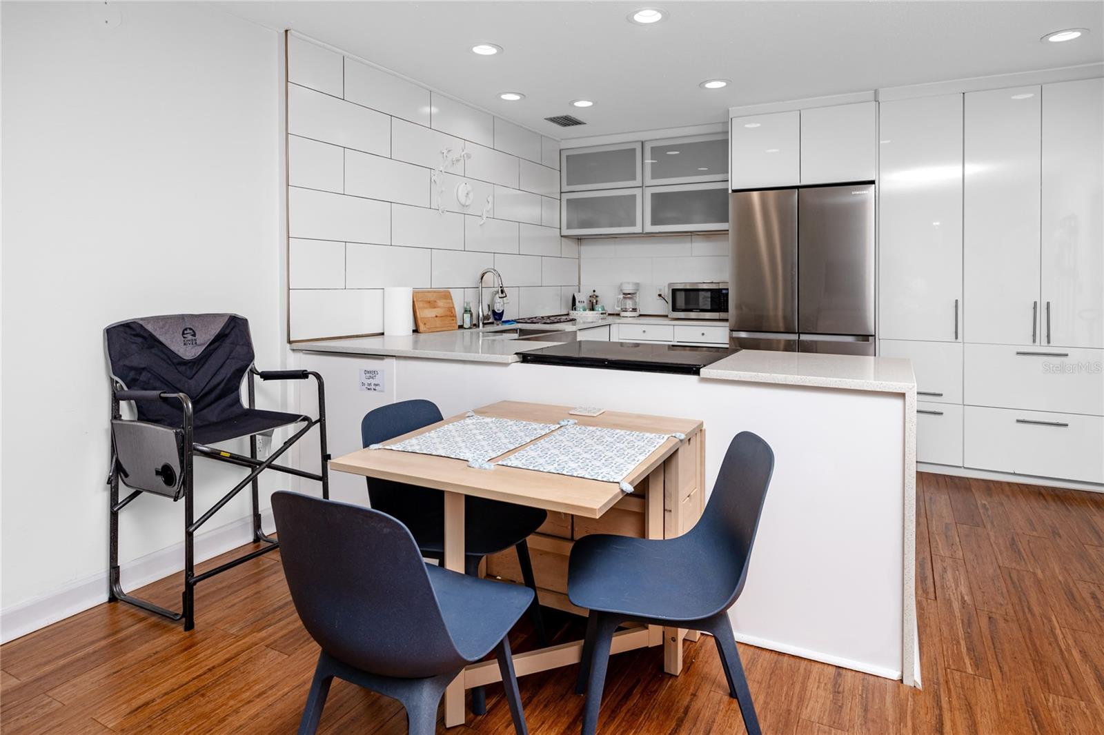 Discover effortless living in this fully renovated, low-maintenance 2-bedroom, 1-bath ground-floor condo in the well-maintained French Quarter community of St. Petersburg. Situated in a quiet rear corner, this spacious unit offers the largest open floor plan in the community, designed for comfort and modern functionality. Bamboo plank flooring flows throughout, complementing an interior updated with hurricane-resistant double-pane windows, HVAC (replaced this summer in August 2025!), and water heater—all under five years old. The contemporary kitchen features quartz waterfall countertops, all-new stainless steel appliances, a deep brushed steel farmhouse sink, and custom IKEA cabinetry with lighted pull-out storage, perfect for everyday living or entertaining. The stylishly remodeled bathroom includes tiled walls, a frosted glass pocket door, an electronic Kohler shower system with rain and handheld settings, and elegant ceiling panels for a modern touch. The open-concept living area is both spacious and functional, with custom wall-mounted consoles that maximize storage while maintaining clean lines. French Quarter offers excellent community amenities including a pool and spa, clubhouse with modern kitchen, shuffleboard courts, two dog-walking stations, three laundry facilities, and monthly pest control. HOA fees cover water, trash, cable/internet, and exterior maintenance for true worry-free living. Conveniently located just minutes from vibrant Downtown St. Pete, residents enjoy easy access to world-class dining, art galleries, entertainment, and the St. Pete Pier. A city bus stop is right outside the gate, and Whole Foods, Starbucks, and two Publix locations are within walking distance. This turnkey condo represents one of the most upgraded, move-in-ready options among St. Petersburg condos for sale.