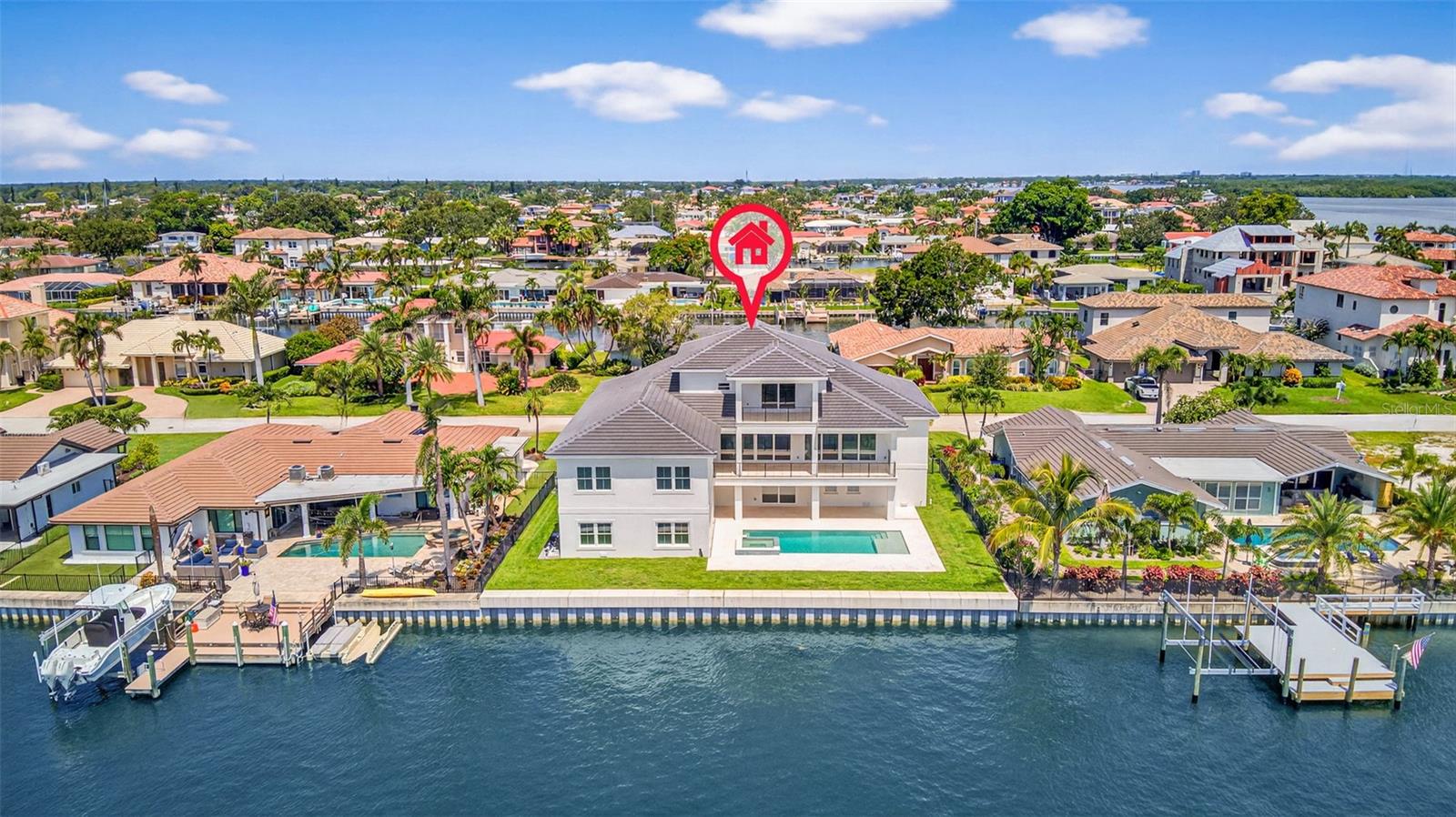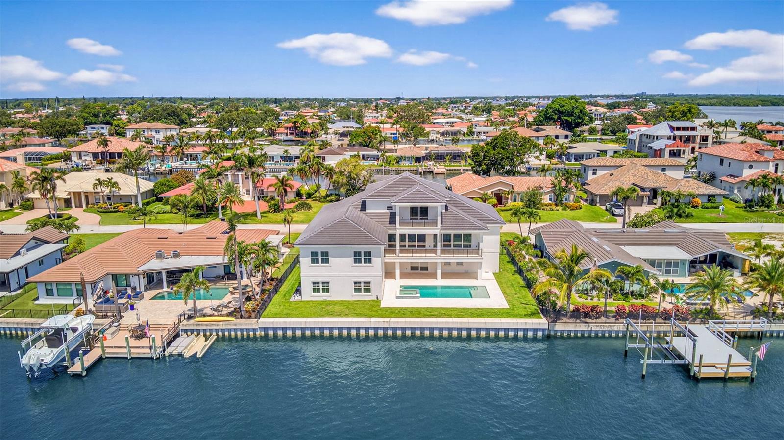 One or more photo(s) has been virtually staged. A dream opportunity can become your reality. Newly constructed custom home completed in 2025 extends an elevated experience to waterfront living. 4,317 under-roof living square footage encompassing 5 large bedrooms plus an office, 4.5 bathrooms, 8-car garage, and breezy balcony with views of Downtown Tampa. The moment you enter through the front door, you will be captivated by this coastal masterpiece with 10-foot ceilings, an abundance of natural lighting, beamed ceilings, and a kick back, relax, and stay awhile vibe. The custom design with front and rear French doors allows you to open the house up for a phenomenal crossbreeze or when entertaining and utilizing the indoor/outdoor living. The kitchen features a large island with a large prep sink, bar seating, a beverage station, a gas range, and overlooks the spacious living room with access to a large balcony overlooking the pool and spa area. Enjoy formal meals in the dining space with convenient access to the butler's pantry, which can be closed off and out of sight but contains storage, a second full-size dishwasher, and space for a large wine or full-size second refrigerator. The split floor plan extends 3 bedrooms and 2 bathrooms on one side of the house. Guest powder bathroom, private office, and a Jr primary suite are also on the main level. Jr primary suite overlooks the water and pool with balcony access. En-suite large bathroom with walk-in shower and walk-in closet. The second-level living is designed to work as needed. This space extends to a spectacular primary bedroom with a reading nook, breakfast/coffee bar, and an impressive en-suite bathroom. The second-level balcony is the perfect place to relax, enjoy an evening breeze, or watch the sunrise in the morning. Year-round fish in your backyard, and watch the dolphins or manatees play. Brand new beautiful pool with spa, substantial new raised seawall, and green space for kids or pets. The property can accommodate a very large deep vessel or dock. Canal offers protection and unobstructed direct access to Tampa Bay. Conveniently located with proximity to top-rated schools, shopping, and one mile from the upscale neighborhood market. Kayak or paddleboard from your backyard to Weedon Island Preserve. Access Downtown St Petersburg by boat, golf cart, or even a bike ride, only 4 miles away. 25 quick minutes to our world-famous Beaches, 2 major international airports, and Albert Whitted private airport. Venetian Isles is an exceptional deed-restricted neighborhood with an optional HOA.