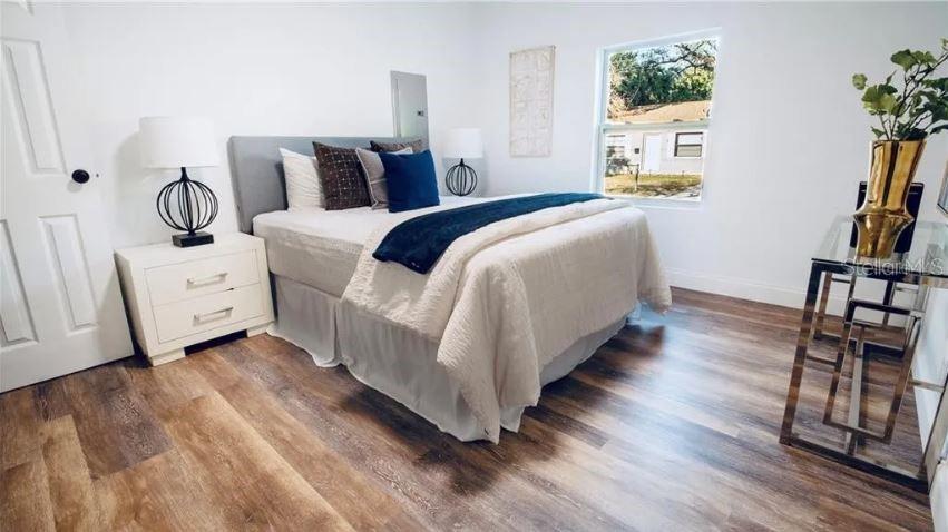 Captivating Gulfport Single-Family – Newly Updated with Outstanding Features This captivating single-family home, combines charm with modern upgrades just minutes from Gulfport Pier, Downtown St. Pete, and an array of shops, dining, and entertainment. Compact in size, 555 sq. ft. yet rich with outstanding features, this residence offers curb appeal, thoughtful renovations, and the peace of mind of being outside a flood zone—no flood insurance required! Inside, the light-filled great room opens to a cheerful kitchen with wood cabinets with crown molding, Quartz countertops, tile backsplash, and Samsung stainless steel appliances, including a French door refrigerator, microwave, and range. A window over the sink frames the view of the private backyard. The cozy bedroom includes a standard closet, while the updated bath is highlighted by a barn-door entry, tiled tub/shower combo, and vanity. A separate laundry room with washer and dryer adds convenience. Outdoors, enjoy a welcoming front porch, a parking pad perfect for a boat or firepit setup, and a fenced backyard with patio space for entertaining. With impact windows (2021), a newer A/C (2020), updated electric, plumbing, and sewer line, this home delivers both style and reliability. Whether you’re seeking a Gulfport retreat or a cozy year-round residence, this property is a rare find with exceptional features in an unbeatable location.