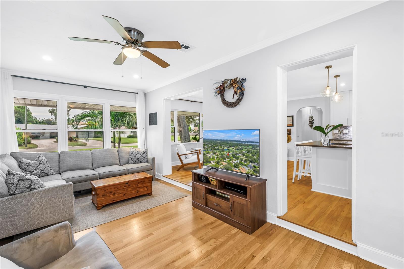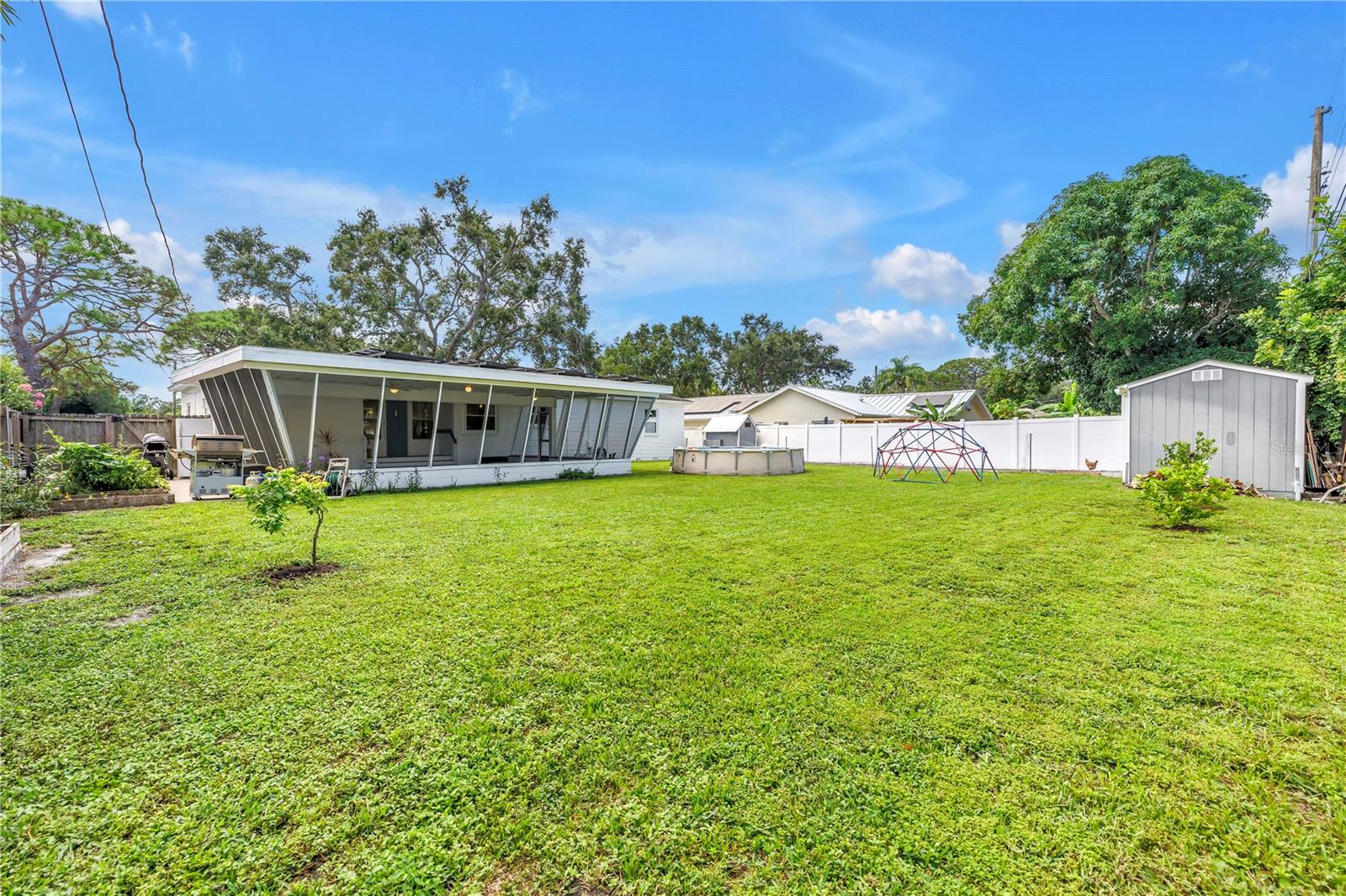Welcome to this beautifully renovated 4-bedroom, 2-bath home featuring a thoughtful split floor plan on a large 1/4 acre lot in Lakewood Estates. Enjoy the seamless flow of the open living areas, highlighted by modern finishes, updated kitchen and abundant natural light. Master suite features a new en-suite bathroom and walk in closet. Three more bedrooms and hall bathroom all feature smart storage and wood floors. Step outside onto the large cantilevered screened porch — an ideal spot to relax and entertain while enjoying the fresh air in any weather. The expansive backyard is a true outdoor rarity - a flourishing garden space ready for your green thumb, large storage shed, and a charming chicken coop, plus even more yard to make your own! Located high and dry out of the flood zones, it is also eco-friendly with solar panels for super low electric bills year round, and pre-wired for generator hookup. Located around the corner from the St. Petersburg Country Club, and just minutes to I-275, downtown St Pete, and the Gulf Beaches. This home blends comfort, style, and practicality, making it a perfect retreat for modern living.