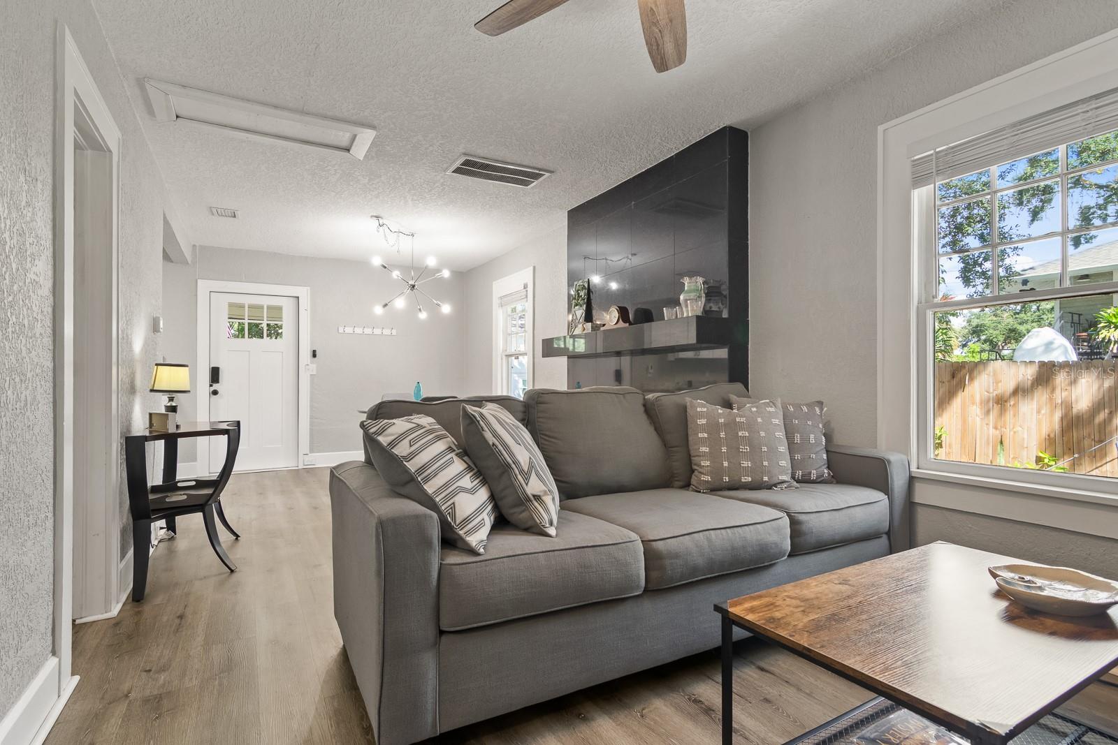 Discover a rare opportunity in the heart of Palmetto Park, a neighborhood known for its artistic spirit, strong sense of community, and easy access to St. Petersburg’s vibrant cultural scene. This 6,355 sq ft corner lot features a charming 1920 Craftsman bungalow paired with a prime buildable space, offering the perfect balance of history and potential. The meticulously maintained 1-bedroom, 1-bath bungalow blends original charm with thoughtful modern updates. Step inside to find a newly renovated kitchen with shaker-style cabinets, granite countertops, stainless steel appliances, and sleek black hardware for a contemporary touch. Gray luxury vinyl plank flooring runs throughout, complemented by light, wood-look ceramic tile in the bathroom. The remodeled bath showcases fresh white tile surrounding the standing shower, while the enclosed back porch creates a versatile mudroom and laundry space with a new stackable washer/dryer. Additional highlights include a striking fireplace redesigned with dramatic black granite to the ceiling, a true statement piece and conversation starter. The home also retains classic Craftsman details like built-ins, original window casings, and a welcoming front porch, marrying timeless character with a modern vibe. Recent upgrades such as a new roof (2022) and water heater (2022) provide peace of mind. Positioned on the northern end of the lot, the bungalow leaves the southern corner open for a future new-construction residence. The existing home could then serve as an Accessory Dwelling Unit (ADU), ideal as a guest suite, private office, or income-producing rental. Alley access, the option to build a garage, and abundant off-street parking add flexibility and convenience. Palmetto Park offers a unique lifestyle with its community garden, local parks, and blend of historic homes and new development. Just blocks from the Grand Central and Warehouse Arts districts, and minutes from Downtown St. Pete, residents enjoy walkable access to dining, shopping, and cultural attractions, plus quick connections to I-275, Tampa, and the beaches. Whether you’re a historic-home enthusiast, an investor seeking rental income, or a buyer ready to create a custom residence while keeping a piece of neighborhood history intact, this property is an opportunity not to be missed.