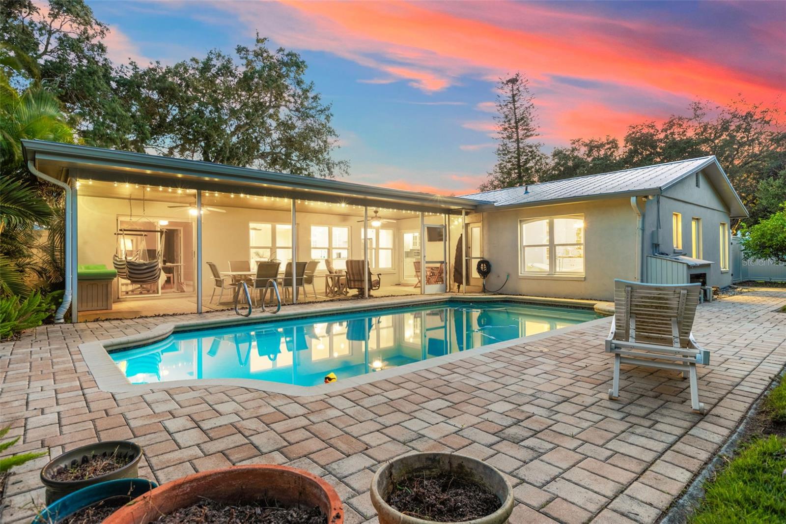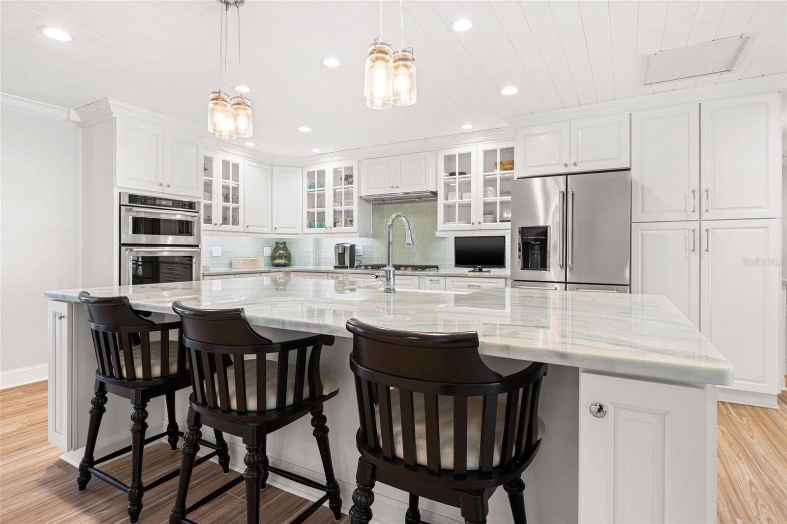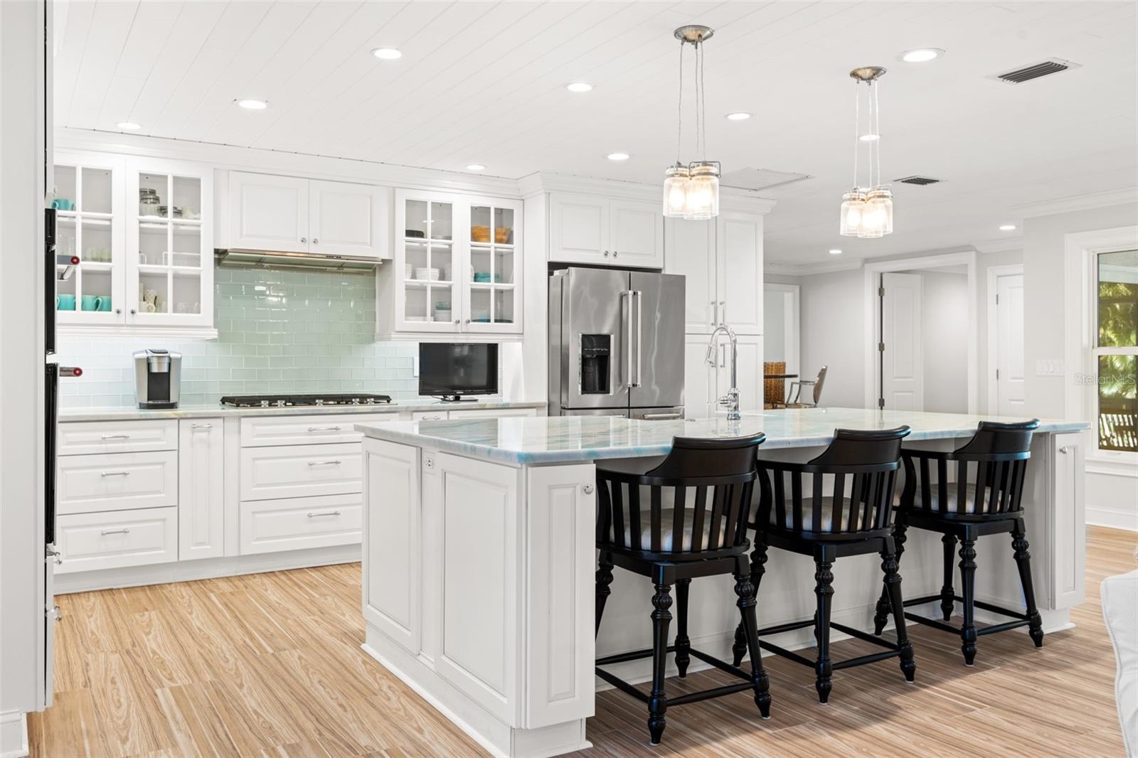 Broadwater is booming, and this custom-upgraded pool home puts you at the heart of one of St. Petersburg’s most exciting neighborhoods for growth, convenience, and coastal living. No stone was left unturned in this thoughtful, top-to-bottom remodel. Set on an oversized corner lot, this block-construction 2 bedroom, 2.5 bath ranch-style POOL home lives large with an open concept layout where the living room and chef’s kitchen flow seamlessly together. Walls of oversized, impact windows frame the tropical backyard oasis and bathe the interiors in natural light. The entertainer’s kitchen features custom wood cabinetry with oversized soft-close and spice drawers, a dramatic 10x5 island with farmhouse sink, dishwasher and extra storage/seating, striking quartzite countertops, and premium KitchenAid appliances—including a 36" 6-burner gas range, 5-door refrigerator, combo wall oven/microwave, plus a wine fridge and ice maker in the butler’s pantry. Porcelain tile flooring carries throughout. The split plan offers two spacious bedrooms, each with an ensuite bath, plus a convenient half bath that opens to the screened lanai for easy pool access. The serene primary suite provides a custom walk-in closet, sitting area, and a spa-worthy bath with dual vanities with quartzite countertops, a marble walk-in shower boasting four niches, and a Victoria + Albert Marlborough double-ended slipper tub overlooking the lush landscape including 30+ Eureka palms—designed for everyday resort living. Enjoy glimpses of Boca Ciega Bay from the dining area and the primary suite and prepare for sunsets that will take your breath away. Arrive through the garage to a charming laundry/mudroom with a custom farmhouse sink. Outdoors, Florida living shines: a large screened porch (accessed by a sliding pocket door) overlooks the sparkling pool and fully fenced, private backyard, complete with a Meyer lemon tree. Notable upgrades include a 2017 metal roof, a Trane 3.5-ton HVAC with transferable 10-year warranty (installed 2021), updated plumbing and electrical, water softener, tongue-and-groove pine ceiling accents, Moen fixtures, crown moulding with upgraded trim/baseboards, solid wood interior/exterior doors, a security-minded front door with triple deadbolt and insulated sidelights, designer lighting, extensive LED recessed and under-cabinet lighting, refreshed exterior stucco, gutters with guards and soffits, pool equipment updates, newer toilets, exterior security cameras and motion lighting, added insulation, new ceiling fans, and a wide driveway with extra guest and boat/RV parking. All of this in a superb location a few blocks to the multi-million-dollar Maximo Marina, close to waterfront dining, and just minutes to St. Pete Beach and vibrant Downtown St. Petersburg, with quick I-275 access for easy commutes and airport runs. Come experience Broadwater’s best—schedule your private tour and make this stunning residence your new place to call home.