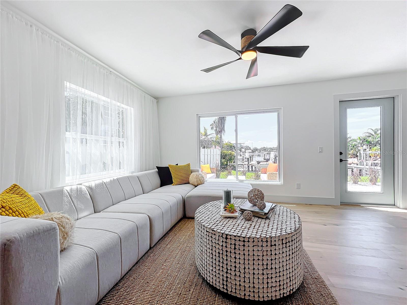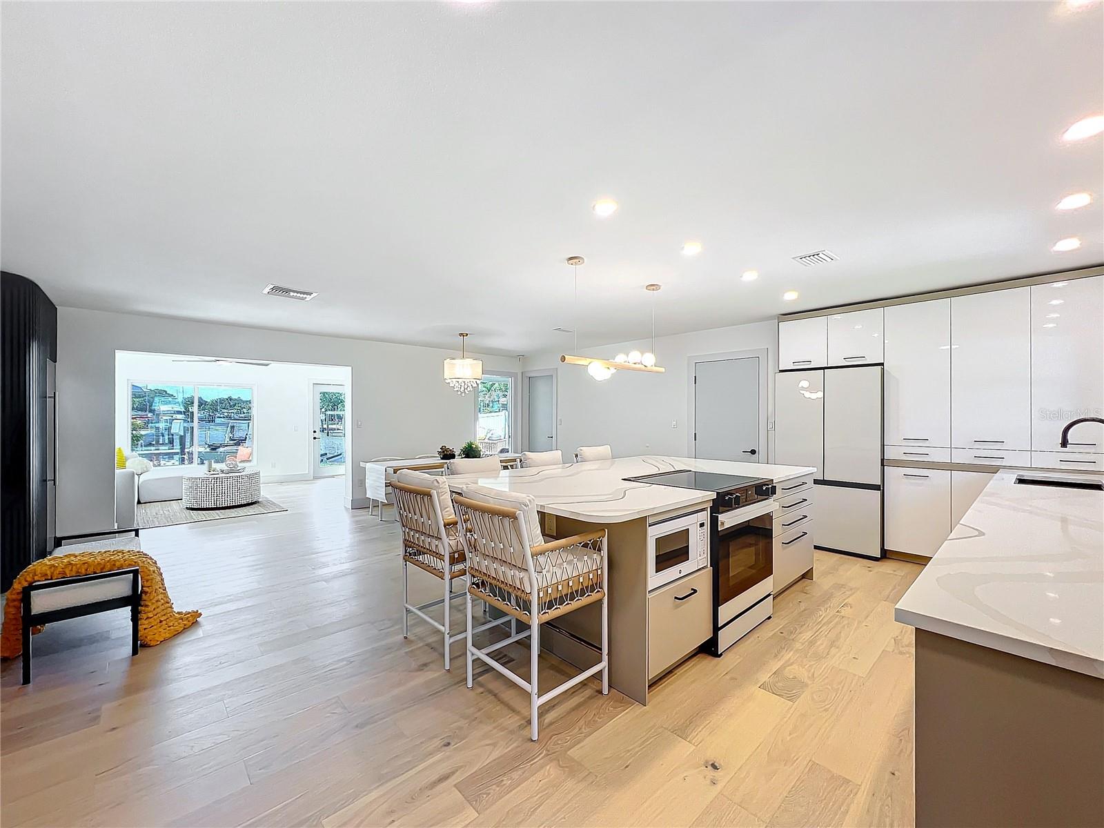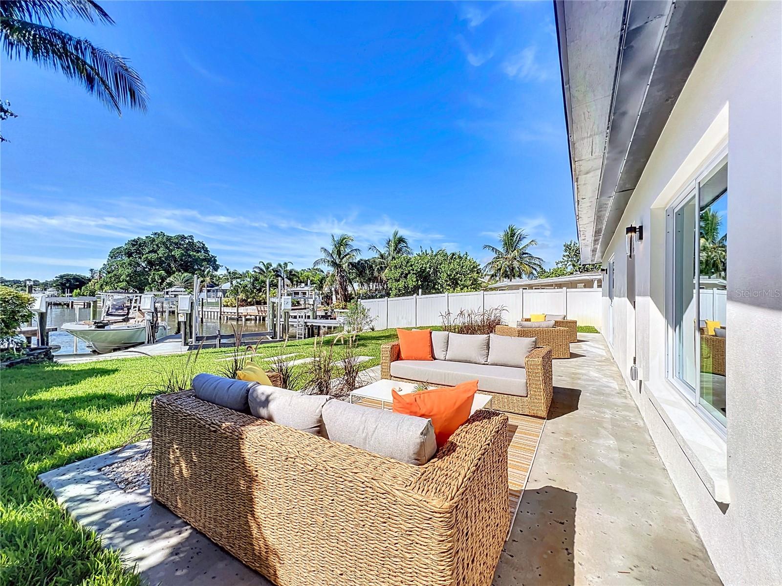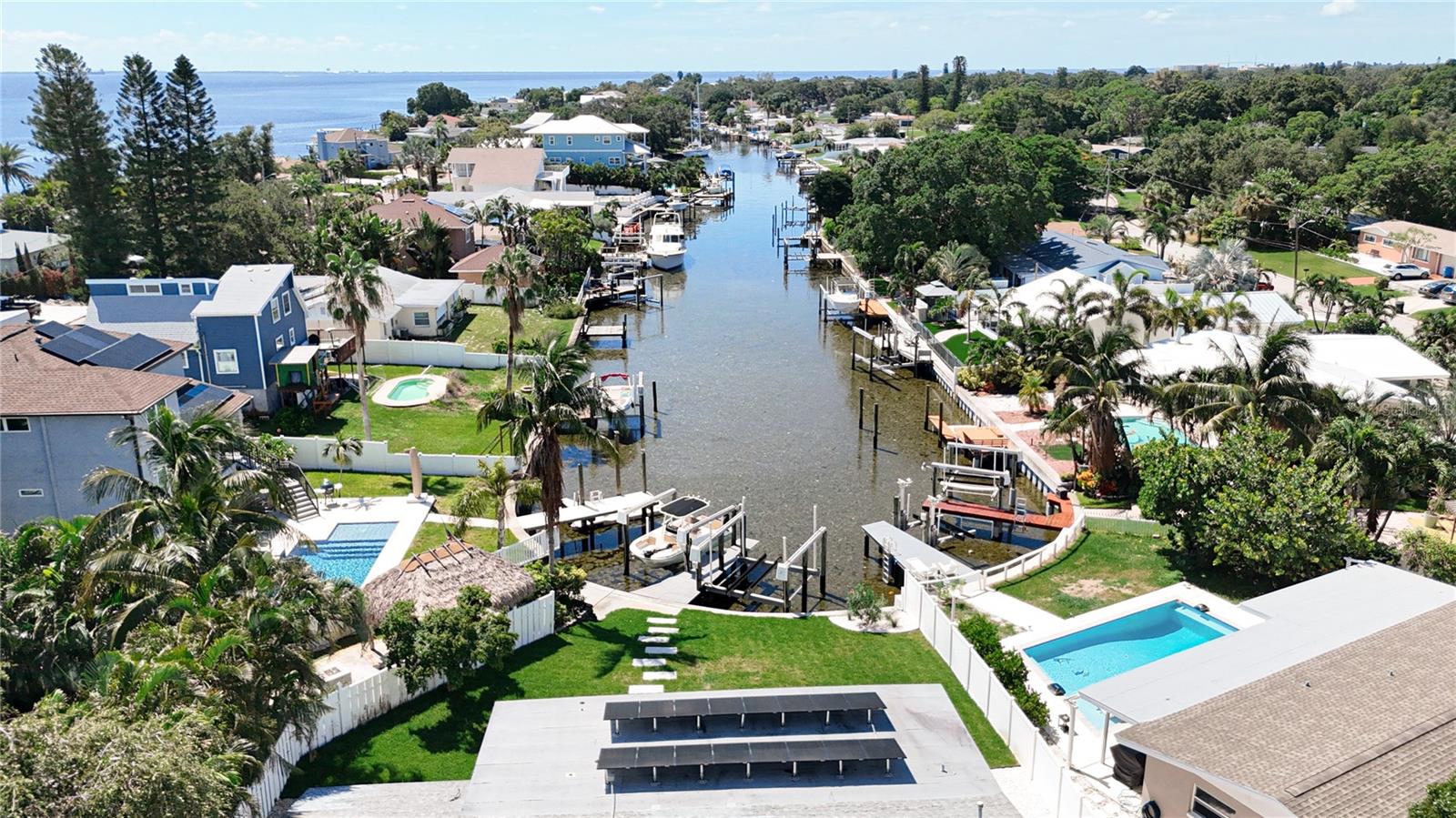 Priced under recent appraised value with no history of flooding, welcome to this one of a kind beachy-modern waterfront oasis! With custom finishes galore, superb quality and details to please even the most discerning eye, this meticulously renovated and fully permitted 3 bedroom 2 bathroom split floor plan home is both stylish and functional with the aura of high class fashion that Modernizing Florida has become known for. It feels bright, airy, crisp and has just the right amount of open concept while reserving partial privacy for the spacious living room. The glamorous European designed custom kitchen features Calacatta Gold Quartz countertops, lacquer finish soft-close cabinets, small appliance cabinets with built-in outlets, Kraus granite deep bowl sink with pull-out faucet, Kitchen-Aid 3-rack fully integrated dishwasher, Samsung Bespoke Smart refrigerator with filtered ice and water dispenser and a vast island with Samsung Bespoke Smart range and built-in GE microwave. The open kitchen and dining space share their grandeur with a custom designed entertainment wall that features a 170 bottle, dual zone wine fridge, an articulating TV mount, a LED steam fireplace, a book shelf and two hidden cabinets. The warmth of the waterproof engineered hardwood oak floor will lead you to some of the other amazing elements of the home such as the custom relief wall in the primary bedroom, the chic bathrooms, or outside to the expansive patio with built-in planters that overlooks the beautiful water view and the lushly landscaped backyard that is big enough to add a pool. Indoor laundry room, new plumbing to the meter and waste lines inspected, new electric, new HVAC and ductwork with smart thermostat, new insulation, new reclaimed irrigation system, 2012 roof in great condition with roof certification, fully paid solar panels, 16,000 lbs boat lift, Rheem Hybrid Smart 50 gallon water heater with heat pump, automatic garage door opener, ceiling fans with remotes in bedrooms and living room. Walking distance to the Coquina Key Community Park which offers a jogging trail, dog park, pickle ball, tennis, soccer fields, and a playground; just minutes to downtown St Pete by land or sea, while still a short drive to beaches, airports, Tampa & Clearwater.
