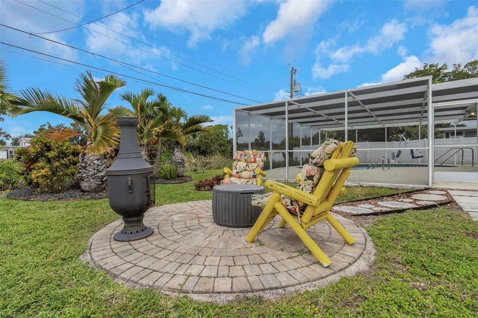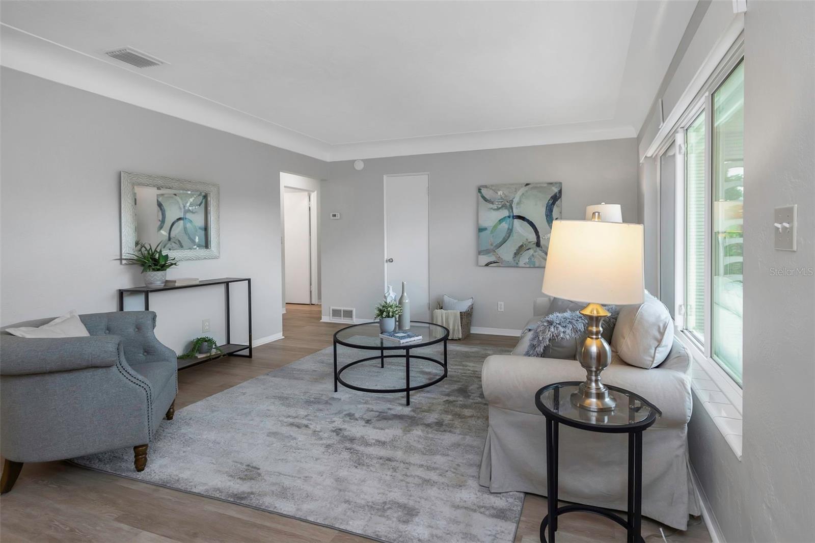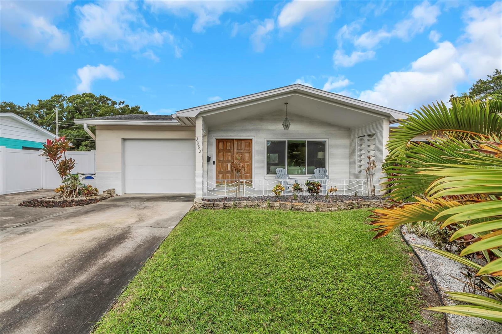 Located in West St. Petersburg in a quiet, established neighborhood, this handsome masonry home offers classic Florida charm and serene lake views. The curb appeal shines with mature landscaping, a welcoming front porch, and a well-maintained lot. Inside, new vinyl plank flooring flows throughout most of the home, which features two bedrooms, two baths, a spacious living and dining area, and a comfortable family room. From the family room, step out to a relaxing covered lanai with a birdcage enclosure, a heated in-ground pool, and a peaceful lake backdrop. The beautifully landscaped yard continues along the sides and rear of the property, complete with a paved fire pit area—perfect for entertaining. Additional highlights include an attached one-car garage, large driveway, indoor laundry room, impact windows, irrigation system, and handicap-accessible pool equipment. Freshly painted and move-in ready, this home is equally ideal for immediate enjoyment or for updating to make it your own.