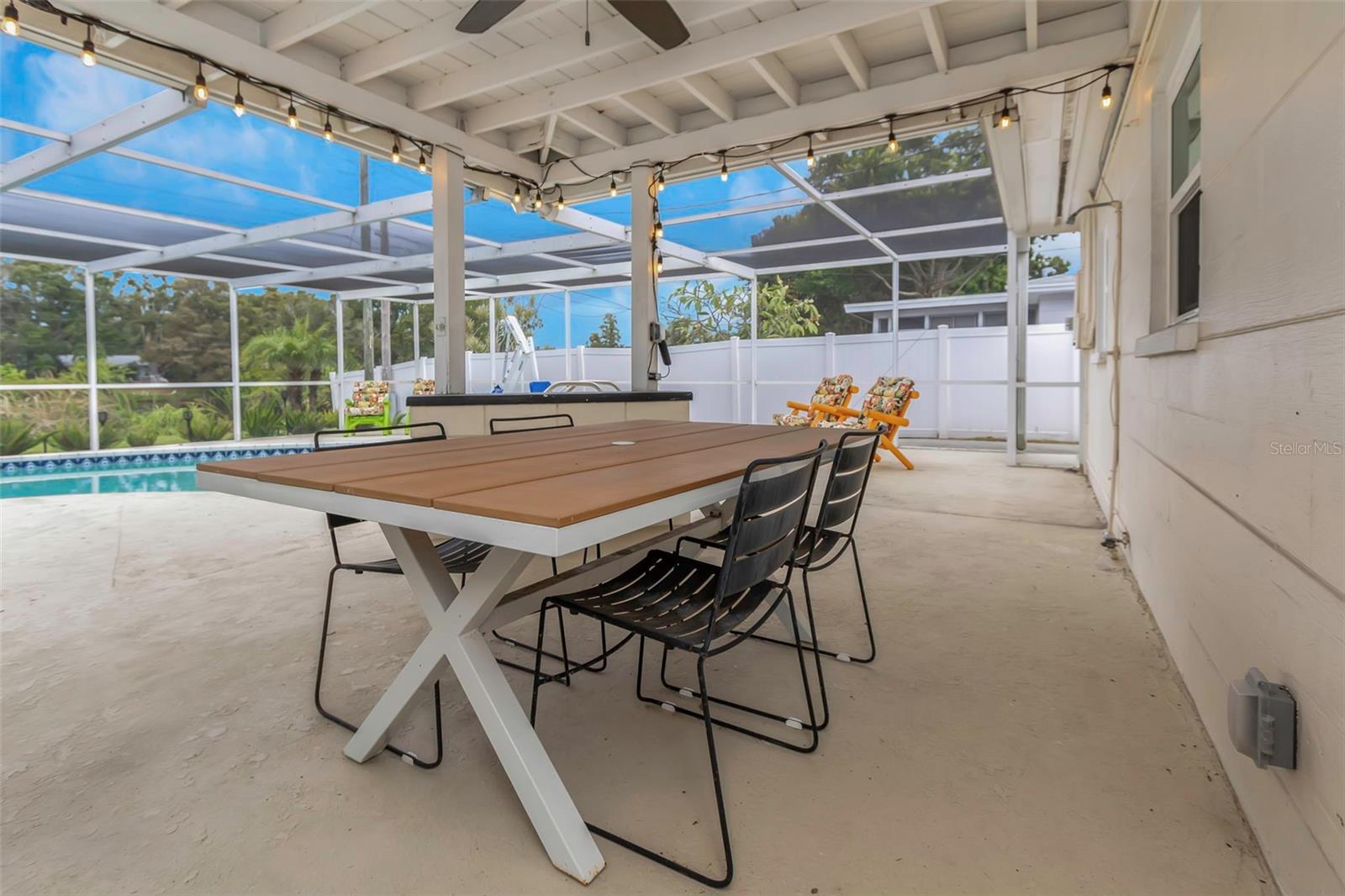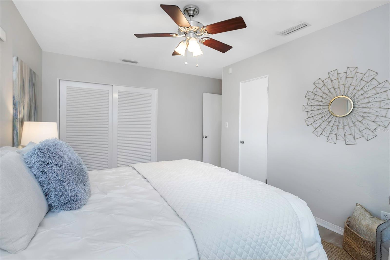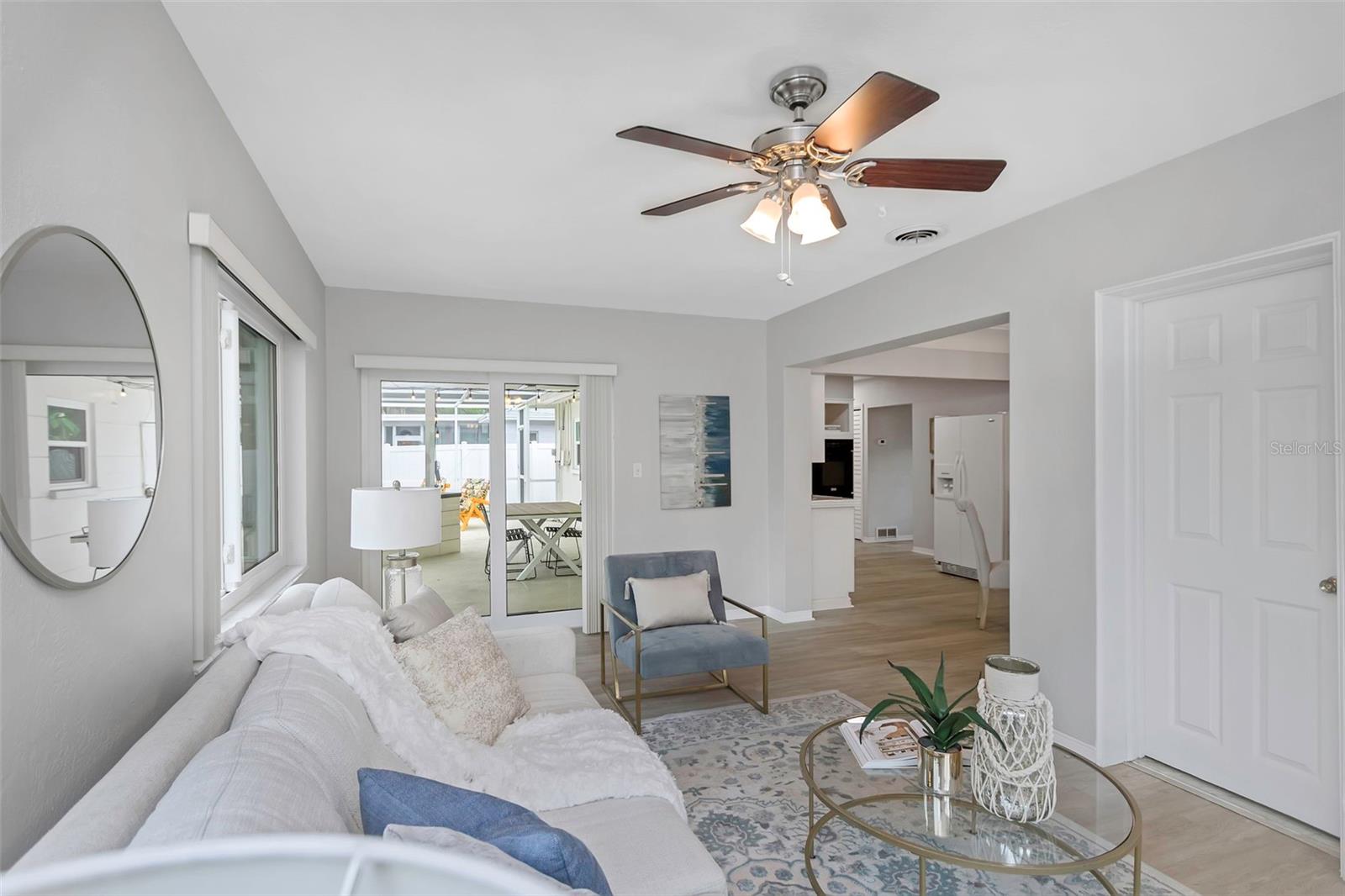 Located in West St. Petersburg in a quiet, established neighborhood, this handsome masonry home offers classic Florida charm and serene lake views. The curb appeal shines with mature landscaping, a welcoming front porch, and a well-maintained lot. Inside, new vinyl plank flooring flows throughout most of the home, which features two bedrooms, two baths, a spacious living and dining area, and a comfortable family room. From the family room, step out to a relaxing covered lanai with a birdcage enclosure, a heated in-ground pool, and a peaceful lake backdrop. The beautifully landscaped yard continues along the sides and rear of the property, complete with a paved fire pit area—perfect for entertaining. Additional highlights include an attached one-car garage, large driveway, indoor laundry room, impact windows, irrigation system, and handicap-accessible pool equipment. Freshly painted and move-in ready, this home is equally ideal for immediate enjoyment or for updating to make it your own.