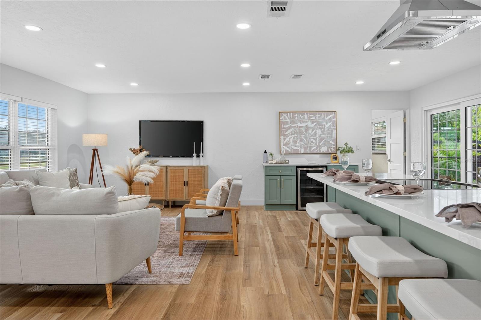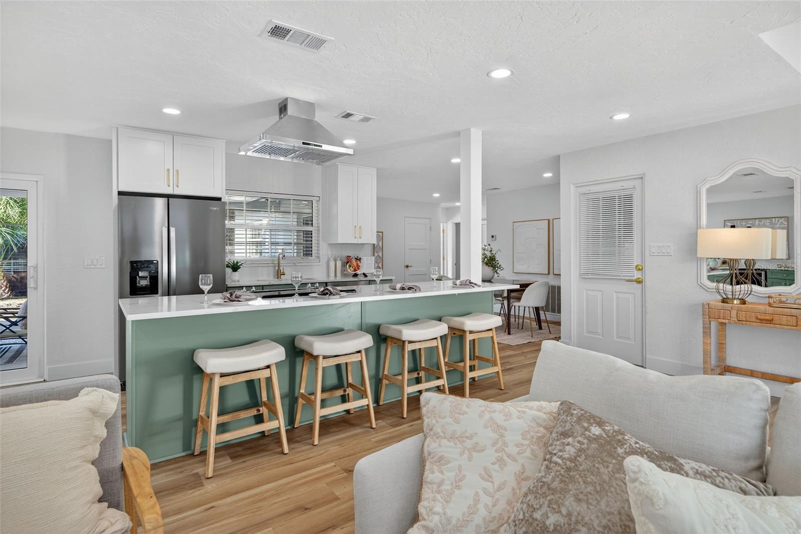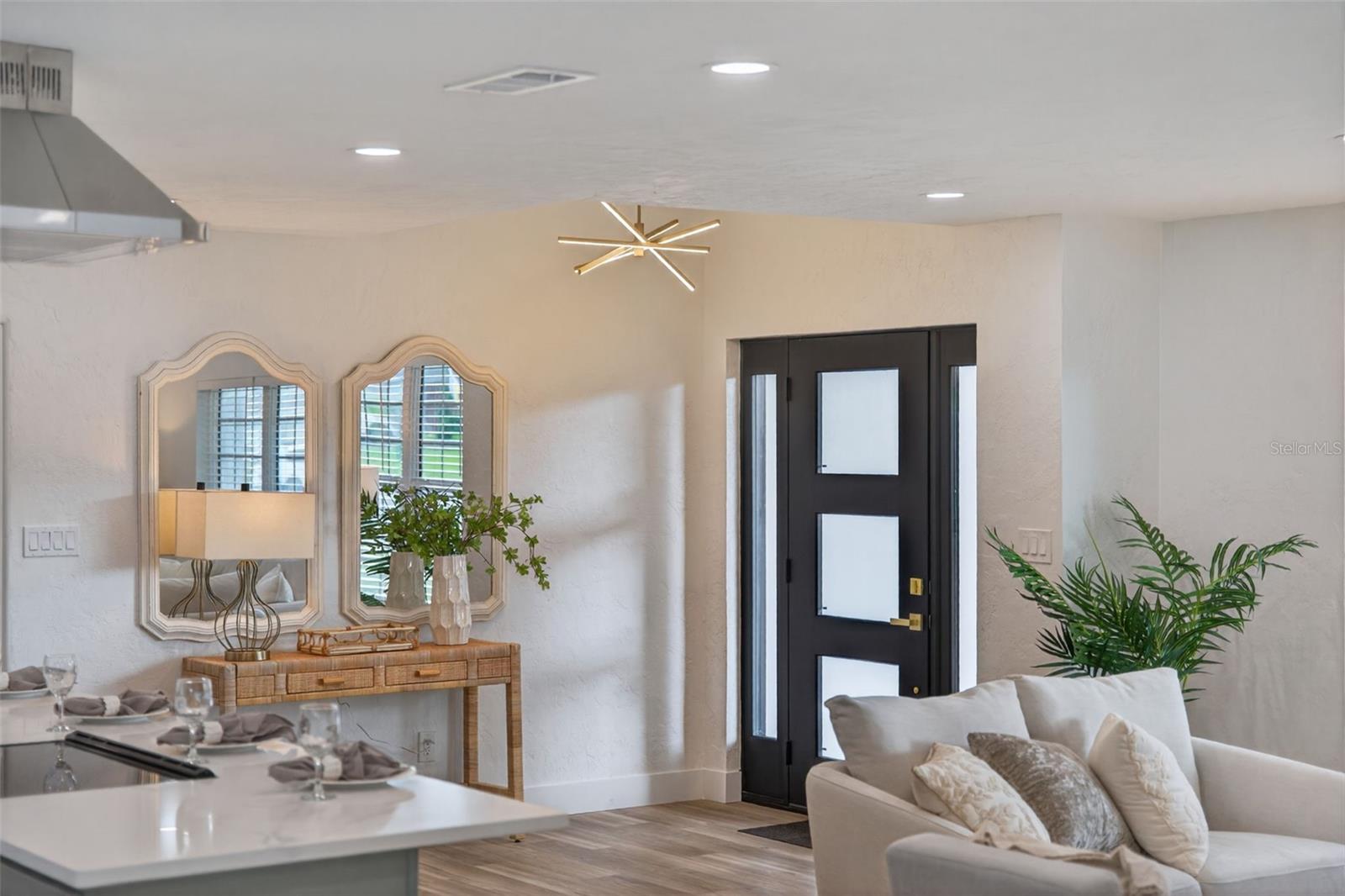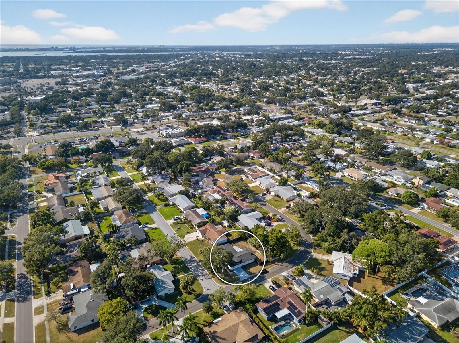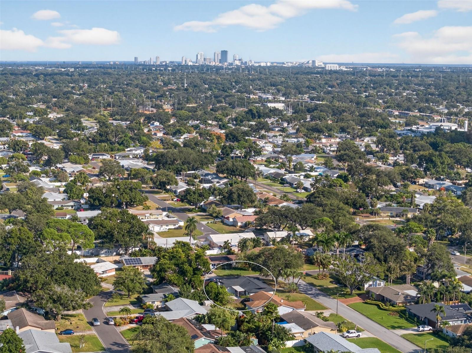 One or more photo(s) has been virtually staged. "Make Every Day Feel Like a Holiday" - Welcome to this stunning, fully renovated home in the desirable Holiday Park neighborhood of West St. Pete. Situated on a spacious corner lot, this 1,558 sqft residence seamlessly blends modern comfort with effortless Florida living. Step inside to discover a thoughtfully designed split-bedroom floor plan offering two guest bedrooms on one side of the home and a private primary suite on the other. The primary retreat features a gorgeous en-suite bathroom with a walk-in shower, dual vanity, and custom closets with built-in storage. The two additional bedrooms are generously sized and include built-in closet systems, sharing a beautifully updated hallway bath. A convenient interior laundry room and abundant storage, including multiple hallway closets and a large pantry, add everyday functionality. The open-concept living, dining, and kitchen areas flow seamlessly together, creating the perfect environment for relaxing or entertaining. Two sliding doors open to the covered lanai and backyard, extending your living space outdoors. The kitchen offers an organic yet contemporary vibe with muted green lower cabinets, crisp white uppers, stunning quartz countertops, and a full suite of new stainless steel appliances. A chic dry bar with a wine cooler and beverage fridge is perfectly positioned for entertaining or unwinding after a long day. Every detail of this home has been upgraded in 2025, including a new roof, HVAC system and ductwork, plumbing, water heater, PGT windows, and a stylish new front door with sidelights. Freshly painted inside and out, this home is truly move-in ready! Located in a high-and-dry, flood zone X area, this home is just minutes from the Gulf beaches, walking distance to schools, and close to shopping, dining, and entertainment. Downtown St. Pete is a quick 15-minute drive away, with both TPA and PIE airports approximately 30 minutes from your doorstep.